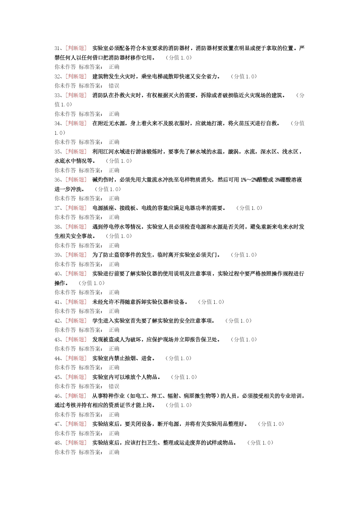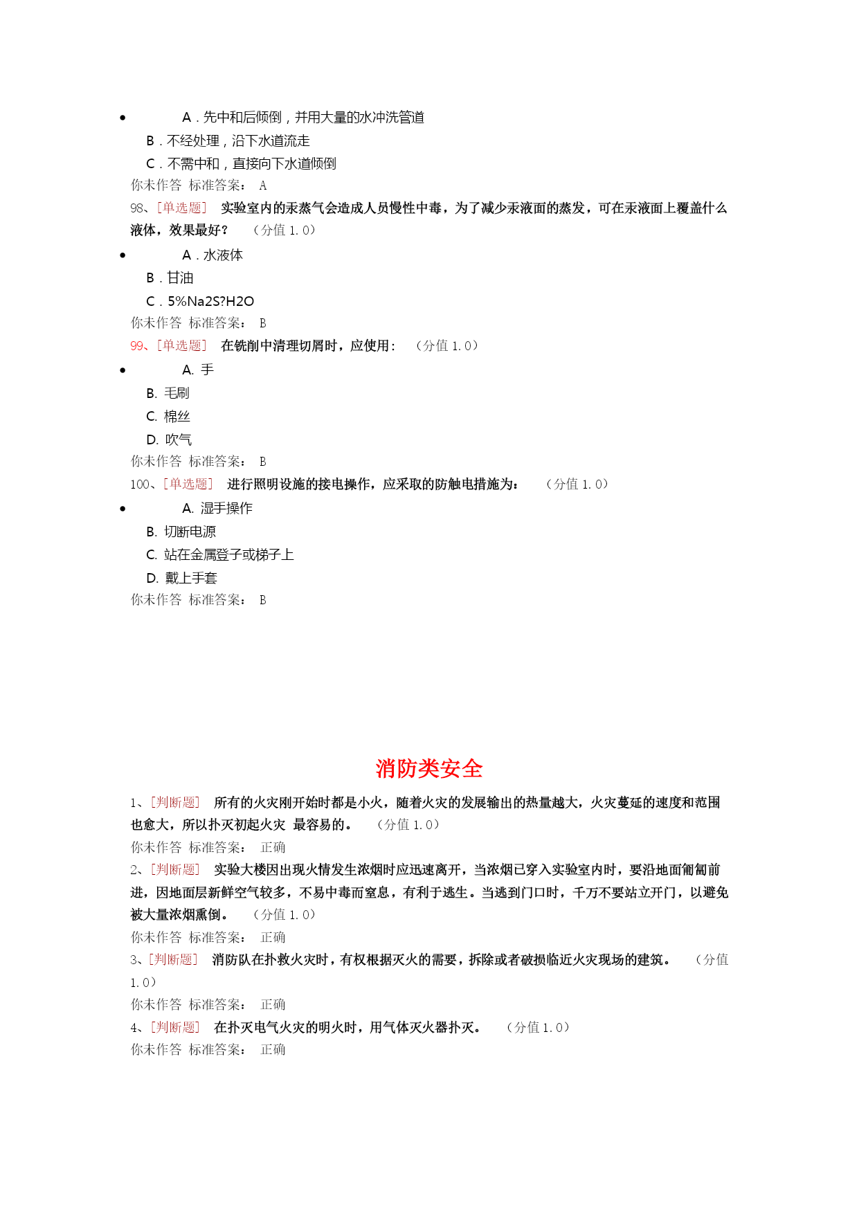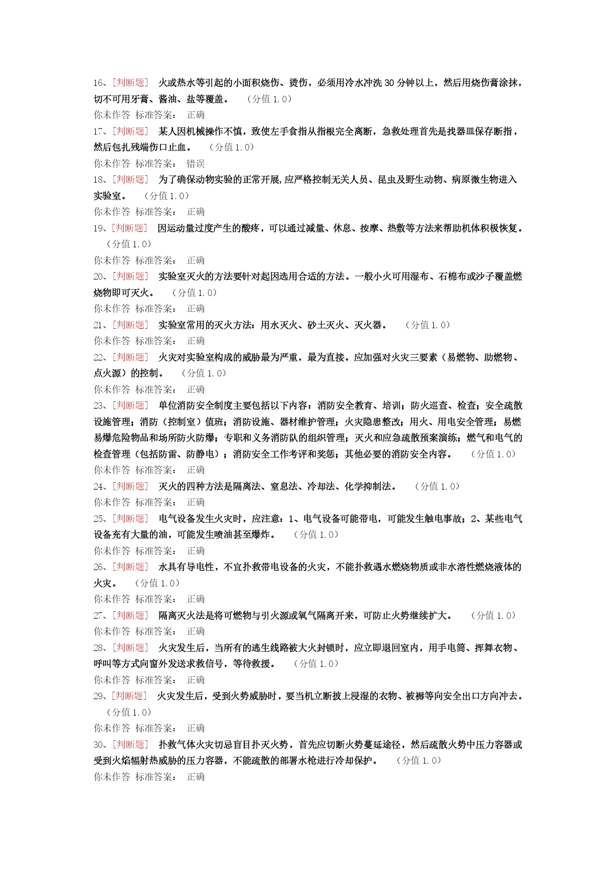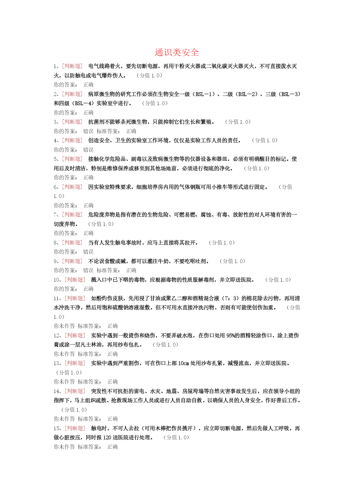 安全考试题优质资料(可以直接使用,可编辑优质资料,欢迎下载)通识类安全1、[判断题]电气线路着火,要先切断电源,再用干粉灭火器或二氧化碳灭火器灭火,不可直接泼水灭火,以防触电或电气爆炸伤人。(分值1.0)你的答案:正确2、[判断题]病原微生物的研究工作必须在生物安全一级(BSL-1)、二级(BSL-2)、三级(BSL-3)和四级(BSL-4)实验室中进行。(分值1.0)你的答案:正确3、[判断题]抗菌剂不能够杀死微生物,只能抑制它们生长和繁殖。(分值1.0)你的答案:错误标准答案:正确4、[判断题]创造安全、卫生的实验室工作环境,仅仅是实验工作人员的责任。(分值1.0)你的答案:错误5、[判断题]接触化学危险品、剧毒以及致病微生物等的仪器设备和器皿,必须有明确醒目的标记。使用后及时清洁,特别是维修保养或移至到其他场地前,必须进行彻底的净化。(分值1.0)你的答案:正确6、[判断题]因实验室特殊要求,细胞培养房内用的气体钢瓶可用小推车等形式进行固定。(分值1.0)你的答案:正确7、[判断题]危险废弃物是指有潜在的生物危险、可燃易燃、腐蚀、有毒、放射性的对人环境有害的一切废弃物。(分值1.0)你的答案:正确8、[判断题]当有人发生触电事故时,应马上直接将其拉开。(分值1.0)你的答案:错误9、[判断题]不论误食酸或碱,都可以灌注牛奶,不要吃呕吐剂。(分值1.0)你的答案:错误标准答案:正确10、[判断题]溅入口中已下咽的毒物,应根据毒物的性质服解毒剂,并立即送医院。(分值1.0)你的答案:正确11、[判断题]如酚灼伤皮肤,先用浸了甘油或聚乙二醇和酒精混合液(7:3)的棉花除去污物,再用清水冲洗干净,然后用饱和硫酸钠溶液湿敷。但不可用水直接冲洗污物,否则有可能使创伤加重。(分值1.0)你未作答标准答案:正确12、[判断题]实验中遇到一般烫伤和烧伤,不要弄破水泡,在伤口处用95%的酒精轻涂伤口,涂上烫伤膏或涂一层凡士林油,再用纱布包扎。(分值1.0)你未作答标准答案:正确13、[判断题]实验中遇到严重割伤,可在伤口上部10cm处用沙布扎紧,减慢流血,并立即送医院。(分值1.0)你未作答标准答案:正确14、[判断题]突发性不可抗拒的雷电、水灾、地震、房屋垮塌等自然灾害事故发生后,应在领导小组的指挥下,马上组织疏散、抢救现场工作人员或进行人员自助自救,以确保人员的人身安全,作好善后工作。(分值1.0)你未作答标准答案:正确15、[判断题]触电时,不可人去拉(可用木棒把伤员挑开),应立即切断电源,然后先做人工呼吸,再做心脏按压,同时报120送医院进行处理。(分值1.0)你未作答标准答案:正确16、[判断题]火或热水等引起的小面积烧伤、烫伤,必须用冷水冲洗30分钟以上,然后用烧伤膏涂抹,切不可用牙膏、酱油、盐等覆盖。(分值1.0)你未作答标准答案:正确17、[判断题]某人因机械操作不慎,致使左手食指从指根完全离断,急救处理首先是找器皿保存断指,然后包扎残端伤口止血。(分值1.0)你未作答标准答案:错误18、[判断题]为了确保动物实验的正常开展,应严格控制无关人员、昆虫及野生动物、病原微生物进入实验室。(分值1.0)你未作答标准答案:正确19、[判断题]因运动量过度产生的酸疼,可以通过减量、休息、按摩、热敷等方法来帮助机体积极恢复。(分值1.0)你未作答标准答案:正确20、[判断题]实验室灭火的方法要针对起因选用合适的方法。一般小火可用湿布、石棉布或沙子覆盖燃烧物即可灭火。(分值1.0)你未作答标准答案:正确21、[判断题]实验室常用的灭火方法:用水灭火、砂土灭火、灭火器。(分值1.0)你未作答标准答案:正确22、[判断题]火灾对实验室构成的威胁最为严重,最为直接。应加强对火灾三要素(易燃物、助燃物、点火源)的控制。(分值1.0)你未作答标准答案:正确23、[判断题]单位消防安全制度主要包括以下内容:消防安全教育、培训;防火巡查、检查;安全疏散设施管理;消防(控制室)值班;消防设施、器材维护管理;火灾隐患整改;用火、用电安全管理;易燃易爆危险物品和场所防火防爆;专职和义务消防队的组织管理;灭火和应急疏散预案演练;燃气和电气的检查管理(包括防雷、防静电);消防安全工作考评和奖惩;其他必要的消防安全内容。(分值1.0)你未作答标准答案:正确24、[判断题]灭火的四种方法是隔离法、窒息法、冷却法、化学抑制法。(分值1.0)你未作答标准答案:正确25、[判断题]电气设备发生火灾时,应注意:1、电气设备可能带电,可能发生触电事故;2、某些电气设备充有大量的油,可能发生喷油甚至爆炸。(分值1.0)你未作答标准答案:正确26、[判断题]水具有导电性,不宜扑救带电设备的火灾,不能扑救遇水燃烧物质或非水溶性