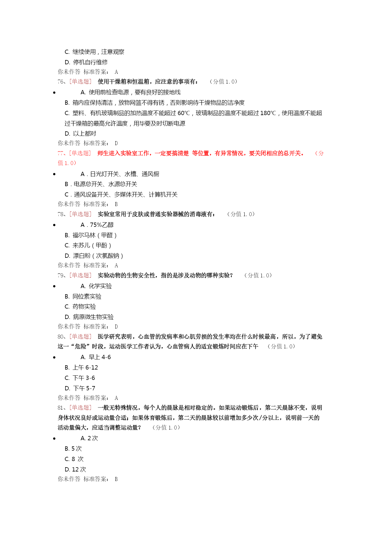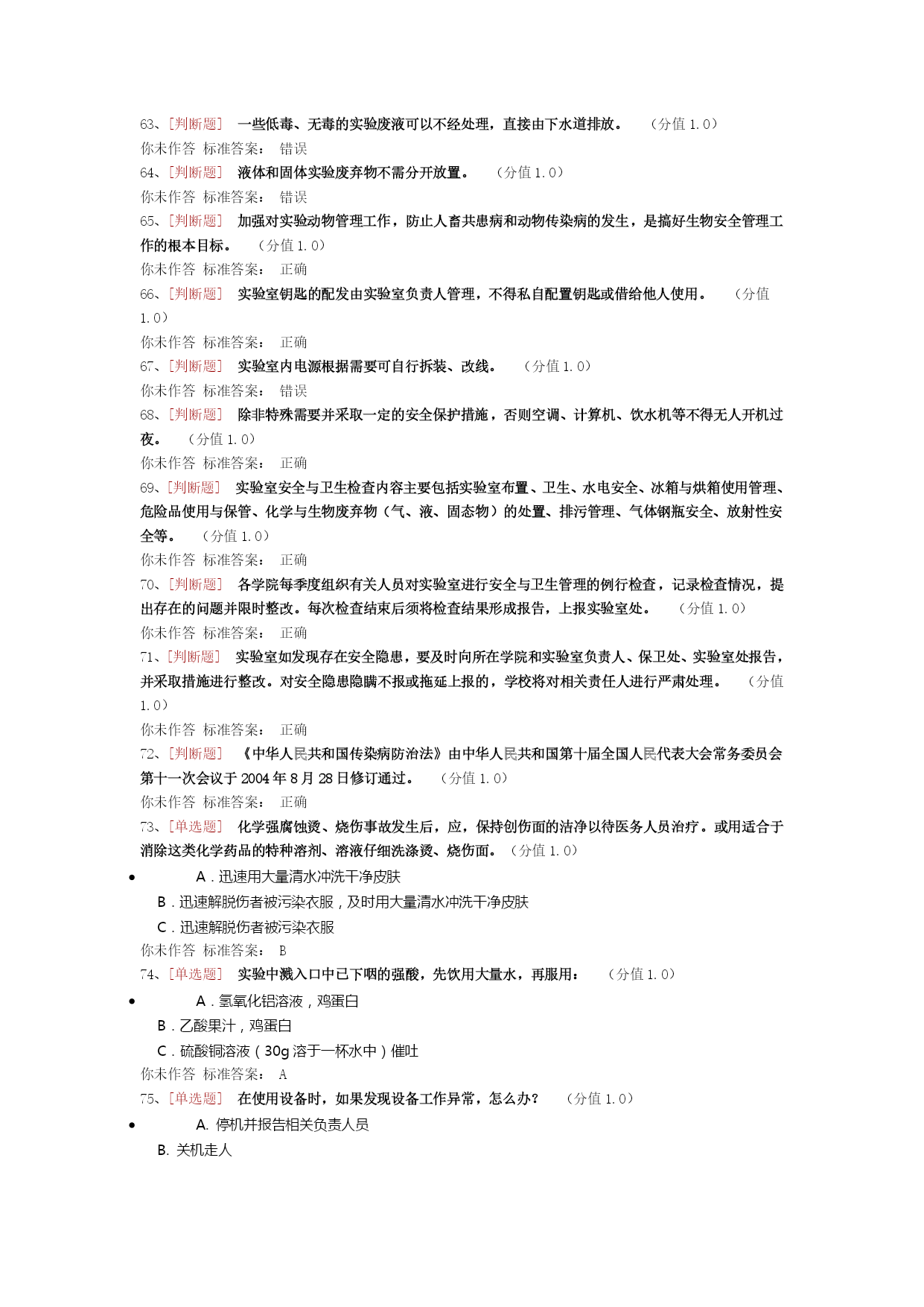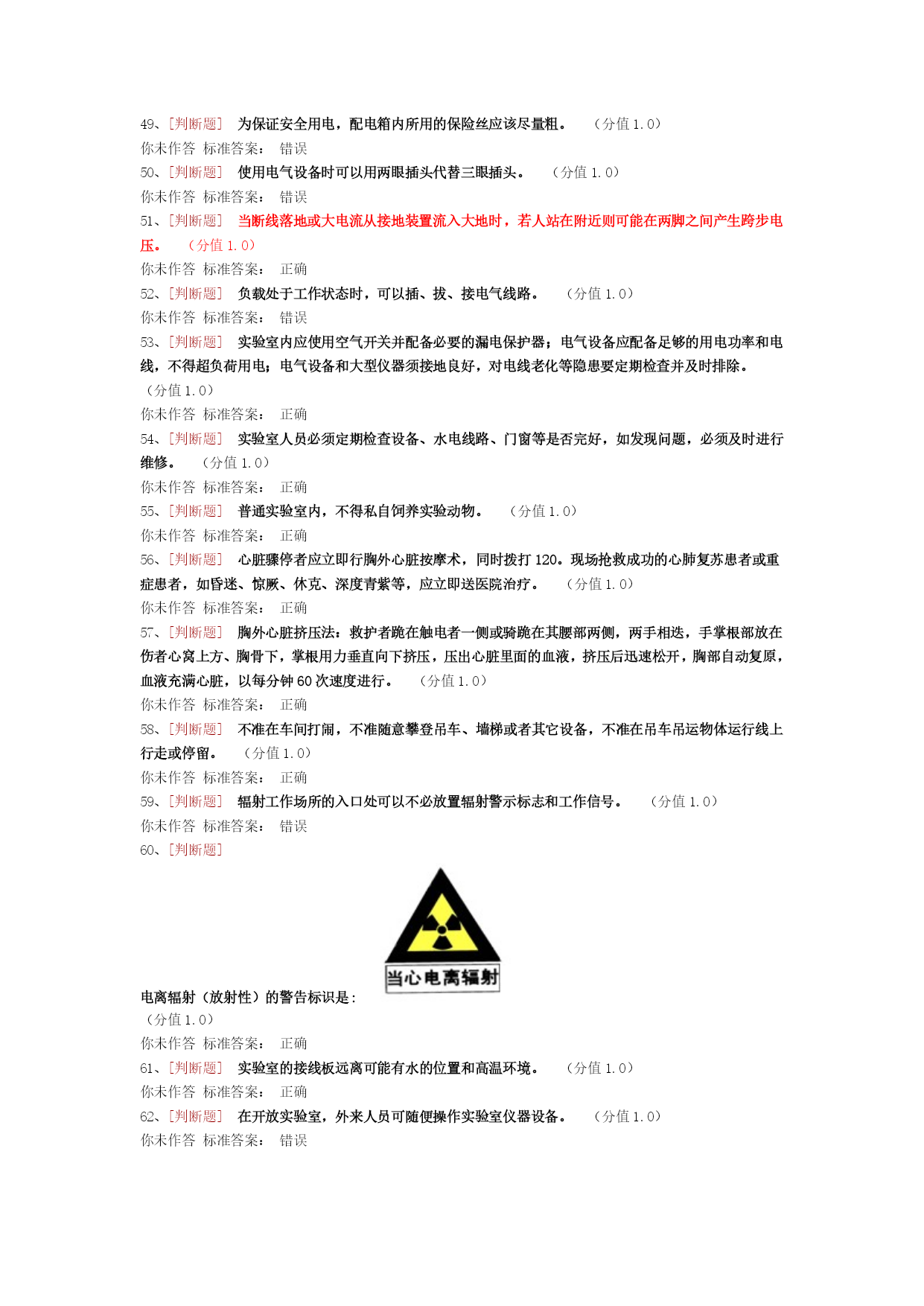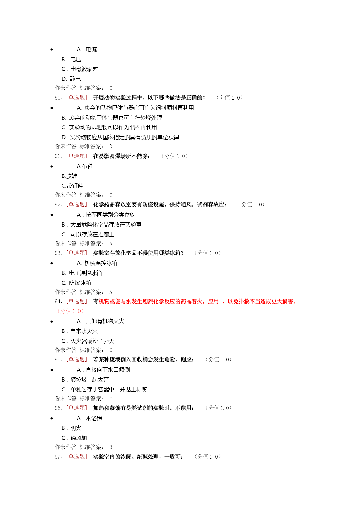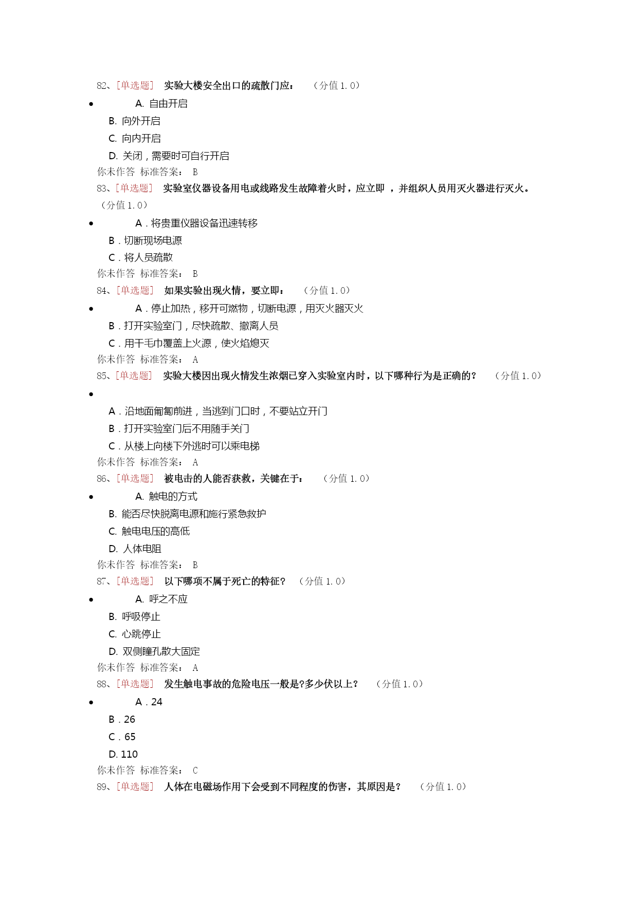 安全考试题优质资料(可以直接使用,可编辑优质资料,欢迎下载)通识类安全1、[判断题]电气线路着火,要先切断电源,再用干粉灭火器或二氧化碳灭火器灭火,不可直接泼水灭火,以防触电或电气爆炸伤人。(分值1.0)你的答案:正确2、[判断题]病原微生物的研究工作必须在生物安全一级(BSL-1)、二级(BSL-2)、三级(BSL-3)和四级(BSL-4)实验室中进行。(分值1.0)你的答案:正确3、[判断题]抗菌剂不能够杀死微生物,只能抑制它们生长和繁殖。(分值1.0)你的答案:错误标准答案:正确4、[判断题]创造安全、卫生的实验室工作环境,仅仅是实验工作人员的责任。(分值1.0)你的答案:错误5、[判断题]接触化学危险品、剧毒以及致病微生物等的仪器设备和器皿,必须有明确醒目的标记。使用后及时清洁,特别是维修保养或移至到其他场地前,必须进行彻底的净化。(分值1.0)你的答案:正确6、[判断题]因实验室特殊要求,细胞培养房内用的气体钢瓶可用小推车等形式进行固定。(分值1.0)你的答案:正确7、[判断题]危险废弃物是指有潜在的生物危险、可燃易燃、腐蚀、有毒、放射性的对人环境有害的一切废弃物。(分值1.0)你的答案:正确8、[判断题]当有人发生触电事故时,应马上直接将其拉开。(分值1.0)你的答案:错误9、[判断题]不论误食酸或碱,都可以灌注牛奶,不要吃呕吐剂。(分值1.0)你的答案:错误标准答案:正确10、[判断题]溅入口中已下咽的毒物,应根据毒物的性质服解毒剂,并立即送医院。(分值1.0)你的答案:正确11、[判断题]如酚灼伤皮肤,先用浸了甘油或聚乙二醇和酒精混合液(7:3)的棉花除去污物,再用清水冲洗干净,然后用饱和硫酸钠溶液湿敷。但不可用水直接冲洗污物,否则有可能使创伤加重。(分值1.0)你未作答标准答案:正确12、[判断题]实验中遇到一般烫伤和烧伤,不要弄破水泡,在伤口处用95%的酒精轻涂伤口,涂上烫伤膏或涂一层凡士林油,再用纱布包扎。(分值1.0)你未作答标准答案:正确13、[判断题]实验中遇到严重割伤,可在伤口上部10cm处用沙布扎紧,减慢流血,并立即送医院。(分值1.0)你未作答标准答案:正确14、[判断题]突发性不可抗拒的雷电、水灾、地震、房屋垮塌等自然灾害事故发生后,应在领导小组的指挥下,马上组织疏散、抢救现场工作人员或进行人员自助自救,以确保人员的人身安全,作好善后工作。(分值1.0)你未作答标准答案:正确15、[判断题]触电时,不可人去拉(可用木棒把伤员挑开),应立即切断电源,然后先做人工呼吸,再做心脏按压,同时报120送医院进行处理。(分值1.0)你未作答标准答案:正确16、[判断题]火或热水等引起的小面积烧伤、烫伤,必须用冷水冲洗30分钟以上,然后用烧伤膏涂抹,切不可用牙膏、酱油、盐等覆盖。(分值1.0)你未作答标准答案:正确17、[判断题]某人因机械操作不慎,致使左手食指从指根完全离断,急救处理首先是找器皿保存断指,然后包扎残端伤口止血。(分值1.0)你未作答标准答案:错误18、[判断题]为了确保动物实验的正常开展,应严格控制无关人员、昆虫及野生动物、病原微生物进入实验室。(分值1.0)你未作答标准答案:正确19、[判断题]因运动量过度产生的酸疼,可以通过减量、休息、按摩、热敷等方法来帮助机体积极恢复。(分值1.0)你未作答标准答案:正确20、[判断题]实验室灭火的方法要针对起因选用合适的方法。一般小火可用湿布、石棉布或沙子覆盖燃烧物即可灭火。(分值1.0)你未作答标准答案:正确21、[判断题]实验室常用的灭火方法:用水灭火、砂土灭火、灭火器。(分值1.0)你未作答标准答案:正确22、[判断题]火灾对实验室构成的威胁最为严重,最为直接。应加强对火灾三要素(易燃物、助燃物、点火源)的控制。(分值1.0)你未作答标准答案:正确23、[判断题]单位消防安全制度主要包括以下内容:消防安全教育、培训;防火巡查、检查;安全疏散设施管理;消防(控制室)值班;消防设施、器材维护管理;火灾隐患整改;用火、用电安全管理;易燃易爆危险物品和场所防火防爆;专职和义务消防队的组织管理;灭火和应急疏散预案演练;燃气和电气的检查管理(包括防雷、防静电);消防安全工作考评和奖惩;其他必要的消防安全内容。(分值1.0)你未作答标准答案:正确24、[判断题]灭火的四种方法是隔离法、窒息法、冷却法、化学抑制法。(分值1.0)你未作答标准答案:正确25、[判断题]电气设备发生火灾时,应注意:1、电气设备可能带电,可能发生触电事故;2、某些电气设备充有大量的油,可能发生喷油甚至爆炸。(分值1.0)你未作答标准答案:正确26、[判断题]水具有导电性,不宜扑救带电设备的火灾,不能扑救遇水燃烧物质或非水溶性