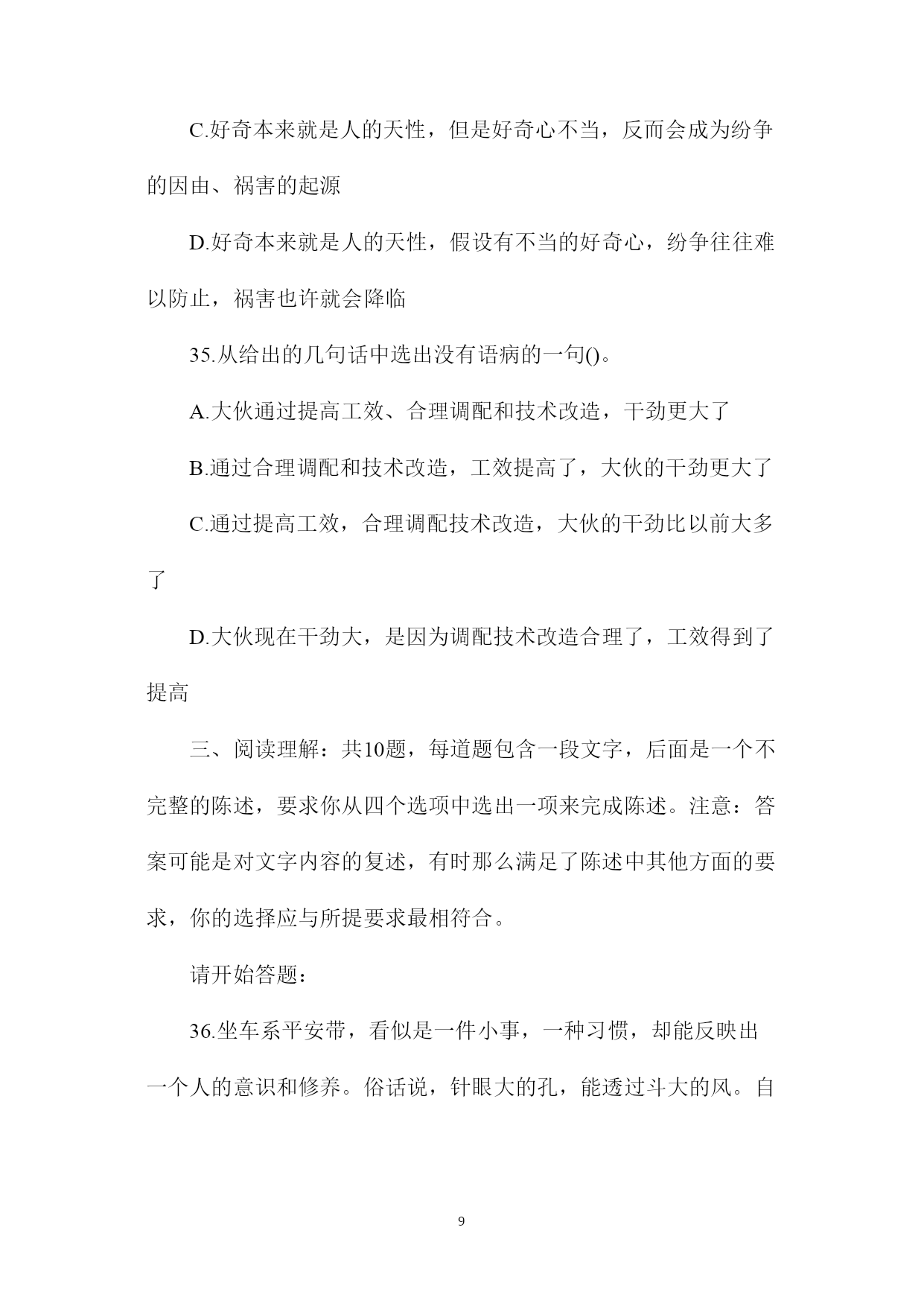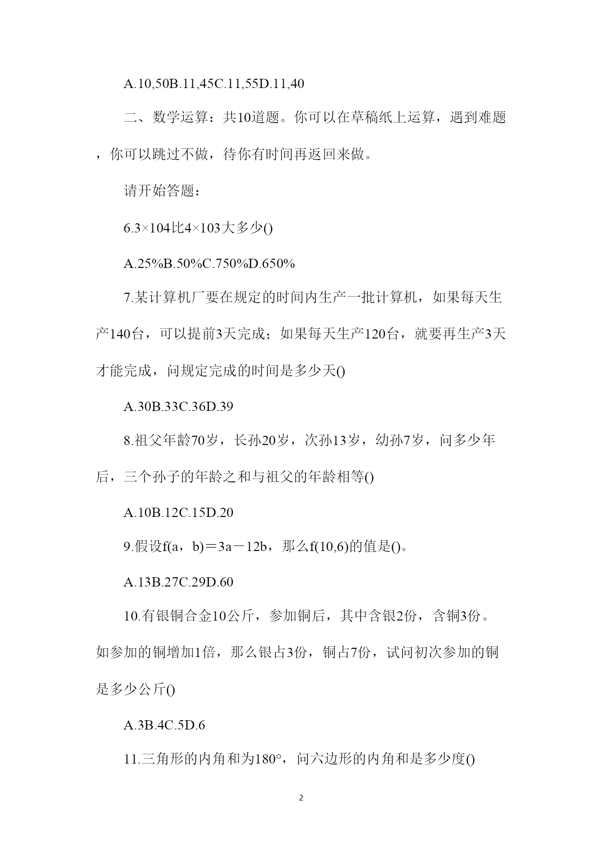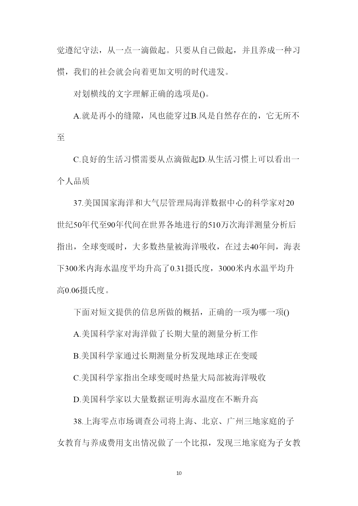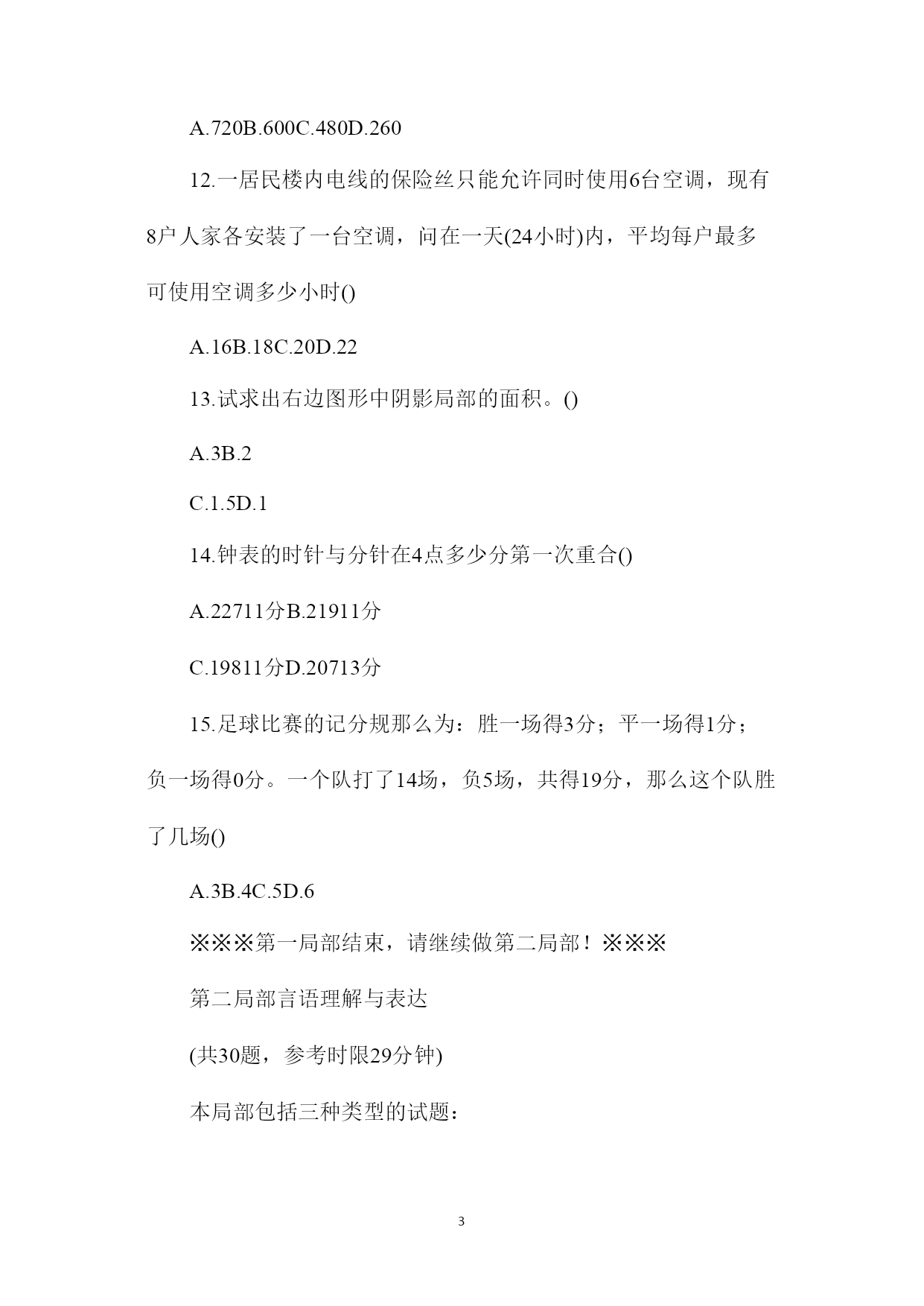 PAGEPAGE37公务员行政能力考试测试真题第一局部数量关系(共15题,参考时限15分钟)本局部包括两种类型的试题:一、数字推理:共5道题。给你一个数列,但其中缺少一项,要求你仔细观察数列的排列规律,然后从四个供选择的选项中选出你认为最合理的一项,来填补空缺项。请开始答题:1.12,14,20,38()A.46B.52C.64D.922.1,32,116,2512()A.13360B.13760C.14160D.147603.()28361018181999A.18B.28C.54D.644.81,64,121,36()16A.144B.169C.196D.2255.3,3,5,10,7,21,9,36()A.10,50B.11,45C.11,55D.11,40二、数学运算:共10道题。你可以在草稿纸上运算,遇到难题,你可以跳过不做,待你有时间再返回来做。请开始答题:6.3×104比4×103大多少()A.25%B.50%C.750%D.650%7.某计算机厂要在规定的时间内生产一批计算机,如果每天生产140台,可以提前3天完成;如果每天生产120台,就要再生产3天才能完成,问规定完成的时间是多少天()A.30B.33C.36D.398.祖父年龄70岁,长孙20岁,次孙13岁,幼孙7岁,问多少年后,三个孙子的年龄之和与祖父的年龄相等()A.10B.12C.15D.209.假设f(a,b)=3a-12b,那么f(10,6)的值是()。A.13B.27C.29D.6010.有银铜合金10公斤,参加铜后,其中含银2份,含铜3份。如参加的铜增加1倍,那么银占3份,铜占7份,试问初次参加的铜是多少公斤()A.3B.4C.5D.611.三角形的内角和为180°,问六边形的内角和是多少度()A.720B.600C.480D.26012.一居民楼内电线的保险丝只能允许同时使用6台空调,现有8户人家各安装了一台空调,问在一天(24小时)内,平均每户最多可使用空调多少小时()A.16B.18C.20D.2213.试求出右边图形中阴影局部的面积。()A.3B.2C.1.5D.114.钟表的时针与分针在4点多少分第一次重合()A.22711分B.21911分C.19811分D.20713分15.足球比赛的记分规那么为:胜一场得3分;平一场得1分;负一场得0分。一个队打了14场,负5场,共得19分,那么这个队胜了几场()A.3B.4C.5D.6※※※第一局部结束,请继续做第二局部!※※※第二局部言语理解与表达(共30题,参考时限29分钟)本局部包括三种类型的试题:一、选词填空:共10题,要求你从所给的四个选项中选出一个填空,使句子的意思表达得最准确。请开始答题:16.人类正面临着全球变暖的挑战,联合国的一份报告为我们()了气候变化将会产生的灾难性后果。A.概括B.描述C.记录D.记述17.什么事情已成为你的禁忌再深入地想一想,你有必要让自己如此的不自由吗人们有时常常让自己被一些风俗、习惯、禁忌所限制,()。A.进退不得B.疲惫不堪C.前思后想D.无从启齿18.买彩票当然是希望有时机中大奖,但彩民不要()地去追求这种时机。A.决意B.随意C.刻意D.任意19.不要害怕去学新的东西,知识没有(),是可以随身携带的宝藏,没有人会被它压垮,而且愈多你愈身心矫健。A.重量B.大小C.困难D.期限20.长期大量使用有毒农药,会对土地产生严重的不良()。A.危害B.损害C.作用D后果21.由于加强了管理,整个小区的面貌有了很大的()。A.改进B.改变C.改善D.改观22.这些案犯私自印制已注册商标以及()、()、()假冒商品的行为均已构成犯罪。A.运输、销售、制作B.销售、运输、制作C.制作、运输、销售D.制作、销售、运输23.人与人之间的相处,彼此需要有一些空间,有时太过亲近,不小心失了(),口无遮拦,就会造成彼此的紧张和伤害。A.气氛B.空间C.分寸D.和气24.对孩子来说,没有哪种()比同龄人的音容笑貌、一举一动更能引起心灵的共鸣。A.方法B.方式C.形式D.行为25.()一种相互信任的关系,是进行交流和沟通的根底。A.建立B.确立C.形成D.达成二、语句表达:共10题,要求你从语气、词序、语法结构等方面对有关语句做出判断。请开始答题:26.以下四句话中有一句可以产生不同的理解,请把这个有歧义的句子找出来()。A.门没有锁,咱们进去吧B.雪终于停了,它好似累了C.文先生在苏州的地位让人羡慕D.烟雾中,熊辉陷入了对往事的回忆27.以下四句话中有一句可以产生不同的理解,请把这个有歧义的句