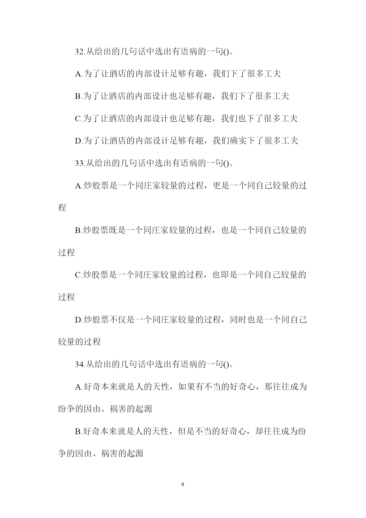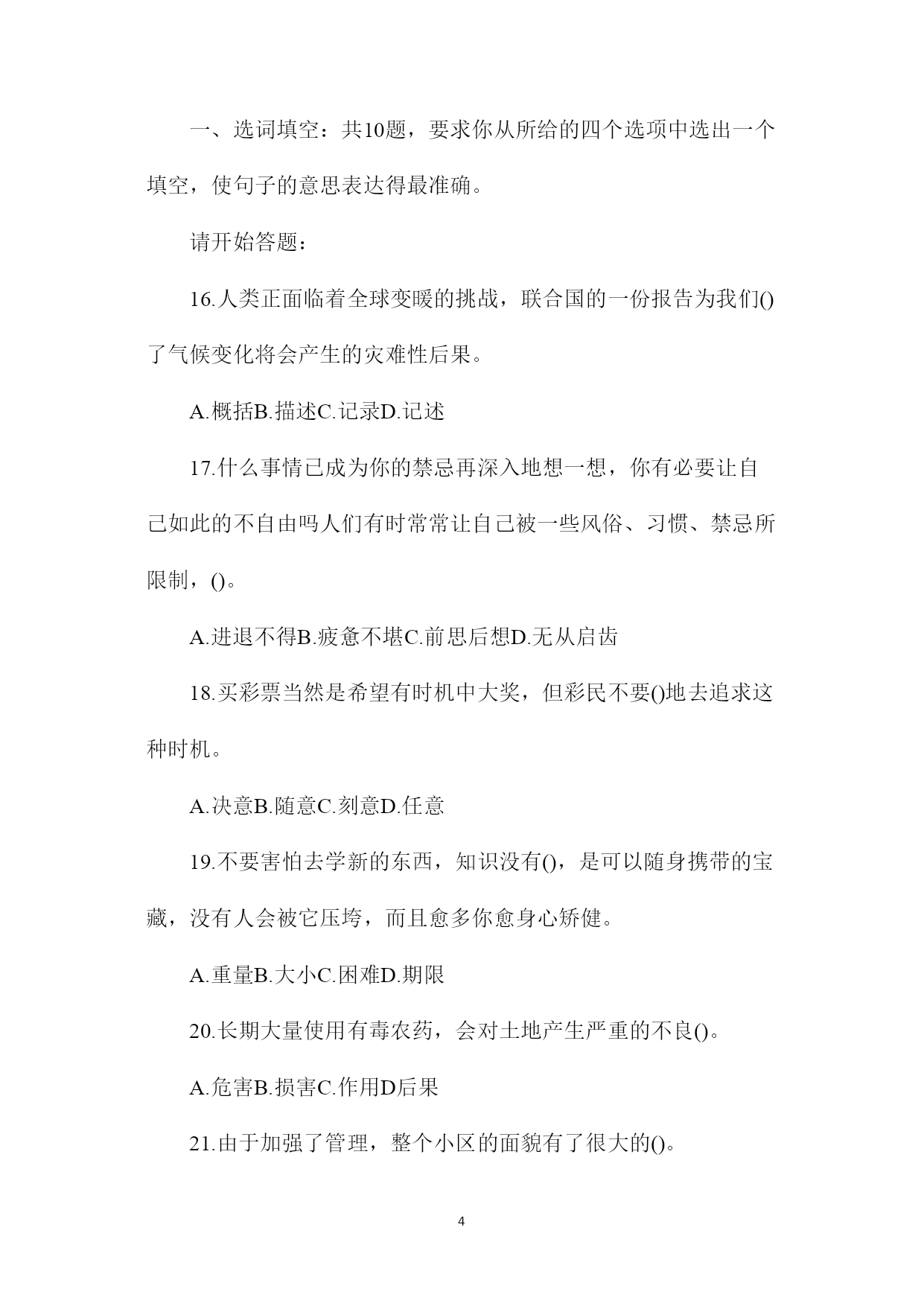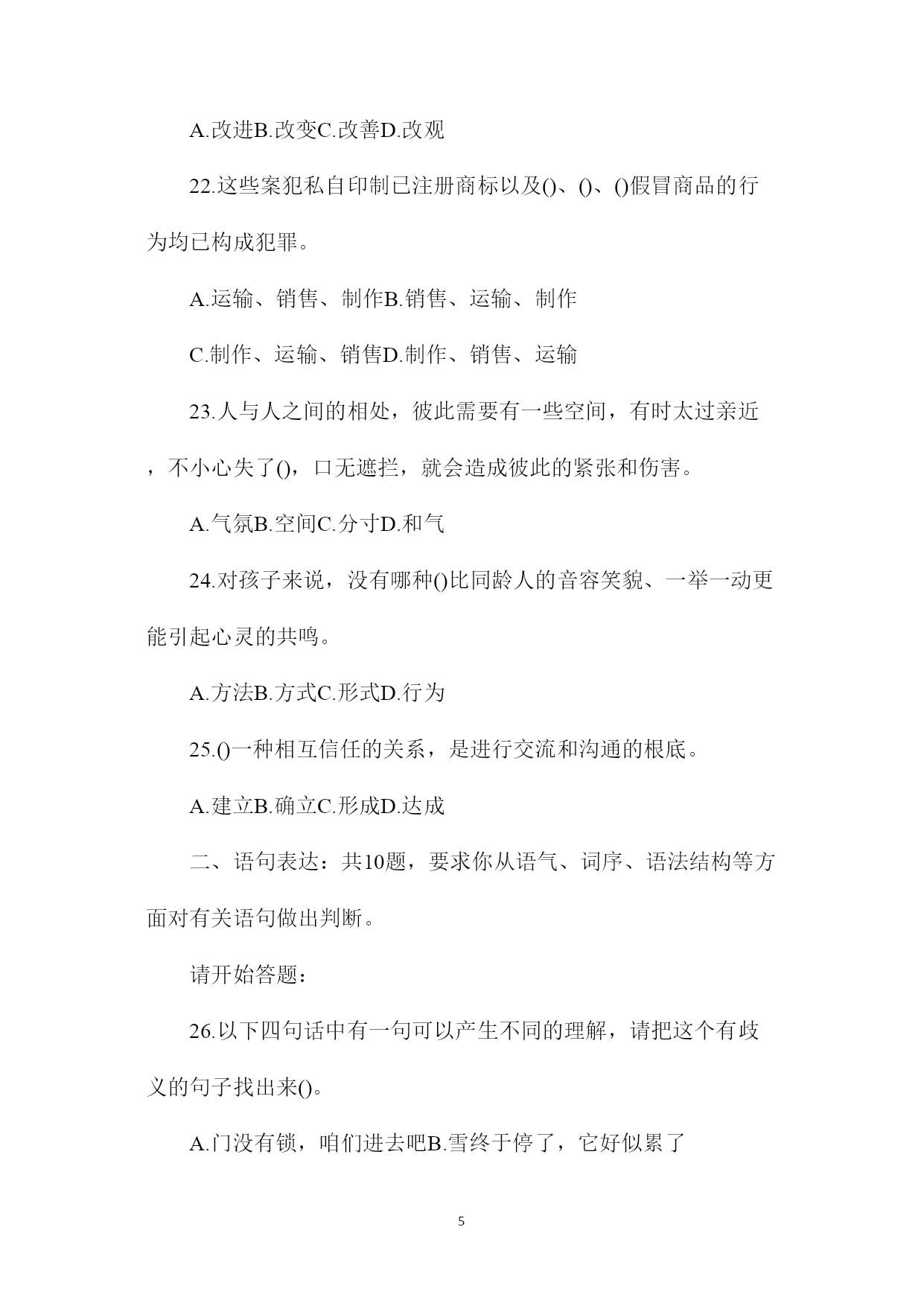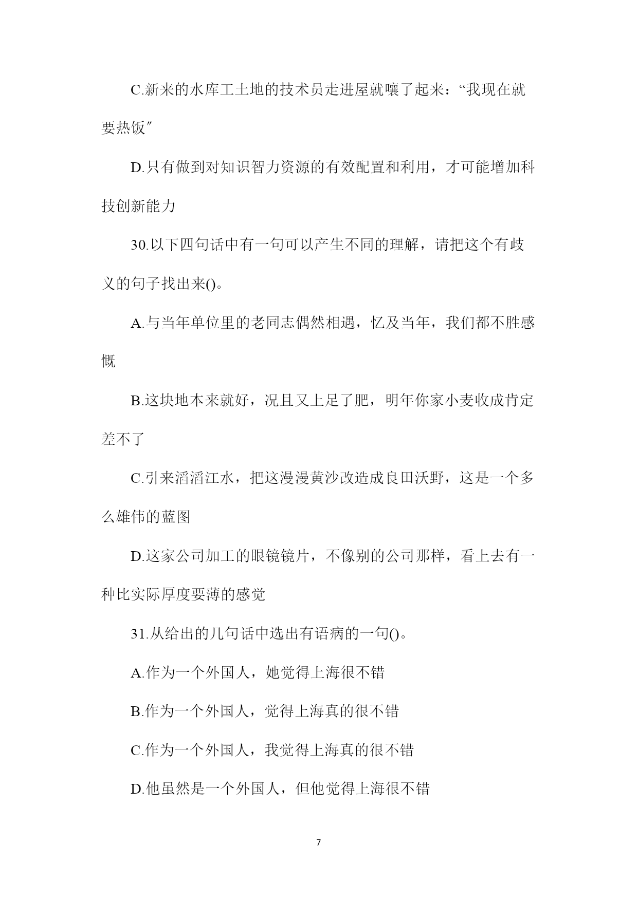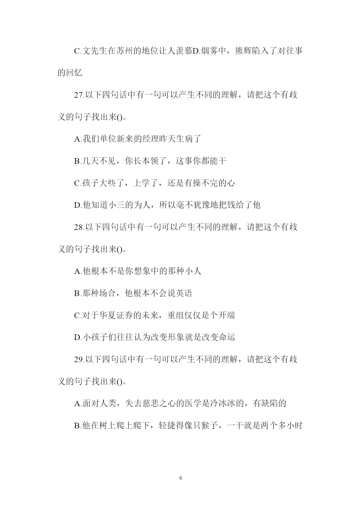PAGEPAGE37公务员行政能力考试测试真题第一局部数量关系(共15题,参考时限15分钟)本局部包括两种类型的试题:一、数字推理:共5道题。给你一个数列,但其中缺少一项,要求你仔细观察数列的排列规律,然后从四个供选择的选项中选出你认为最合理的一项,来填补空缺项。请开始答题:1.12,14,20,38()A.46B.52C.64D.922.1,32,116,2512()A.13360B.13760C.14160D.147603.()28361018181999A.18B.28C.54D.644.81,64,121,36()16A.144B.169C.196D.2255.3,3,5,10,7,21,9,36()A.10,50B.11,45C.11,55D.11,40二、数学运算:共10道题。你可以在草稿纸上运算,遇到难题,你可以跳过不做,待你有时间再返回来做。请开始答题:6.3×104比4×103大多少()A.25%B.50%C.750%D.650%7.某计算机厂要在规定的时间内生产一批计算机,如果每天生产140台,可以提前3天完成;如果每天生产120台,就要再生产3天才能完成,问规定完成的时间是多少天()A.30B.33C.36D.398.祖父年龄70岁,长孙20岁,次孙13岁,幼孙7岁,问多少年后,三个孙子的年龄之和与祖父的年龄相等()A.10B.12C.15D.209.假设f(a,b)=3a-12b,那么f(10,6)的值是()。A.13B.27C.29D.6010.有银铜合金10公斤,参加铜后,其中含银2份,含铜3份。如参加的铜增加1倍,那么银占3份,铜占7份,试问初次参加的铜是多少公斤()A.3B.4C.5D.611.三角形的内角和为180°,问六边形的内角和是多少度()A.720B.600C.480D.26012.一居民楼内电线的保险丝只能允许同时使用6台空调,现有8户人家各安装了一台空调,问在一天(24小时)内,平均每户最多可使用空调多少小时()A.16B.18C.20D.2213.试求出右边图形中阴影局部的面积。()A.3B.2C.1.5D.114.钟表的时针与分针在4点多少分第一次重合()A.22711分B.21911分C.19811分D.20713分15.足球比赛的记分规那么为:胜一场得3分;平一场得1分;负一场得0分。一个队打了14场,负5场,共得19分,那么这个队胜了几场()A.3B.4C.5D.6※※※第一局部结束,请继续做第二局部!※※※第二局部言语理解与表达(共30题,参考时限29分钟)本局部包括三种类型的试题:一、选词填空:共10题,要求你从所给的四个选项中选出一个填空,使句子的意思表达得最准确。请开始答题:16.人类正面临着全球变暖的挑战,联合国的一份报告为我们()了气候变化将会产生的灾难性后果。A.概括B.描述C.记录D.记述17.什么事情已成为你的禁忌再深入地想一想,你有必要让自己如此的不自由吗人们有时常常让自己被一些风俗、习惯、禁忌所限制,()。A.进退不得B.疲惫不堪C.前思后想D.无从启齿18.买彩票当然是希望有时机中大奖,但彩民不要()地去追求这种时机。A.决意B.随意C.刻意D.任意19.不要害怕去学新的东西,知识没有(),是可以随身携带的宝藏,没有人会被它压垮,而且愈多你愈身心矫健。A.重量B.大小C.困难D.期限20.长期大量使用有毒农药,会对土地产生严重的不良()。A.危害B.损害C.作用D后果21.由于加强了管理,整个小区的面貌有了很大的()。A.改进B.改变C.改善D.改观22.这些案犯私自印制已注册商标以及()、()、()假冒商品的行为均已构成犯罪。A.运输、销售、制作B.销售、运输、制作C.制作、运输、销售D.制作、销售、运输23.人与人之间的相处,彼此需要有一些空间,有时太过亲近,不小心失了(),口无遮拦,就会造成彼此的紧张和伤害。A.气氛B.空间C.分寸D.和气24.对孩子来说,没有哪种()比同龄人的音容笑貌、一举一动更能引起心灵的共鸣。A.方法B.方式C.形式D.行为25.()一种相互信任的关系,是进行交流和沟通的根底。A.建立B.确立C.形成D.达成二、语句表达:共10题,要求你从语气、词序、语法结构等方面对有关语句做出判断。请开始答题:26.以下四句话中有一句可以产生不同的理解,请把这个有歧义的句子找出来()。A.门没有锁,咱们进去吧B.雪终于停了,它好似累了C.文先生在苏州的地位让人羡慕D.烟雾中,熊辉陷入了对往事的回忆27.以下四句话中有一句可以产生不同的理解,请把这个有歧义的句