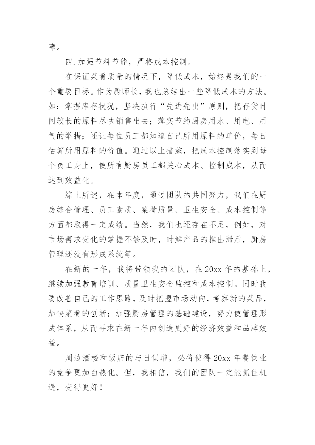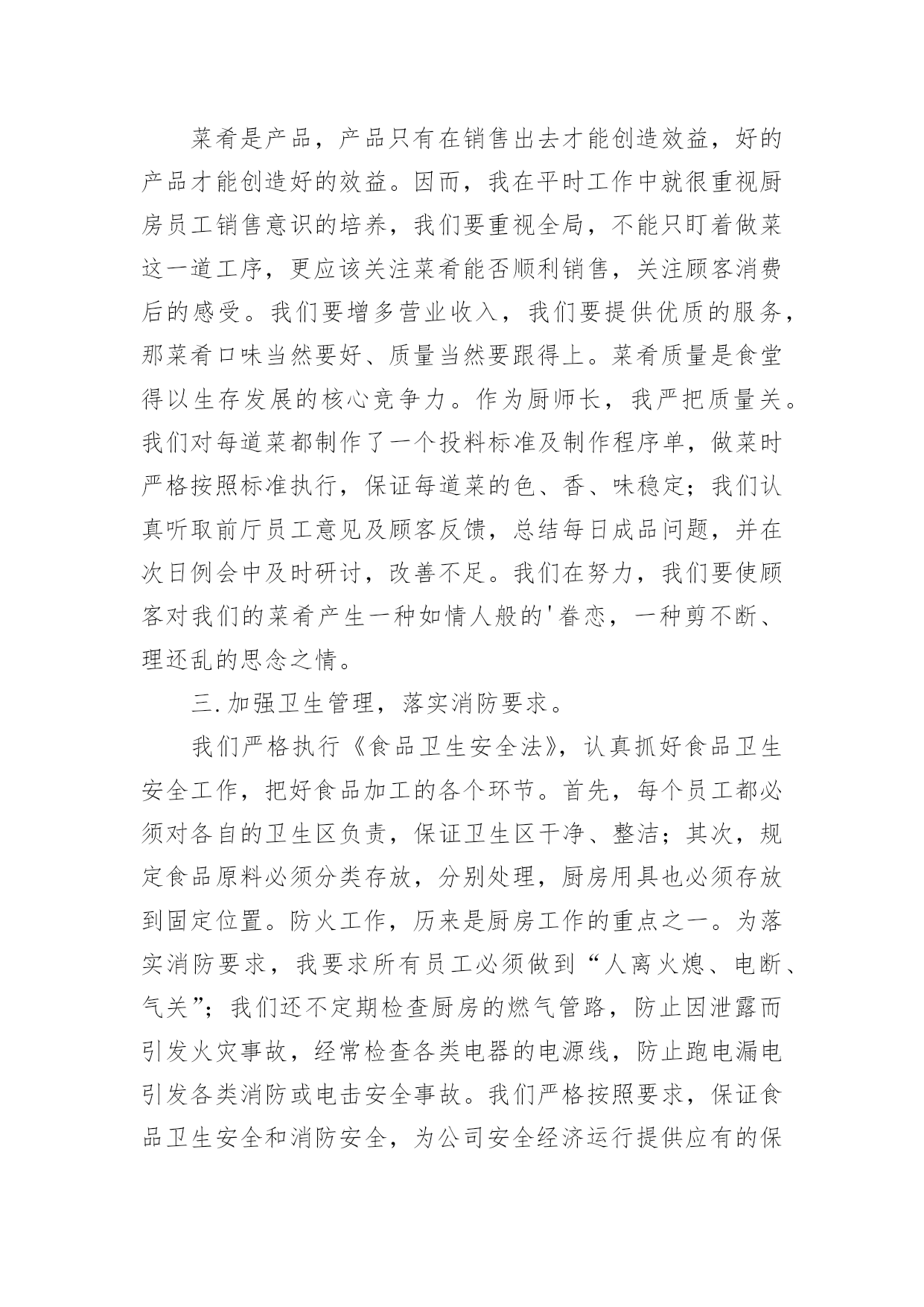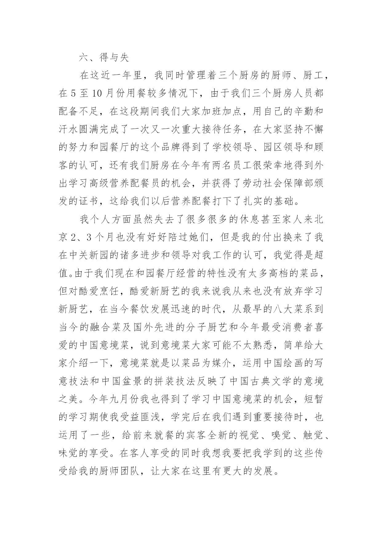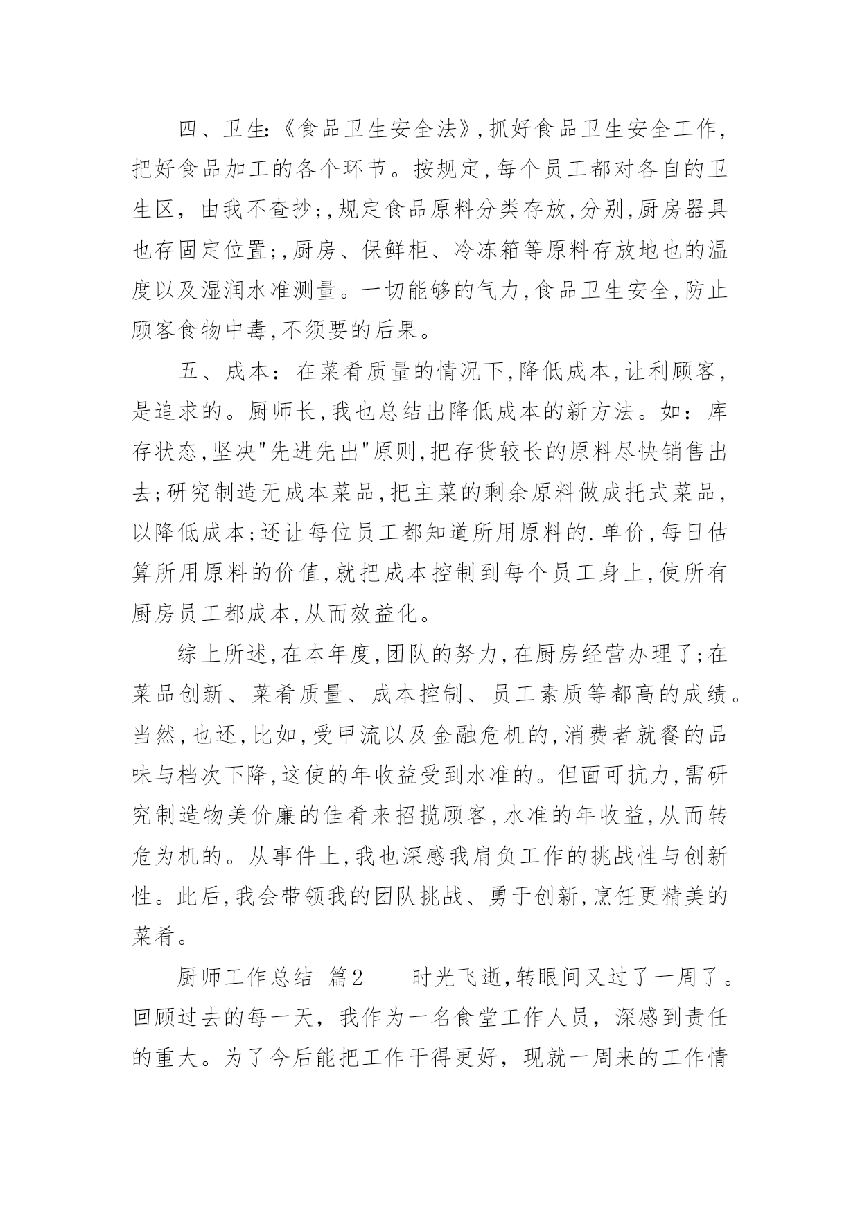 厨师工作总结厨师工作总结13篇【通用】总结是事后对某一阶段的学习、工作或其完成情况加以回顾和分析的一种书面材料,通过它可以正确认识以往学习和工作中的优缺点,因此,让我们写一份总结吧。总结怎么写才是正确的呢?下面是小编整理的厨师工作总结,仅供参考,欢迎大家阅读。厨师工作总结篇1尊敬的各位:一、经营:我在各位的下集思广益、制定较的经营计划。如:顾客的消费生理,推出绿色彩食品以及野生食品;季节性原料供应独特的地方,推出特价菜。等等。二、办理:以人为本,我员工情况素质教诲,每天都对员工有性的厨艺培训,并经常激励把工作看作是的事业。努力,员工整体素质得以,如注重仪表、笃守厨房规章轨制等;有些员工甚至还开始琢磨新菜谱。现在,了、优质、高效、创新的团队。三、质量:菜肴质量是食堂得以生存发展的焦点竞争力。厨师长,我严把质量关。对每道菜都制作了投料标准及制作程序单,做菜时标准,每道菜的色、香、味稳定;还前厅员工意见及宾客反馈,总结每日出品问题,并在每日例会中改进;还经常更新菜谱,动脑筋、想办法、变花样,回头客每次都能够尝到新口味。四、卫生:《食品卫生安全法》,抓好食品卫生安全工作,把好食品加工的各个环节。按规定,每个员工都对各自的卫生区,由我不查抄;,规定食品原料分类存放,分别,厨房器具也存固定位置;,厨房、保鲜柜、冷冻箱等原料存放地也的温度以及湿润水准测量。一切能够的气力,食品卫生安全,防止顾客食物中毒,不须要的后果。五、成本:在菜肴质量的情况下,降低成本,让利顾客,是追求的。厨师长,我也总结出降低成本的新方法。如:库存状态,坚决"先进先出"原则,把存货较长的原料尽快销售出去;研究制造无成本菜品,把主菜的剩余原料做成托式菜品,以降低成本;还让每位员工都知道所用原料的.单价,每日估算所用原料的价值,就把成本控制到每个员工身上,使所有厨房员工都成本,从而效益化。综上所述,在本年度,团队的努力,在厨房经营办理了;在菜品创新、菜肴质量、成本控制、员工素质等都高的成绩。当然,也还,比如,受甲流以及金融危机的,消费者就餐的品味与档次下降,这使的年收益受到水准的。但面可抗力,需研究制造物美价廉的佳肴来招揽顾客,水准的年收益,从而转危为机的。从事件上,我也深感我肩负工作的挑战性与创新性。此后,我会带领我的团队挑战、勇于创新,烹饪更精美的菜肴。厨师工作总结篇2时光飞逝,转眼间又过了一周了。回顾过去的每一天,我作为一名食堂工作人员,深感到责任的重大。为了今后能把工作干得更好,现就一周来的工作情况总结如下:一、原材物料管理方面:1、把好食堂原材物料进货关,不怕远路,进市场,货比多家,选购各种营养丰富的食品原料,保证物美价廉,让干部职工吃得好,花钱少。比喻说购买当季的青菜、现宰的猪肉、新鲜的花生油等等。2、管理好食堂的原材物料,不易储存的'原材物料尽量做到天天购买,对于易储存的原材物料也要根据往年消耗情况有计划的购买。保证原材物料不腐烂,不变质,不浪费,以节省食堂开支。同时对食堂的原材物料建账,做到帐物相符。3、每天根据就餐人数制作饭菜,尽量做到不剩菜或少剩菜。二、服务态度方面:我们在转变服务态度、提高服务质量方面做了大量工作。我们始终坚持以人为本的服务理念,采取了多种服务方式,尽量为干部职工提供便利条件。三、饭菜种类方面:我们根据季节、节日等情况为干部职工做好适合时令的可口饭菜,比喻:包饺子、包包子、炖白菜、炖土豆、炒青菜等,尽量满足干部职工的要求。四、卫生状况方面:我们本着积极负责的态度,认真搞好食物安全和卫生工作。生活服务工作千头万绪,最根本的工作要求就是食品的安全。因此,我们认真贯彻《食品卫生法》,把依法加强食品卫生管理和各项生活综合服务管理工作作为头等大事,列入重要的管理日程,并做到责任到人,抓紧抓实,抓出成效。切实做好食品卫生、餐具的“一洗、二冲、三消毒”工作,做到没有检疫证、食品卫生许可证的食品不购买,工制作餐台做到随用随清,每周对厨房一次大清扫,杜绝蚊蝇老鼠等害虫。厨师工作总结篇3伴着农历兔年脚步的渐渐远去,20xx年的钟声即将敲响。作为一名厨师长,我始终坚持以身作则,高标准、严要求,团结和带领广大厨房员工,努力为顾客提供精美的菜肴和优质的服务;为实现公司经济效益和社会效益,勤勤恳恳、兢兢业业。现将这几个月来的具体工作,作个总结。一.加强培训教育,提升员工素质。公司的规章制度,我经常在例会上向厨房员工提及、宣读,旨在要求大家都养成遵守公司制度的习惯;结合员工实际情况,我加强对员工进行有针对性的厨艺培训,并经常激励他们把工作看作是自己的事业。经过我的努力和大家的积极配合,厨房员工整体素质得以提升,遵守公司及厨房的规章制度、保持不错的个人卫生和仪表、钻研烹饪技术等行为,基本上都成了厨房员工的自觉行为。现在,一个和谐、优质、高效、创新的团队已经初步形成