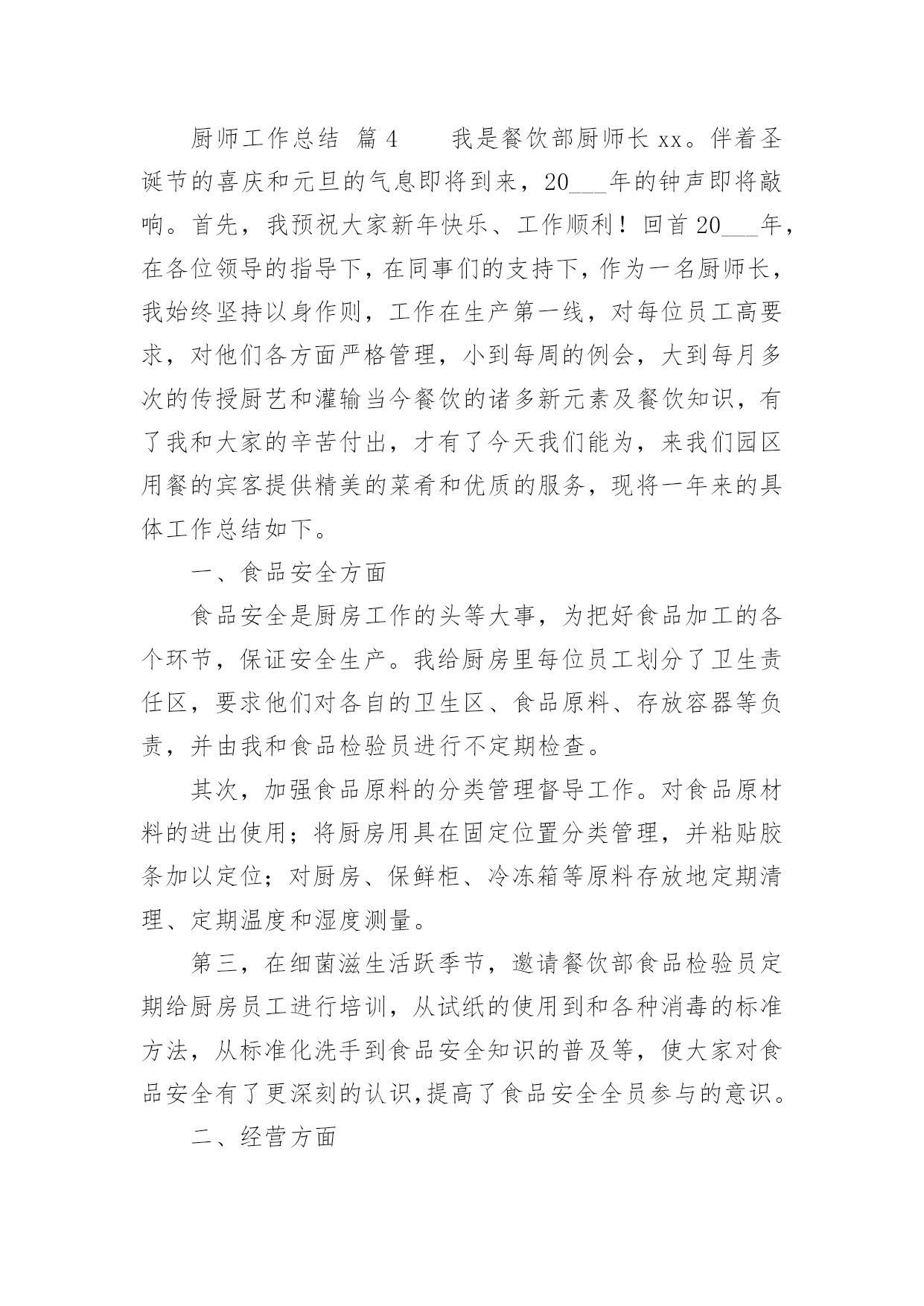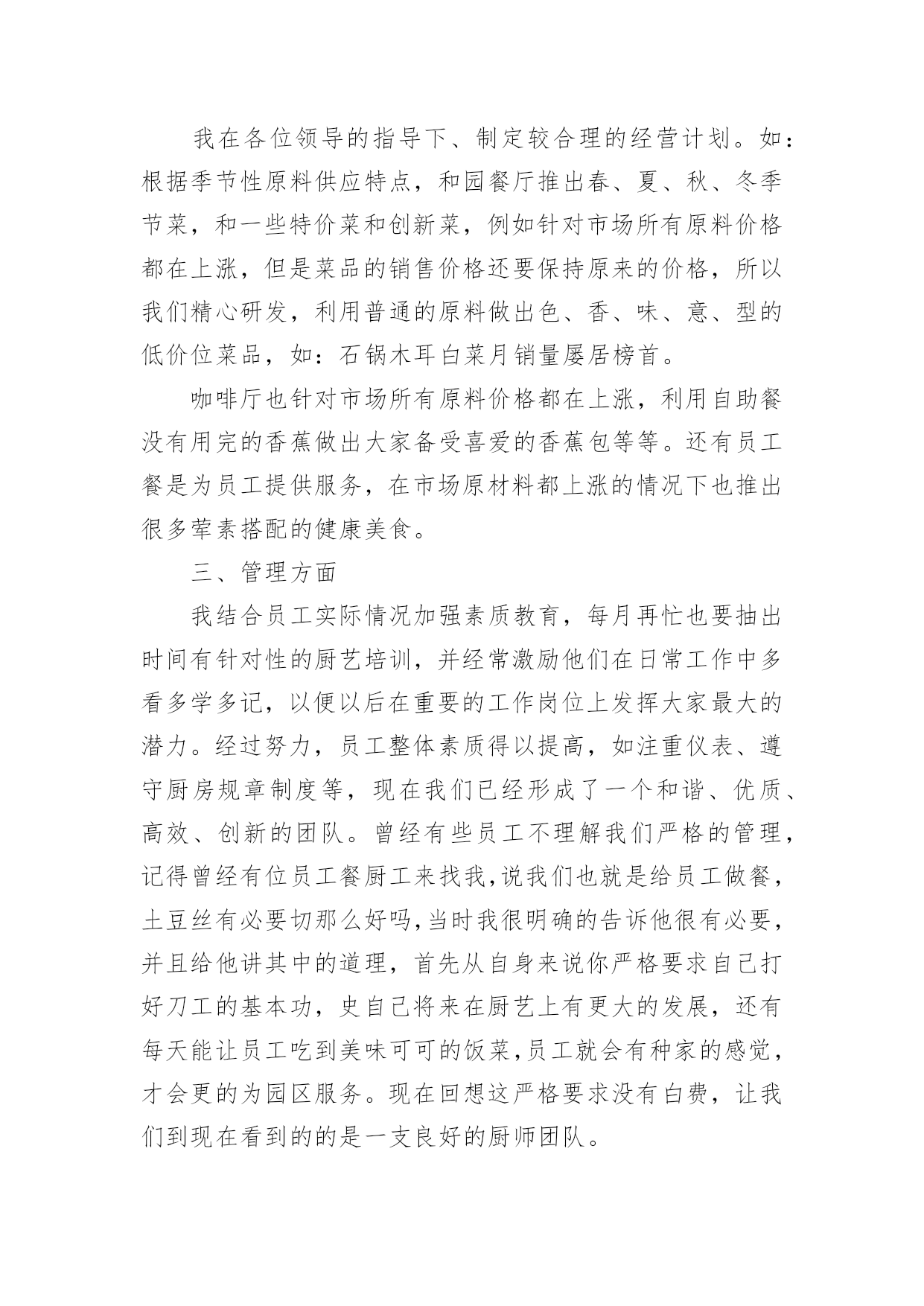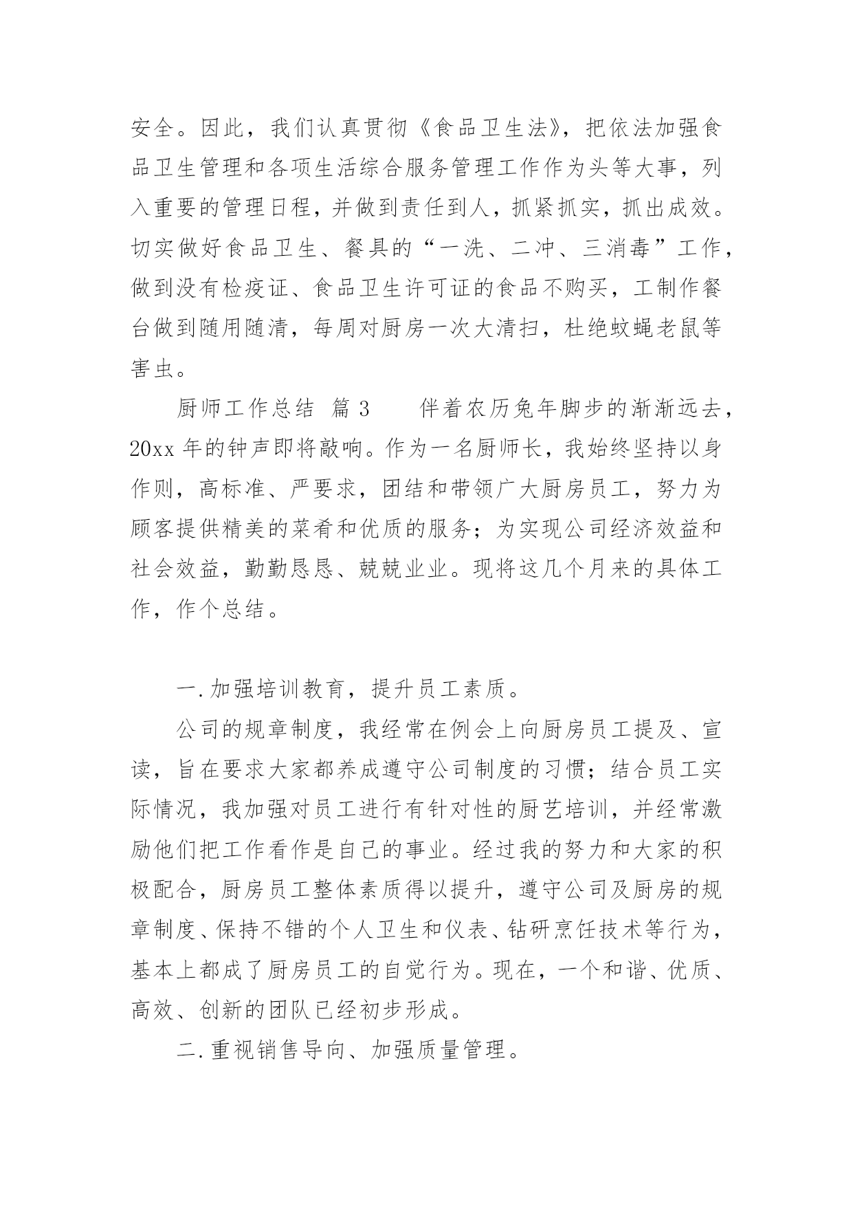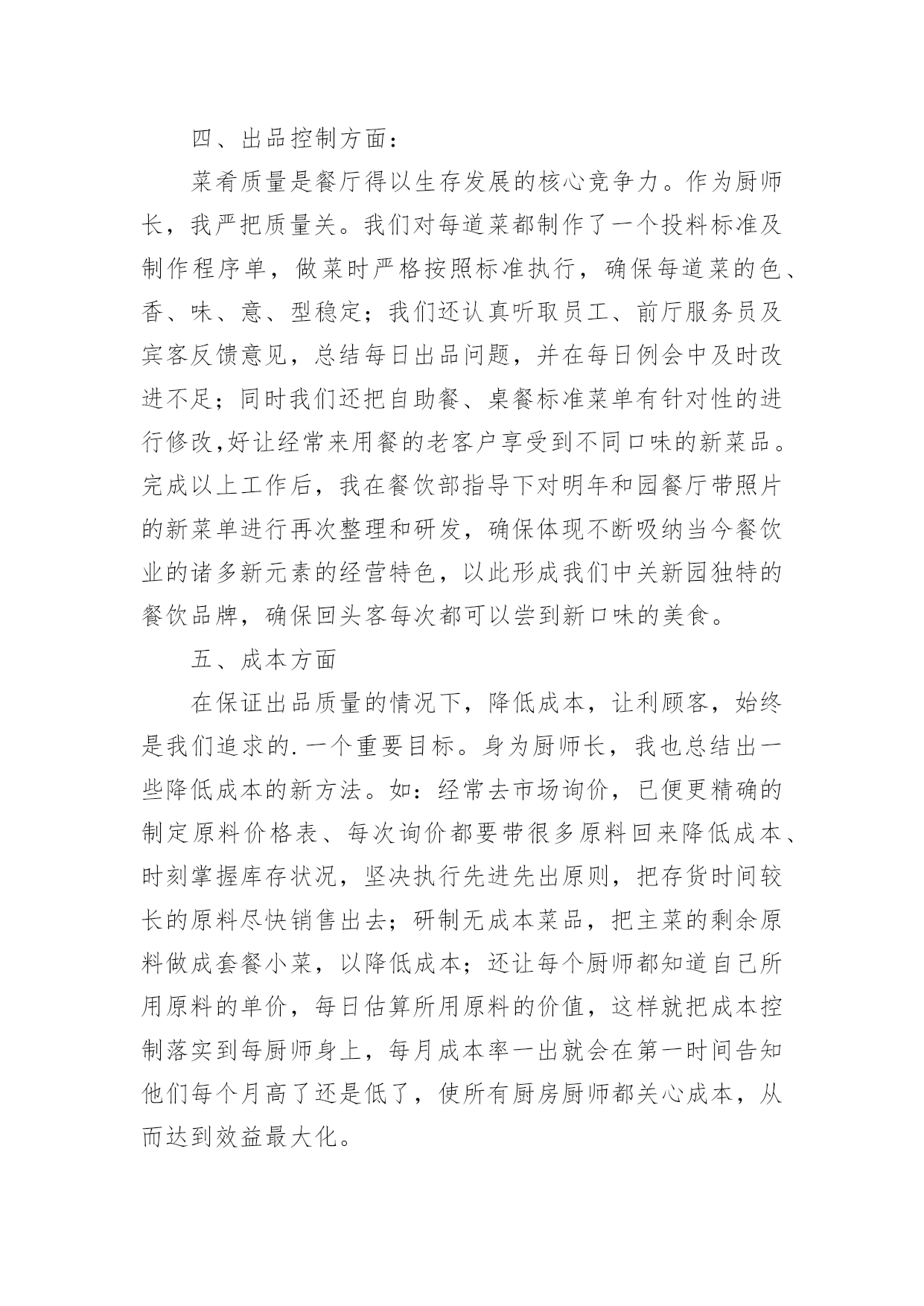 厨师工作总结厨师工作总结13篇【通用】总结是事后对某一阶段的学习、工作或其完成情况加以回顾和分析的一种书面材料,通过它可以正确认识以往学习和工作中的优缺点,因此,让我们写一份总结吧。总结怎么写才是正确的呢?下面是小编整理的厨师工作总结,仅供参考,欢迎大家阅读。厨师工作总结篇1尊敬的各位:一、经营:我在各位的下集思广益、制定较的经营计划。如:顾客的消费生理,推出绿色彩食品以及野生食品;季节性原料供应独特的地方,推出特价菜。等等。二、办理:以人为本,我员工情况素质教诲,每天都对员工有性的厨艺培训,并经常激励把工作看作是的事业。努力,员工整体素质得以,如注重仪表、笃守厨房规章轨制等;有些员工甚至还开始琢磨新菜谱。现在,了、优质、高效、创新的团队。三、质量:菜肴质量是食堂得以生存发展的焦点竞争力。厨师长,我严把质量关。对每道菜都制作了投料标准及制作程序单,做菜时标准,每道菜的色、香、味稳定;还前厅员工意见及宾客反馈,总结每日出品问题,并在每日例会中改进;还经常更新菜谱,动脑筋、想办法、变花样,回头客每次都能够尝到新口味。四、卫生:《食品卫生安全法》,抓好食品卫生安全工作,把好食品加工的各个环节。按规定,每个员工都对各自的卫生区,由我不查抄;,规定食品原料分类存放,分别,厨房器具也存固定位置;,厨房、保鲜柜、冷冻箱等原料存放地也的温度以及湿润水准测量。一切能够的气力,食品卫生安全,防止顾客食物中毒,不须要的后果。五、成本:在菜肴质量的情况下,降低成本,让利顾客,是追求的。厨师长,我也总结出降低成本的新方法。如:库存状态,坚决"先进先出"原则,把存货较长的原料尽快销售出去;研究制造无成本菜品,把主菜的剩余原料做成托式菜品,以降低成本;还让每位员工都知道所用原料的.单价,每日估算所用原料的价值,就把成本控制到每个员工身上,使所有厨房员工都成本,从而效益化。综上所述,在本年度,团队的努力,在厨房经营办理了;在菜品创新、菜肴质量、成本控制、员工素质等都高的成绩。当然,也还,比如,受甲流以及金融危机的,消费者就餐的品味与档次下降,这使的年收益受到水准的。但面可抗力,需研究制造物美价廉的佳肴来招揽顾客,水准的年收益,从而转危为机的。从事件上,我也深感我肩负工作的挑战性与创新性。此后,我会带领我的团队挑战、勇于创新,烹饪更精美的菜肴。厨师工作总结篇2时光飞逝,转眼间又过了一周了。回顾过去的每一天,我作为一名食堂工作人员,深感到责任的重大。为了今后能把工作干得更好,现就一周来的工作情况总结如下:一、原材物料管理方面:1、把好食堂原材物料进货关,不怕远路,进市场,货比多家,选购各种营养丰富的食品原料,保证物美价廉,让干部职工吃得好,花钱少。比喻说购买当季的青菜、现宰的猪肉、新鲜的花生油等等。2、管理好食堂的原材物料,不易储存的'原材物料尽量做到天天购买,对于易储存的原材物料也要根据往年消耗情况有计划的购买。保证原材物料不腐烂,不变质,不浪费,以节省食堂开支。同时对食堂的原材物料建账,做到帐物相符。3、每天根据就餐人数制作饭菜,尽量做到不剩菜或少剩菜。二、服务态度方面:我们在转变服务态度、提高服务质量方面做了大量工作。我们始终坚持以人为本的服务理念,采取了多种服务方式,尽量为干部职工提供便利条件。三、饭菜种类方面:我们根据季节、节日等情况为干部职工做好适合时令的可口饭菜,比喻:包饺子、包包子、炖白菜、炖土豆、炒青菜等,尽量满足干部职工的要求。四、卫生状况方面:我们本着积极负责的态度,认真搞好食物安全和卫生工作。生活服务工作千头万绪,最根本的工作要求就是食品的安全。因此,我们认真贯彻《食品卫生法》,把依法加强食品卫生管理和各项生活综合服务管理工作作为头等大事,列入重要的管理日程,并做到责任到人,抓紧抓实,抓出成效。切实做好食品卫生、餐具的“一洗、二冲、三消毒”工作,做到没有检疫证、食品卫生许可证的食品不购买,工制作餐台做到随用随清,每周对厨房一次大清扫,杜绝蚊蝇老鼠等害虫。厨师工作总结篇3伴着农历兔年脚步的渐渐远去,20xx年的钟声即将敲响。作为一名厨师长,我始终坚持以身作则,高标准、严要求,团结和带领广大厨房员工,努力为顾客提供精美的菜肴和优质的服务;为实现公司经济效益和社会效益,勤勤恳恳、兢兢业业。现将这几个月来的具体工作,作个总结。一.加强培训教育,提升员工素质。公司的规章制度,我经常在例会上向厨房员工提及、宣读,旨在要求大家都养成遵守公司制度的习惯;结合员工实际情况,我加强对员工进行有针对性的厨艺培训,并经常激励他们把工作看作是自己的事业。经过我的努力和大家的积极配合,厨房员工整体素质得以提升,遵守公司及厨房的规章制度、保持不错的个人卫生和仪表、钻研烹饪技术等行为,基本上都成了厨房员工的自觉行为。现在,一个和谐、优质、高效、创新的团队已经初步形成