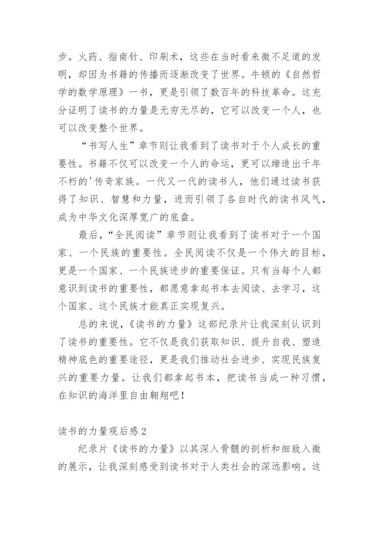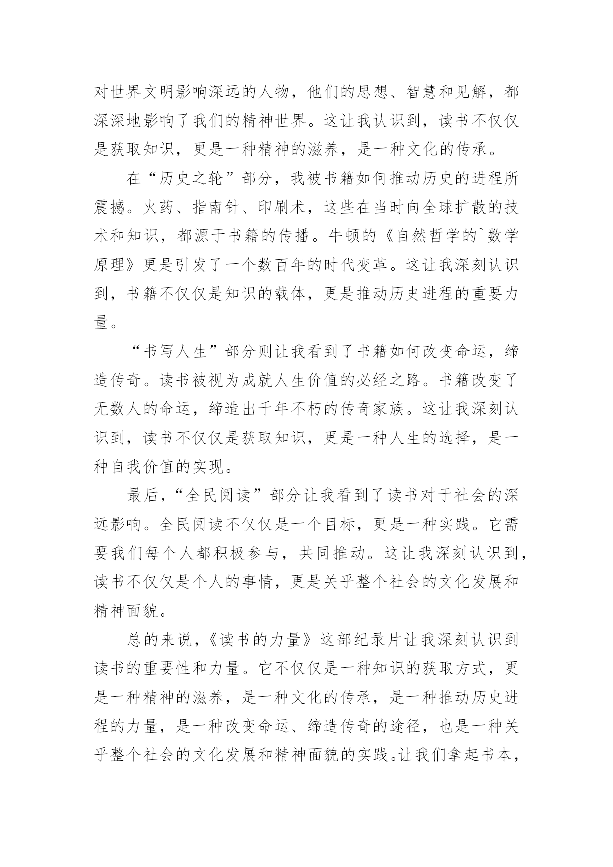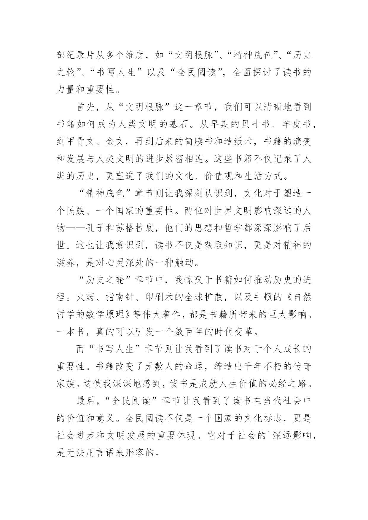 读书的力量观后感细细品味一部作品以后,想必你有不少可以分享的东西,写一份观后感,记录收获与付出。那么我们该怎么去写观后感呢?以下是小编收集整理的读书的力量观后感,仅供参考,大家一起来看看吧。读书的力量观后感1纪录片《读书的力量》以其深邃的洞察和丰富的历史素材,让我对读书这一行为有了全新的认识。这部纪录片不仅是一部关于书籍和阅读的历史,更是一部关于人类文明、精神追求和社会进步的史诗。首先,我被“文明根脉”这一章节深深吸引。书籍,从早期的贝叶书、羊皮书到后来的甲骨文、金文、帛书和简牍书,都是人类智慧的结晶。这些书籍不仅是知识的载体,更是文明的根脉。它们记录了人类的历史、文化和智慧,成为我们理解过去、把握现在和展望未来的重要工具。在“精神底色”这一章节中,我深刻感受到了文化对于塑造一个民族、一个国家的重要性。正如纪录片中所说,尽管所有人99.99%的基因都是相同的,但正是文化上的差异使得各个种族之间有着千差万别的面貌。孔子和苏格拉底,这两位对世界文明产生深远影响的人物,正是通过读书和思考,塑造了自己的精神底色,进而影响了整个文明的发展。“历史之轮”章节则让我看到了读书如何推动历史的进步。火药、指南针、印刷术,这些在当时看来微不足道的发明,却因为书籍的传播而逐渐改变了世界。牛顿的《自然哲学的数学原理》一书,更是引领了数百年的科技革命。这充分证明了读书的力量是无穷无尽的,它可以改变一个人,也可以改变整个世界。“书写人生”章节则让我看到了读书对于个人成长的重要性。书籍不仅可以改变一个人的命运,更可以缔造出千年不朽的'传奇家族。一代又一代的读书人,他们通过读书获得了知识、智慧和力量,进而引领了各自时代的读书风气,成为中华文化深厚宽广的底盘。最后,“全民阅读”章节则让我看到了读书对于一个国家、一个民族的重要性。全民阅读不仅是一个伟大的目标,更是一个国家、一个民族进步的重要保证。只有当每个人都意识到读书的重要性,都愿意拿起书本去阅读、去学习,这个国家、这个民族才能真正实现复兴。总的来说,《读书的力量》这部纪录片让我深刻认识到了读书的重要性。它不仅是我们获取知识、提升自我、塑造精神底色的重要途径,更是我们推动社会进步、实现民族复兴的重要力量。让我们都拿起书本,把读书当成一种习惯,在知识的海洋里自由翱翔吧!读书的力量观后感2纪录片《读书的力量》以其深入骨髓的剖析和细致入微的展示,让我深刻感受到读书对于人类社会的深远影响。这部纪录片从多个维度,如“文明根脉”、“精神底色”、“历史之轮”、“书写人生”以及“全民阅读”,全面探讨了读书的力量和重要性。首先,从“文明根脉”这一章节,我们可以清晰地看到书籍如何成为人类文明的基石。从早期的贝叶书、羊皮书,到甲骨文、金文,再到后来的简牍书和造纸术,书籍的演变和发展与人类文明的进步紧密相连。这些书籍不仅记录了人类的历史,更塑造了我们的文化、价值观和生活方式。“精神底色”章节则让我深刻认识到,文化对于塑造一个民族、一个国家的重要性。两位对世界文明影响深远的人物——孔子和苏格拉底,他们的思想和哲学都深深影响了后世。这也让我意识到,读书不仅是获取知识,更是对精神的滋养,是对心灵深处的一种触动。“历史之轮”章节中,我惊叹于书籍如何推动历史的进程。火药、指南针、印刷术的全球扩散,以及牛顿的《自然哲学的数学原理》等伟大著作,都是书籍所带来的巨大影响。一本书,真的可以引发一个数百年的时代变革。而“书写人生”章节则让我看到了读书对于个人成长的重要性。书籍改变了无数人的命运,缔造出千年不朽的传奇家族。这使我深深地感到,读书是成就人生价值的必经之路。最后,“全民阅读”章节让我看到了读书在当代社会中的价值和意义。全民阅读不仅是一个国家的文化标志,更是社会进步和文明发展的重要体现。它对于社会的`深远影响,是无法用言语来形容的。观看完这部纪录片后,我深感读书的力量是无穷的。它不仅可以让我们了解历史,认识世界,更可以让我们找到自我,实现价值。因此,我呼吁每一个人都应该珍惜读书的机会,把读书当成一种习惯,一种生活方式。在知识的海洋中,我们可以找到无尽的宝藏,也可以找到真正的自我。让我们都拿起书本,感受读书的力量,让知识成为我们前进的动力,让智慧照亮我们的人生之路。读书的力量观后感3《读书的力量》这部纪录片,无疑是一次对知识与文化深沉而广阔的探索。这部由夏骏担任总编导的纪录片,在2017年CCTV纪录频道首播,纵贯千载岁月,横跨万里陆海,为我们揭示了书籍如何成为文明的根脉,如何塑造我们的精神世界,如何推动历史的进程,如何书写人生的传奇,以及全民阅读对于社会的深远影响。在“文明根脉”这一部分,我被那些古老的书籍形态所吸引,如贝叶书、羊皮书、甲骨文、金文、帛书和简牍书。这些书籍,尽管形态各异,但都承载着人类文明的智慧与经验。它们是人类文明的根脉,