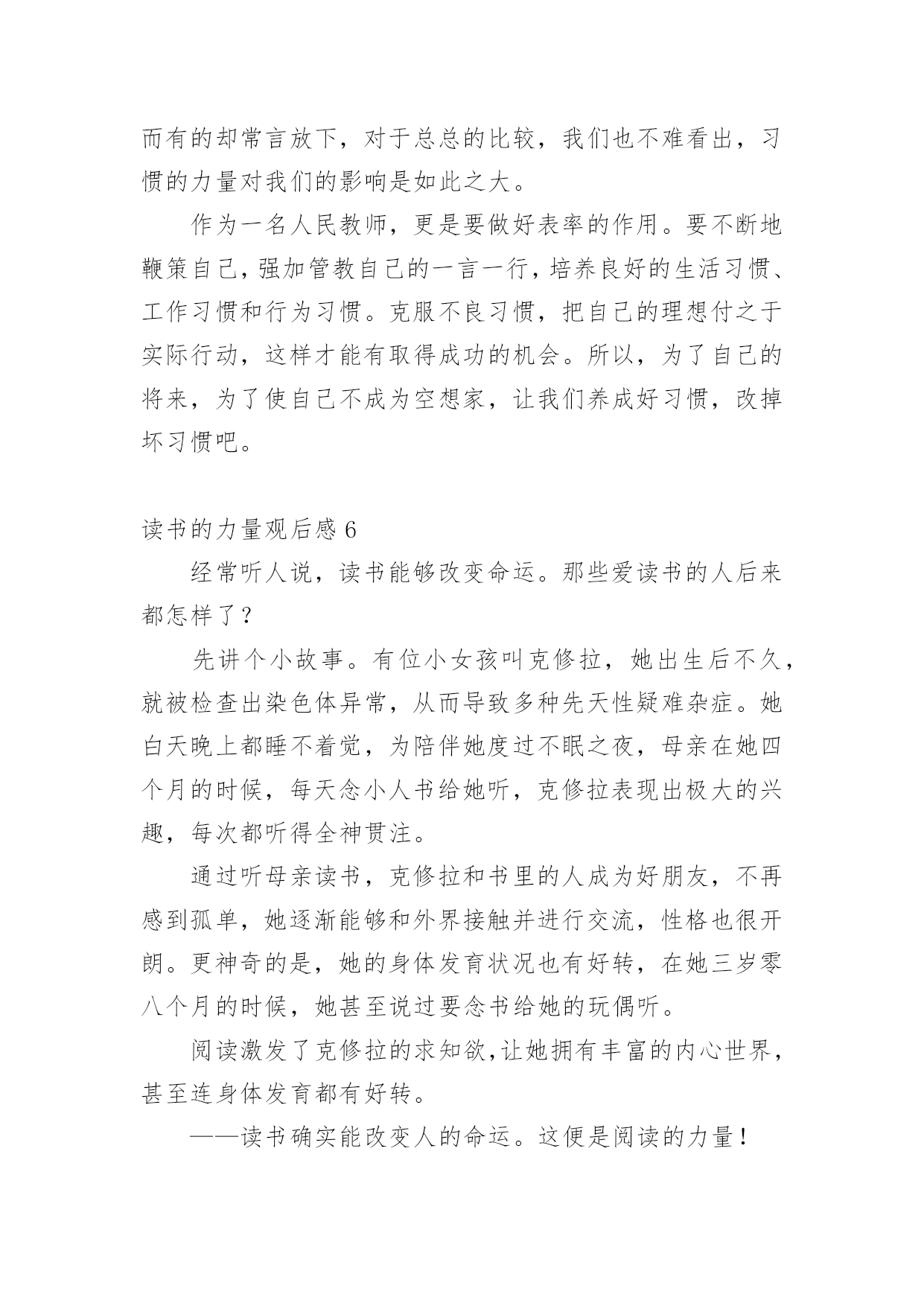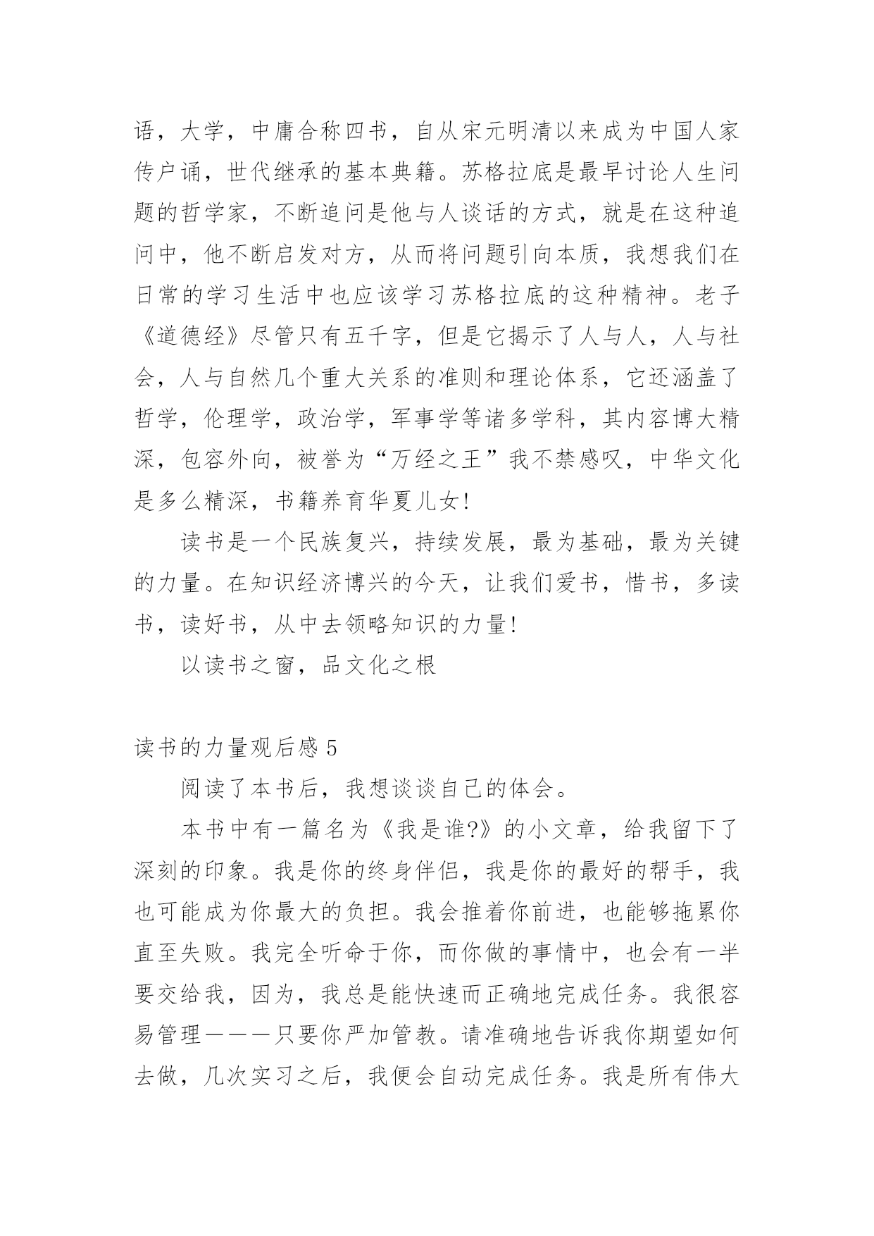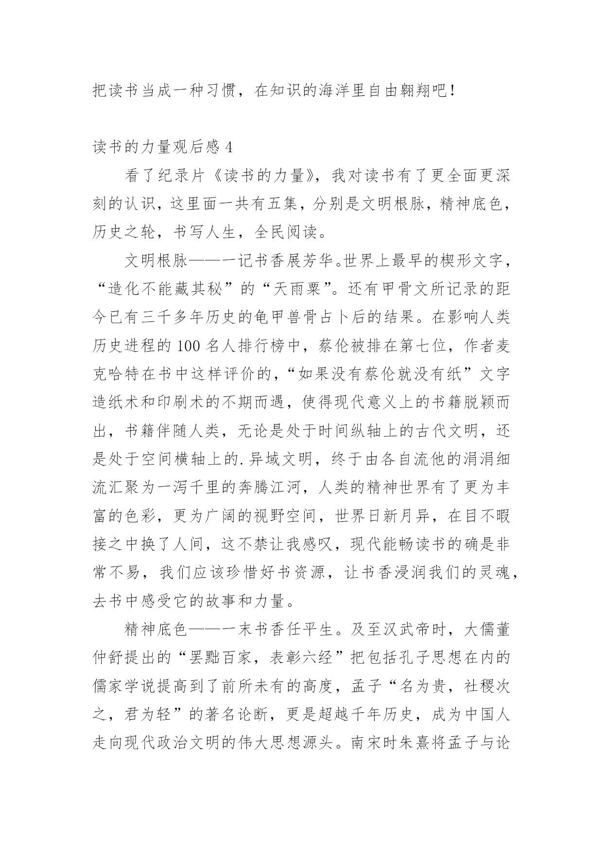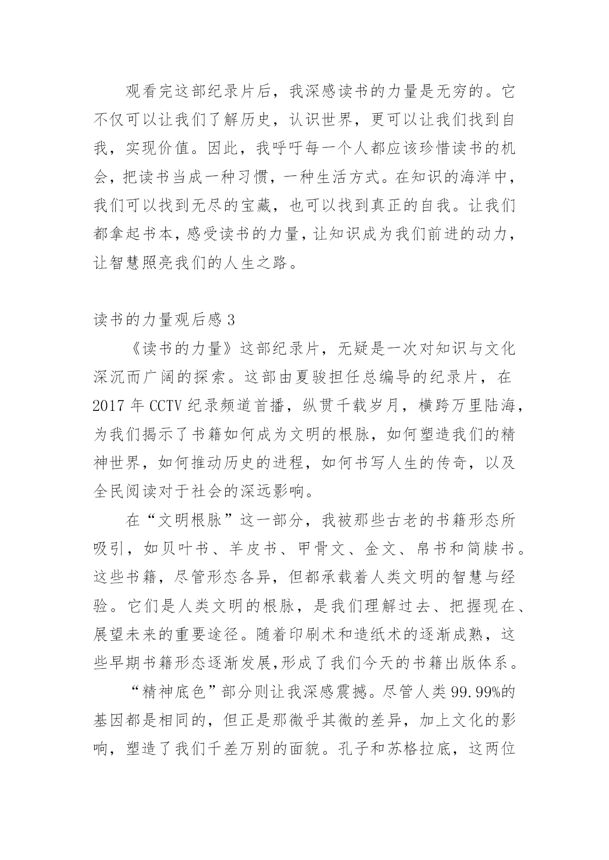 读书的力量观后感细细品味一部作品以后,想必你有不少可以分享的东西,写一份观后感,记录收获与付出。那么我们该怎么去写观后感呢?以下是小编收集整理的读书的力量观后感,仅供参考,大家一起来看看吧。读书的力量观后感1纪录片《读书的力量》以其深邃的洞察和丰富的历史素材,让我对读书这一行为有了全新的认识。这部纪录片不仅是一部关于书籍和阅读的历史,更是一部关于人类文明、精神追求和社会进步的史诗。首先,我被“文明根脉”这一章节深深吸引。书籍,从早期的贝叶书、羊皮书到后来的甲骨文、金文、帛书和简牍书,都是人类智慧的结晶。这些书籍不仅是知识的载体,更是文明的根脉。它们记录了人类的历史、文化和智慧,成为我们理解过去、把握现在和展望未来的重要工具。在“精神底色”这一章节中,我深刻感受到了文化对于塑造一个民族、一个国家的重要性。正如纪录片中所说,尽管所有人99.99%的基因都是相同的,但正是文化上的差异使得各个种族之间有着千差万别的面貌。孔子和苏格拉底,这两位对世界文明产生深远影响的人物,正是通过读书和思考,塑造了自己的精神底色,进而影响了整个文明的发展。“历史之轮”章节则让我看到了读书如何推动历史的进步。火药、指南针、印刷术,这些在当时看来微不足道的发明,却因为书籍的传播而逐渐改变了世界。牛顿的《自然哲学的数学原理》一书,更是引领了数百年的科技革命。这充分证明了读书的力量是无穷无尽的,它可以改变一个人,也可以改变整个世界。“书写人生”章节则让我看到了读书对于个人成长的重要性。书籍不仅可以改变一个人的命运,更可以缔造出千年不朽的'传奇家族。一代又一代的读书人,他们通过读书获得了知识、智慧和力量,进而引领了各自时代的读书风气,成为中华文化深厚宽广的底盘。最后,“全民阅读”章节则让我看到了读书对于一个国家、一个民族的重要性。全民阅读不仅是一个伟大的目标,更是一个国家、一个民族进步的重要保证。只有当每个人都意识到读书的重要性,都愿意拿起书本去阅读、去学习,这个国家、这个民族才能真正实现复兴。总的来说,《读书的力量》这部纪录片让我深刻认识到了读书的重要性。它不仅是我们获取知识、提升自我、塑造精神底色的重要途径,更是我们推动社会进步、实现民族复兴的重要力量。让我们都拿起书本,把读书当成一种习惯,在知识的海洋里自由翱翔吧!读书的力量观后感2纪录片《读书的力量》以其深入骨髓的剖析和细致入微的展示,让我深刻感受到读书对于人类社会的深远影响。这部纪录片从多个维度,如“文明根脉”、“精神底色”、“历史之轮”、“书写人生”以及“全民阅读”,全面探讨了读书的力量和重要性。首先,从“文明根脉”这一章节,我们可以清晰地看到书籍如何成为人类文明的基石。从早期的贝叶书、羊皮书,到甲骨文、金文,再到后来的简牍书和造纸术,书籍的演变和发展与人类文明的进步紧密相连。这些书籍不仅记录了人类的历史,更塑造了我们的文化、价值观和生活方式。“精神底色”章节则让我深刻认识到,文化对于塑造一个民族、一个国家的重要性。两位对世界文明影响深远的人物——孔子和苏格拉底,他们的思想和哲学都深深影响了后世。这也让我意识到,读书不仅是获取知识,更是对精神的滋养,是对心灵深处的一种触动。“历史之轮”章节中,我惊叹于书籍如何推动历史的进程。火药、指南针、印刷术的全球扩散,以及牛顿的《自然哲学的数学原理》等伟大著作,都是书籍所带来的巨大影响。一本书,真的可以引发一个数百年的时代变革。而“书写人生”章节则让我看到了读书对于个人成长的重要性。书籍改变了无数人的命运,缔造出千年不朽的传奇家族。这使我深深地感到,读书是成就人生价值的必经之路。最后,“全民阅读”章节让我看到了读书在当代社会中的价值和意义。全民阅读不仅是一个国家的文化标志,更是社会进步和文明发展的重要体现。它对于社会的`深远影响,是无法用言语来形容的。观看完这部纪录片后,我深感读书的力量是无穷的。它不仅可以让我们了解历史,认识世界,更可以让我们找到自我,实现价值。因此,我呼吁每一个人都应该珍惜读书的机会,把读书当成一种习惯,一种生活方式。在知识的海洋中,我们可以找到无尽的宝藏,也可以找到真正的自我。让我们都拿起书本,感受读书的力量,让知识成为我们前进的动力,让智慧照亮我们的人生之路。读书的力量观后感3《读书的力量》这部纪录片,无疑是一次对知识与文化深沉而广阔的探索。这部由夏骏担任总编导的纪录片,在2017年CCTV纪录频道首播,纵贯千载岁月,横跨万里陆海,为我们揭示了书籍如何成为文明的根脉,如何塑造我们的精神世界,如何推动历史的进程,如何书写人生的传奇,以及全民阅读对于社会的深远影响。在“文明根脉”这一部分,我被那些古老的书籍形态所吸引,如贝叶书、羊皮书、甲骨文、金文、帛书和简牍书。这些书籍,尽管形态各异,但都承载着人类文明的智慧与经验。它们是人类文明的根脉,