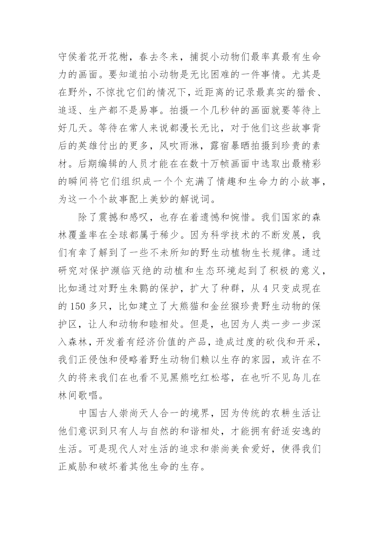 《森林之歌》观后感《森林之歌》观后感当看完一部作品后,一定有不少感悟吧,现在就让我们写一篇走心的观后感吧。是不是无从下笔、没有头绪?以下是小编为大家收集的《森林之歌》观后感,供大家参考借鉴,希望可以帮助到有需要的朋友。曾经有一段时间法国的记录片《鸟的迁徙》让我很痴迷,喜欢片中短短的念白:鸟的迁徙是关于生命的承诺。也喜欢那些灵动的生命和自然界里无比神奇的色彩。一个朋友跑遍了杭州大小书店找到了一本同名的画册给我,400大洋的价格让我为对方的荷包大大的感叹一番。在感动之余,一直感叹国内为什么没有好的自然类的记录片,更没有与记录片相关的图书。记录片是生动的,但画册则将最美丽的瞬间凝固,可以让人久久回味;记录片是直白的,但图书中的文字则委婉地给我们讲述了背后鲜为人知的故事。《森林之歌》是财政部、国家林业局、中央电视台联合摄制的中国首部大型生态记录片。我只是在电视里偶然地看到了几个画面,虽然与国外的大制作高成本记录片无法比拟,但那些真实的画面足以让我们得到心灵的震撼。但看了同名的图书后让我对那些在幕后兢兢业业工作的专业制作人员有了无比的崇敬。9集50分钟的片子,他们花了整整3年的时间。静静地守侯着花开花榭,春去冬来,捕捉小动物们最率真最有生命力的画面。要知道拍小动物是无比困难的一件事情。尤其是在野外,不惊扰它们的情况下,近距离的记录最真实的猎食、追逐、生产都不是易事。拍摄一个几秒钟的画面就要等待上好几天。等待在常人来说都漫长无比,对于他们这些故事背后的英雄付出的更多,风吹雨淋,露宿暴晒拍摄到珍贵的素材。后期编辑的人员才能在在数十万帧画面中选取出最精彩的瞬间将它们组织成一个个充满了情趣和生命力的小故事,为这一个个故事配上美妙的解说词。除了震撼和感叹,也存在着遗憾和惋惜。我们国家的森林覆盖率在全球都属于稀少。因为科学技术的不断发展,我们有幸了解到了一些不未所知的野生动植物生长规律。通过研究对保护濒临灭绝的动植和生态环境起到了积极的意义,比如通过对野生朱鹮的保护,扩大了种群,从4只变成现在的150多只,比如建立了大熊猫和金丝猴珍贵野生动物的保护区,让人和动物和睦相处。但是,也因为人类一步一步深入森林,开发着有经济价值的产品,造成过度的砍伐和开采,我们正侵蚀和侵略着野生动物们赖以生存的家园,或许在不久的将来我们在也看不见黑熊吃红松塔,在也听不见鸟儿在林间歌唱。中国古人崇尚天人合一的境界,因为传统的农耕生活让他们意识到只有人与自然的和谐相处,才能拥有舒适安逸的生活。可是现代人对生活的追求和崇尚美食爱好,使得我们正威胁和破坏着其他生命的生存。毛竹24小时生长20厘米,胡杨树在旱地里孤独地守侯,碧凤蝶用一生来完成的短暂相逢……每一个生命都诠释着他们对生活的热爱。而我们可以做的是节约一张纸,不用一次性的筷子,拒吃野生动物,拒穿动物皮毛。一点一滴,用自己的行动来保护生态,维持我们共同的蓝天。