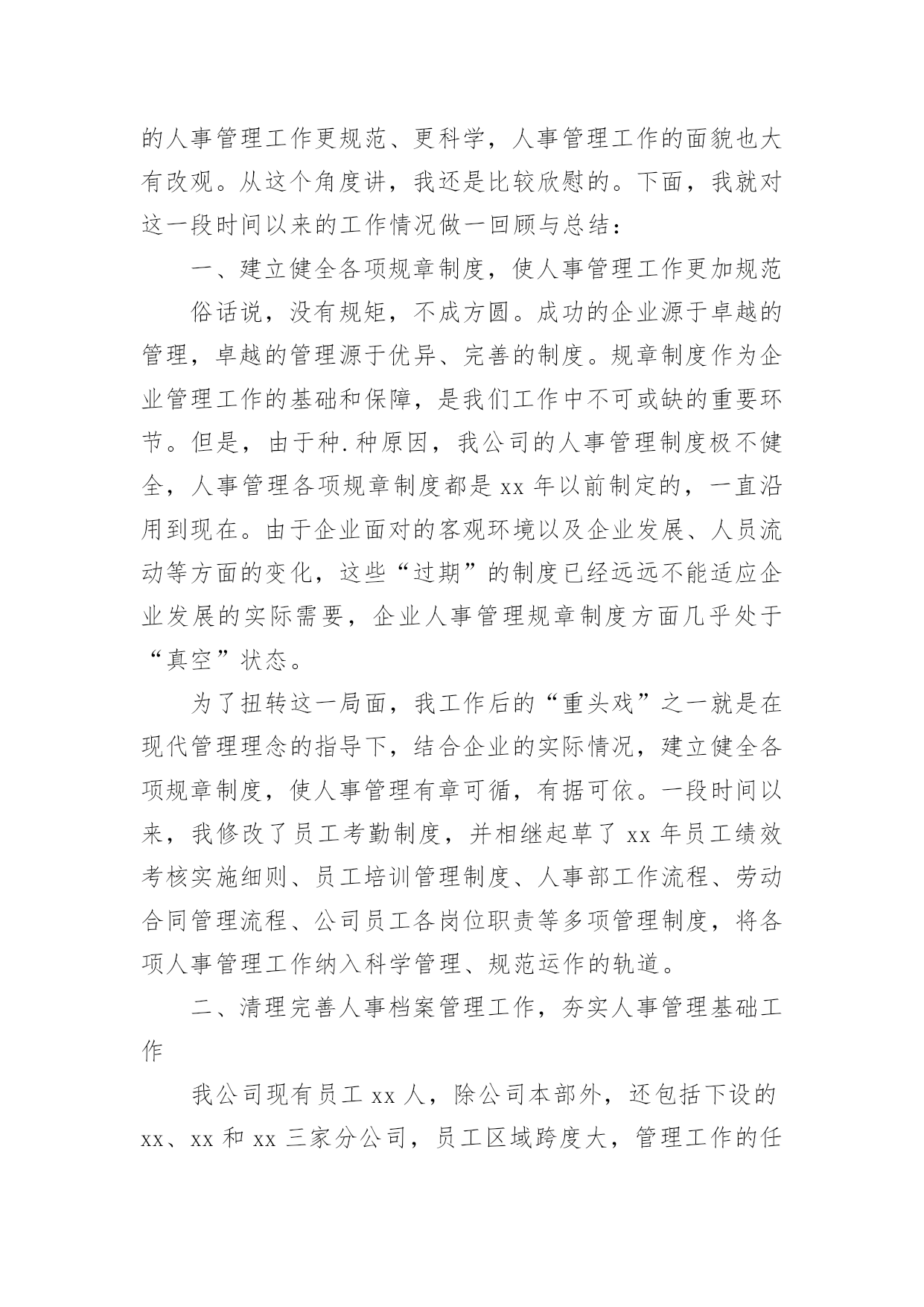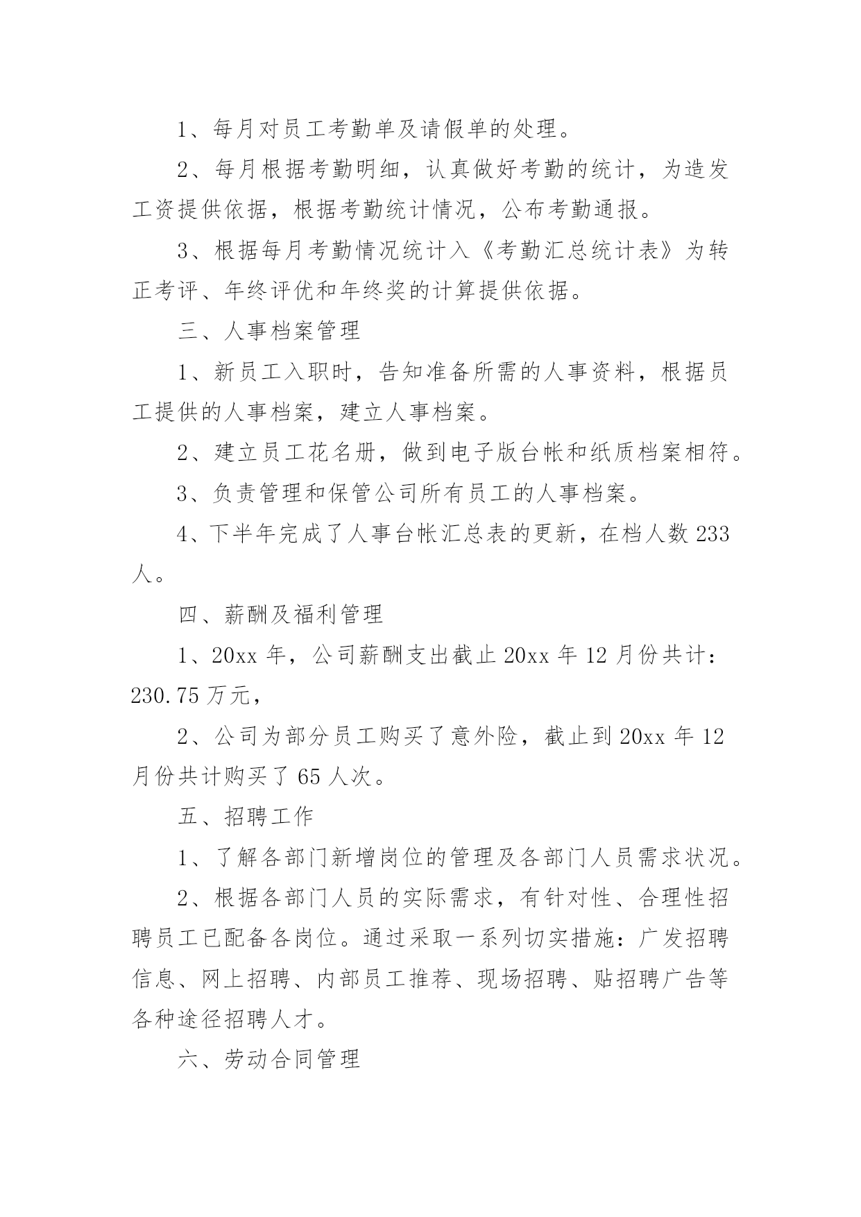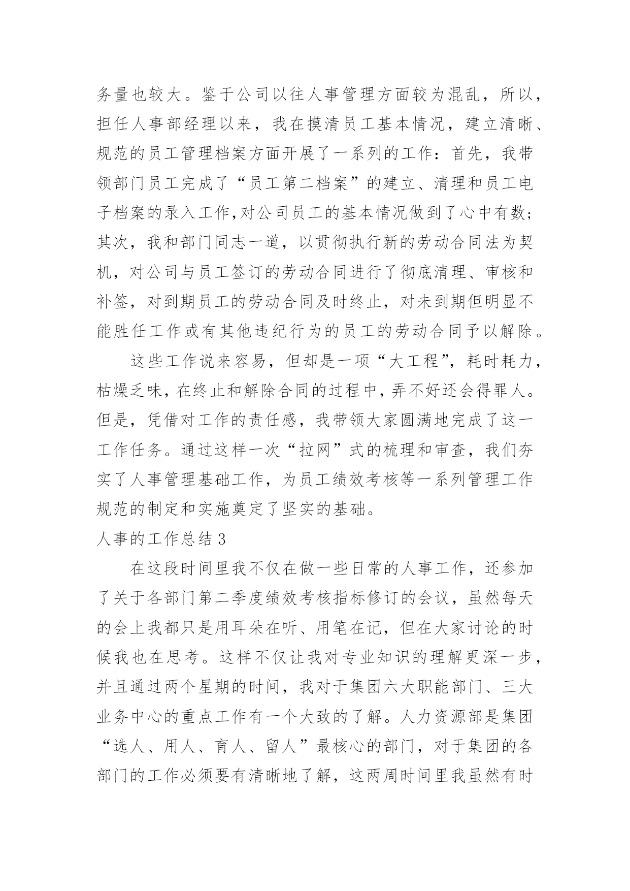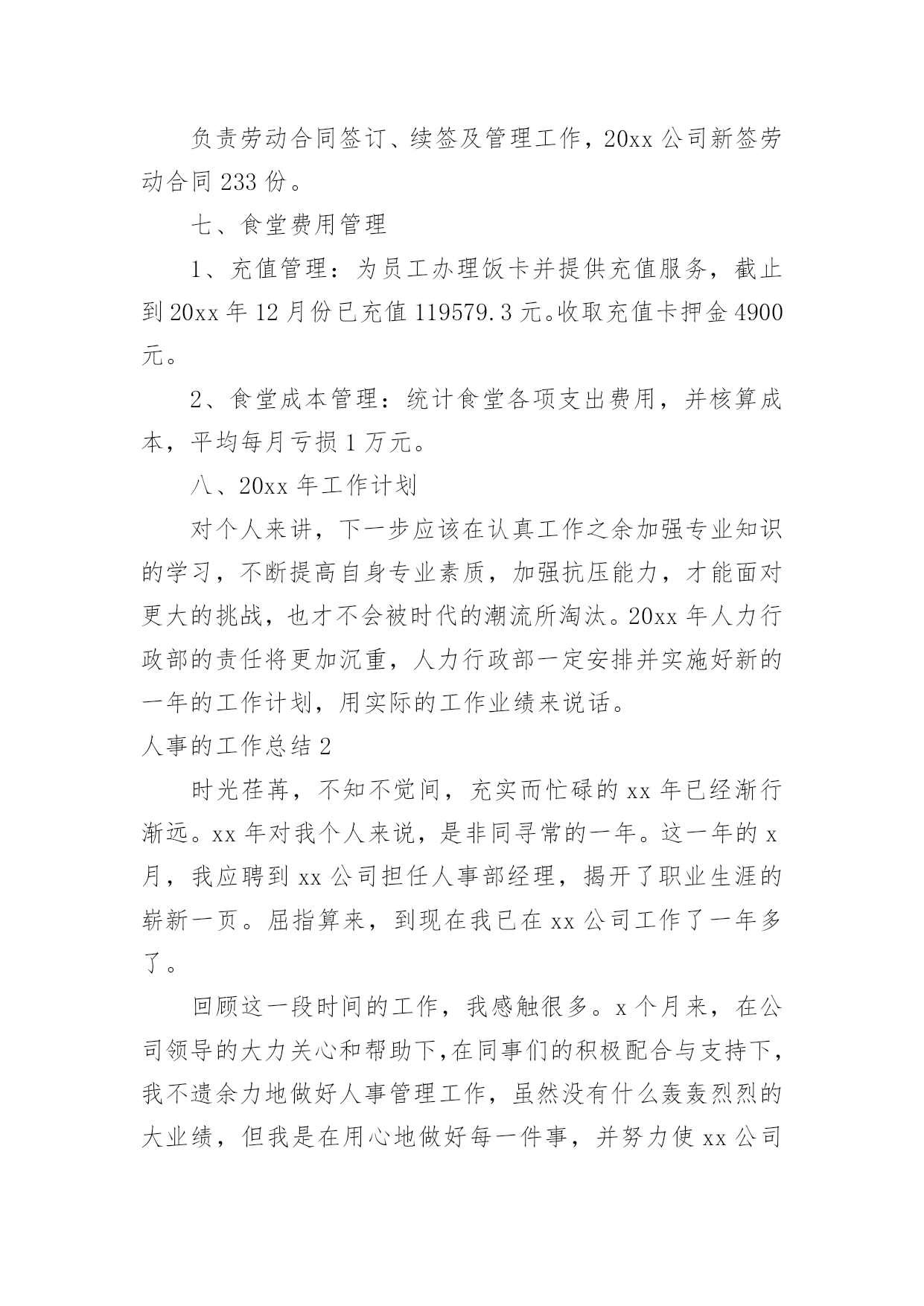 人事的工作总结人事的工作总结总结是指社会团体、企业单位和个人对某一阶段的学习、工作或其完成情况加以回顾和分析,得出教训和一些规律性认识的一种书面材料,通过它可以正确认识以往学习和工作中的优缺点,因此我们需要回头归纳,写一份总结了。如何把总结做到重点突出呢?下面是小编帮大家整理的人事的工作总结,欢迎阅读与收藏。人事的工作总结1在20xx年来临之际,回望20xx年度的工作生活,感受到公司及身边的人这一年来发生的巨大变化,身边的同事也都在不断进步着,朝着同一个目标奋斗。新的一年到来了,也带来了新的挑战,在我们准备以全新的面貌来迎接新年的到来时,也不忘回顾和总结过去一年来所做的工作,现对我今年的工作做如下总结。一、公司截止20xx年12月人力资源现状公司20xx年初在编18人,本年截止12月份入职人数为357人,入职率为:284.5%;离职人数为xx。截止20xx年12份在编人数为:233人;离职率为:113.1%;员工进出比率为251.4%。二、考勤管理1、每月对员工考勤单及请假单的处理。2、每月根据考勤明细,认真做好考勤的统计,为造发工资提供依据,根据考勤统计情况,公布考勤通报。3、根据每月考勤情况统计入《考勤汇总统计表》为转正考评、年终评优和年终奖的计算提供依据。三、人事档案管理1、新员工入职时,告知准备所需的人事资料,根据员工提供的人事档案,建立人事档案。2、建立员工花名册,做到电子版台帐和纸质档案相符。3、负责管理和保管公司所有员工的人事档案。4、下半年完成了人事台帐汇总表的更新,在档人数233人。四、薪酬及福利管理1、20xx年,公司薪酬支出截止20xx年12月份共计:230.75万元,2、公司为部分员工购买了意外险,截止到20xx年12月份共计购买了65人次。五、招聘工作1、了解各部门新增岗位的管理及各部门人员需求状况。2、根据各部门人员的实际需求,有针对性、合理性招聘员工已配备各岗位。通过采取一系列切实措施:广发招聘信息、网上招聘、内部员工推荐、现场招聘、贴招聘广告等各种途径招聘人才。六、劳动合同管理负责劳动合同签订、续签及管理工作,20xx公司新签劳动合同233份。七、食堂费用管理1、充值管理:为员工办理饭卡并提供充值服务,截止到20xx年12月份已充值119579.3元。收取充值卡押金4900元。2、食堂成本管理:统计食堂各项支出费用,并核算成本,平均每月亏损1万元。八、20xx年工作计划对个人来讲,下一步应该在认真工作之余加强专业知识的学习,不断提高自身专业素质,加强抗压能力,才能面对更大的挑战,也才不会被时代的潮流所淘汰。20xx年人力行政部的责任将更加沉重,人力行政部一定安排并实施好新的一年的工作计划,用实际的工作业绩来说话。人事的工作总结2时光荏苒,不知不觉间,充实而忙碌的xx年已经渐行渐远。xx年对我个人来说,是非同寻常的一年。这一年的x月,我应聘到xx公司担任人事部经理,揭开了职业生涯的崭新一页。屈指算来,到现在我已在xx公司工作了一年多了。回顾这一段时间的工作,我感触很多。x个月来,在公司领导的大力关心和帮助下,在同事们的积极配合与支持下,我不遗余力地做好人事管理工作,虽然没有什么轰轰烈烈的大业绩,但我是在用心地做好每一件事,并努力使xx公司的人事管理工作更规范、更科学,人事管理工作的面貌也大有改观。从这个角度讲,我还是比较欣慰的。下面,我就对这一段时间以来的工作情况做一回顾与总结:一、建立健全各项规章制度,使人事管理工作更加规范俗话说,没有规矩,不成方圆。成功的企业源于卓越的管理,卓越的管理源于优异、完善的制度。规章制度作为企业管理工作的基础和保障,是我们工作中不可或缺的重要环节。但是,由于种.种原因,我公司的人事管理制度极不健全,人事管理各项规章制度都是xx年以前制定的,一直沿用到现在。由于企业面对的客观环境以及企业发展、人员流动等方面的变化,这些“过期”的制度已经远远不能适应企业发展的实际需要,企业人事管理规章制度方面几乎处于“真空”状态。为了扭转这一局面,我工作后的“重头戏”之一就是在现代管理理念的指导下,结合企业的实际情况,建立健全各项规章制度,使人事管理有章可循,有据可依。一段时间以来,我修改了员工考勤制度,并相继起草了xx年员工绩效考核实施细则、员工培训管理制度、人事部工作流程、劳动合同管理流程、公司员工各岗位职责等多项管理制度,将各项人事管理工作纳入科学管理、规范运作的轨道。二、清理完善人事档案管理工作,夯实人事管理基础工作我公司现有员工xx人,除公司本部外,还包括下设的xx、xx和xx三家分公司,员工区域跨度大,管理工作的任务量也较大。鉴于公司以往人事管理方面较为混乱,所以,担任人事部经理以来,我在摸清员工基本情况,建立清晰、规范的员工管理档案方面开展了一系列的工作:首先,我带领