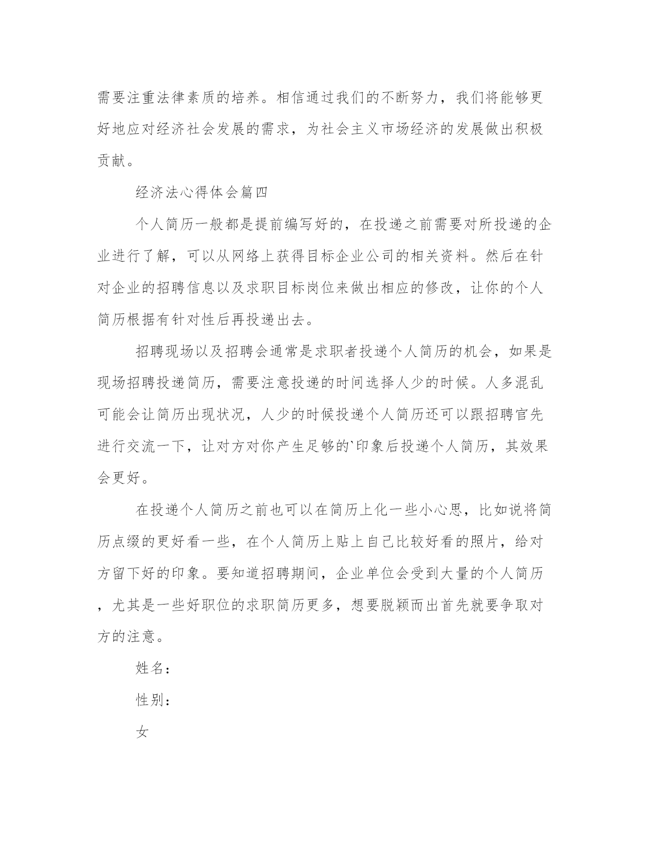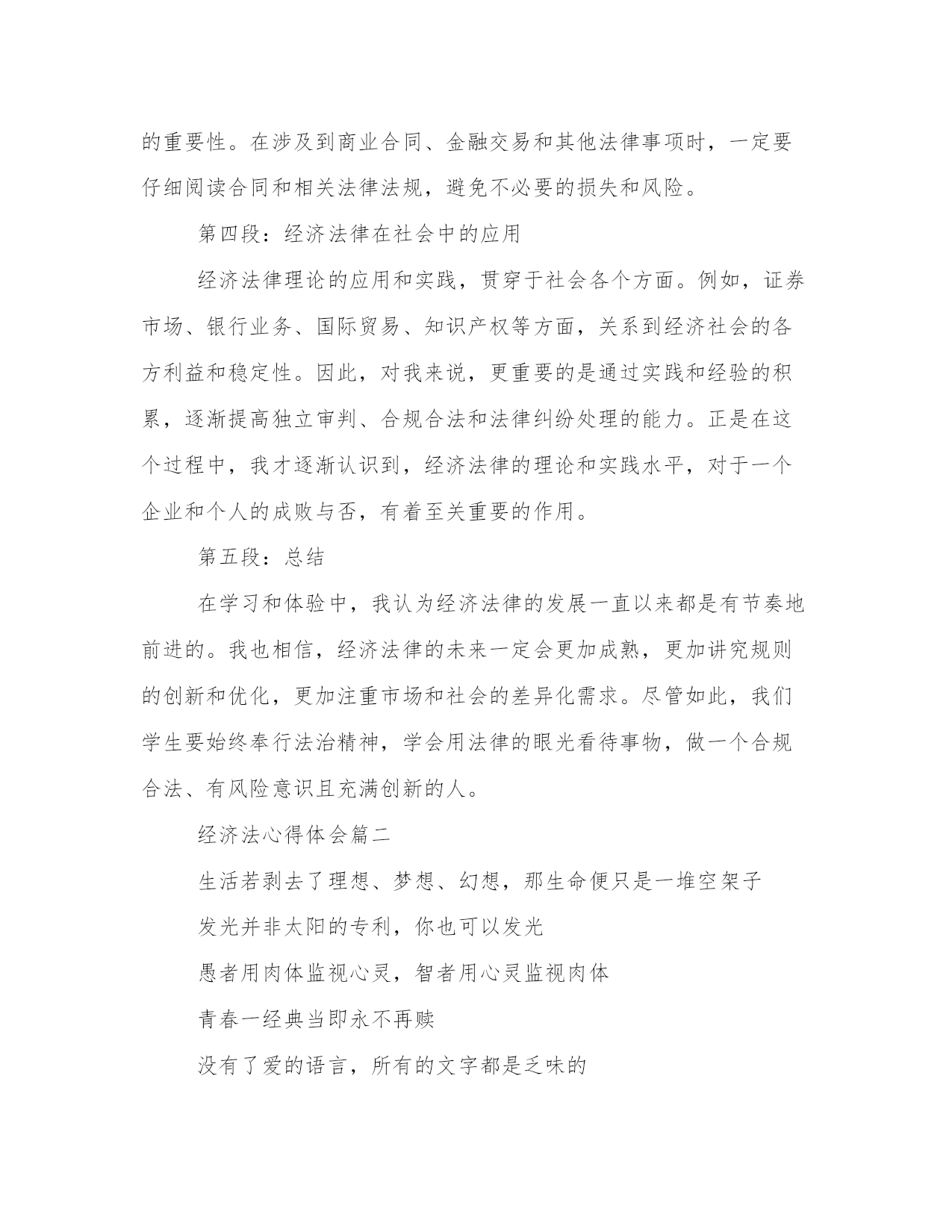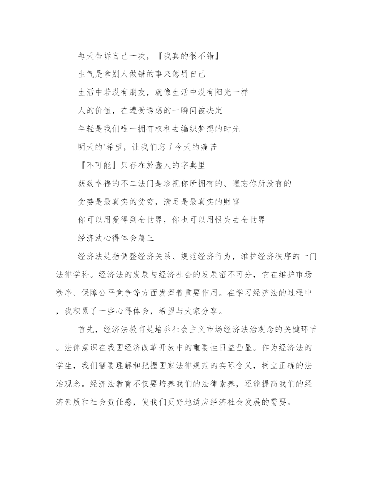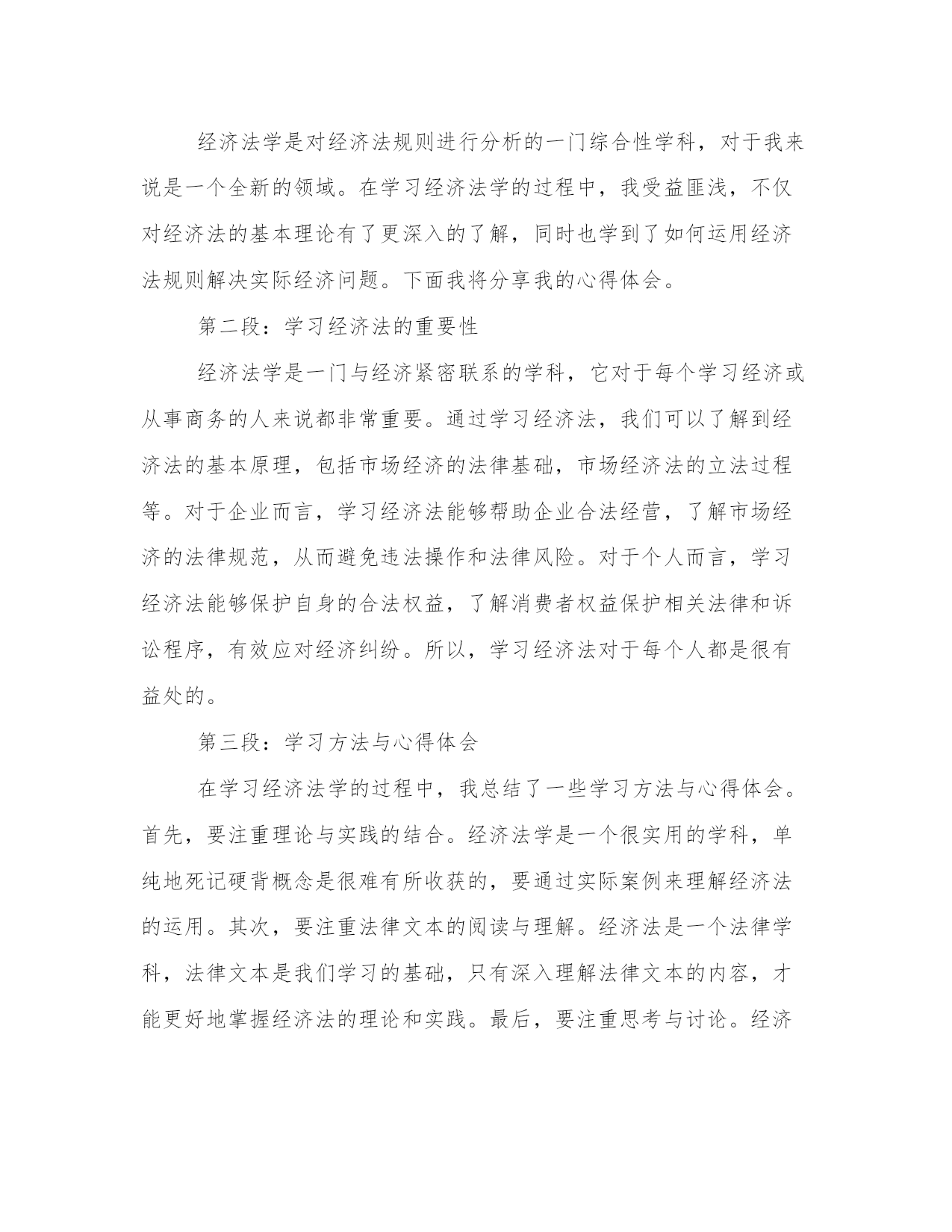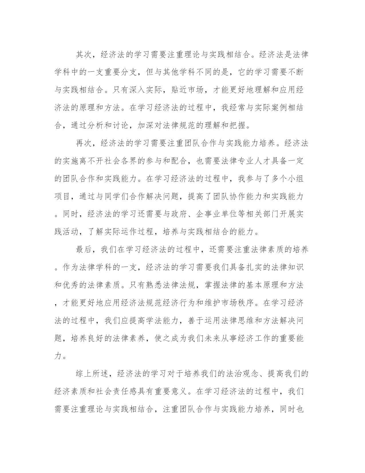 2023年经济法心得体会经济法律心得体会(大全13篇)心得体会是我们在经历一些事情后所得到的一种感悟和领悟。通过记录心得体会,我们可以更好地认识自己,借鉴他人的经验,规划自己的未来,为社会的进步做出贡献。下面我给大家整理了一些心得体会范文,希望能够帮助到大家。经济法心得体会篇一作为一名学习经济法律的学生,我深刻体会到其重要性和独特性。在学习和掌握知识的过程中,不仅让我对经济和法律有了更深层次的认识,也让我领悟到了很多生活中的实用技能和体会。第二段:经济学的心得体会在学习经济学的过程中,我深刻体会到“供需相对原理”的重要性。只有在供需趋向均衡的情况下,市场才能充分发挥其作用,推动经济健康发展。此外,学习经济学还能帮助我更好地理解和阐述商业模式,市场环境,买卖双方的合理诉求。以此出发,可以更好地满足客户的需求,并从中获得巨大的自我价值和经济利益。第三段:法律学的心得体会在学习法律学的过程中,我深刻体会到:“法律是制约行为的规范”。在市场交易和社会交往的过程中,法律起到了至关重要的作用。在不断成长的经济社会中,法律的发展和完善必不可少,才能有效地解决和规避各种争端和不良事件。同时,我也更加意识到了自我保护的重要性。在涉及到商业合同、金融交易和其他法律事项时,一定要仔细阅读合同和相关法律法规,避免不必要的损失和风险。第四段:经济法律在社会中的应用经济法律理论的应用和实践,贯穿于社会各个方面。例如,证券市场、银行业务、国际贸易、知识产权等方面,关系到经济社会的各方利益和稳定性。因此,对我来说,更重要的是通过实践和经验的积累,逐渐提高独立审判、合规合法和法律纠纷处理的能力。正是在这个过程中,我才逐渐认识到,经济法律的理论和实践水平,对于一个企业和个人的成败与否,有着至关重要的作用。第五段:总结在学习和体验中,我认为经济法律的发展一直以来都是有节奏地前进的。我也相信,经济法律的未来一定会更加成熟,更加讲究规则的创新和优化,更加注重市场和社会的差异化需求。尽管如此,我们学生要始终奉行法治精神,学会用法律的眼光看待事物,做一个合规合法、有风险意识且充满创新的人。经济法心得体会篇二生活若剥去了理想、梦想、幻想,那生命便只是一堆空架子发光并非太阳的专利,你也可以发光愚者用肉体监视心灵,智者用心灵监视肉体青春一经典当即永不再赎没有了爱的语言,所有的文字都是乏味的每天告诉自己一次,『我真的很不错』生气是拿别人做错的事来惩罚自己生活中若没有朋友,就像生活中没有阳光一样人的价值,在遭受诱惑的一瞬间被决定年轻是我们唯一拥有权利去编织梦想的时光明天的`希望,让我们忘了今天的痛苦『不可能』只存在於蠢人的字典里获致幸福的不二法门是珍视你所拥有的、遗忘你所没有的贪婪是最真实的贫穷,满足是最真实的财富你可以用爱得到全世界,你也可以用恨失去全世界经济法心得体会篇三经济法是指调整经济关系、规范经济行为,维护经济秩序的一门法律学科。经济法的发展与经济社会的发展密不可分,它在维护市场秩序、保障公平竞争等方面发挥着重要作用。在学习经济法的过程中,我积累了一些心得体会,希望与大家分享。首先,经济法教育是培养社会主义市场经济法治观念的关键环节。法律意识在我国经济改革开放中的重要性日益凸显。作为经济法的学生,我们需要理解和把握国家法律规范的实际含义,树立正确的法治观念。经济法教育不仅要培养我们的法律素养,还能提高我们的经济素质和社会责任感,使我们更好地适应经济社会发展的需要。其次,经济法的学习需要注重理论与实践相结合。经济法是法律学科中的一支重要分支,但与其他学科不同的是,它的学习需要不断与实践相结合。只有深入实际,贴近市场,才能更好地理解和应用经济法的原理和方法。在学习经济法的过程中,我经常与实际案例相结合,通过分析和讨论,加深对法律规范的理解和把握。再次,经济法的学习需要注重团队合作与实践能力培养。经济法的实施离不开社会各界的参与和配合,也需要法律专业人才具备一定的团队合作和实践能力。在学习经济法的过程中,我参与了多个小组项目,通过与同学们合作解决问题,提高了团队协作能力和实践能力。同时,经济法的学习还需要与政府、企事业单位等相关部门开展实践活动,了解实际运作过程,培养与实践相结合的能力。最后,我们在学习经济法的过程中,还需要注重法律素质的培养。作为法律学科的一支,经济法的学习需要我们具备扎实的法律知识和优秀的法律素质。只有熟悉法律法规,掌握法律的基本原理和方法,才能更好地应用经济法规范经济行为和维护市场秩序。在学习经济法的过程中,我们应提高学法能力,善于运用法律思维和方法解决问题,培养良好的法律素养,使之成为我们未来从事经济工作的重要能力。综上所述,经济法的学习对于培养我们的法治观念、提高我们的经济素质和社会
