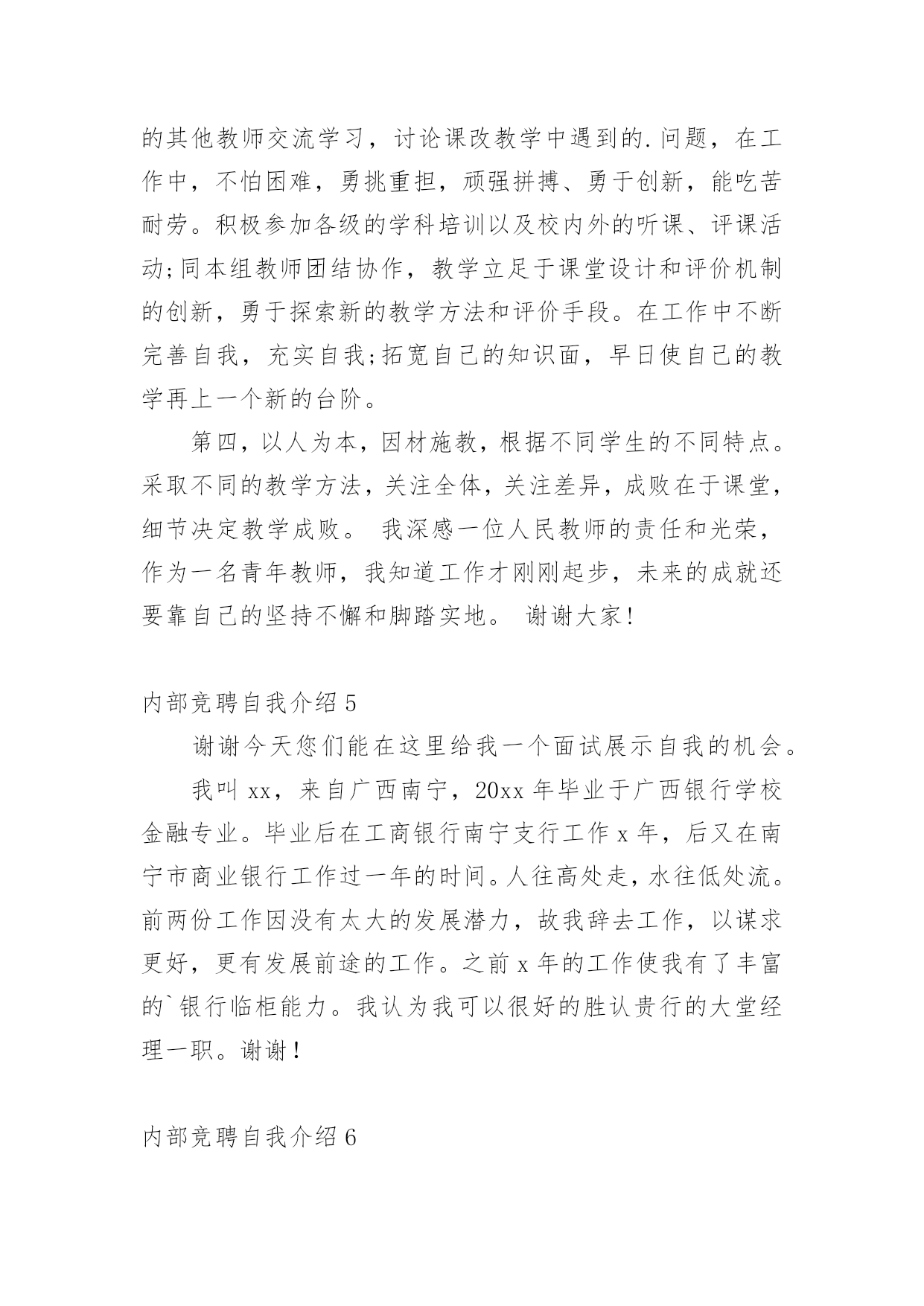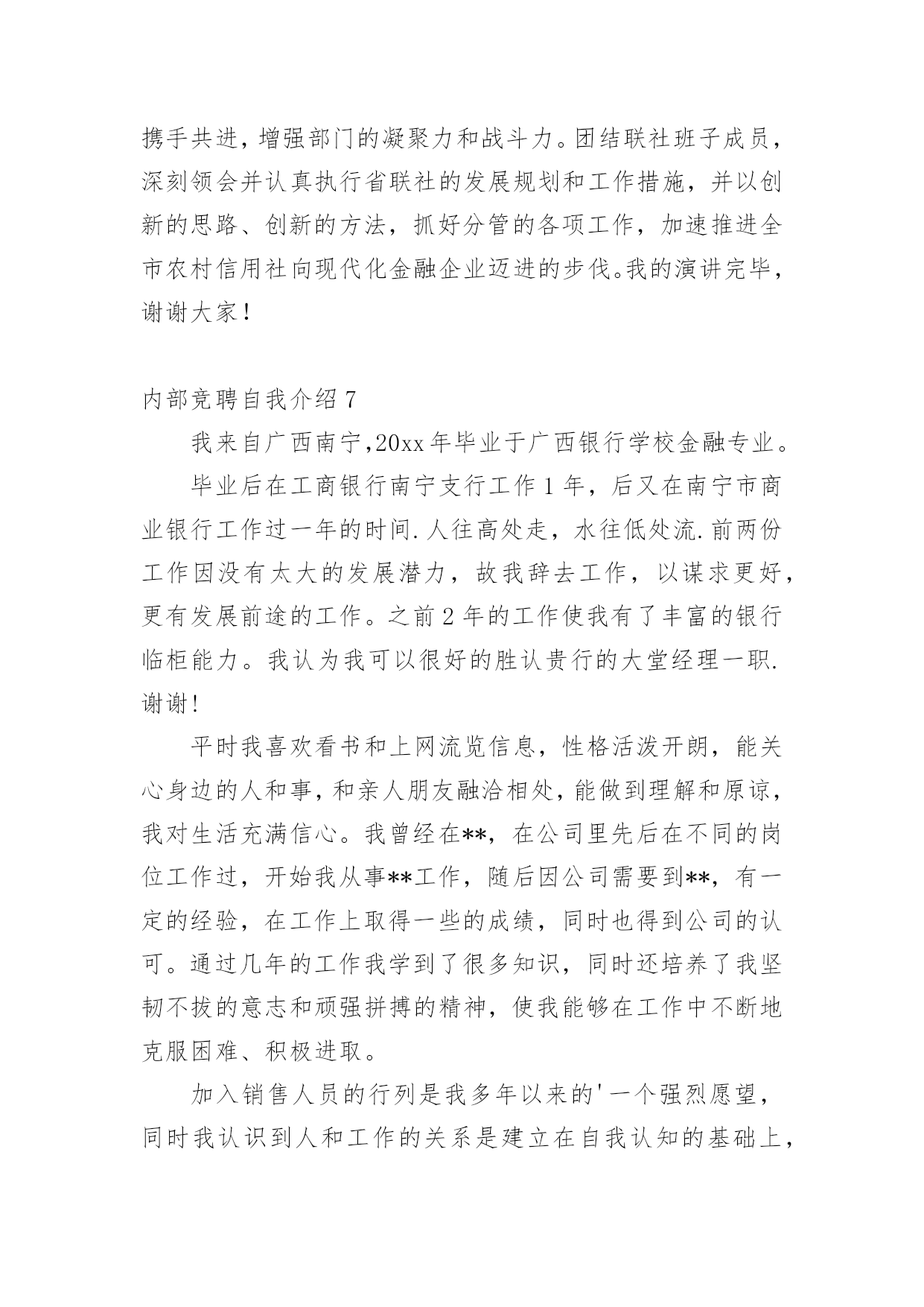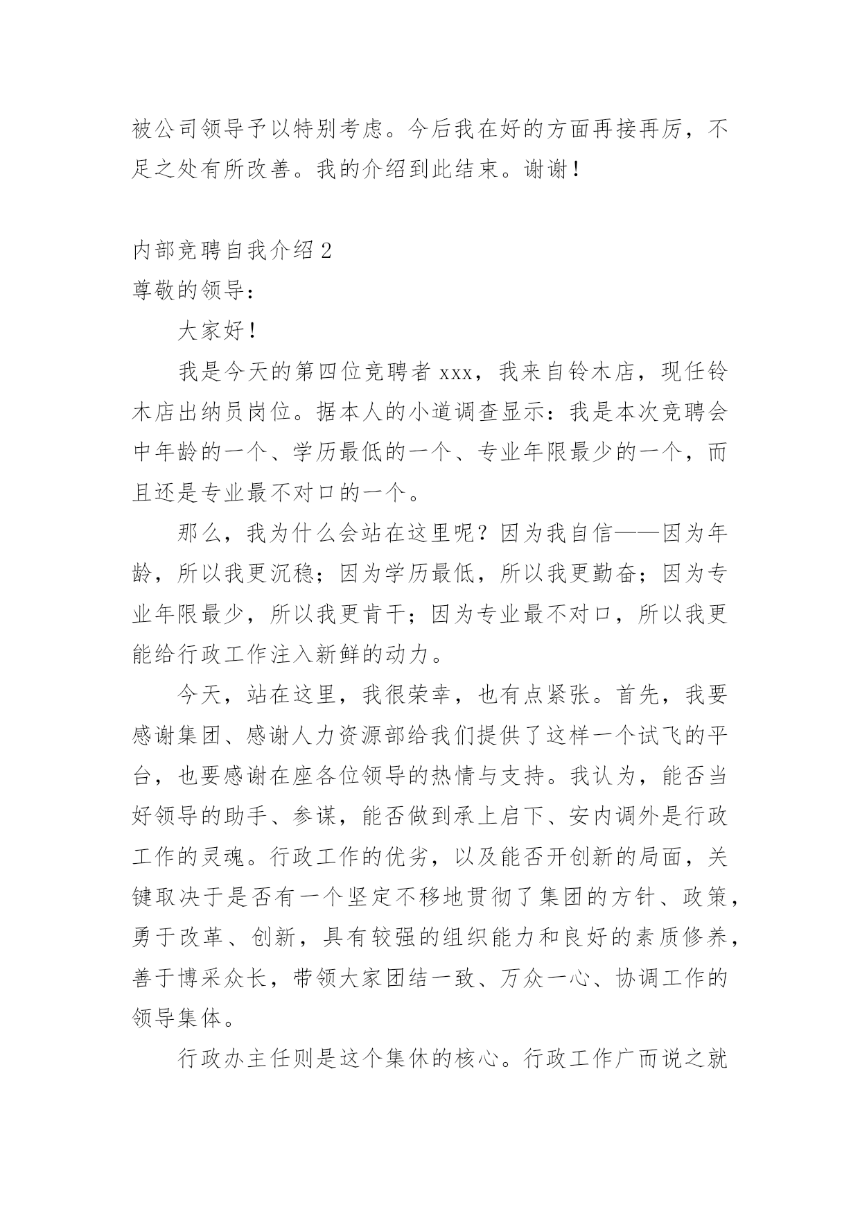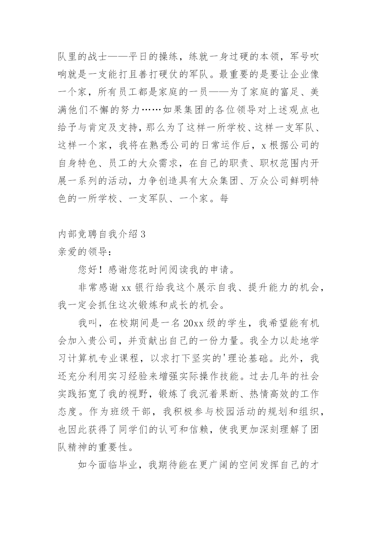 内部竞聘自我介绍来到一个完全陌生的环境,常常要进行自我介绍,自我介绍可以满足我们渴望得到尊重的心理。怎么写自我介绍才能避免踩雷呢?以下是小编为大家收集的内部竞聘自我介绍,欢迎阅读与收藏。内部竞聘自我介绍1各位尊敬的考官:大家下午好!很荣幸能在这里面试,让我有向各位考官学习与交流的机会,现将自己的情况简要介绍一下:我叫xxx本站,出生在xx(什么什么地方)。性格比较温和、谦虚、认真细致、踏实、吃苦耐劳、有较强的责任心和社会适应能力。于xx年。月毕业于xx学院,作为联通的业务经理,我xx(就写你的业务情况和一些业绩然后说你想要竞聘客户经理,然后说说你的优势)。在投身于社会之际,为了找到符合自己专业和兴趣的岗位,更好地适应社会,我希望自己能够做到一种被别人需要的一种状态,至于做什么,就是在实践中,不断的学习、不断的锻炼。因此,我希望能够胜任这份职务,我相信我一定在自己的岗位上尽职尽责、踏踏实实地贡献之集的`一份力量,与公司共同促进、发展。"世界之大,人才济济"。我承认自己还不是最优秀的人才,但是我希望自己是此岗位最合适的人选,希望有幸能够被公司领导予以特别考虑。今后我在好的方面再接再厉,不足之处有所改善。我的介绍到此结束。谢谢!内部竞聘自我介绍2尊敬的领导:大家好!我是今天的第四位竞聘者xxx,我来自铃木店,现任铃木店出纳员岗位。据本人的小道调查显示:我是本次竞聘会中年龄的一个、学历最低的一个、专业年限最少的一个,而且还是专业最不对口的一个。那么,我为什么会站在这里呢?因为我自信——因为年龄,所以我更沉稳;因为学历最低,所以我更勤奋;因为专业年限最少,所以我更肯干;因为专业最不对口,所以我更能给行政工作注入新鲜的动力。今天,站在这里,我很荣幸,也有点紧张。首先,我要感谢集团、感谢人力资源部给我们提供了这样一个试飞的平台,也要感谢在座各位领导的热情与支持。我认为,能否当好领导的助手、参谋,能否做到承上启下、安内调外是行政工作的灵魂。行政工作的优劣,以及能否开创新的局面,关键取决于是否有一个坚定不移地贯彻了集团的方针、政策,勇于改革、创新,具有较强的组织能力和良好的素质修养,善于博采众长,带领大家团结一致、万众一心、协调工作的领导集体。行政办主任则是这个集休的核心。行政工作广而说之就是:积极参与政务,认真办理事务,热心搞好服务。细而说之,大到参与领导班子对重大问题的讨论和决策,为领导决策提供重要情况和科学依据;小到大量日常琐碎的事务,包括人事档案的管理、人员的`岗位培训,安全、卫生、保卫工作,做好防火、防盗、保证正常的工作秩序和工作环境,办公设施及用品的管理,协调各部门及外部的关系等等。一句话,吃、喝、拉、撒、睡,无所不管,无所不包。所以有人风趣的说办公室主任是"上管天,下管地,中间管大气",还有人说,办公室主任要"一马当先,两袖清风,三更半夜,四肢勤快"。总之,办公室主任的职责十分繁杂,既要事事处理妥帖,又要处处带头实干。进入21世纪,随着世贸大门向中国的敞开,越来越多新的战役在一片不见硝烟的战场上展开。21世纪的企业该如何应对这已经发生的和尚未发生的战火呢?科技的研发、资金的累积、渠道的拓展,这一切的一切,掌控这场战役的是优秀的人才。现代的成功企业无不重视人才的开发与培育。因此,在今天这个试飞的平台上,如果我这只铃木飞来的小小鸟真的展翅高飞了,xx我想我要做的便是为提升大众集团、万众公司的企业文化尽一份绵薄之力。曾经读过时尚集团关于企业文化的一篇文稿,让我至今难忘的是其中提到要把企业办得像一所学校,企业的所有员工都将是这所学校里的学生——不停的学习、无间断的进修,员工自身素质及劳动技能的提高不是恰恰推动了企业的提升吗?要把企业办得像个军队,企业的所有员工都将是这个军队里的战士——平日的操练,练就一身过硬的本领,军号吹响就是一支能打且善打硬仗的军队。最重要的是要让企业像一个家,所有员工都是家庭的一员——为了家庭的富足、美满他们不懈的努力……如果集团的各位领导对上述观点也给予与肯定及支持,那么为了这样一所学校、这样一支军队、这样一个家,我将在熟悉公司的日常运作后,x根据公司的自身特色、员工的大众需求,在自己的职责、职权范围内开展一系列的活动,力争创造具有大众集团、万众公司鲜明特色的一所学校、一支军队、一个家。每内部竞聘自我介绍3亲爱的领导:您好!感谢您花时间阅读我的申请。非常感谢xx银行给我这个展示自我、提升能力的机会,我一定会抓住这次锻炼和成长的机会。我叫,在校期间是一名20xx级的学生,我希望能有机会加入贵公司,并贡献出自己的一份力量。我全力以赴地学习计算机专业课程,以求打下坚实的'理论基础。此外,我还充分利用实习经验来增强实际操作技能。过去几年的社会实践拓宽了我的视野,锻炼了我沉着果断、热情高效的工作态度。作为班级干部,我积极