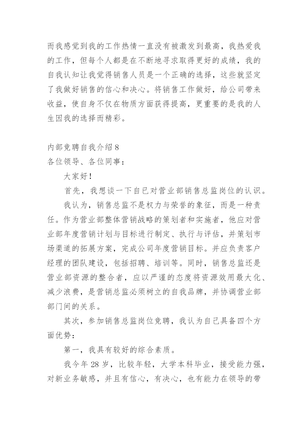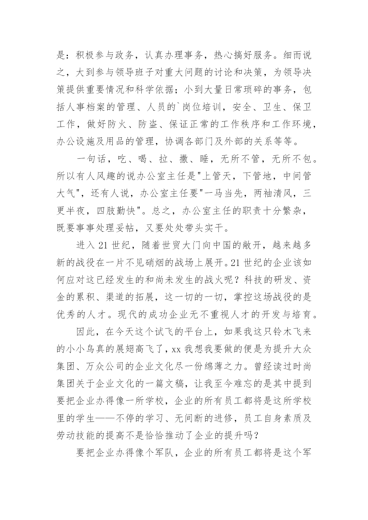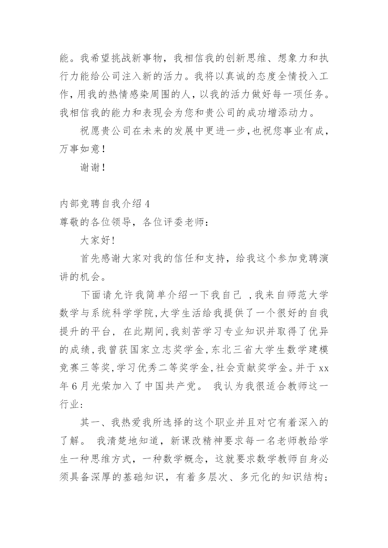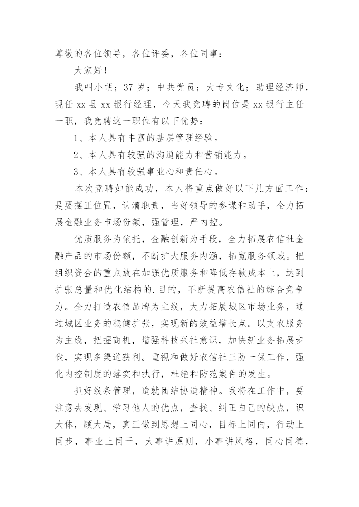 内部竞聘自我介绍来到一个完全陌生的环境,常常要进行自我介绍,自我介绍可以满足我们渴望得到尊重的心理。怎么写自我介绍才能避免踩雷呢?以下是小编为大家收集的内部竞聘自我介绍,欢迎阅读与收藏。内部竞聘自我介绍1各位尊敬的考官:大家下午好!很荣幸能在这里面试,让我有向各位考官学习与交流的机会,现将自己的情况简要介绍一下:我叫xxx本站,出生在xx(什么什么地方)。性格比较温和、谦虚、认真细致、踏实、吃苦耐劳、有较强的责任心和社会适应能力。于xx年。月毕业于xx学院,作为联通的业务经理,我xx(就写你的业务情况和一些业绩然后说你想要竞聘客户经理,然后说说你的优势)。在投身于社会之际,为了找到符合自己专业和兴趣的岗位,更好地适应社会,我希望自己能够做到一种被别人需要的一种状态,至于做什么,就是在实践中,不断的学习、不断的锻炼。因此,我希望能够胜任这份职务,我相信我一定在自己的岗位上尽职尽责、踏踏实实地贡献之集的`一份力量,与公司共同促进、发展。"世界之大,人才济济"。我承认自己还不是最优秀的人才,但是我希望自己是此岗位最合适的人选,希望有幸能够被公司领导予以特别考虑。今后我在好的方面再接再厉,不足之处有所改善。我的介绍到此结束。谢谢!内部竞聘自我介绍2尊敬的领导:大家好!我是今天的第四位竞聘者xxx,我来自铃木店,现任铃木店出纳员岗位。据本人的小道调查显示:我是本次竞聘会中年龄的一个、学历最低的一个、专业年限最少的一个,而且还是专业最不对口的一个。那么,我为什么会站在这里呢?因为我自信——因为年龄,所以我更沉稳;因为学历最低,所以我更勤奋;因为专业年限最少,所以我更肯干;因为专业最不对口,所以我更能给行政工作注入新鲜的动力。今天,站在这里,我很荣幸,也有点紧张。首先,我要感谢集团、感谢人力资源部给我们提供了这样一个试飞的平台,也要感谢在座各位领导的热情与支持。我认为,能否当好领导的助手、参谋,能否做到承上启下、安内调外是行政工作的灵魂。行政工作的优劣,以及能否开创新的局面,关键取决于是否有一个坚定不移地贯彻了集团的方针、政策,勇于改革、创新,具有较强的组织能力和良好的素质修养,善于博采众长,带领大家团结一致、万众一心、协调工作的领导集体。行政办主任则是这个集休的核心。行政工作广而说之就是:积极参与政务,认真办理事务,热心搞好服务。细而说之,大到参与领导班子对重大问题的讨论和决策,为领导决策提供重要情况和科学依据;小到大量日常琐碎的事务,包括人事档案的管理、人员的`岗位培训,安全、卫生、保卫工作,做好防火、防盗、保证正常的工作秩序和工作环境,办公设施及用品的管理,协调各部门及外部的关系等等。一句话,吃、喝、拉、撒、睡,无所不管,无所不包。所以有人风趣的说办公室主任是"上管天,下管地,中间管大气",还有人说,办公室主任要"一马当先,两袖清风,三更半夜,四肢勤快"。总之,办公室主任的职责十分繁杂,既要事事处理妥帖,又要处处带头实干。进入21世纪,随着世贸大门向中国的敞开,越来越多新的战役在一片不见硝烟的战场上展开。21世纪的企业该如何应对这已经发生的和尚未发生的战火呢?科技的研发、资金的累积、渠道的拓展,这一切的一切,掌控这场战役的是优秀的人才。现代的成功企业无不重视人才的开发与培育。因此,在今天这个试飞的平台上,如果我这只铃木飞来的小小鸟真的展翅高飞了,xx我想我要做的便是为提升大众集团、万众公司的企业文化尽一份绵薄之力。曾经读过时尚集团关于企业文化的一篇文稿,让我至今难忘的是其中提到要把企业办得像一所学校,企业的所有员工都将是这所学校里的学生——不停的学习、无间断的进修,员工自身素质及劳动技能的提高不是恰恰推动了企业的提升吗?要把企业办得像个军队,企业的所有员工都将是这个军队里的战士——平日的操练,练就一身过硬的本领,军号吹响就是一支能打且善打硬仗的军队。最重要的是要让企业像一个家,所有员工都是家庭的一员——为了家庭的富足、美满他们不懈的努力……如果集团的各位领导对上述观点也给予与肯定及支持,那么为了这样一所学校、这样一支军队、这样一个家,我将在熟悉公司的日常运作后,x根据公司的自身特色、员工的大众需求,在自己的职责、职权范围内开展一系列的活动,力争创造具有大众集团、万众公司鲜明特色的一所学校、一支军队、一个家。每内部竞聘自我介绍3亲爱的领导:您好!感谢您花时间阅读我的申请。非常感谢xx银行给我这个展示自我、提升能力的机会,我一定会抓住这次锻炼和成长的机会。我叫,在校期间是一名20xx级的学生,我希望能有机会加入贵公司,并贡献出自己的一份力量。我全力以赴地学习计算机专业课程,以求打下坚实的'理论基础。此外,我还充分利用实习经验来增强实际操作技能。过去几年的社会实践拓宽了我的视野,锻炼了我沉着果断、热情高效的工作态度。作为班级干部,我积极