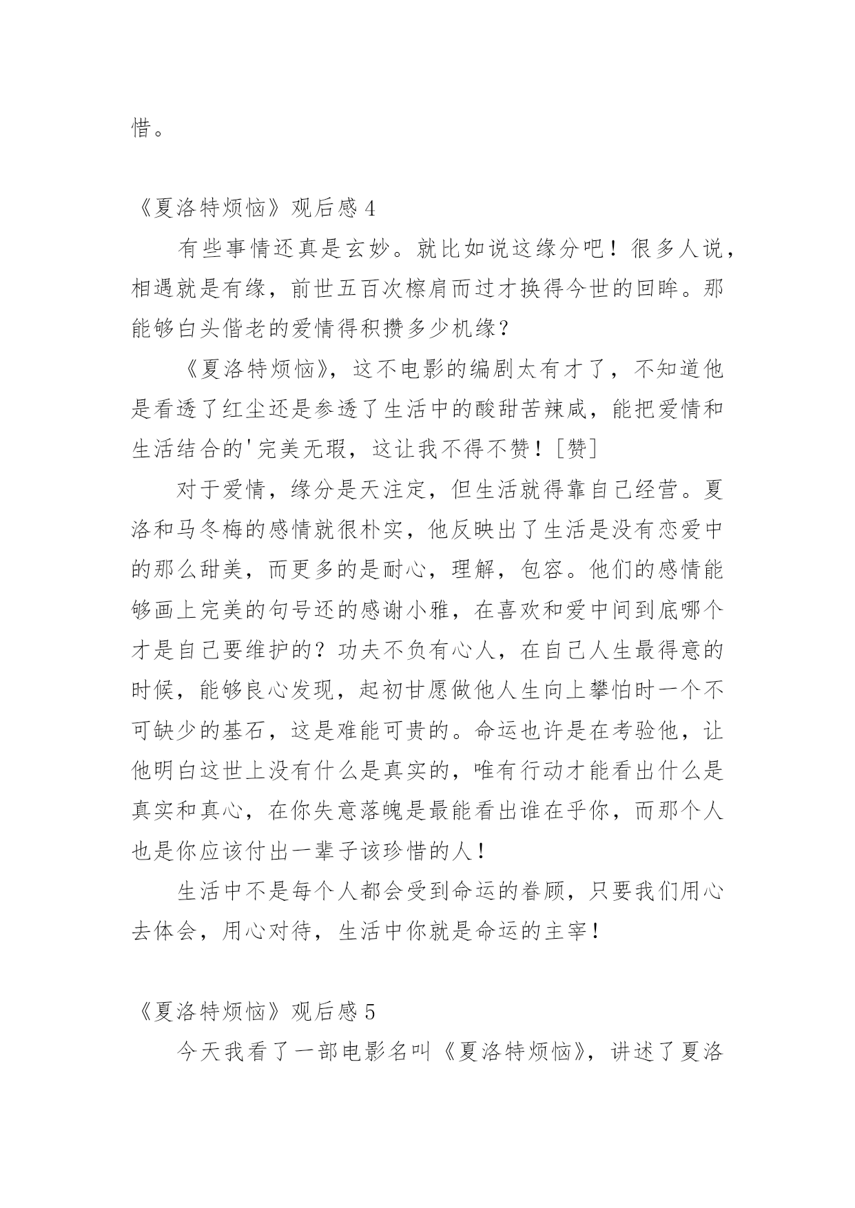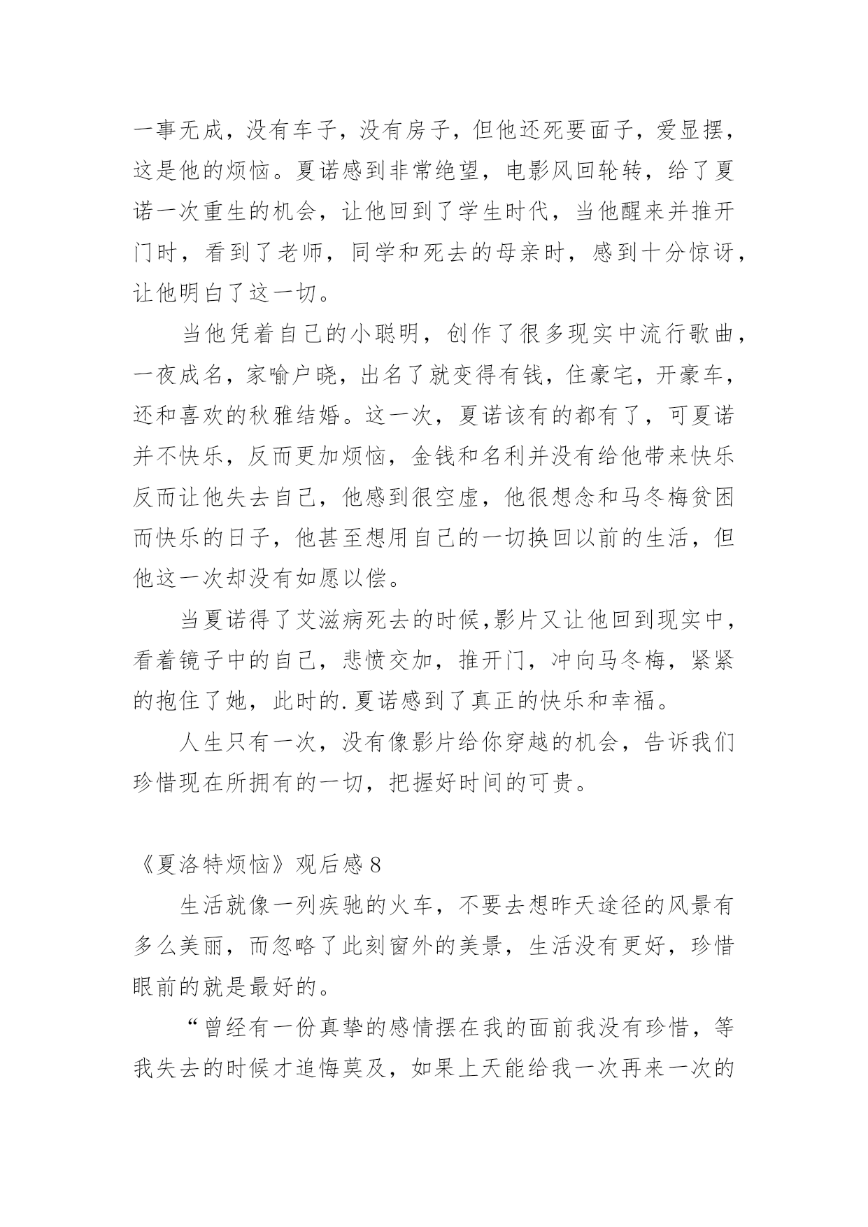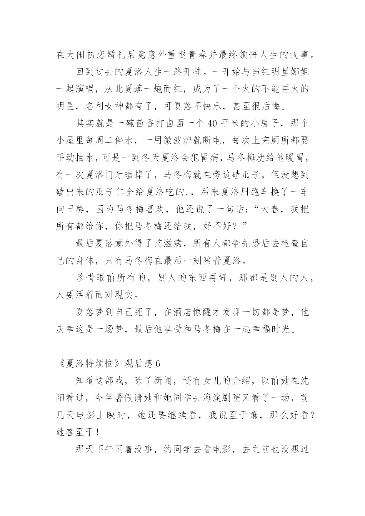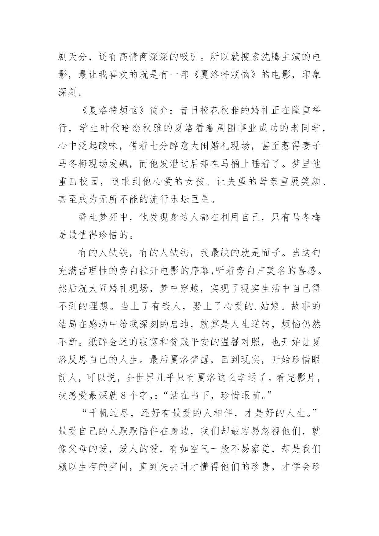 《夏洛特烦恼》观后感看完某一作品后,一定有不少感悟吧,这时我们很有必要写一篇观后感了。千万不能认为观后感随便应付就可以,以下是小编为大家收集的《夏洛特烦恼》观后感,供大家参考借鉴,希望可以帮助到有需要的朋友。《夏洛特烦恼》观后感1可能很多人都没有想到,今年国庆档口碑最好的喜剧竟然不是被大家寄予厚望的《港囧》,而是这部低调的小成本喜剧《夏洛特烦恼》。影片上映至今,无论是影评人还是电影评分网站,都收到无差别好评,假期过半厚积薄发,实时票房占比目前也已经超越《港囧》跃至第一,不得不让人对本片刮目相看。《夏洛特烦恼》由闫非、彭大魔执导,沈腾、马丽主演。实际上,如果你喜欢话剧,或是经常关注春晚,对上面几个名字一定不会陌生。因为这部电影就来自知名喜剧团体——"开心麻花",而《夏洛特烦恼》正是"开心麻花"曾经的热门喜剧。此次改编的电影版,其主创同样来自"开心麻花"。将戏剧改编成电影并不是什么新鲜事。好莱坞也经常会把经典剧目搬上大银幕,比如莎翁的'各种经典名剧,或是你们都很熟悉的《歌剧魅影》。电影版《夏洛特烦恼》同样是套用了话剧的基础,并以电影的方式重新呈现了一遍。《夏洛特烦恼》观后感2刚刚看完了《夏洛特烦恼》顺便留下一点感想留作以后的回忆吧!世界上的很多事情都是注定的,该你的千回百转也终究会在,即使失去也还会再次回到你的身边;不该你的.即使现在存在了也只是一场梦罢了,当梦醒时分,才会觉得最简单、最适合自己的才是最应该去珍惜去怀念的。或许生活的一切并不如意,一切也并非是在即所梦想的那样,但身边能有那么一个人愿意用他(她)的一切来呵护、包容、陪伴你的时候还有什么比这个更幸福的呢?即使身外的一切繁花似锦再多、再好,却没有一颗温暖的心也终究会腻。人生的一切就如同一场修行,修到了最高的境界便是返璞归真,当到那个时候腻会发现原来一切都只是为了来证明心灵的安宁与满足才是最大的幸福。世间人无数,道理无尽,都会说“只有待到失去时才会懂得珍惜”,可又有多少人没有在这句话里失去过,又有多少人能够在失去之前真正的明白与坚持。善待值得去善待的人,莫因失而悔,因为有些人和事一旦失去就是永远。——致所有青春彷徨的朋友,人生路漫漫需我等去共同探索真理!《夏洛特烦恼》观后感3最近喜欢看沈腾参加的综艺《王牌对王牌》,对他的喜剧天分,还有高情商深深的吸引。所以就搜索沈腾主演的电影,最让我喜欢的就是有一部《夏洛特烦恼》的电影,印象深刻。《夏洛特烦恼》简介:昔日校花秋雅的婚礼正在隆重举行,学生时代暗恋秋雅的夏洛看着周围事业成功的老同学,心中泛起酸味,借着七分醉意大闹婚礼现场,甚至惹得妻子马冬梅现场发飙,而他发泄过后却在马桶上睡着了。梦里他重回校园,追求到他心爱的女孩、让失望的母亲重展笑颜、甚至成为无所不能的流行乐坛巨星。醉生梦死中,他发现身边人都在利用自己,只有马冬梅是最值得珍惜的。有的人缺铁,有的人缺钙,我最缺的就是面子。当这句充满哲理性的旁白拉开电影的序幕,听着旁白声莫名的喜感。然后就大闹婚礼现场,梦中穿越,实现了现实生活中自己得不到的理想。当上了有钱人,娶上了心爱的.姑娘。故事的结局在感动中给我深刻的启迪,就算是人生逆转,烦恼仍然不断。纸醉金迷的寂寞和贫贱平安的温馨对照,也开始让夏洛反思自己的人生。最后夏洛梦醒,回到现实,开始珍惜眼前人,可以说,全世界几乎只有夏洛这么幸运了。看完影片,我感受最深就8个字,:“活在当下,珍惜眼前。”“千帆过尽,还好有最爱的人相伴,才是好的人生。”最爱自己的人默默陪伴在身边,我们却最容易忽视他们,就像父母的爱,爱人的爱,有如空气一般不易察觉,却是我们赖以生存的空间,直到失去时才懂得他们的珍贵,才学会珍惜。《夏洛特烦恼》观后感4有些事情还真是玄妙。就比如说这缘分吧!很多人说,相遇就是有缘,前世五百次檫肩而过才换得今世的回眸。那能够白头偕老的爱情得积攒多少机缘?《夏洛特烦恼》,这不电影的编剧太有才了,不知道他是看透了红尘还是参透了生活中的酸甜苦辣咸,能把爱情和生活结合的'完美无瑕,这让我不得不赞![赞]对于爱情,缘分是天注定,但生活就得靠自己经营。夏洛和马冬梅的感情就很朴实,他反映出了生活是没有恋爱中的那么甜美,而更多的是耐心,理解,包容。他们的感情能够画上完美的句号还的感谢小雅,在喜欢和爱中间到底哪个才是自己要维护的?功夫不负有心人,在自己人生最得意的时候,能够良心发现,起初甘愿做他人生向上攀怕时一个不可缺少的基石,这是难能可贵的。命运也许是在考验他,让他明白这世上没有什么是真实的,唯有行动才能看出什么是真实和真心,在你失意落魄是最能看出谁在乎你,而那个人也是你应该付出一辈子该珍惜的人!生活中不是每个人都会受到命运的眷顾,只要我们用心去体会,用心对待,生活中你就是命运的主宰!《夏洛特烦恼》观后感5今天我看了一部电影名叫《夏洛特烦恼》,讲述了夏洛