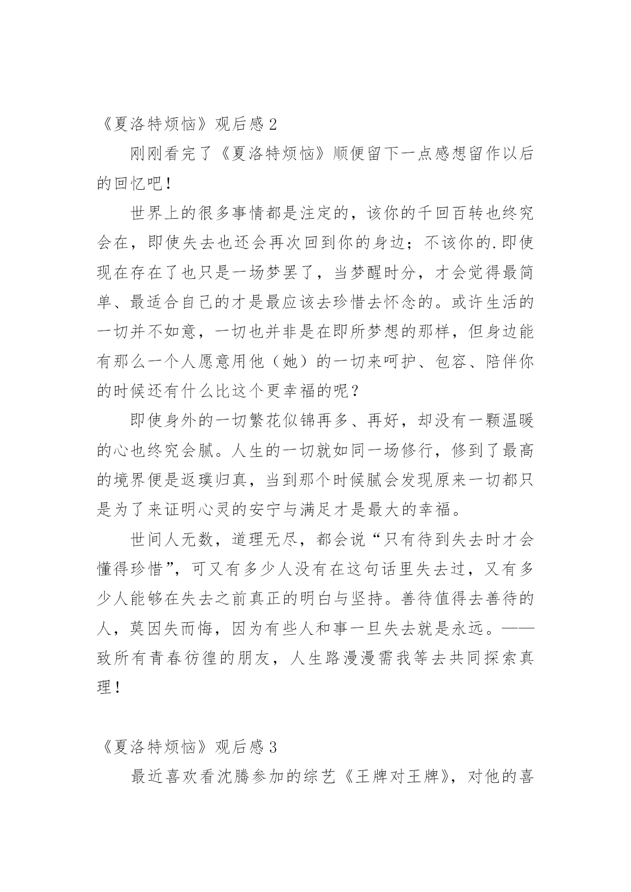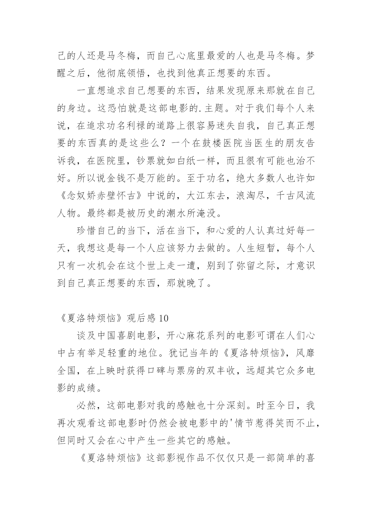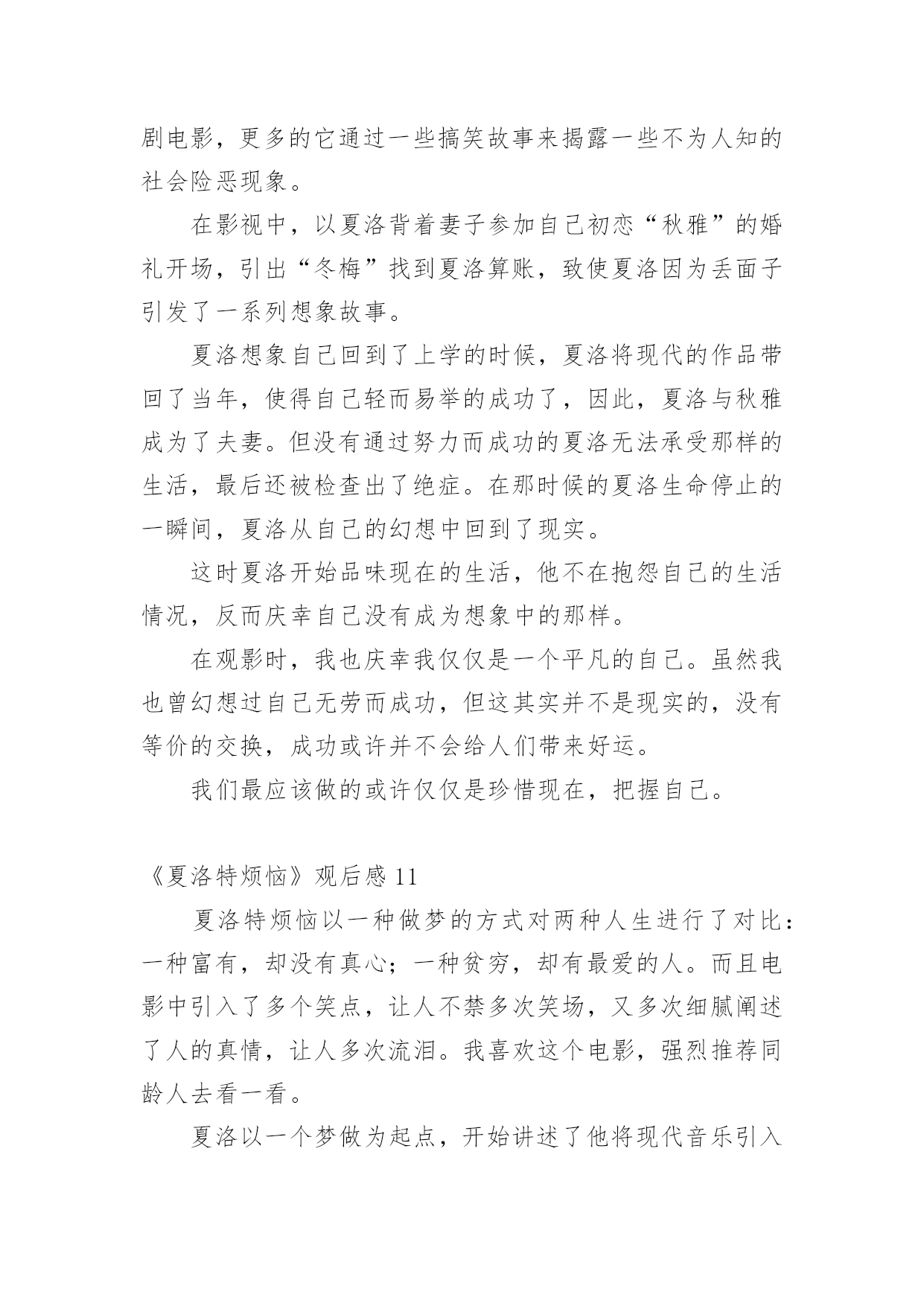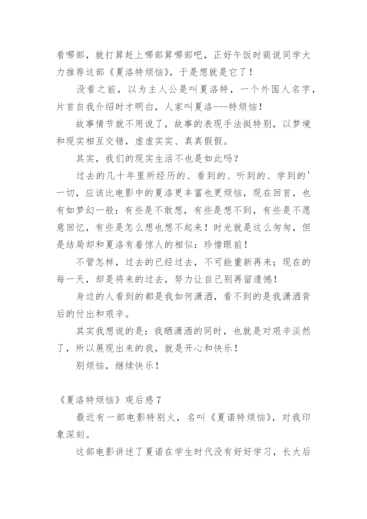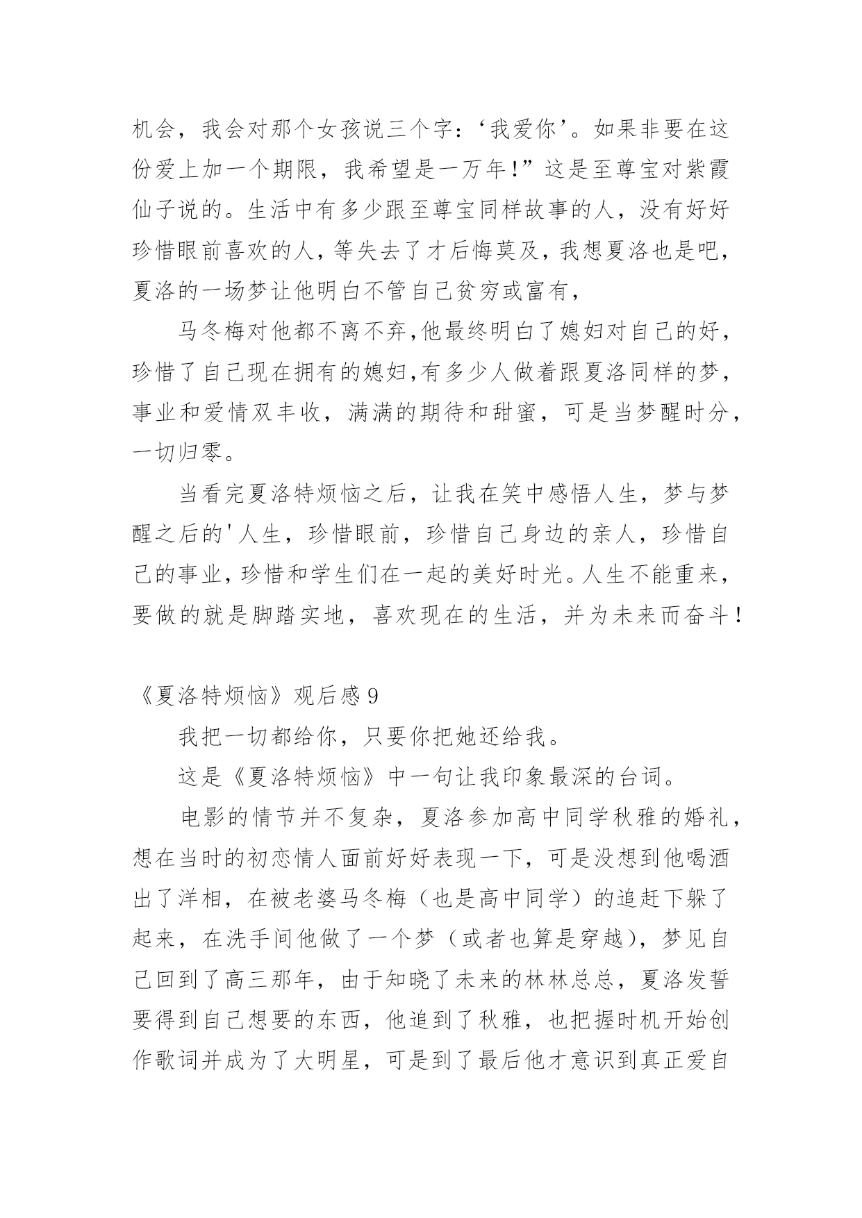 《夏洛特烦恼》观后感看完某一作品后,一定有不少感悟吧,这时我们很有必要写一篇观后感了。千万不能认为观后感随便应付就可以,以下是小编为大家收集的《夏洛特烦恼》观后感,供大家参考借鉴,希望可以帮助到有需要的朋友。《夏洛特烦恼》观后感1可能很多人都没有想到,今年国庆档口碑最好的喜剧竟然不是被大家寄予厚望的《港囧》,而是这部低调的小成本喜剧《夏洛特烦恼》。影片上映至今,无论是影评人还是电影评分网站,都收到无差别好评,假期过半厚积薄发,实时票房占比目前也已经超越《港囧》跃至第一,不得不让人对本片刮目相看。《夏洛特烦恼》由闫非、彭大魔执导,沈腾、马丽主演。实际上,如果你喜欢话剧,或是经常关注春晚,对上面几个名字一定不会陌生。因为这部电影就来自知名喜剧团体——"开心麻花",而《夏洛特烦恼》正是"开心麻花"曾经的热门喜剧。此次改编的电影版,其主创同样来自"开心麻花"。将戏剧改编成电影并不是什么新鲜事。好莱坞也经常会把经典剧目搬上大银幕,比如莎翁的'各种经典名剧,或是你们都很熟悉的《歌剧魅影》。电影版《夏洛特烦恼》同样是套用了话剧的基础,并以电影的方式重新呈现了一遍。《夏洛特烦恼》观后感2刚刚看完了《夏洛特烦恼》顺便留下一点感想留作以后的回忆吧!世界上的很多事情都是注定的,该你的千回百转也终究会在,即使失去也还会再次回到你的身边;不该你的.即使现在存在了也只是一场梦罢了,当梦醒时分,才会觉得最简单、最适合自己的才是最应该去珍惜去怀念的。或许生活的一切并不如意,一切也并非是在即所梦想的那样,但身边能有那么一个人愿意用他(她)的一切来呵护、包容、陪伴你的时候还有什么比这个更幸福的呢?即使身外的一切繁花似锦再多、再好,却没有一颗温暖的心也终究会腻。人生的一切就如同一场修行,修到了最高的境界便是返璞归真,当到那个时候腻会发现原来一切都只是为了来证明心灵的安宁与满足才是最大的幸福。世间人无数,道理无尽,都会说“只有待到失去时才会懂得珍惜”,可又有多少人没有在这句话里失去过,又有多少人能够在失去之前真正的明白与坚持。善待值得去善待的人,莫因失而悔,因为有些人和事一旦失去就是永远。——致所有青春彷徨的朋友,人生路漫漫需我等去共同探索真理!《夏洛特烦恼》观后感3最近喜欢看沈腾参加的综艺《王牌对王牌》,对他的喜剧天分,还有高情商深深的吸引。所以就搜索沈腾主演的电影,最让我喜欢的就是有一部《夏洛特烦恼》的电影,印象深刻。《夏洛特烦恼》简介:昔日校花秋雅的婚礼正在隆重举行,学生时代暗恋秋雅的夏洛看着周围事业成功的老同学,心中泛起酸味,借着七分醉意大闹婚礼现场,甚至惹得妻子马冬梅现场发飙,而他发泄过后却在马桶上睡着了。梦里他重回校园,追求到他心爱的女孩、让失望的母亲重展笑颜、甚至成为无所不能的流行乐坛巨星。醉生梦死中,他发现身边人都在利用自己,只有马冬梅是最值得珍惜的。有的人缺铁,有的人缺钙,我最缺的就是面子。当这句充满哲理性的旁白拉开电影的序幕,听着旁白声莫名的喜感。然后就大闹婚礼现场,梦中穿越,实现了现实生活中自己得不到的理想。当上了有钱人,娶上了心爱的.姑娘。故事的结局在感动中给我深刻的启迪,就算是人生逆转,烦恼仍然不断。纸醉金迷的寂寞和贫贱平安的温馨对照,也开始让夏洛反思自己的人生。最后夏洛梦醒,回到现实,开始珍惜眼前人,可以说,全世界几乎只有夏洛这么幸运了。看完影片,我感受最深就8个字,:“活在当下,珍惜眼前。”“千帆过尽,还好有最爱的人相伴,才是好的人生。”最爱自己的人默默陪伴在身边,我们却最容易忽视他们,就像父母的爱,爱人的爱,有如空气一般不易察觉,却是我们赖以生存的空间,直到失去时才懂得他们的珍贵,才学会珍惜。《夏洛特烦恼》观后感4有些事情还真是玄妙。就比如说这缘分吧!很多人说,相遇就是有缘,前世五百次檫肩而过才换得今世的回眸。那能够白头偕老的爱情得积攒多少机缘?《夏洛特烦恼》,这不电影的编剧太有才了,不知道他是看透了红尘还是参透了生活中的酸甜苦辣咸,能把爱情和生活结合的'完美无瑕,这让我不得不赞![赞]对于爱情,缘分是天注定,但生活就得靠自己经营。夏洛和马冬梅的感情就很朴实,他反映出了生活是没有恋爱中的那么甜美,而更多的是耐心,理解,包容。他们的感情能够画上完美的句号还的感谢小雅,在喜欢和爱中间到底哪个才是自己要维护的?功夫不负有心人,在自己人生最得意的时候,能够良心发现,起初甘愿做他人生向上攀怕时一个不可缺少的基石,这是难能可贵的。命运也许是在考验他,让他明白这世上没有什么是真实的,唯有行动才能看出什么是真实和真心,在你失意落魄是最能看出谁在乎你,而那个人也是你应该付出一辈子该珍惜的人!生活中不是每个人都会受到命运的眷顾,只要我们用心去体会,用心对待,生活中你就是命运的主宰!《夏洛特烦恼》观后感5今天我看了一部电影名叫《夏洛特烦恼》,讲述了夏洛