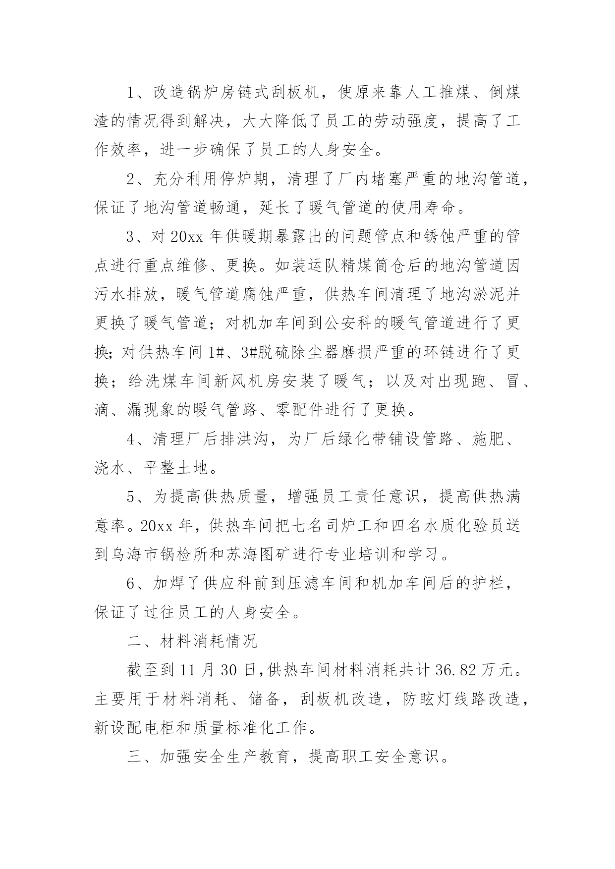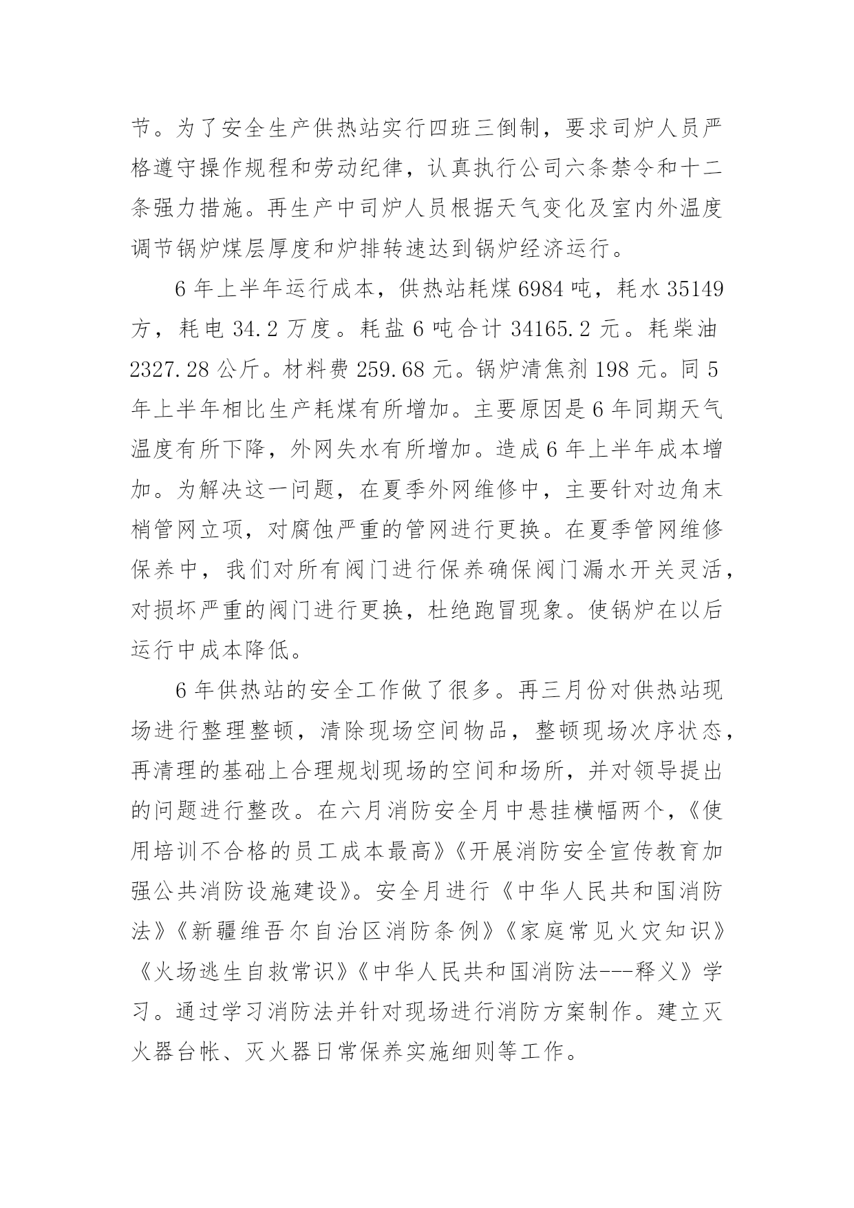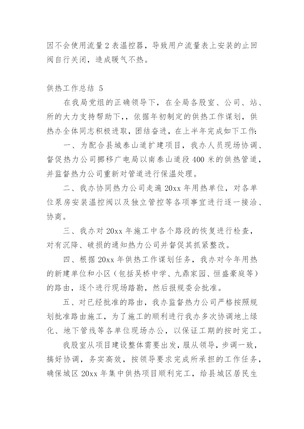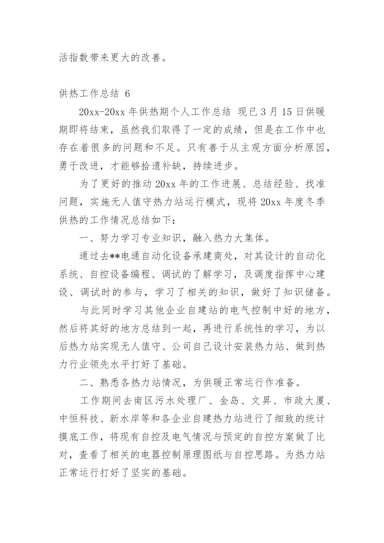 供热工作总结总结是指对某一阶段的工作、学习或思想中的经验或情况进行分析研究,做出带有规律性结论的书面材料,它可以帮助我们总结以往思想,发扬成绩,让我们一起认真地写一份总结吧。总结怎么写才是正确的呢?以下是小编为大家整理的供热工作总结,仅供参考,希望能够帮助到大家。供热工作总结120xx年3月,供暖期即将结束,虽然我取得了一定的成绩,但是在工作中也存在着很多的问题和不足。只有善于从主观方面分析原因,勇于改进,才能够拾遗补缺,持续进步。一、努力学习专业知识,融入热力大集体。通过调度指挥中心建设、调试时的参与,学习了相关的知识,做好了知识储备。与此同时学习其他行业调度控制中心的先进经验,然后将其好的地方总结到一起,再进行系统性的学习,做到热力行业领先水平打好了基础。二、熟悉各热力站情况,为供暖正常运行作准备。工作期间,积极了解现行热力站设备情况,并进行了细致的统计摸底工作,将现有运行方式与自控方案做了比对,为热力站正常运行打好了坚实的基础。三、在实践中丰富自己的经验,努力完成各项工作。通过各换热站反馈的故障信息,积极组织处理排除了一些设备故障,对容易出现的问题、及不便操作的地方,做了详细的记录并整理,及时反馈给了直属领导,避免了供热运行中存在隐患。四、总结个人不足之处,树立今年新目标。经过这一采暖季的工作,我发现了自己的不足之处,一是有时不认真、有些工作做的不彻底,二是对于供暖运行方面知识的欠缺、这就更需要我努力学习,三是遇到问题时缺乏解决困难的信心。在以后的工作中我一定要充分发挥自己的优势,加倍努力学习更多的知识来充实自己。我的成长之路还很长,需要学习的东西还很多,但我有信心,可以完成领导交给的任务,胜任自己的工作。在今年的工作中,我决心做到以下几点:1、严格要求自己,把工作做细做精。2、虚心学习供热相关专业知识,做到说一知二的境界。3、努力干好本职工作,积极完成领导交给的各项任务。总之,我将发挥出我全部的精神来干好热力工作,成为新一代的热力工作者。调度员韩XX20xx年3月23日供热工作总结220xx年上半年的工作进行总结。这半年来不断的加强员工的思想教育、提高员工的安全意识、培养员工的个人素质及高尚情操。在工作中的安全生产、节能降耗、经营分析、管理制度健全等方面作一总结。(1--3月)为供热站生产季节。为了安全生产供热站实行四班三倒制,要求司炉人员严格遵守操作规程和劳动纪律,认真执行公司六条禁令和十二条强力措施。再生产中司炉人员根据天气变化及室内外温度调节锅炉煤层厚度和炉排转速达到锅炉经济运行。6年上半年运行成本,供热站耗煤6984吨,耗水35149方,耗电34.2万度。耗盐6吨合计34165.2元。耗柴油2327.28公斤。材料费259.68元。锅炉清焦剂198元。同5年上半年相比生产耗煤有所增加。主要原因是6年同期天气温度有所下降,外网失水有所增加。造成6年上半年成本增加。为解决这一问题,在夏季外网维修中,主要针对边角末梢管网立项,对腐蚀严重的管网进行更换。在夏季管网维修保养中,我们对所有阀门进行保养确保阀门漏水开关灵活,对损坏严重的阀门进行更换,杜绝跑冒现象。使锅炉在以后运行中成本降低。6年供热站的安全工作做了很多。再三月份对供热站现场进行整理整顿,清除现场空间物品,整顿现场次序状态,再清理的基础上合理规划现场的空间和场所,并对领导提出的问题进行整改。在六月消防安全月中悬挂横幅两个,《使用培训不合格的员工成本最高》《开展消防安全宣传教育加强公共消防设施建设》。安全月进行《中华人民共和国消防法》《新疆维吾尔自治区消防条例》《家庭常见火灾知识》《火场逃生自救常识》《中华人民共和国消防法---释义》学习。通过学习消防法并针对现场进行消防方案制作。建立灭火器台帐、灭火器日常保养实施细则等工作。实施班组安全教育,提高员工的自我保护能力。一、每天的班前会,交代当天的工作任务,告知作业环境的情况,正确督促班组成员正确穿戴和使用劳动防护用品。二、安全隐患管理。以隐患作为安全管理的基本对象,每周对隐患进行辨识,把识别的安全隐患分类、分级进行建档,并以报表形式报中心。水发现工作中的不足之处,做一补充,解决问题,更换思想、加强管理、节约能源、减少污染、控制成本、提高效率、促进生产、增强服务意识。把来年的工作做的更好,更扎实,更完善,更有利于服务于广大群众。这是20xx年上半年的工作总结,在工作中还存在着许多问题和不足之初,还需进一步的完善。加强学习,提高技能水平,促进安全生产,降低成本,提高效率,施行技术创新,完善不足之处,争取向好的方向发展,为下的半年工作打下坚实的一步。供热工作总结320xx年,供热车间按照公司的各项工作部署和要求,紧紧围绕公司年初确定的工作思路、奋斗目标和重点工作,狠抓安全工作、强化经营管理、积极应对各方面的挑战,保