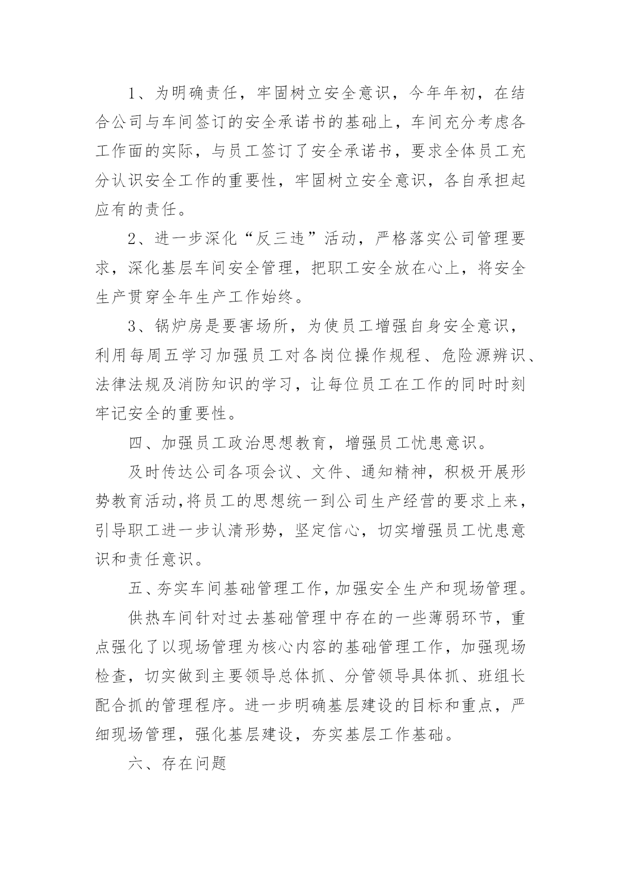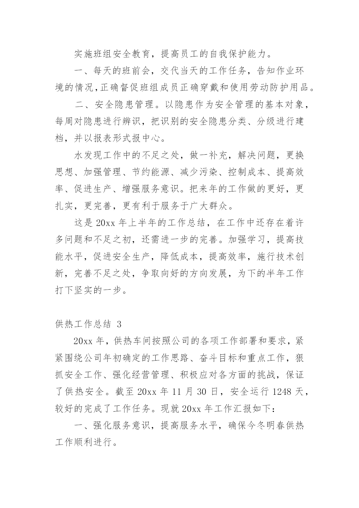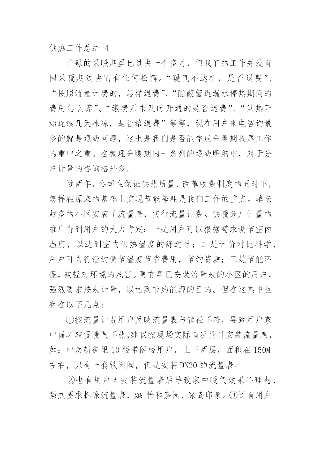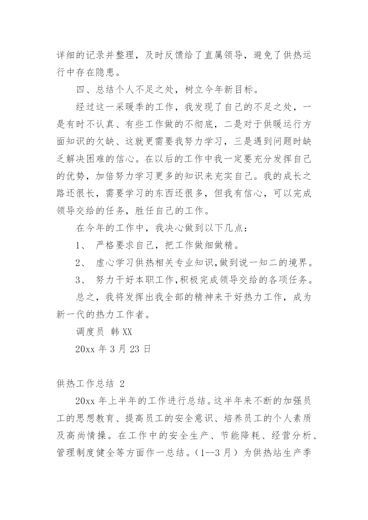 供热工作总结总结是指对某一阶段的工作、学习或思想中的经验或情况进行分析研究,做出带有规律性结论的书面材料,它可以帮助我们总结以往思想,发扬成绩,让我们一起认真地写一份总结吧。总结怎么写才是正确的呢?以下是小编为大家整理的供热工作总结,仅供参考,希望能够帮助到大家。供热工作总结120xx年3月,供暖期即将结束,虽然我取得了一定的成绩,但是在工作中也存在着很多的问题和不足。只有善于从主观方面分析原因,勇于改进,才能够拾遗补缺,持续进步。一、努力学习专业知识,融入热力大集体。通过调度指挥中心建设、调试时的参与,学习了相关的知识,做好了知识储备。与此同时学习其他行业调度控制中心的先进经验,然后将其好的地方总结到一起,再进行系统性的学习,做到热力行业领先水平打好了基础。二、熟悉各热力站情况,为供暖正常运行作准备。工作期间,积极了解现行热力站设备情况,并进行了细致的统计摸底工作,将现有运行方式与自控方案做了比对,为热力站正常运行打好了坚实的基础。三、在实践中丰富自己的经验,努力完成各项工作。通过各换热站反馈的故障信息,积极组织处理排除了一些设备故障,对容易出现的问题、及不便操作的地方,做了详细的记录并整理,及时反馈给了直属领导,避免了供热运行中存在隐患。四、总结个人不足之处,树立今年新目标。经过这一采暖季的工作,我发现了自己的不足之处,一是有时不认真、有些工作做的不彻底,二是对于供暖运行方面知识的欠缺、这就更需要我努力学习,三是遇到问题时缺乏解决困难的信心。在以后的工作中我一定要充分发挥自己的优势,加倍努力学习更多的知识来充实自己。我的成长之路还很长,需要学习的东西还很多,但我有信心,可以完成领导交给的任务,胜任自己的工作。在今年的工作中,我决心做到以下几点:1、严格要求自己,把工作做细做精。2、虚心学习供热相关专业知识,做到说一知二的境界。3、努力干好本职工作,积极完成领导交给的各项任务。总之,我将发挥出我全部的精神来干好热力工作,成为新一代的热力工作者。调度员韩XX20xx年3月23日供热工作总结220xx年上半年的工作进行总结。这半年来不断的加强员工的思想教育、提高员工的安全意识、培养员工的个人素质及高尚情操。在工作中的安全生产、节能降耗、经营分析、管理制度健全等方面作一总结。(1--3月)为供热站生产季节。为了安全生产供热站实行四班三倒制,要求司炉人员严格遵守操作规程和劳动纪律,认真执行公司六条禁令和十二条强力措施。再生产中司炉人员根据天气变化及室内外温度调节锅炉煤层厚度和炉排转速达到锅炉经济运行。6年上半年运行成本,供热站耗煤6984吨,耗水35149方,耗电34.2万度。耗盐6吨合计34165.2元。耗柴油2327.28公斤。材料费259.68元。锅炉清焦剂198元。同5年上半年相比生产耗煤有所增加。主要原因是6年同期天气温度有所下降,外网失水有所增加。造成6年上半年成本增加。为解决这一问题,在夏季外网维修中,主要针对边角末梢管网立项,对腐蚀严重的管网进行更换。在夏季管网维修保养中,我们对所有阀门进行保养确保阀门漏水开关灵活,对损坏严重的阀门进行更换,杜绝跑冒现象。使锅炉在以后运行中成本降低。6年供热站的安全工作做了很多。再三月份对供热站现场进行整理整顿,清除现场空间物品,整顿现场次序状态,再清理的基础上合理规划现场的空间和场所,并对领导提出的问题进行整改。在六月消防安全月中悬挂横幅两个,《使用培训不合格的员工成本最高》《开展消防安全宣传教育加强公共消防设施建设》。安全月进行《中华人民共和国消防法》《新疆维吾尔自治区消防条例》《家庭常见火灾知识》《火场逃生自救常识》《中华人民共和国消防法---释义》学习。通过学习消防法并针对现场进行消防方案制作。建立灭火器台帐、灭火器日常保养实施细则等工作。实施班组安全教育,提高员工的自我保护能力。一、每天的班前会,交代当天的工作任务,告知作业环境的情况,正确督促班组成员正确穿戴和使用劳动防护用品。二、安全隐患管理。以隐患作为安全管理的基本对象,每周对隐患进行辨识,把识别的安全隐患分类、分级进行建档,并以报表形式报中心。水发现工作中的不足之处,做一补充,解决问题,更换思想、加强管理、节约能源、减少污染、控制成本、提高效率、促进生产、增强服务意识。把来年的工作做的更好,更扎实,更完善,更有利于服务于广大群众。这是20xx年上半年的工作总结,在工作中还存在着许多问题和不足之初,还需进一步的完善。加强学习,提高技能水平,促进安全生产,降低成本,提高效率,施行技术创新,完善不足之处,争取向好的方向发展,为下的半年工作打下坚实的一步。供热工作总结320xx年,供热车间按照公司的各项工作部署和要求,紧紧围绕公司年初确定的工作思路、奋斗目标和重点工作,狠抓安全工作、强化经营管理、积极应对各方面的挑战,保