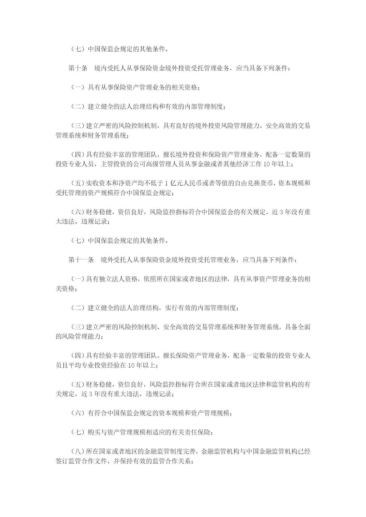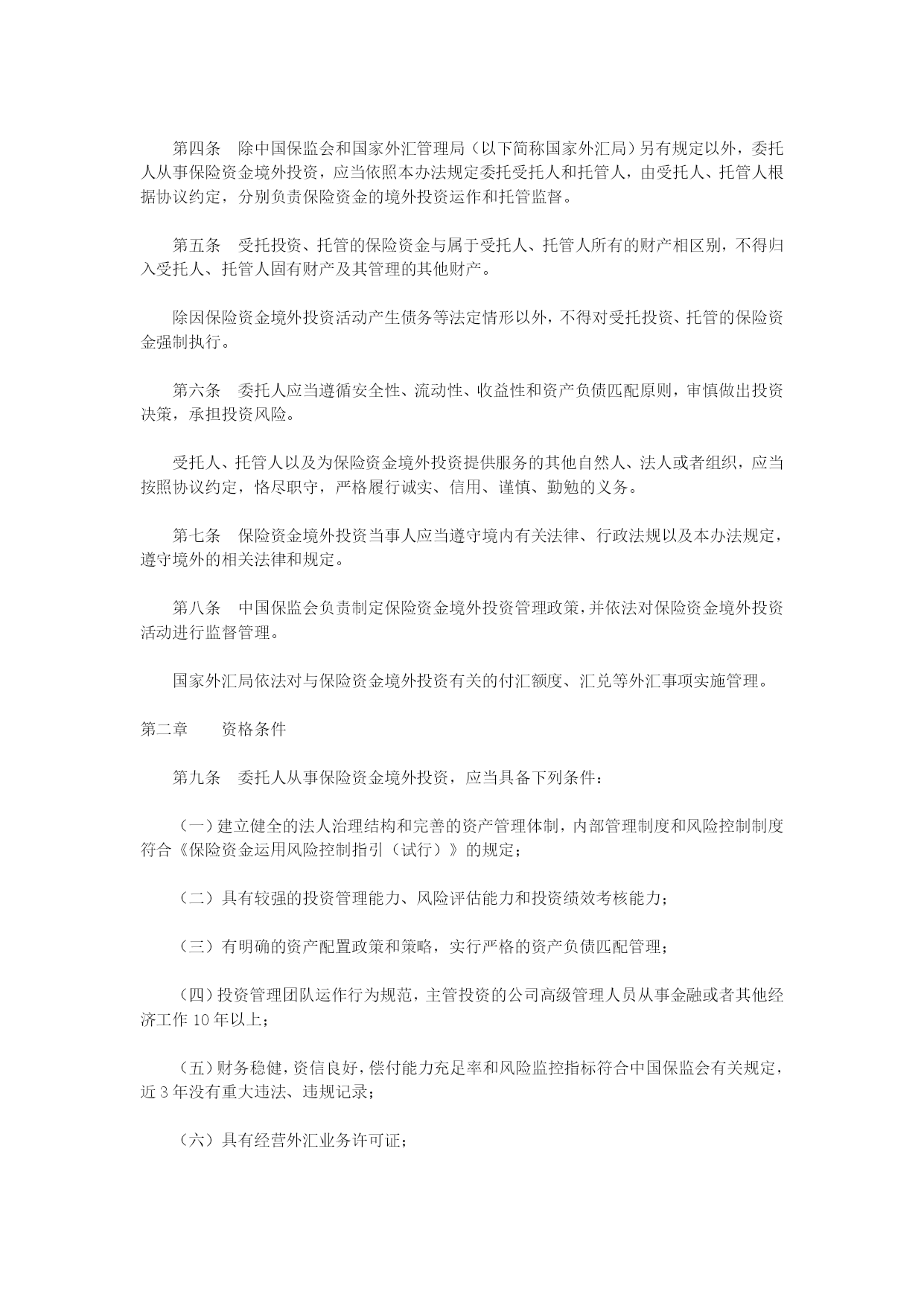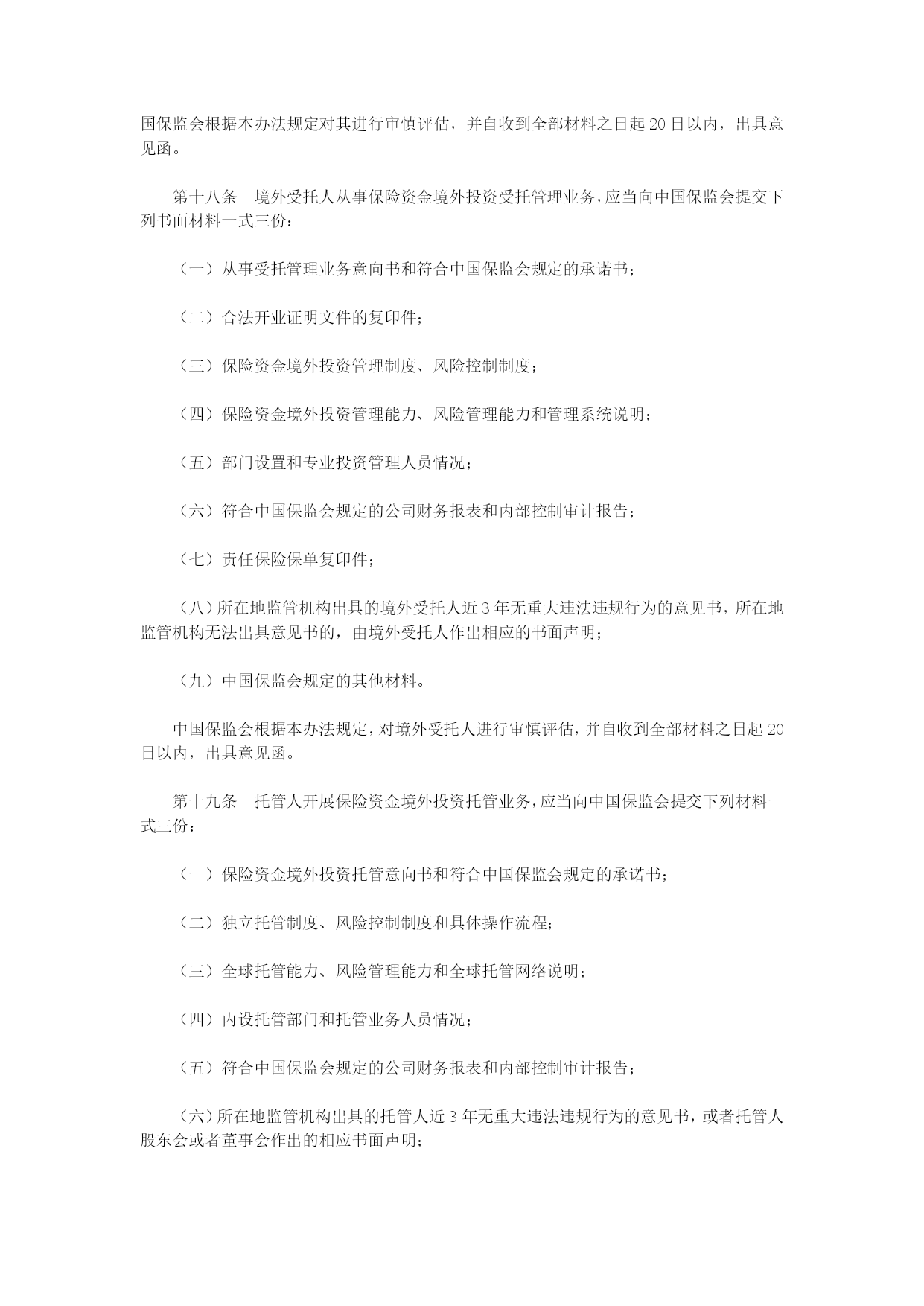 保险资金境外投资管理暂行办法保险资金境外投资管理暂行办法2007年第2号中国保险监督管理委员会、中国人民银行和国家外汇管理局共同制定了《保险资金境外投资管理暂行办法》,现予公布,自公布之日起施行。中国保险监督管理委员会主席吴定富中国人民银行行长周小川国家外汇管理局局长胡晓炼二○○七年六月二十八日保险资金境外投资管理暂行办法第一章总则第一条为了加强保险资金境外投资管理,防范风险,保障被保险人以及保险资金境外投资当事人合法权益,根据《中华人民共和国保险法》、《中华人民共和国外汇管理条例》等法律、行政法规,制定本办法。第二条本办法所称保险资金境外投资当事人,是指委托人、受托人和托管人。本办法所称委托人,是指在中华人民共和国境内依法设立的保险公司、保险集团公司、保险控股公司等保险机构。本办法所称受托人,包括境内受托人和境外受托人。境内受托人是指在中华人民共和国境内依法设立的保险资产管理公司,以及符合中国保险监督管理委员会(以下简称中国保监会)规定条件的境内其他专业投资管理机构。境外受托人是指在中华人民共和国境外依法设立,符合中国保监会规定条件的专业投资管理机构。本办法所称托管人,是指在中华人民共和国境内依法设立,符合中国保监会规定条件的商业银行和其他金融机构。担任托管人的商业银行包括中资银行、中外合资银行、外商独资银行和外国银行分行。第三条本办法所称保险资金,是指委托人自有外汇资金、用人民币购买的外汇资金及上述资金境外投资形成的资产。第四条除中国保监会和国家外汇管理局(以下简称国家外汇局)另有规定以外,委托人从事保险资金境外投资,应当依照本办法规定委托受托人和托管人,由受托人、托管人根据协议约定,分别负责保险资金的境外投资运作和托管监督。第五条受托投资、托管的保险资金与属于受托人、托管人所有的财产相区别,不得归入受托人、托管人固有财产及其管理的其他财产。除因保险资金境外投资活动产生债务等法定情形以外,不得对受托投资、托管的保险资金强制执行。第六条委托人应当遵循安全性、流动性、收益性和资产负债匹配原则,审慎做出投资决策,承担投资风险。受托人、托管人以及为保险资金境外投资提供服务的其他自然人、法人或者组织,应当按照协议约定,恪尽职守,严格履行诚实、信用、谨慎、勤勉的义务。第七条保险资金境外投资当事人应当遵守境内有关法律、行政法规以及本办法规定,遵守境外的相关法律和规定。第八条中国保监会负责制定保险资金境外投资管理政策,并依法对保险资金境外投资活动进行监督管理。国家外汇局依法对与保险资金境外投资有关的付汇额度、汇兑等外汇事项实施管理。第二章资格条件第九条委托人从事保险资金境外投资,应当具备下列条件:(一)建立健全的法人治理结构和完善的资产管理体制,内部管理制度和风险控制制度符合《保险资金运用风险控制指引(试行)》的规定;(二)具有较强的投资管理能力、风险评估能力和投资绩效考核能力;(三)有明确的资产配置政策和策略,实行严格的资产负债匹配管理;(四)投资管理团队运作行为规范,主管投资的公司高级管理人员从事金融或者其他经济工作10年以上;(五)财务稳健,资信良好,偿付能力充足率和风险监控指标符合中国保监会有关规定,近3年没有重大违法、违规记录;(六)具有经营外汇业务许可证;(七)中国保监会规定的其他条件。第十条境内受托人从事保险资金境外投资受托管理业务,应当具备下列条件:(一)具有从事保险资产管理业务的相关资格;(二)建立健全的法人治理结构和有效的内部管理制度;(三)建立严密的风险控制机制,具有良好的境外投资风险管理能力、安全高效的交易管理系统和财务管理系统;(四)具有经验丰富的管理团队,擅长境外投资和保险资产管理业务,配备一定数量的投资专业人员,主管投资的公司高级管理人员从事金融或者其他经济工作10年以上;(五)实收资本和净资产均不低于1亿元人民币或者等值的自由兑换货币,资本规模和受托管理的资产规模符合中国保监会规定;(六)财务稳健,资信良好,风险监控指标符合中国保监会的有关规定,近3年没有重大违法、违规记录;(七)中国保监会规定的其他条件。第十一条境外受托人从事保险资金境外投资受托管理业务,应当具备下列条件:(一)具有独立法人资格,依照所在国家或者地区的法律,具有从事资产管理业务的相关资格;(二)建立健全的法人治理结构,实行有效的内部管理制度;(三)建立严密的风险控制机制、安全高效的交易管理系统和财务管理系统,具备全面的风险管理能力;(四)具有经验丰富的管理团队,擅长保险资产管理业务,配备一定数量的投资专业人员且平均专业投资经验在10年以上;(五)财务稳健,资信良好,风险监控指标符合所在国家或者地区法律和监管机构的有关规定,近3年没有重大违法、违规记录;(六)有符合中国保监会规定的资本规模和资产管理规模;(七)购买与资产管理规模相适应的有