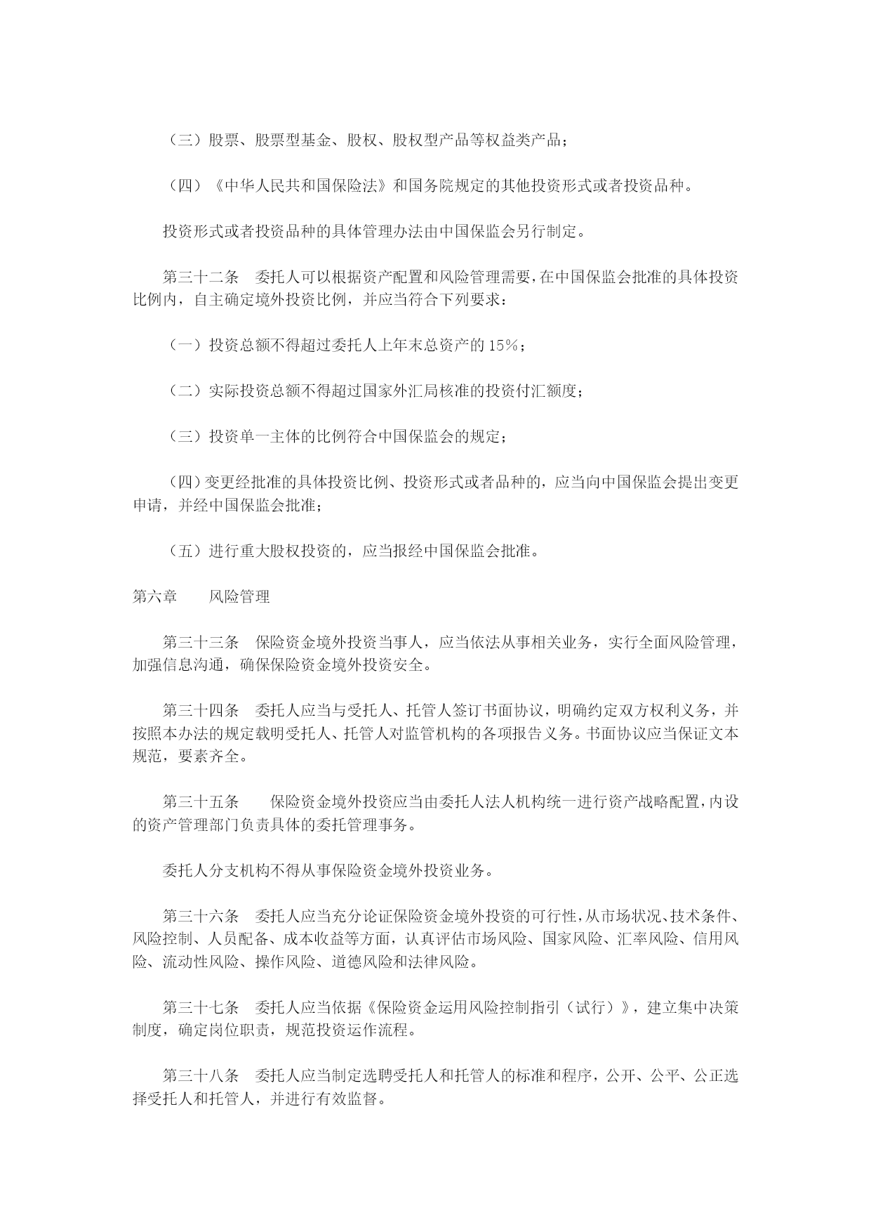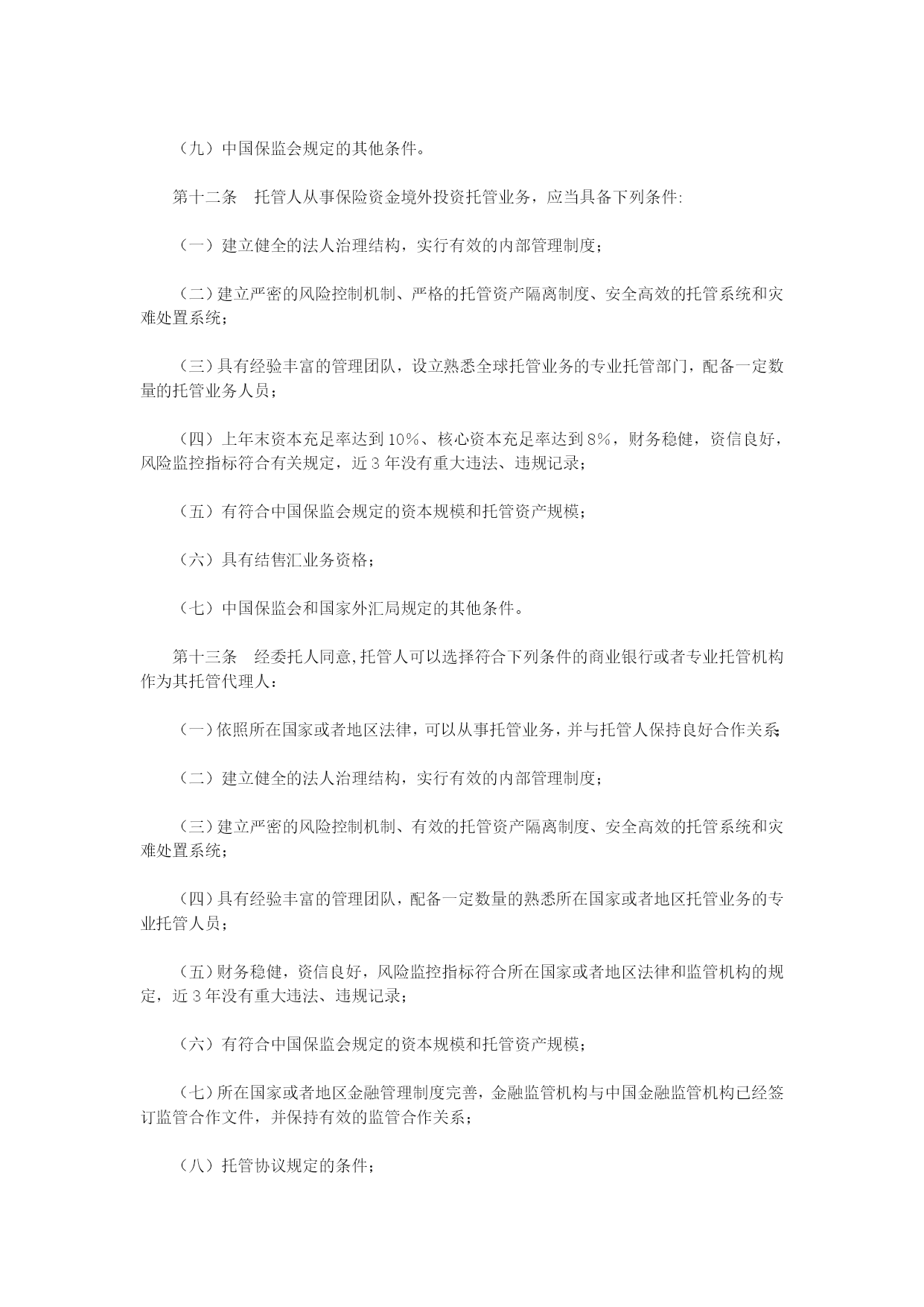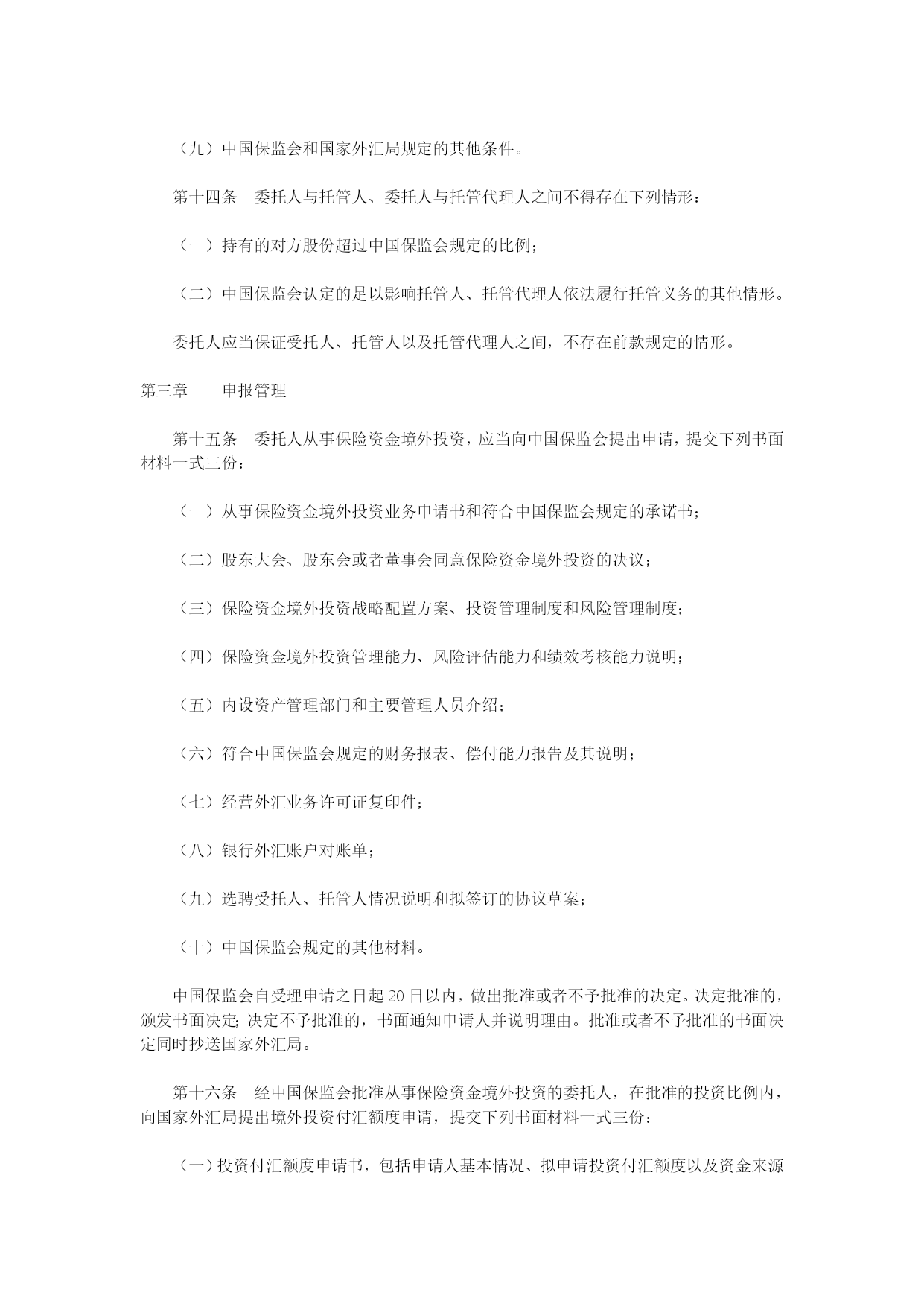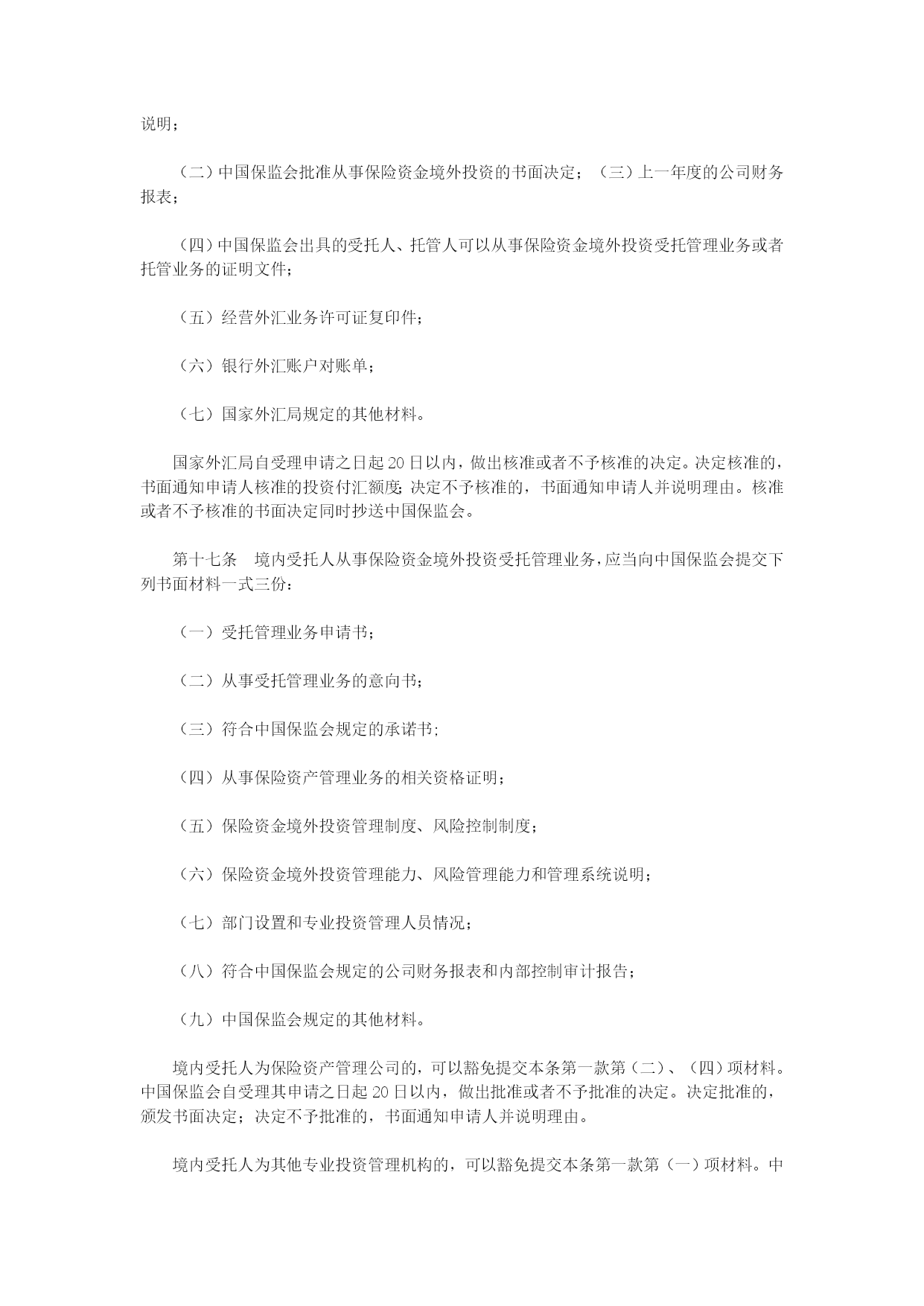 保险资金境外投资管理暂行办法保险资金境外投资管理暂行办法2007年第2号中国保险监督管理委员会、中国人民银行和国家外汇管理局共同制定了《保险资金境外投资管理暂行办法》,现予公布,自公布之日起施行。中国保险监督管理委员会主席吴定富中国人民银行行长周小川国家外汇管理局局长胡晓炼二○○七年六月二十八日保险资金境外投资管理暂行办法第一章总则第一条为了加强保险资金境外投资管理,防范风险,保障被保险人以及保险资金境外投资当事人合法权益,根据《中华人民共和国保险法》、《中华人民共和国外汇管理条例》等法律、行政法规,制定本办法。第二条本办法所称保险资金境外投资当事人,是指委托人、受托人和托管人。本办法所称委托人,是指在中华人民共和国境内依法设立的保险公司、保险集团公司、保险控股公司等保险机构。本办法所称受托人,包括境内受托人和境外受托人。境内受托人是指在中华人民共和国境内依法设立的保险资产管理公司,以及符合中国保险监督管理委员会(以下简称中国保监会)规定条件的境内其他专业投资管理机构。境外受托人是指在中华人民共和国境外依法设立,符合中国保监会规定条件的专业投资管理机构。本办法所称托管人,是指在中华人民共和国境内依法设立,符合中国保监会规定条件的商业银行和其他金融机构。担任托管人的商业银行包括中资银行、中外合资银行、外商独资银行和外国银行分行。第三条本办法所称保险资金,是指委托人自有外汇资金、用人民币购买的外汇资金及上述资金境外投资形成的资产。第四条除中国保监会和国家外汇管理局(以下简称国家外汇局)另有规定以外,委托人从事保险资金境外投资,应当依照本办法规定委托受托人和托管人,由受托人、托管人根据协议约定,分别负责保险资金的境外投资运作和托管监督。第五条受托投资、托管的保险资金与属于受托人、托管人所有的财产相区别,不得归入受托人、托管人固有财产及其管理的其他财产。除因保险资金境外投资活动产生债务等法定情形以外,不得对受托投资、托管的保险资金强制执行。第六条委托人应当遵循安全性、流动性、收益性和资产负债匹配原则,审慎做出投资决策,承担投资风险。受托人、托管人以及为保险资金境外投资提供服务的其他自然人、法人或者组织,应当按照协议约定,恪尽职守,严格履行诚实、信用、谨慎、勤勉的义务。第七条保险资金境外投资当事人应当遵守境内有关法律、行政法规以及本办法规定,遵守境外的相关法律和规定。第八条中国保监会负责制定保险资金境外投资管理政策,并依法对保险资金境外投资活动进行监督管理。国家外汇局依法对与保险资金境外投资有关的付汇额度、汇兑等外汇事项实施管理。第二章资格条件第九条委托人从事保险资金境外投资,应当具备下列条件:(一)建立健全的法人治理结构和完善的资产管理体制,内部管理制度和风险控制制度符合《保险资金运用风险控制指引(试行)》的规定;(二)具有较强的投资管理能力、风险评估能力和投资绩效考核能力;(三)有明确的资产配置政策和策略,实行严格的资产负债匹配管理;(四)投资管理团队运作行为规范,主管投资的公司高级管理人员从事金融或者其他经济工作10年以上;(五)财务稳健,资信良好,偿付能力充足率和风险监控指标符合中国保监会有关规定,近3年没有重大违法、违规记录;(六)具有经营外汇业务许可证;(七)中国保监会规定的其他条件。第十条境内受托人从事保险资金境外投资受托管理业务,应当具备下列条件:(一)具有从事保险资产管理业务的相关资格;(二)建立健全的法人治理结构和有效的内部管理制度;(三)建立严密的风险控制机制,具有良好的境外投资风险管理能力、安全高效的交易管理系统和财务管理系统;(四)具有经验丰富的管理团队,擅长境外投资和保险资产管理业务,配备一定数量的投资专业人员,主管投资的公司高级管理人员从事金融或者其他经济工作10年以上;(五)实收资本和净资产均不低于1亿元人民币或者等值的自由兑换货币,资本规模和受托管理的资产规模符合中国保监会规定;(六)财务稳健,资信良好,风险监控指标符合中国保监会的有关规定,近3年没有重大违法、违规记录;(七)中国保监会规定的其他条件。第十一条境外受托人从事保险资金境外投资受托管理业务,应当具备下列条件:(一)具有独立法人资格,依照所在国家或者地区的法律,具有从事资产管理业务的相关资格;(二)建立健全的法人治理结构,实行有效的内部管理制度;(三)建立严密的风险控制机制、安全高效的交易管理系统和财务管理系统,具备全面的风险管理能力;(四)具有经验丰富的管理团队,擅长保险资产管理业务,配备一定数量的投资专业人员且平均专业投资经验在10年以上;(五)财务稳健,资信良好,风险监控指标符合所在国家或者地区法律和监管机构的有关规定,近3年没有重大违法、违规记录;(六)有符合中国保监会规定的资本规模和资产管理规模;(七)购买与资产管理规模相适应的有