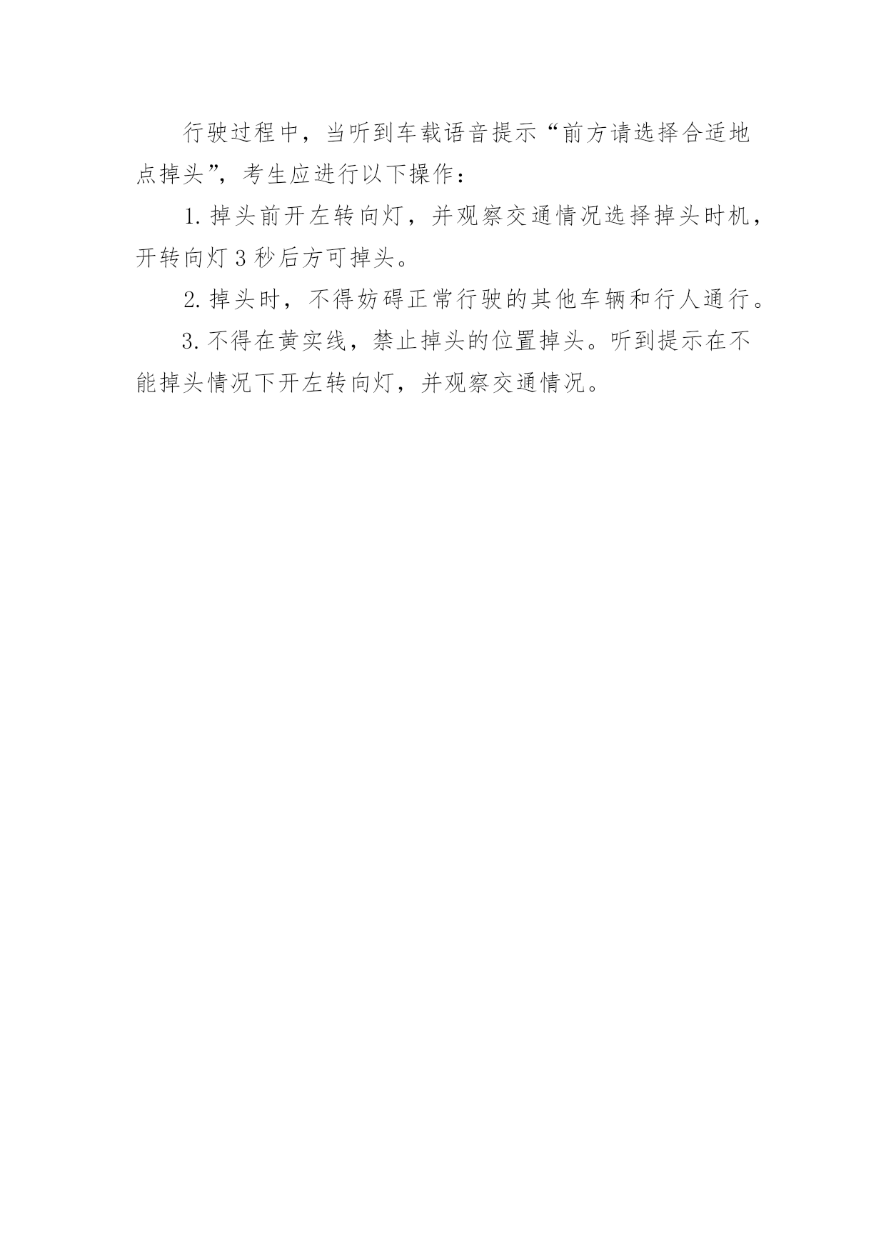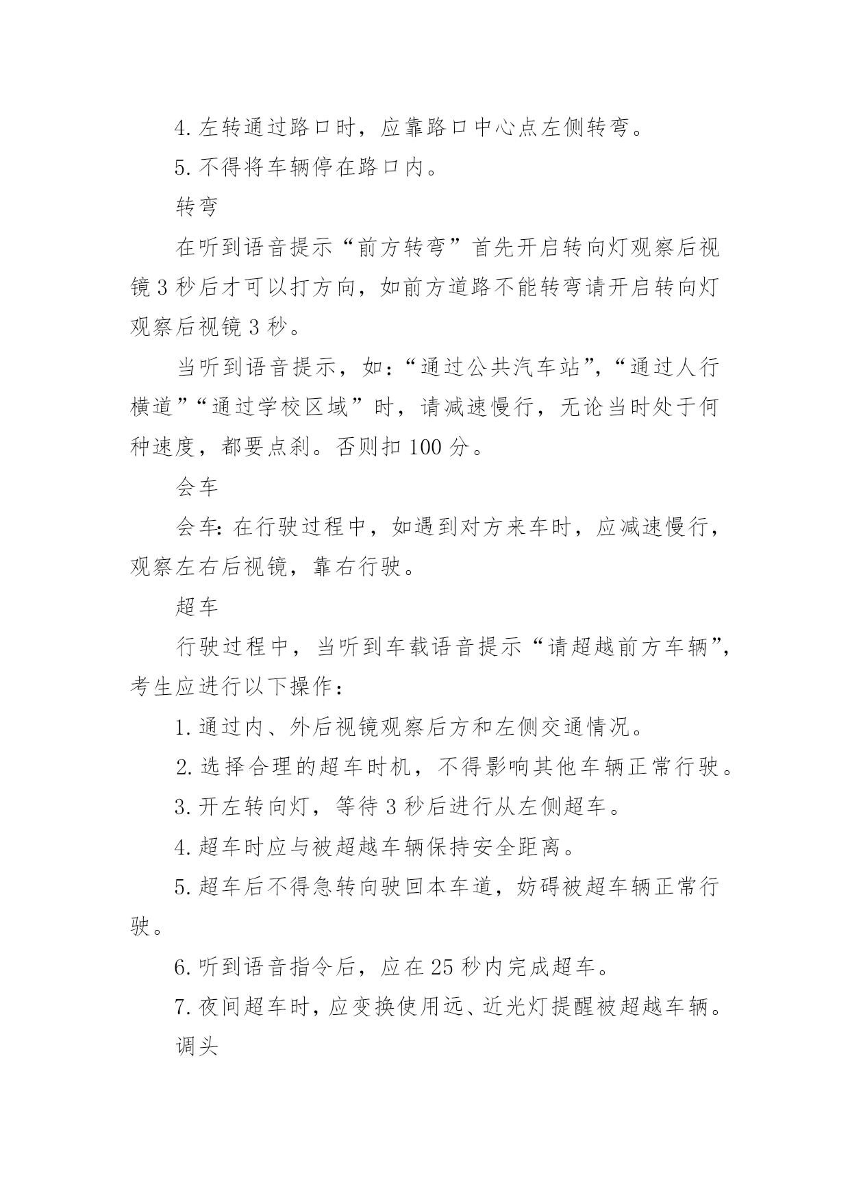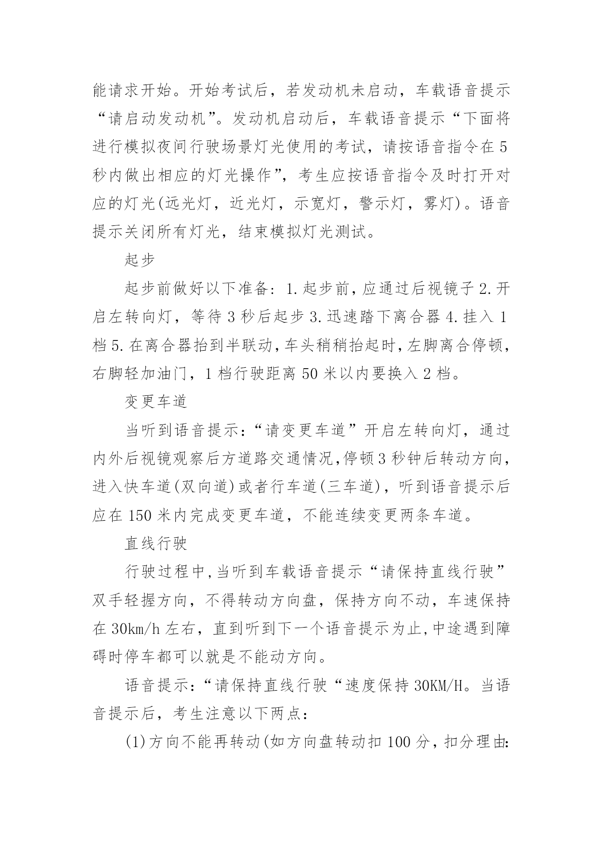 科目三考试路考的技巧2017年科目三考试路考的技巧汇总电子路考考试规则1、模拟夜间行驶。2、按照车载电脑语音提示内容进行相应操作,由电脑直接评判是否合格或被扣分。3、按照车载电脑语音提示的线路进行驾驶,不得擅自改变线路。4、车载电脑语音提示经过,学校区域、公共汽车站、路口、人行横道线时必需减速和观察。5、车载电脑语音提示转弯、变道、超车、靠边停车、掉头时必需在规定的'时间或地点完成。一、电子路考和注意事项上车前准备:1.上车准备:绕车一周,考生从右后门下车后要经过副驾从车头绕过,从左侧走到车尾后牌照处,在此处要停留3秒,在从左侧走到驾驶室门前,报告请求上车。2.经考官或者陪考员允许,方可开门上车。3.上车:上车开门前要先左右观察,观察后再开车门,先将车门打开10公分左右,再次左右观察,观察完后在将车门完全打开,打开后再次左右观察,观察后才可以上车,上车后先调整座位和后视镜,系安全带,检查仪表,然后才能请求开始。开始考试后,若发动机未启动,车载语音提示“请启动发动机”。发动机启动后,车载语音提示“下面将进行模拟夜间行驶场景灯光使用的考试,请按语音指令在5秒内做出相应的灯光操作”,考生应按语音指令及时打开对应的灯光(远光灯,近光灯,示宽灯,警示灯,雾灯)。语音提示关闭所有灯光,结束模拟灯光测试。起步起步前做好以下准备:1.起步前,应通过后视镜子2.开启左转向灯,等待3秒后起步3.迅速踏下离合器4.挂入1档5.在离合器抬到半联动,车头稍稍抬起时,左脚离合停顿,右脚轻加油门,1档行驶距离50米以内要换入2档。变更车道当听到语音提示:“请变更车道”开启左转向灯,通过内外后视镜观察后方道路交通情况,停顿3秒钟后转动方向,进入快车道(双向道)或者行车道(三车道),听到语音提示后应在150米内完成变更车道,不能连续变更两条车道。直线行驶行驶过程中,当听到车载语音提示“请保持直线行驶”双手轻握方向,不得转动方向盘,保持方向不动,车速保持在30km/h左右,直到听到下一个语音提示为止,中途遇到障碍时停车都可以就是不能动方向。语音提示:“请保持直线行驶“速度保持30KM/H。当语音提示后,考生注意以下两点:(1)方向不能再转动(如方向盘转动扣100分,扣分理由:行驶时方向控制不稳。)当听到“结束直线行驶”,表示直线行驶考试已完成,此时可转动(调整)方向。通过人行横道通过人行横道线:在听到语音提示“前方通过人行横道线”踩刹车减速,左右观察,及时松开刹车通过,在听到语音提示“前方人行横道线有行人通过”踩刹车及时停车,在听到语音提示“行人已通过”挂一档起步继续行驶。通过学校区域通过学校区域:在听到语音提示“前方通过学校”3秒内踩刹车减速,左右观察,及时松开刹车通过,通过人行横道时将车速控制在30km/h以下。通过公共汽车站通过公共汽车站:通过公共汽车站前应观察左右方交通情况,在听到语音提示“前方通过公共汽车站”在3秒内踩刹车减速,左右观察,及时松开刹车通过,车速控制在30km/h以下。通过路口,减速慢行1.考生应按车道导向箭头指示,选择合适的车道行驶,并按照交通信号灯的指示行驶。2.通过路口停车线前,应有减速动作或将车速控制在30km/h以下。3.直行通过路口时应观察左、右方交通情况;在路口转弯时,应提起3秒开启转向灯。4.左转通过路口时,应靠路口中心点左侧转弯。5.不得将车辆停在路口内。转弯在听到语音提示“前方转弯”首先开启转向灯观察后视镜3秒后才可以打方向,如前方道路不能转弯请开启转向灯观察后视镜3秒。当听到语音提示,如:“通过公共汽车站”,“通过人行横道”“通过学校区域”时,请减速慢行,无论当时处于何种速度,都要点刹。否则扣100分。会车会车:在行驶过程中,如遇到对方来车时,应减速慢行,观察左右后视镜,靠右行驶。超车行驶过程中,当听到车载语音提示“请超越前方车辆”,考生应进行以下操作:1.通过内、外后视镜观察后方和左侧交通情况。2.选择合理的超车时机,不得影响其他车辆正常行驶。3.开左转向灯,等待3秒后进行从左侧超车。4.超车时应与被超越车辆保持安全距离。5.超车后不得急转向驶回本车道,妨碍被超车辆正常行驶。6.听到语音指令后,应在25秒内完成超车。7.夜间超车时,应变换使用远、近光灯提醒被超越车辆。调头行驶过程中,当听到车载语音提示“前方请选择合适地点掉头”,考生应进行以下操作:1.掉头前开左转向灯,并观察交通情况选择掉头时机,开转向灯3秒后方可掉头。2.掉头时,不得妨碍正常行驶的其他车辆和行人通行。3.不得在黄实线,禁止掉头的位置掉头。听到提示在不能掉头情况下开左转向灯,并观察交通情况。