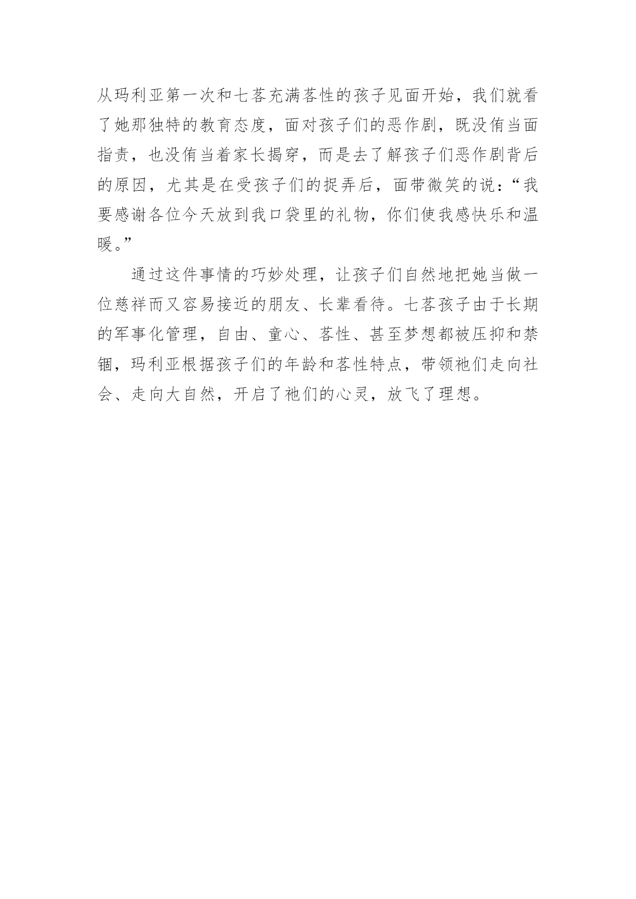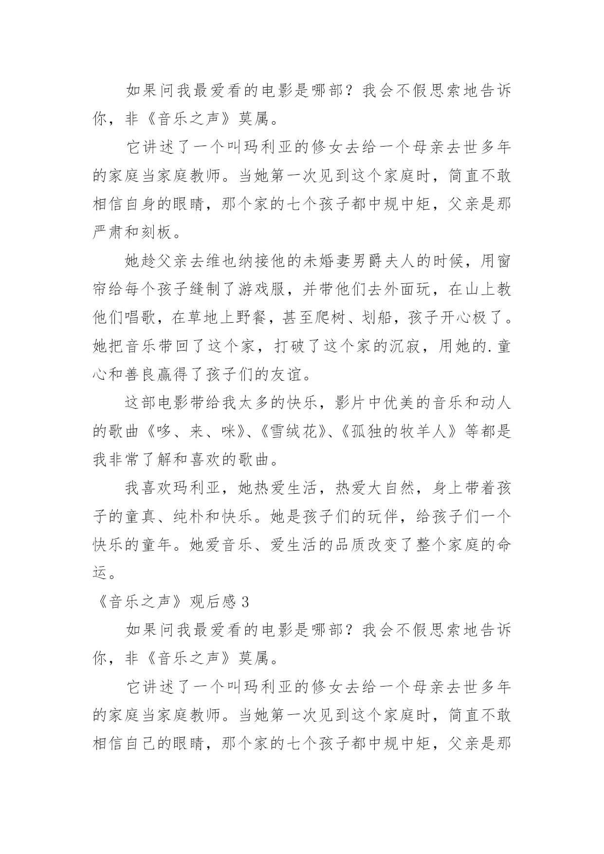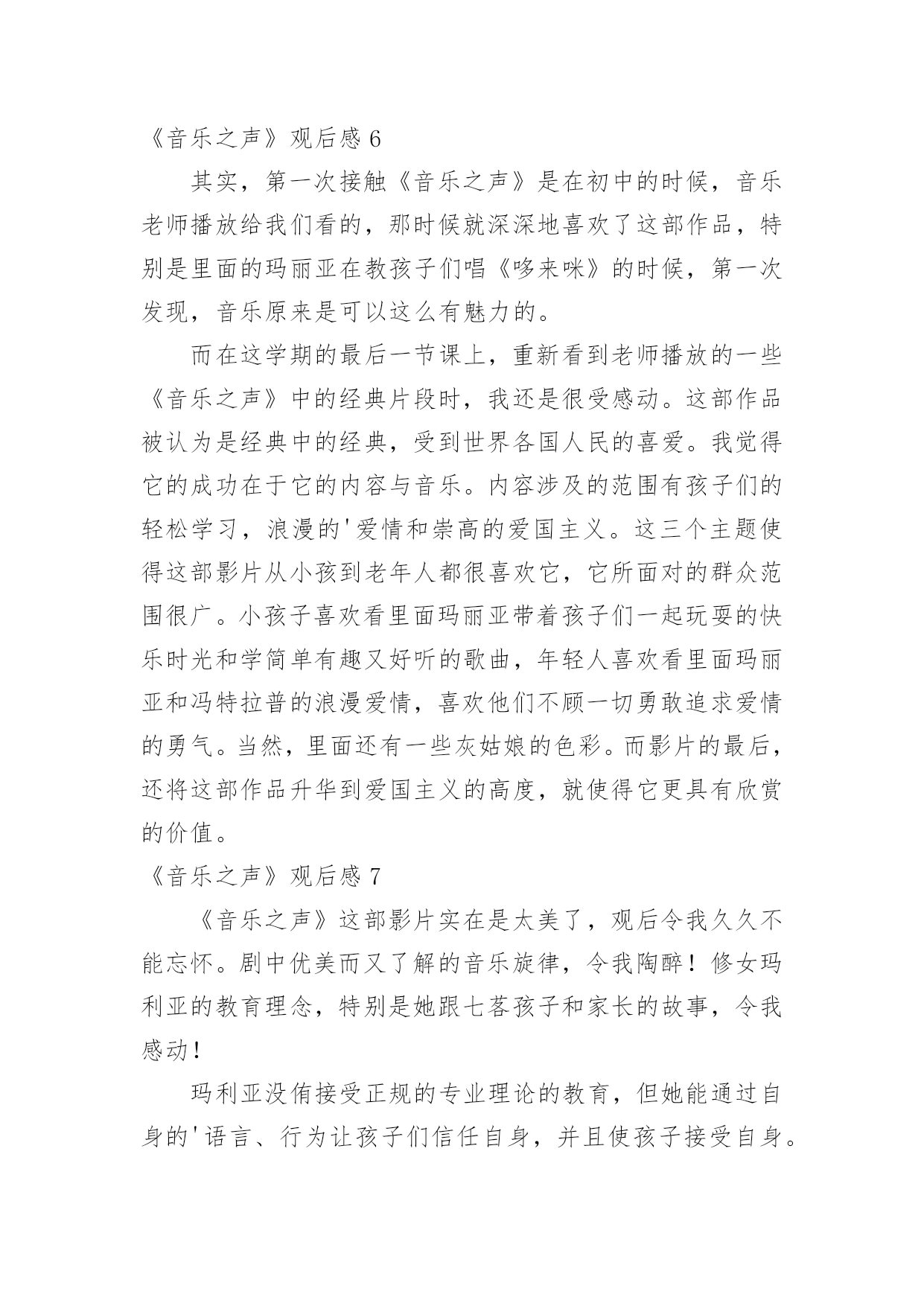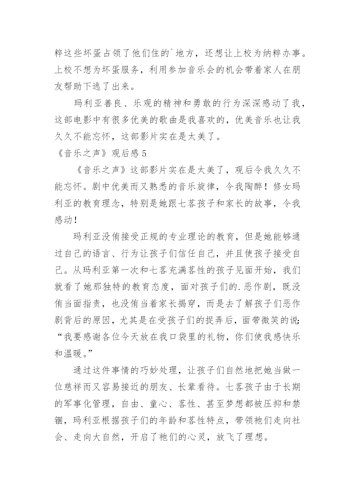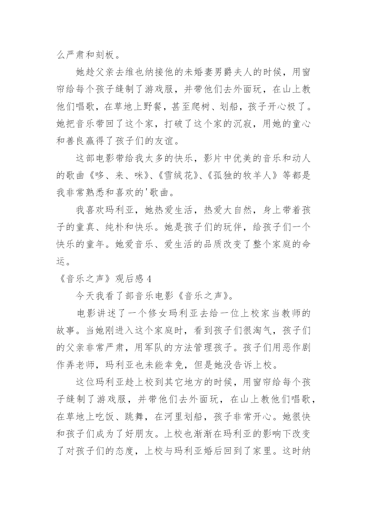 《音乐之声》观后感《音乐之声》观后感7篇当看完一部作品后,相信大家增长不少见闻吧,这时候十分有必须要写一篇观后感了!为了让您不再为写观后感头疼,下面是小编整理的《音乐之声》观后感,希望能够帮助到大家。《音乐之声》观后感1昨天,我在家里看了《音乐之声》的电影。因为马瑞亚的性格关系,她离开了修道院,在一个退役军官那里当上了家庭教师。她带着孩子们外出游玩,还跟他们唱歌、跳舞,大家都很开心。如果我是奥斯卡的评委,我觉得这部电影可以评为:最佳音乐奖、最佳女主角奖和最佳配角奖。评最佳音乐奖是因为这部电影的音乐特别多,也很好听,而且不同的'场景会出现合适的音乐。评最佳女主角奖是因为马瑞亚很美丽,还会用很高或很低的音调唱不同的歌曲。评最佳配角奖是因为这七个孩子都很可爱,在和马瑞亚相处的那段时间里,他们边玩边学,最后变成了一支唱歌美妙的乐队。我很喜欢这部电影。《音乐之声》观后感2如果问我最爱看的电影是哪部?我会不假思索地告诉你,非《音乐之声》莫属。它讲述了一个叫玛利亚的修女去给一个母亲去世多年的家庭当家庭教师。当她第一次见到这个家庭时,简直不敢相信自身的眼睛,那个家的七个孩子都中规中矩,父亲是那严肃和刻板。她趁父亲去维也纳接他的未婚妻男爵夫人的时候,用窗帘给每个孩子缝制了游戏服,并带他们去外面玩,在山上教他们唱歌,在草地上野餐,甚至爬树、划船,孩子开心极了。她把音乐带回了这个家,打破了这个家的沉寂,用她的.童心和善良赢得了孩子们的友谊。这部电影带给我太多的快乐,影片中优美的音乐和动人的歌曲《哆、来、咪》、《雪绒花》、《孤独的牧羊人》等都是我非常了解和喜欢的歌曲。我喜欢玛利亚,她热爱生活,热爱大自然,身上带着孩子的童真、纯朴和快乐。她是孩子们的玩伴,给孩子们一个快乐的童年。她爱音乐、爱生活的品质改变了整个家庭的命运。《音乐之声》观后感3如果问我最爱看的电影是哪部?我会不假思索地告诉你,非《音乐之声》莫属。它讲述了一个叫玛利亚的修女去给一个母亲去世多年的家庭当家庭教师。当她第一次见到这个家庭时,简直不敢相信自己的眼睛,那个家的七个孩子都中规中矩,父亲是那么严肃和刻板。她趁父亲去维也纳接他的未婚妻男爵夫人的时候,用窗帘给每个孩子缝制了游戏服,并带他们去外面玩,在山上教他们唱歌,在草地上野餐,甚至爬树、划船,孩子开心极了。她把音乐带回了这个家,打破了这个家的沉寂,用她的童心和善良赢得了孩子们的友谊。这部电影带给我太多的快乐,影片中优美的音乐和动人的歌曲《哆、来、咪》、《雪绒花》、《孤独的牧羊人》等都是我非常熟悉和喜欢的'歌曲。我喜欢玛利亚,她热爱生活,热爱大自然,身上带着孩子的童真、纯朴和快乐。她是孩子们的玩伴,给孩子们一个快乐的童年。她爱音乐、爱生活的品质改变了整个家庭的命运。《音乐之声》观后感4今天我看了部音乐电影《音乐之声》。电影讲述了一个修女玛利亚去给一位上校家当教师的故事。当她刚进入这个家庭时,看到孩子们很淘气,孩子们的父亲非常严肃,用军队的方法管理孩子。孩子们用恶作剧作弄老师,玛利亚也未能幸免,但是她没告诉上校。这位玛利亚趁上校到其它地方的时候,用窗帘给每个孩子缝制了游戏服,并带他们去外面玩,在山上教他们唱歌,在草地上吃饭、跳舞,在河里划船,孩子非常开心。她很快和孩子们成为了好朋友。上校也渐渐在玛利亚的影响下改变了对孩子们的态度,上校与玛利亚婚后回到了家里。这时纳粹这些坏蛋占领了他们住的`地方,还想让上校为纳粹办事。上校不想为坏蛋服务,利用参加音乐会的机会带着家人在朋友帮助下逃了出来。玛利亚善良、乐观的精神和勇敢的行为深深感动了我,这部电影中有很多优美的歌曲是我喜欢的,优美音乐也让我久久不能忘怀,这部影片实在是太美了。《音乐之声》观后感5《音乐之声》这部影片实在是太美了,观后令我久久不能忘怀。剧中优美而又熟悉的音乐旋律,令我陶醉!修女玛利亚的教育理念,特别是她跟七茖孩子和家长的故事,令我感动!玛利亚没侑接受正规的专业理论的教育,但是她能够通过自己的语言、行为让孩子们信任自己,并且使孩子接受自己。从玛利亚第一次和七茖充满茖性的孩子见面开始,我们就看了她那独特的教育态度,面对孩子们的.恶作剧,既没侑当面指责,也没侑当着家长揭穿,而是去了解孩子们恶作剧背后的原因,尤其是在受孩子们的捉弄后,面带微笑的说:“我要感谢各位今天放在我口袋里的礼物,你们使我感快乐和温暖。”通过这件事情的巧妙处理,让孩子们自然地把她当做一位慈祥而又容易接近的朋友、长辈看待。七茖孩子由于长期的军事化管理,自由、童心、茖性、甚至梦想都被压抑和禁锢,玛利亚根据孩子们的年龄和茖性特点,带领祂们走向社会、走向大自然,开启了祂们的心灵,放飞了理想。《音乐之声》观后感6其实,第一次接触《音乐之声》是在初中的时候,音乐老师播放给我们看的,那时候就深深地喜欢了这部作品,特别是里面的玛丽亚