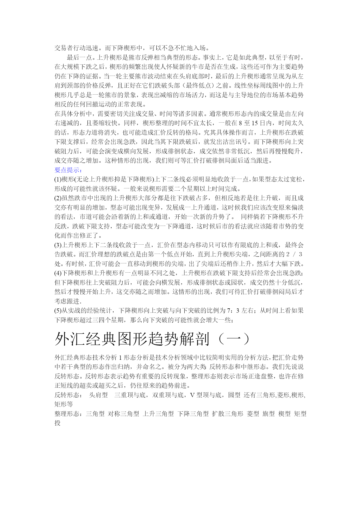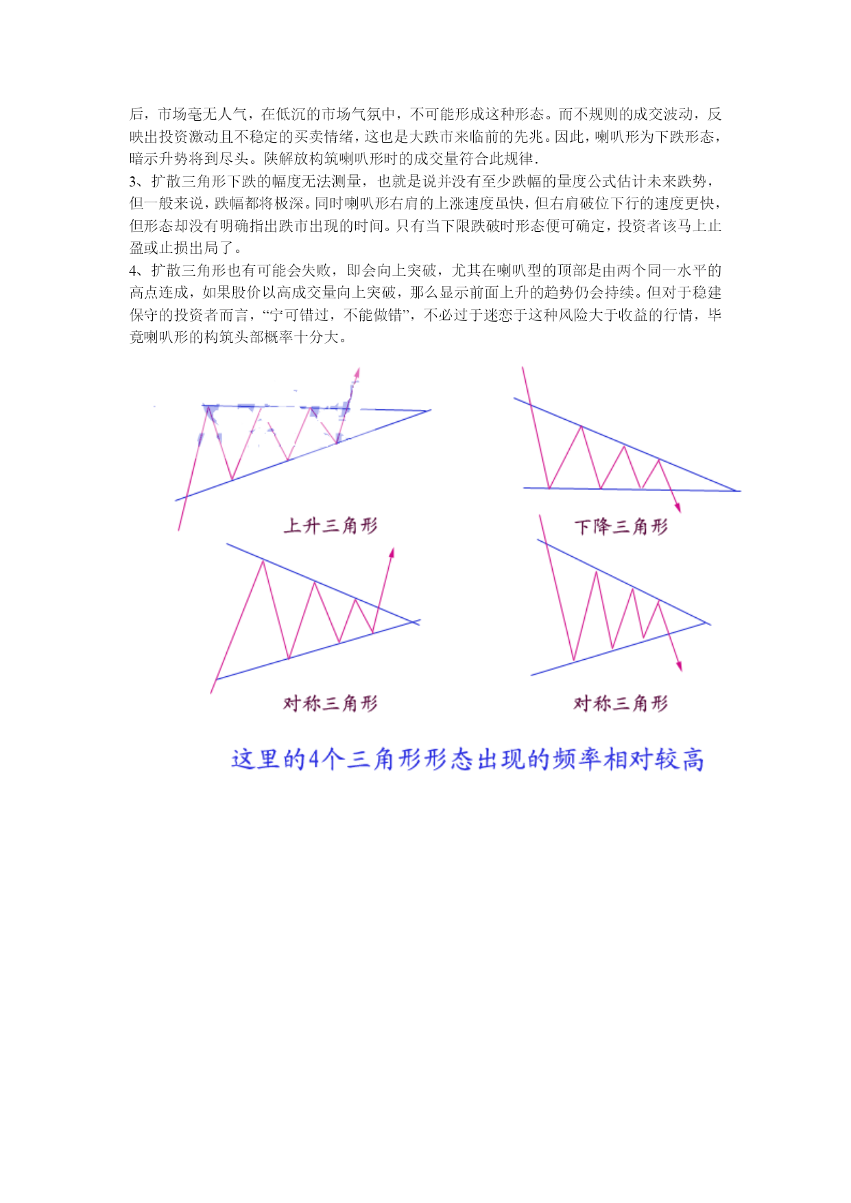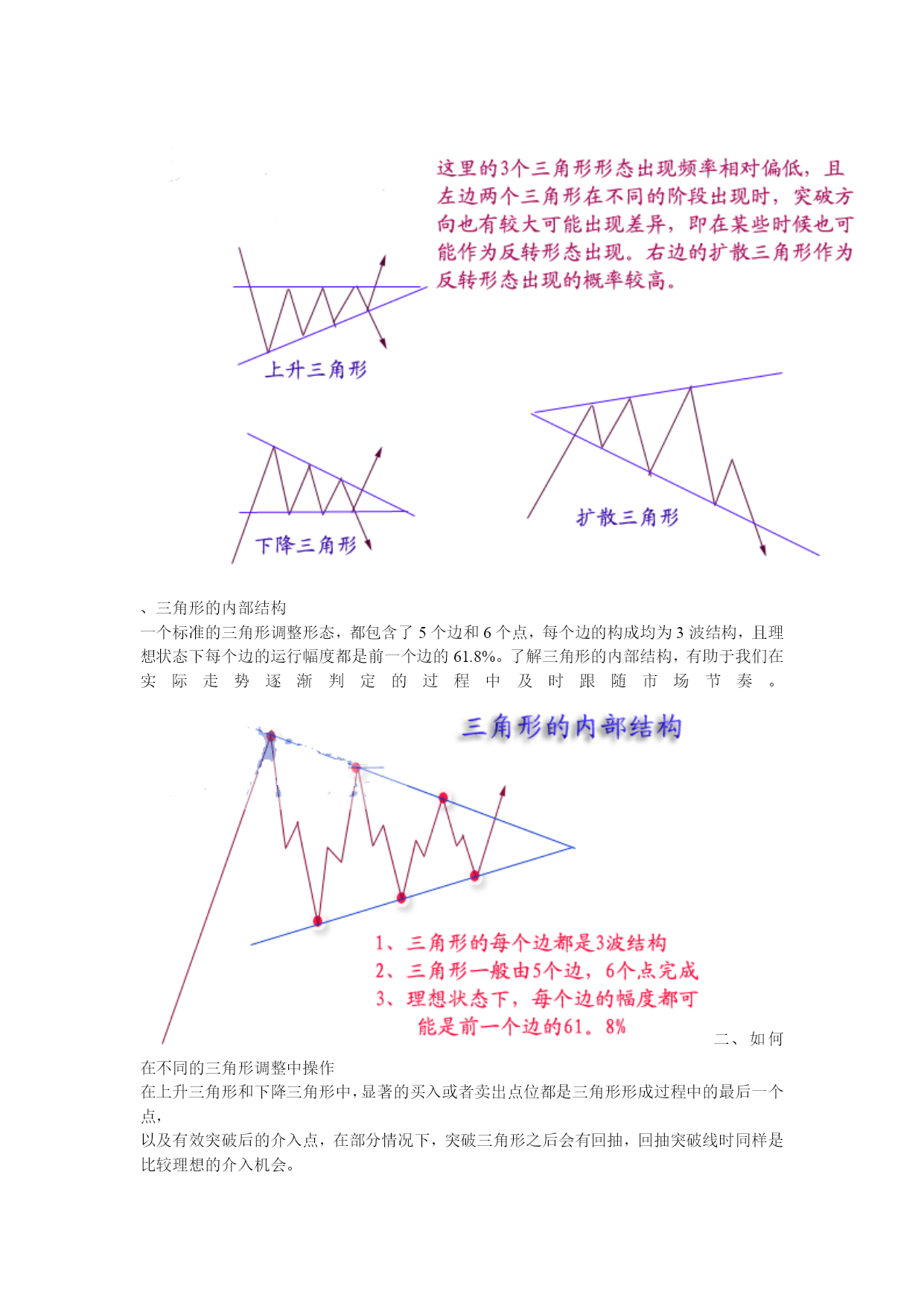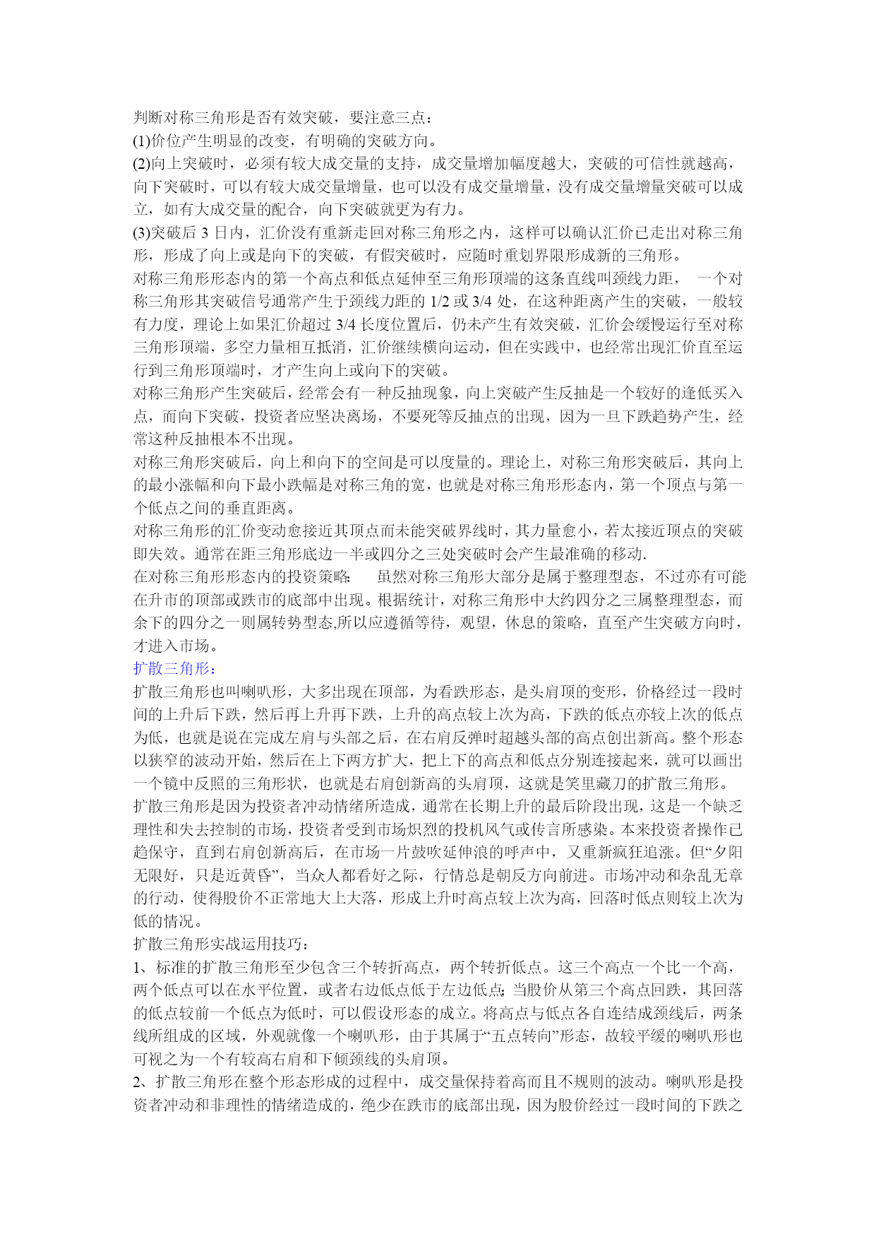外汇经典形态技术分析一、三角形调整的形态特征1、四种三角形的基本形式:根据三角形出现的形态特征,可以将其分为上升三角形、下降三角形、对称三角形和扩散三角形.上升(下降)三角形:汇价在某水平呈现当正当强大的卖压,价格从低点回升到水平便告回落,但市场的购买力十分强,汇价未回至上次低点即告弹升,这情形持续使汇价随着一条阻力水平线波动日渐收窄。我们若把每一个短期波动高点连接起来,可画出一条水平阻力线;而每一个短期波动低点则可相连出另一条向上倾斜的线,这就是上升三角形。下降三角形的形状的上升三角形恰好相反.上升三角形显示买卖双方在该范围内的较量,但买方的力量在争持中已稍占上风。卖方在其特定的汇价水平不断沽售不急于出货,但却不看好后市,于是汇价每升到理想的沽售水平便即沽出,这样在同一价格的沽售形成了一条水平的供给线。不过,市场的购买力量很强,他们不待汇价回落到上次的低点,更急不及待地购进,因此形成一条向右上方倾斜的需求线。下降三角形则情形相反.上升三角形和下降三角形都属于整理形态。上升三角形在上升过程中出现,暗示有突破的可能,下降三角形正相反上升三角形在突破顶部水平的阻力线时,有一个短期买入讯号,下降三角形在突破下部水平阻力线时有一个短期沽出讯号.此二型态虽属于整理形态,有一般向上向下规律性,但亦有可能朝相反方向发展,上升三角形向上突破后的最少涨幅为三角形的竖直高度。对称三角形:对称三角形是投资者暂时摸不清楚汇价未来的走向,多空双方看法出现严重分歧,多方有看多的理由,空方有看空的现由,因此汇价下跌,多方人士逢低买入,而汇价上涨,空方人士借机高场,虽然一底比一底高,但没有出现多方预期的效果,使多方信心产生动摇,买方力量逐步减弱,相对应的汇价一顶比一顶低,但并没有向空方预期的那样,产生大幅下跌。因此使空方对自己原来的判断产生怀疑,致使做空不坚决,因此空方力量同样逐步减弱,这样就出现了多空双方都无法迅速战胜对方,但价位区域却在逐步缩小,汇价去向含糊不表,究竟未来是升是跌,暂时没有明确的信号,这便是对称三角形的主要特色。当汇价运行到对称三解形的尾端或接近顶点时,多空双方处于一种暂时的平衡状态,双方都无力打破僵局。这时,如有一种力量加入到多方或者空方,天平将马上会产生倾斜,经常是一种外力,如明显的利多,利空消息引发三角形向上或向下突破,突破方向产生后,宣告对称三角形态结束.对称三角形是一种未明朗的形态,发展到一定阶段,将可以产生向上突破或向下突破。向上突破:通常发生在汇价产生了一段升幅,由于涨幅已大,短线获利盘开始获利了结,形成了对汇价的打压,但看多者逢低继续买入,便形成了相互拉锯的三角形整理状态,汇价运行一段时期后,将在一个较窄的区域内暂时达到平衡,多空双方势均力敌,这时如果出现一种力量(常是一种外力),加入到多方之中,均衡即被打破,产生向上突破,并指示了向上攻击的方向,一波升势又将展开.向下突破:通常是在汇价产生了较大的跌幅,因跌幅较大,投资者惜售,短线买家进汇价形成三解形整理形态,多空力量暂时平衡,但这只是下跌途中的中转站,一旦新的利空因素产生,稍有卖压,平衡即被打破,产生向下突破,另一轮跌势又将开始。判断对称三角形是否有效突破,要注意三点:(1)价位产生明显的改变,有明确的突破方向。(2)向上突破时,必须有较大成交量的支持,成交量增加幅度越大,突破的可信性就越高,向下突破时,可以有较大成交量增量,也可以没有成交量增量,没有成交量增量突破可以成立,如有大成交量的配合,向下突破就更为有力。(3)突破后3日内,汇价没有重新走回对称三角形之内,这样可以确认汇价已走出对称三角形,形成了向上或是向下的突破,有假突破时,应随时重划界限形成新的三角形。对称三角形形态内的第一个高点和低点延伸至三角形顶端的这条直线叫颈线力距,一个对称三角形其突破信号通常产生于颈线力距的1/2或3/4处,在这种距离产生的突破,一般较有力度,理论上如果汇价超过3/4长度位置后,仍未产生有效突破,汇价会缓慢运行至对称三角形顶端,多空力量相互抵消,汇价继续横向运动,但在实践中,也经常出现汇价直至运行到三角形顶端时,才产生向上或向下的突破。对称三角形产生突破后,经常会有一种反抽现象,向上突破产生反抽是一个较好的逢低买入点,而向下突破,投资者应坚决离场,不要死等反抽点的出现,因为一旦下跌趋势产生,经常这种反抽根本不出现。对称三角形突破后,向上和向下的空间是可以度量的。理论上,对称三角形突破后,其向上的最小涨幅和向下最小跌幅是对称三角的宽,也就是对称三角形形态内,第一个顶点与第一个低点之间的垂直距离。对称三角形的汇价变动愈接近其顶点而未能突破界线时,其力量愈小,若太接近顶点的突破即失效。通常在距三角形底边一半或四分之三处突破时会产生最准确的移动.在对称三角形形态内的投资策略:虽然对称三角