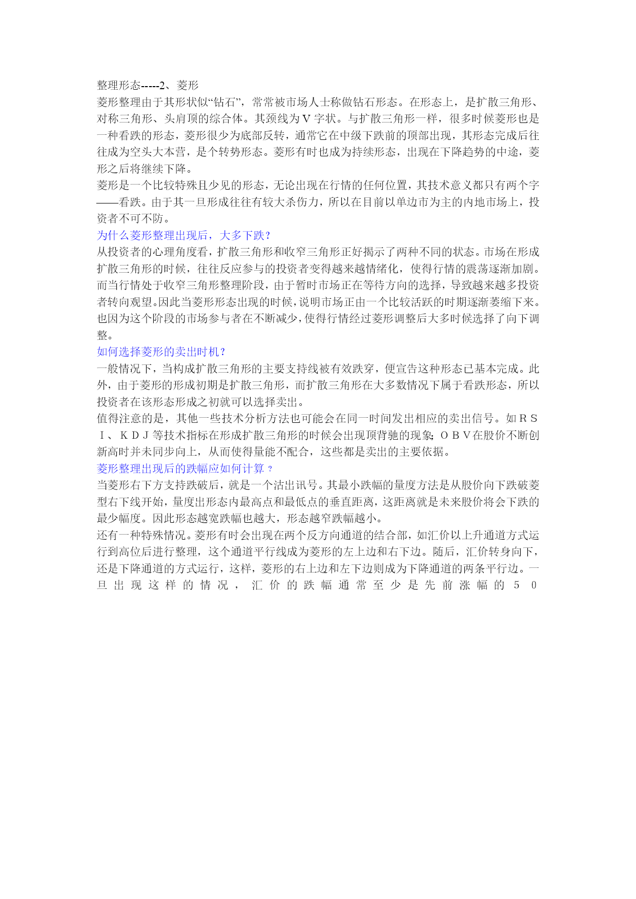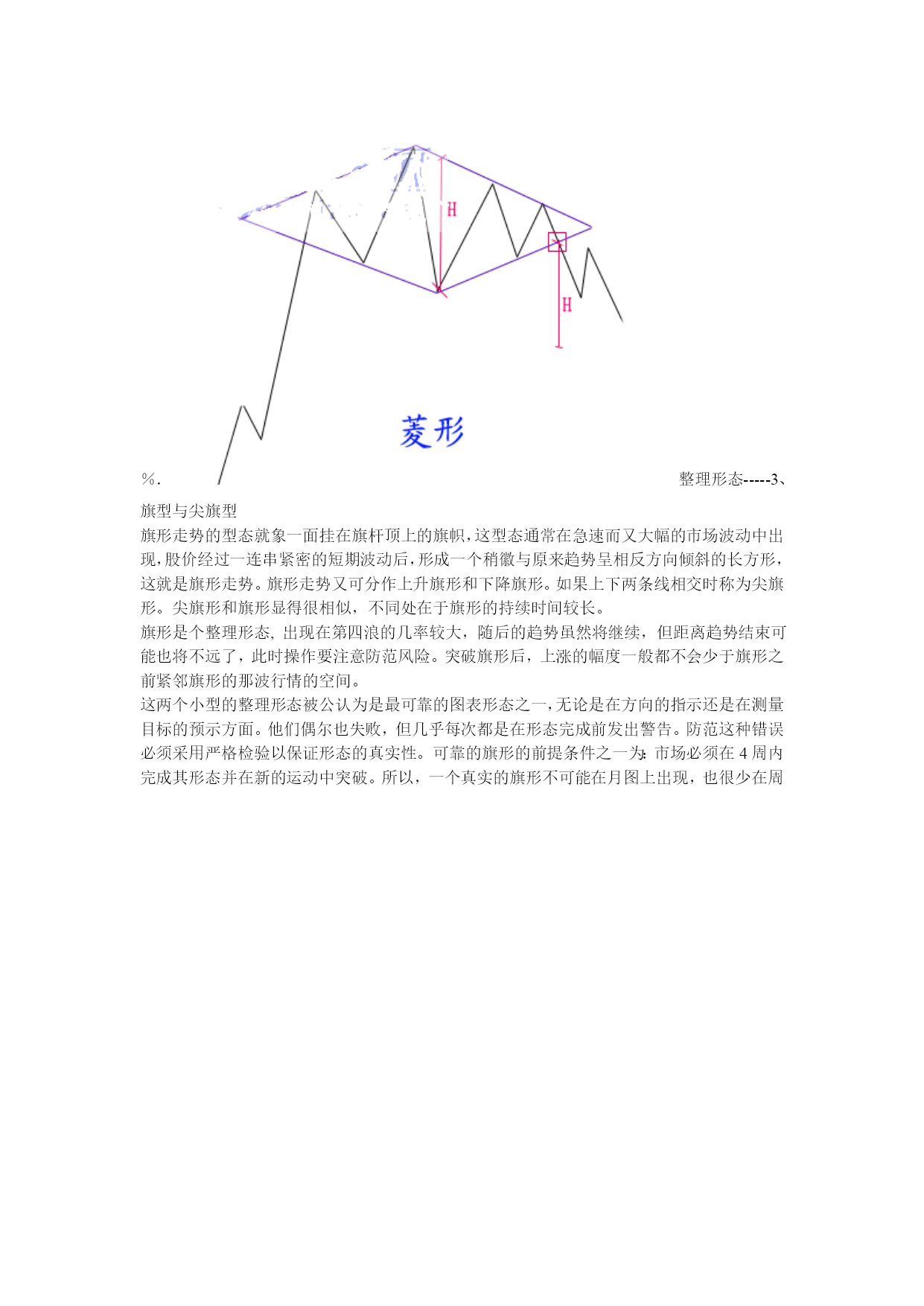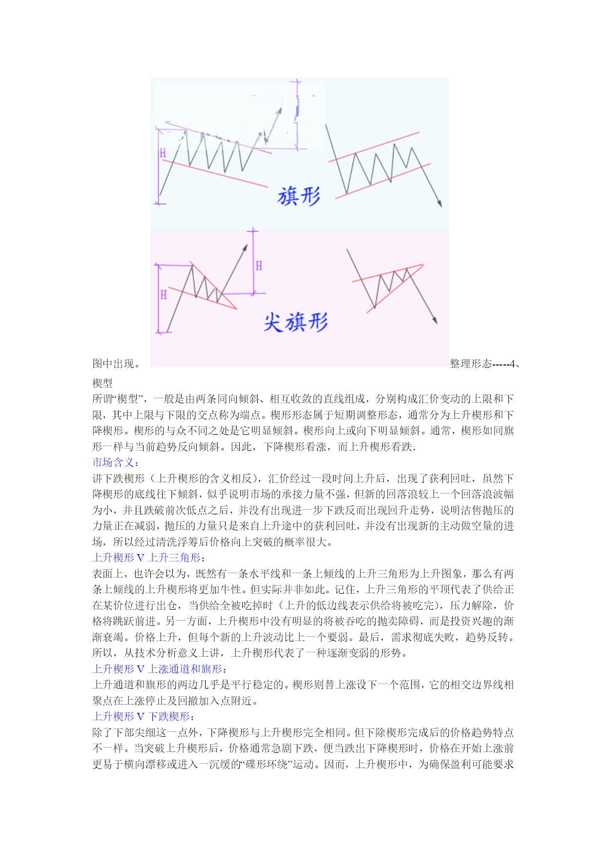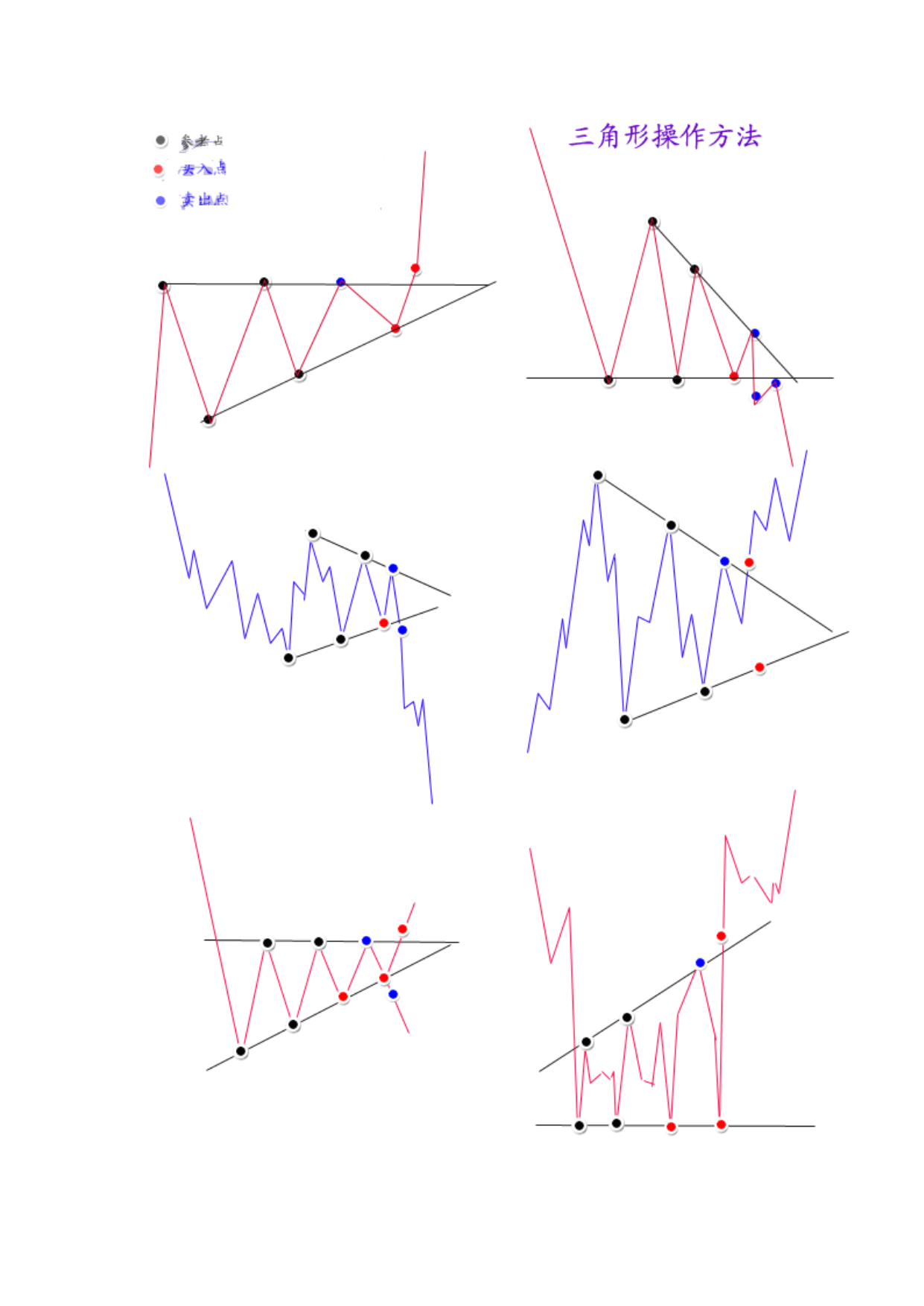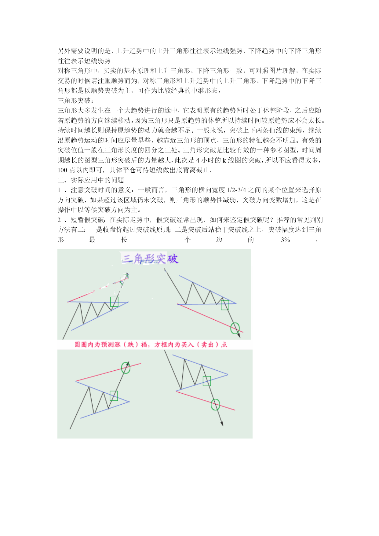 外汇经典形态技术分析一、三角形调整的形态特征1、四种三角形的基本形式:根据三角形出现的形态特征,可以将其分为上升三角形、下降三角形、对称三角形和扩散三角形.上升(下降)三角形:汇价在某水平呈现当正当强大的卖压,价格从低点回升到水平便告回落,但市场的购买力十分强,汇价未回至上次低点即告弹升,这情形持续使汇价随着一条阻力水平线波动日渐收窄。我们若把每一个短期波动高点连接起来,可画出一条水平阻力线;而每一个短期波动低点则可相连出另一条向上倾斜的线,这就是上升三角形。下降三角形的形状的上升三角形恰好相反.上升三角形显示买卖双方在该范围内的较量,但买方的力量在争持中已稍占上风。卖方在其特定的汇价水平不断沽售不急于出货,但却不看好后市,于是汇价每升到理想的沽售水平便即沽出,这样在同一价格的沽售形成了一条水平的供给线。不过,市场的购买力量很强,他们不待汇价回落到上次的低点,更急不及待地购进,因此形成一条向右上方倾斜的需求线。下降三角形则情形相反.上升三角形和下降三角形都属于整理形态。上升三角形在上升过程中出现,暗示有突破的可能,下降三角形正相反上升三角形在突破顶部水平的阻力线时,有一个短期买入讯号,下降三角形在突破下部水平阻力线时有一个短期沽出讯号.此二型态虽属于整理形态,有一般向上向下规律性,但亦有可能朝相反方向发展,上升三角形向上突破后的最少涨幅为三角形的竖直高度。对称三角形:对称三角形是投资者暂时摸不清楚汇价未来的走向,多空双方看法出现严重分歧,多方有看多的理由,空方有看空的现由,因此汇价下跌,多方人士逢低买入,而汇价上涨,空方人士借机高场,虽然一底比一底高,但没有出现多方预期的效果,使多方信心产生动摇,买方力量逐步减弱,相对应的汇价一顶比一顶低,但并没有向空方预期的那样,产生大幅下跌。因此使空方对自己原来的判断产生怀疑,致使做空不坚决,因此空方力量同样逐步减弱,这样就出现了多空双方都无法迅速战胜对方,但价位区域却在逐步缩小,汇价去向含糊不表,究竟未来是升是跌,暂时没有明确的信号,这便是对称三角形的主要特色。当汇价运行到对称三解形的尾端或接近顶点时,多空双方处于一种暂时的平衡状态,双方都无力打破僵局。这时,如有一种力量加入到多方或者空方,天平将马上会产生倾斜,经常是一种外力,如明显的利多,利空消息引发三角形向上或向下突破,突破方向产生后,宣告对称三角形态结束.对称三角形是一种未明朗的形态,发展到一定阶段,将可以产生向上突破或向下突破。向上突破:通常发生在汇价产生了一段升幅,由于涨幅已大,短线获利盘开始获利了结,形成了对汇价的打压,但看多者逢低继续买入,便形成了相互拉锯的三角形整理状态,汇价运行一段时期后,将在一个较窄的区域内暂时达到平衡,多空双方势均力敌,这时如果出现一种力量(常是一种外力),加入到多方之中,均衡即被打破,产生向上突破,并指示了向上攻击的方向,一波升势又将展开.向下突破:通常是在汇价产生了较大的跌幅,因跌幅较大,投资者惜售,短线买家进汇价形成三解形整理形态,多空力量暂时平衡,但这只是下跌途中的中转站,一旦新的利空因素产生,稍有卖压,平衡即被打破,产生向下突破,另一轮跌势又将开始。判断对称三角形是否有效突破,要注意三点:(1)价位产生明显的改变,有明确的突破方向。(2)向上突破时,必须有较大成交量的支持,成交量增加幅度越大,突破的可信性就越高,向下突破时,可以有较大成交量增量,也可以没有成交量增量,没有成交量增量突破可以成立,如有大成交量的配合,向下突破就更为有力。(3)突破后3日内,汇价没有重新走回对称三角形之内,这样可以确认汇价已走出对称三角形,形成了向上或是向下的突破,有假突破时,应随时重划界限形成新的三角形。对称三角形形态内的第一个高点和低点延伸至三角形顶端的这条直线叫颈线力距,一个对称三角形其突破信号通常产生于颈线力距的1/2或3/4处,在这种距离产生的突破,一般较有力度,理论上如果汇价超过3/4长度位置后,仍未产生有效突破,汇价会缓慢运行至对称三角形顶端,多空力量相互抵消,汇价继续横向运动,但在实践中,也经常出现汇价直至运行到三角形顶端时,才产生向上或向下的突破。对称三角形产生突破后,经常会有一种反抽现象,向上突破产生反抽是一个较好的逢低买入点,而向下突破,投资者应坚决离场,不要死等反抽点的出现,因为一旦下跌趋势产生,经常这种反抽根本不出现。对称三角形突破后,向上和向下的空间是可以度量的。理论上,对称三角形突破后,其向上的最小涨幅和向下最小跌幅是对称三角的宽,也就是对称三角形形态内,第一个顶点与第一个低点之间的垂直距离。对称三角形的汇价变动愈接近其顶点而未能突破界线时,其力量愈小,若太接近顶点的突破即失效。通常在距三角形底边一半或四分之三处突破时会产生最准确的移动.在对称三角形形态内的投资策略:虽然对称三角