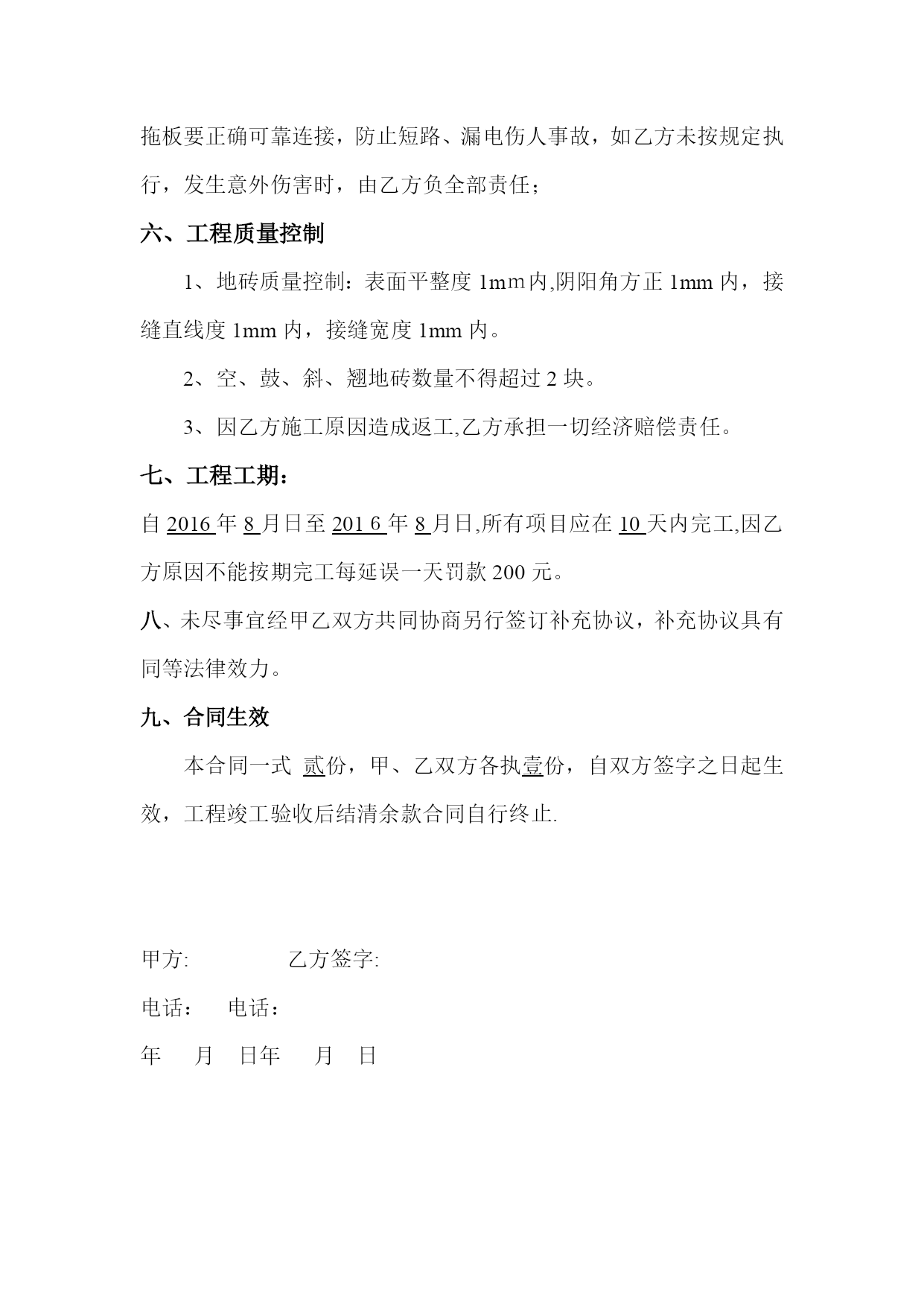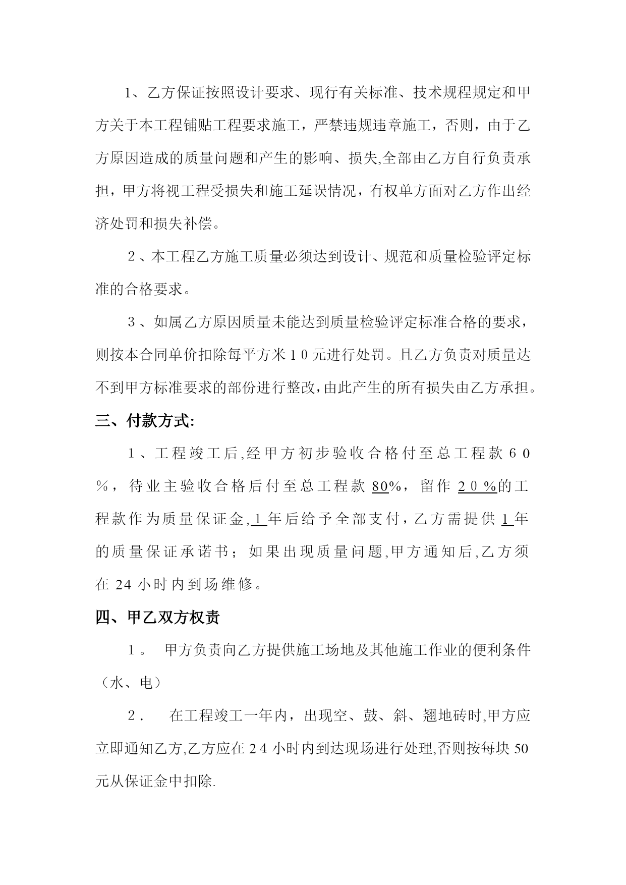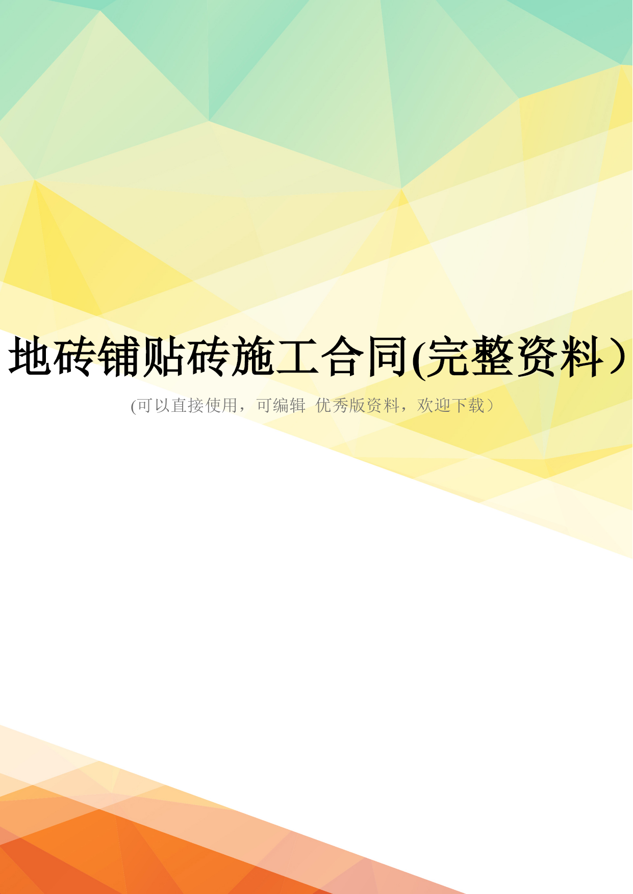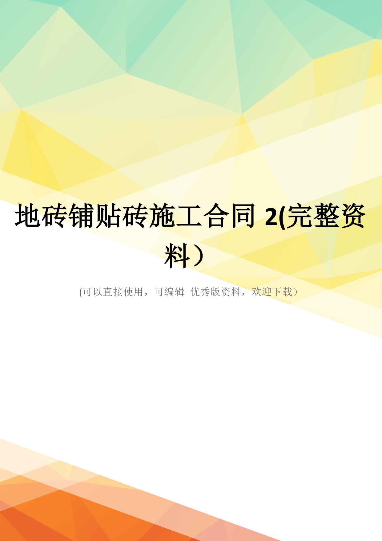 地砖铺贴砖施工合同2(完整资料)(可以直接使用,可编辑优秀版资料,欢迎下载)地砖铺贴砖施工合同甲方(全称):乙方(全称):经甲、乙双方协商,甲方将巴彦县龙庙镇中心小学教学楼工程的地砖,墙裙铺贴等分包给乙方施工。为明确甲、乙双方的责、权、利,确保工程的质量、进度、安全及文明生产,特定立本合同,供双方共同遵守执行.一、工程概况工程名称:巴彦县龙庙镇中心小学教学楼工程工作范围:室内地面和墙裙贴砖、卫生间墙砖、楼梯理石分项工程工期:2018年6月10日至2018年6月25日止二、承包方式和计费标准1.合同价格:⑴