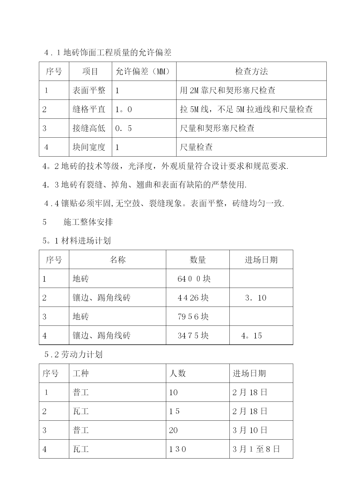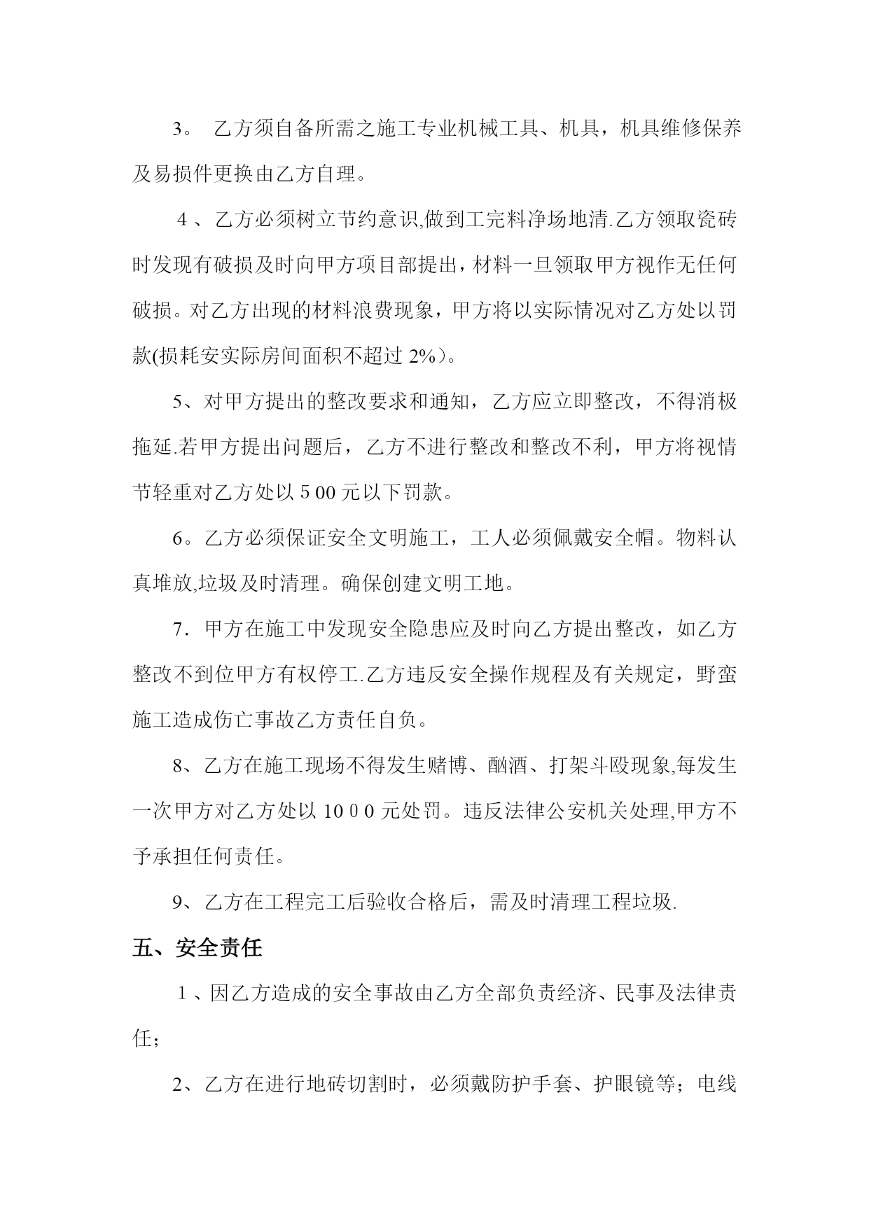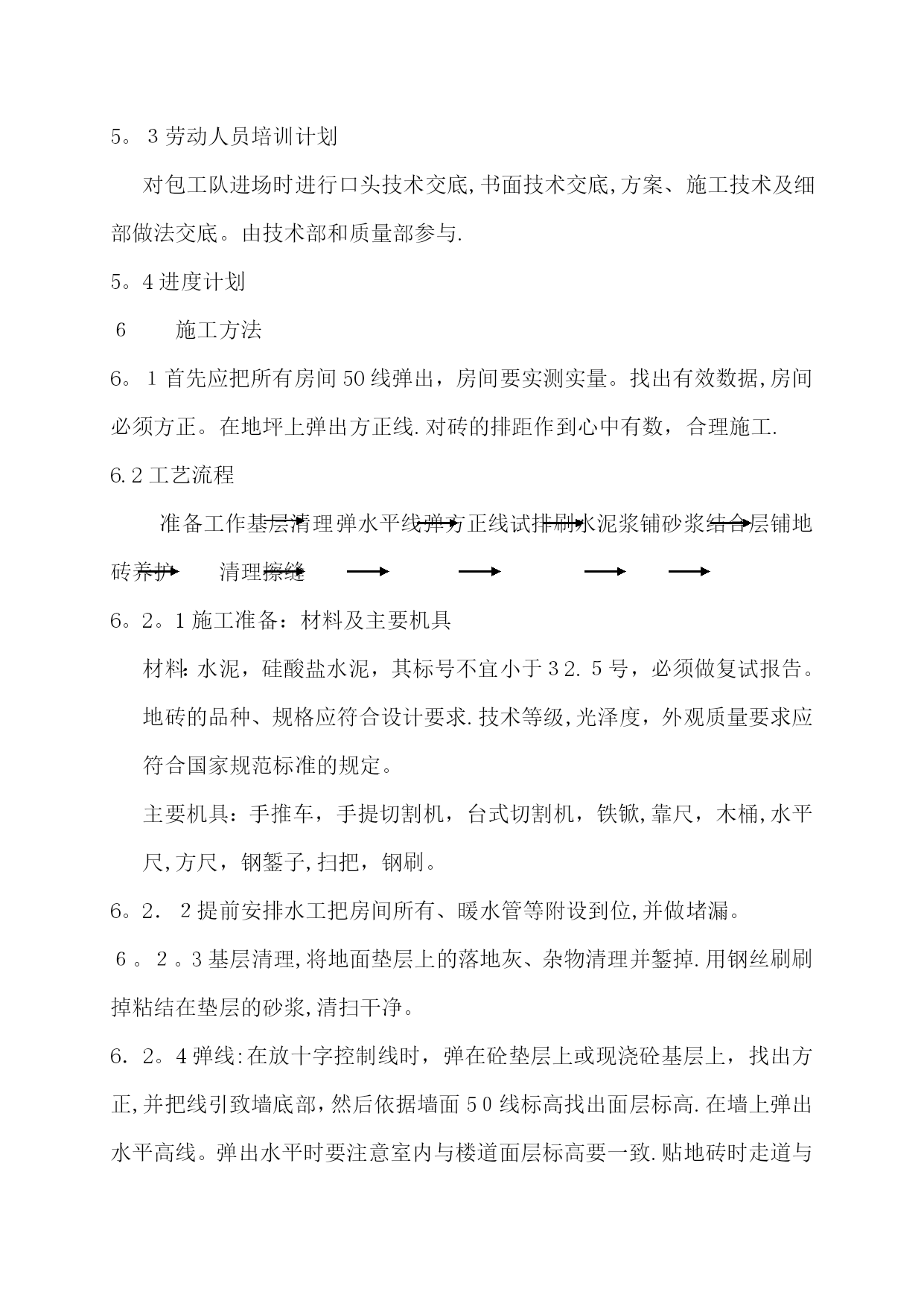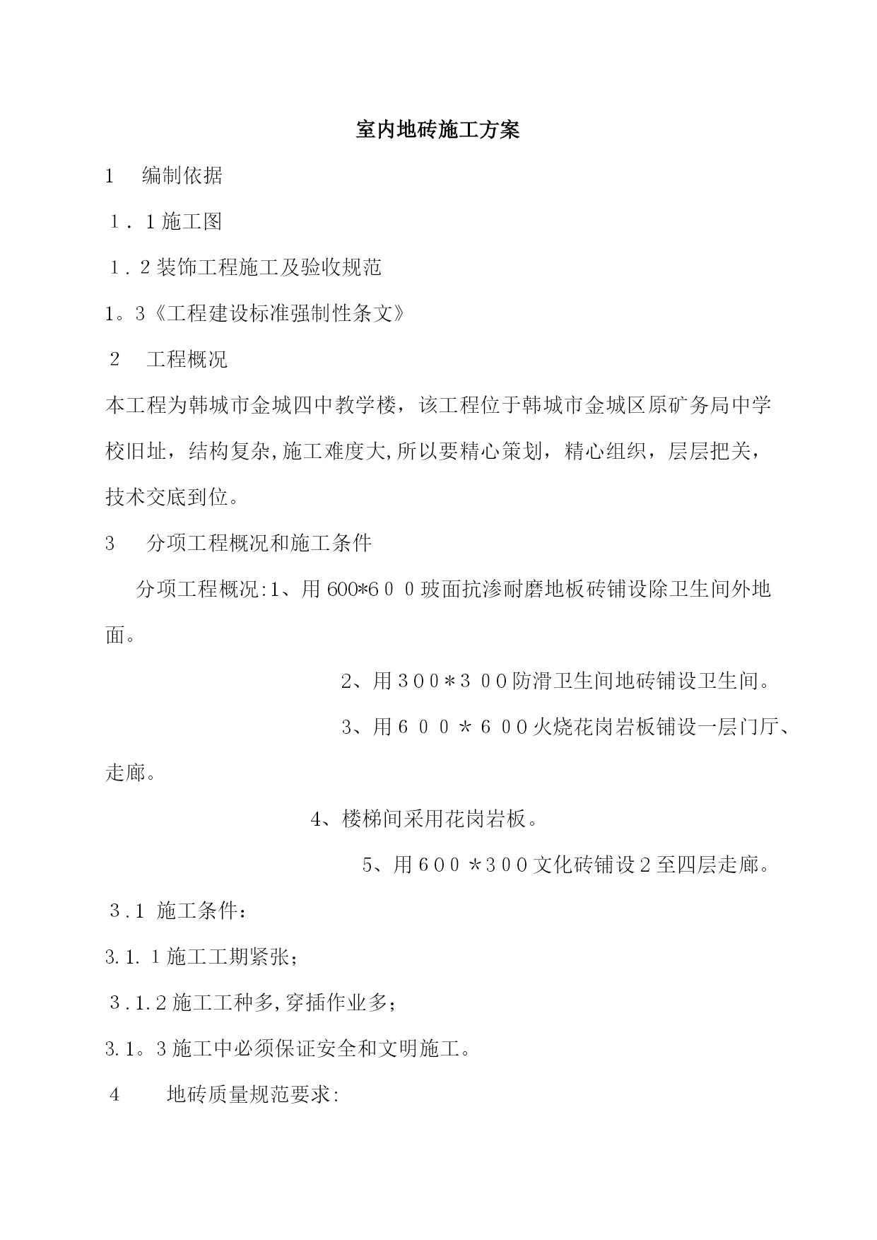 地砖铺贴砖施工合同2(完整资料)(可以直接使用,可编辑优秀版资料,欢迎下载)地砖铺贴砖施工合同甲方(全称):乙方(全称):经甲、乙双方协商,甲方将巴彦县龙庙镇中心小学教学楼工程的地砖,墙裙铺贴等分包给乙方施工。为明确甲、乙双方的责、权、利,确保工程的质量、进度、安全及文明生产,特定立本合同,供双方共同遵守执行.一、工程概况工程名称:巴彦县龙庙镇中心小学教学楼工程工作范围:室内地面和墙裙贴砖、卫生间墙砖、楼梯理石分项工程工期:2018年6月10日至2018年6月25日止二、承包方式和计费标准1.合同价格:⑴