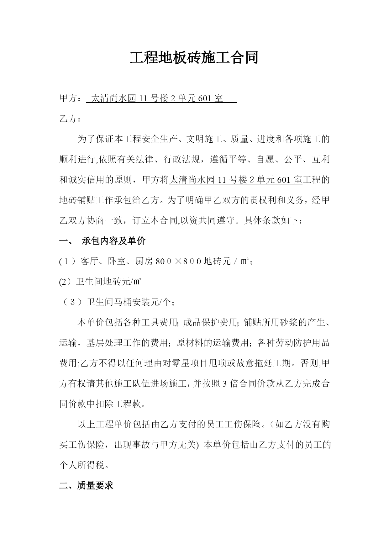 地砖施工合同(完整资料)(可以直接使用,可编辑优秀版资料,欢迎下载)工程地板砖施工合同甲方:太清尚水园11号楼2单元601室乙方:为了保证本工程安全生产、文明施工、质量、进度和各项施工的顺利进行,依照有关法律、行政法规,遵循平等、自愿、公平、互利和诚实信用的原则,甲方将太清尚水园11号楼2单元601室工程的地砖铺贴工作承包给乙方。为了明确甲乙双方的责权利和义务,经甲乙双方协商一致,订立本合同,以资共同遵守。具体条款如下:一、承包内容及单价(1)客厅、卧室、厨房800×800地砖元/㎡;(2)卫生间地砖元/