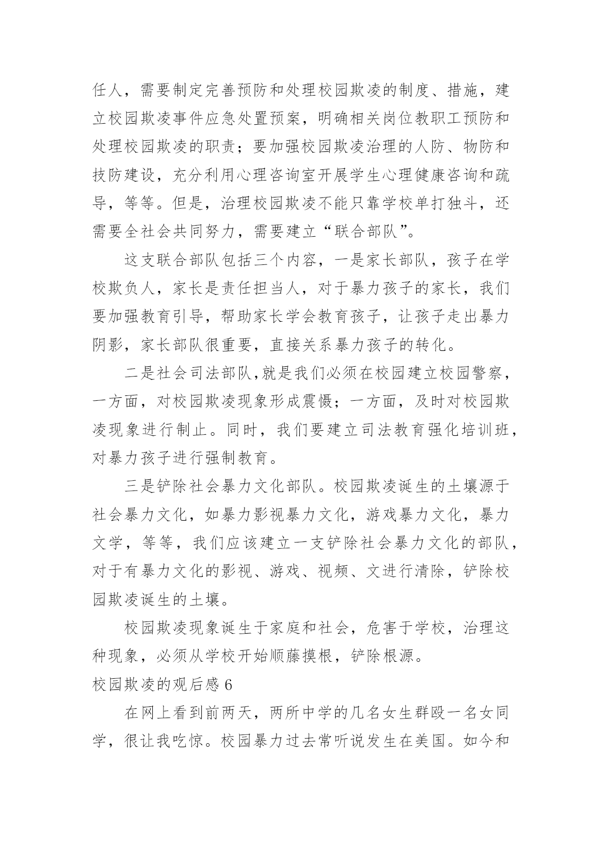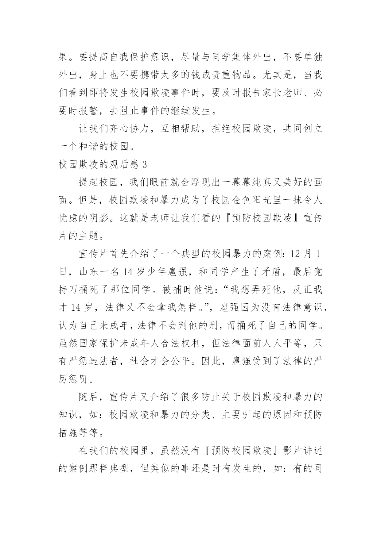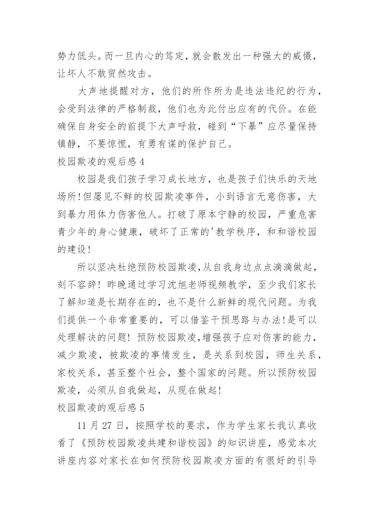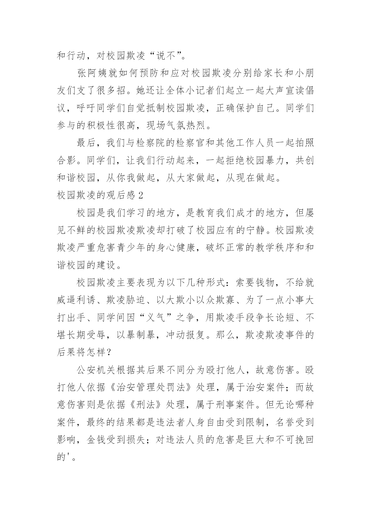 校园欺凌的观后感当品味完一部作品后,一定对生活有了新的感悟和看法吧,这时候最关键的观后感不能忘了。为了让您不再为写观后感头疼,以下是小编帮大家整理的校园欺凌的观后感,欢迎大家借鉴与参考,希望对大家有所帮助。校园欺凌的观后感1说起校园欺凌和暴力现象,这是一个沉重的话题。原本校园是我们学习的地方,是教育我们成才的地方。可是校园欺凌和暴力就像是美丽校园中的病毒,时时刻刻威胁着同学们的身心健康;打破了校园应有的宁静,破坏了正常的教学秩序和和谐校园的建设。我认为欺凌不应该被认为只是“成长的一部分。”它不但会伤害你的身体,还会使一颗纯净的心灵走向弯曲,使人精神受到痛苦折磨,严重时,还会威胁你身边人的生命安全。这不仅违背了中华几千年来的传统美德——友善,而且极其容易伤害到同学们的身心以及家庭。如果我们都能以“与人友善”的态度去处理学习和生活中各种各样的人际关系,那么我们的生活都会充满阳光。我认为远离校园欺凌,一定要学会宽容。同学们生活在一起,产生一点摩擦是正常的。在平时生活中,应该学会说:“对不起”。你可别小看这三个字,它的作用可大了,在处理同学关系时有着出奇的'效果。矛盾发生后,我们应该学会忍、包容、体谅他人,不能斤斤计较,应该让矛盾迅速化解,也就是人们常说的:“退一步海阔天空”。在威胁与暴力来临之际,首先告诉自己不要害怕。大声地提醒对方,他们的所作所为是违法违纪的行为,会受到法律纪律严厉的制裁,会为此付出应有的代价。同时迅速找到电话准备报警,或者大声呼喊求救。如果危险发生,可用自己的书包、扫把、凳子、桌子等物来挡,可以躲避受到的打击;若是隔壁班发生危险情况,要赶快关紧自己班级的门、窗,不让歹徒进来。如果受到伤害,一定要及时向老师、警察报案。任何时候须以保全生命为第一考虑。文明和秩序是任何一个社会,任何一个学校所必不可少的。我们都是祖国的花朵,自己这朵开得灿烂,也要让周围的花朵开得鲜艳,相互衬托,才能构成最美的风景。从我做起,抵制校园欺凌和暴力现象共建平安校园、书香校园、阳光校园,做一个讲文明、守纪律的宽容友善之人,共建我们友善和谐的校园!解后我才明白,原来语言上的攻击、给同学取侮辱性外号、集体排挤同学等等也都属于校园欺凌现象。听到这里,我脑海里突然浮现出一起起发生在我们身边的校园欺凌事件:我也曾经给同学取过外号,我们班几个同学也有联合起来侮辱过别班的几个同学……我不禁为我们做的这些校园欺凌事件惭愧起来,我还向爸爸妈妈保证以后我不再给同学取外号不再跟同学们一起侮辱别人了;如果看到同学被欺负,我也一定不退缩,要勇敢地报告老师,就像张阿姨告诉我们的一样,我们一定要有正义感,要有明确的态度和行动,对校园欺凌“说不”。张阿姨就如何预防和应对校园欺凌分别给家长和小朋友们支了很多招。她还让全体小记者们起立一起大声宣读倡议,呼吁同学们自觉抵制校园欺凌,正确保护自己。同学们参与的积极性很高,现场气氛热烈。最后,我们与检察院的检察官和其他工作人员一起拍照合影。同学们,让我们行动起来,一起拒绝校园暴力,共创和谐校园,从你我做起,从大家做起,从现在做起。校园欺凌的观后感2校园是我们学习的地方,是教育我们成才的地方,但屡见不鲜的校园欺凌欺凌却打破了校园应有的宁静。校园欺凌欺凌严重危害青少年的身心健康,破坏正常的教学秩序和和谐校园的建设。校园欺凌主要表现为以下几种形式:索要钱物,不给就威逼利诱、欺凌胁迫、以大欺小以众欺寡、为了一点小事大打出手、同学间因“义气”之争,用欺凌手段争长论短、不堪长期受辱,以暴制暴,冲动报复。那么,欺凌欺凌事件的后果将怎样?公安机关根据其后果不同分为殴打他人,故意伤害。殴打他人依据《治安管理处罚法》处理,属于治安案件;而故意伤害则是依据《刑法》处理,属于刑事案件。但无论哪种案件,最终的结果都是违法者人身自由受到限制,名誉受到影响,金钱受到损失;对违法人员的危害是巨大和不可挽回的'。第一、人身自由受到限制。受到拘留处罚的,要送拘留所执行。受到拘役和有期徒刑刑罚的,要在监狱或看守所服刑。第二、金钱受到损失。金钱损失主要包括罚款和赔偿两部分。殴打他人的依据《治安管理处罚法》的规定最高可处1000元罚款,故意伤害的依据《中华人民共和国刑法》要判处罚金。赔偿是指对受害人进行赔偿,项目包括医药费、护理费、营养费、误工费、交通费等。罚款(罚金)加上赔偿就是打架的金钱成本。第三、名誉受到损害。殴打他人依据《治安管理处罚法》的规定,根据情节的不同,违法人员要受到一日以上,十日以的下的行政拘留处罚;犯故意伤害罪,依据《中华人民共和国刑法》规定,根据伤害程度的不同,要受到拘役,管制和有期徒刑,案底将留存公安系统,在全国任何一台接入公安专网的计算机都能查到,这样必然对升学、工作及从事经济活动产生影响。校园,本该是一方净土、文明的殿堂。然而,同学之间因琐事引发