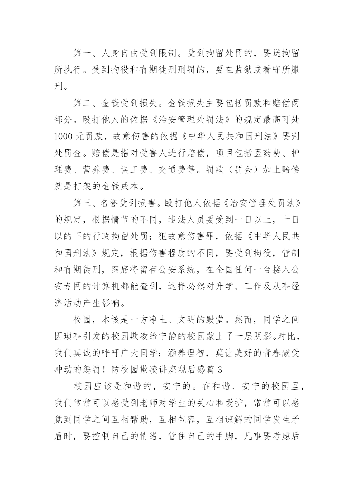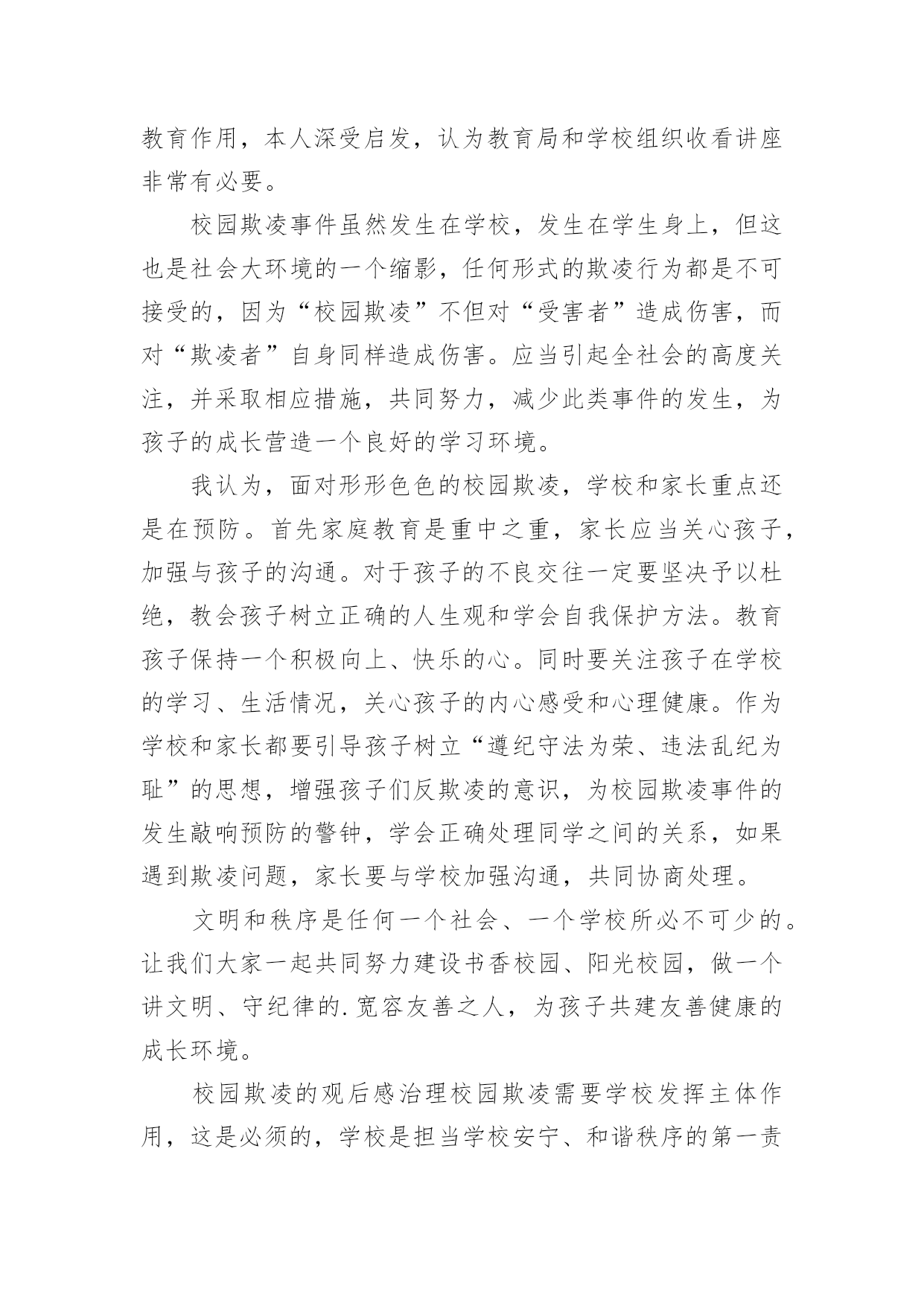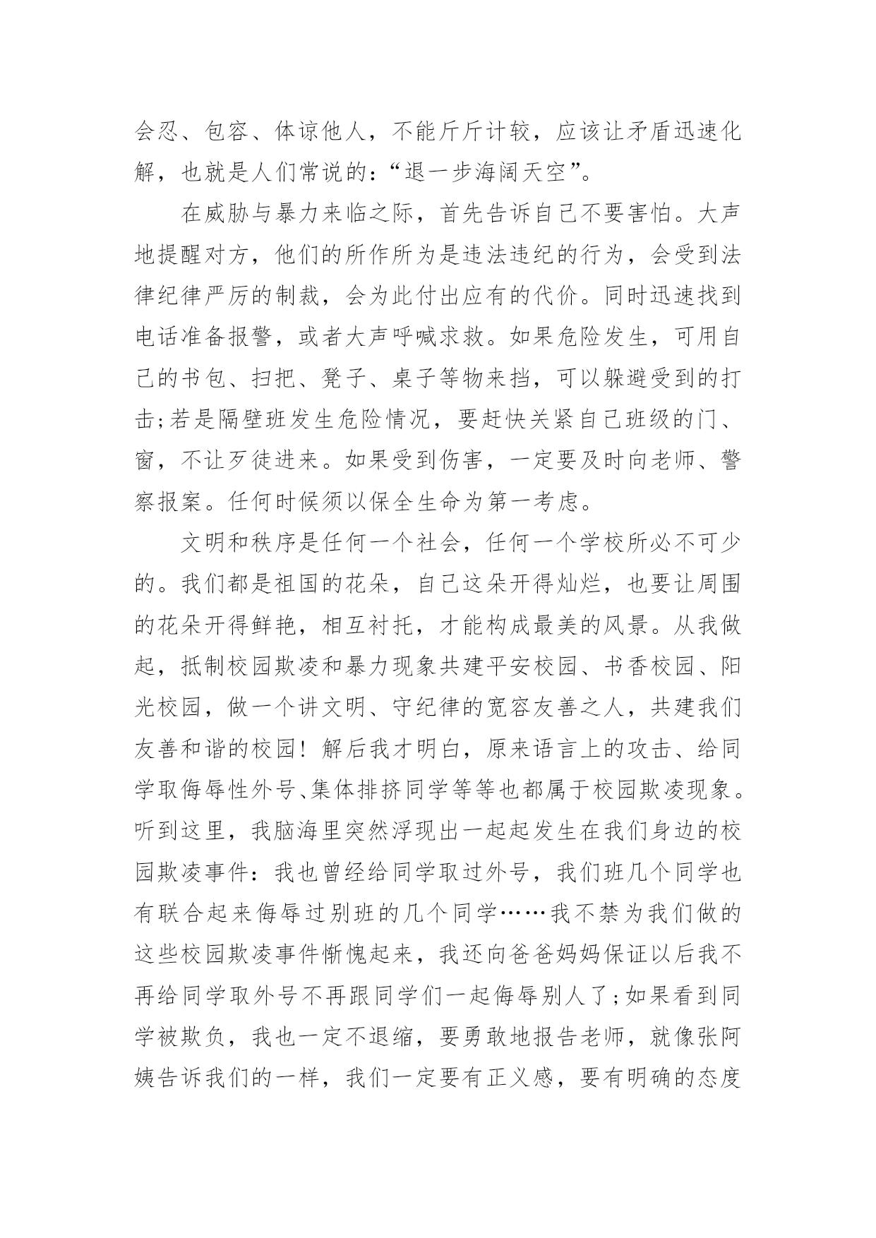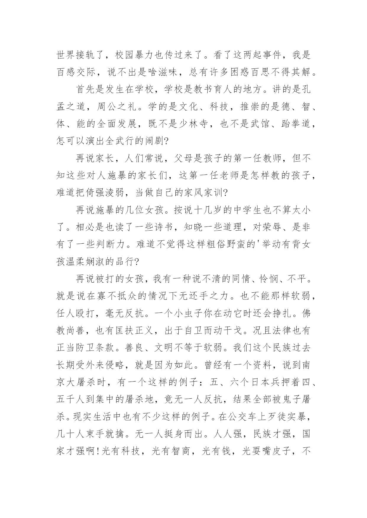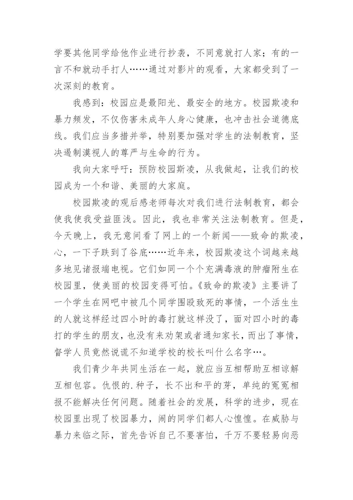 校园欺凌的观后感当品味完一部作品后,一定对生活有了新的感悟和看法吧,这时候最关键的观后感不能忘了。为了让您不再为写观后感头疼,以下是小编帮大家整理的校园欺凌的观后感,欢迎大家借鉴与参考,希望对大家有所帮助。校园欺凌的观后感1说起校园欺凌和暴力现象,这是一个沉重的话题。原本校园是我们学习的地方,是教育我们成才的地方。可是校园欺凌和暴力就像是美丽校园中的病毒,时时刻刻威胁着同学们的身心健康;打破了校园应有的宁静,破坏了正常的教学秩序和和谐校园的建设。我认为欺凌不应该被认为只是“成长的一部分。”它不但会伤害你的身体,还会使一颗纯净的心灵走向弯曲,使人精神受到痛苦折磨,严重时,还会威胁你身边人的生命安全。这不仅违背了中华几千年来的传统美德——友善,而且极其容易伤害到同学们的身心以及家庭。如果我们都能以“与人友善”的态度去处理学习和生活中各种各样的人际关系,那么我们的生活都会充满阳光。我认为远离校园欺凌,一定要学会宽容。同学们生活在一起,产生一点摩擦是正常的。在平时生活中,应该学会说:“对不起”。你可别小看这三个字,它的作用可大了,在处理同学关系时有着出奇的'效果。矛盾发生后,我们应该学会忍、包容、体谅他人,不能斤斤计较,应该让矛盾迅速化解,也就是人们常说的:“退一步海阔天空”。在威胁与暴力来临之际,首先告诉自己不要害怕。大声地提醒对方,他们的所作所为是违法违纪的行为,会受到法律纪律严厉的制裁,会为此付出应有的代价。同时迅速找到电话准备报警,或者大声呼喊求救。如果危险发生,可用自己的书包、扫把、凳子、桌子等物来挡,可以躲避受到的打击;若是隔壁班发生危险情况,要赶快关紧自己班级的门、窗,不让歹徒进来。如果受到伤害,一定要及时向老师、警察报案。任何时候须以保全生命为第一考虑。文明和秩序是任何一个社会,任何一个学校所必不可少的。我们都是祖国的花朵,自己这朵开得灿烂,也要让周围的花朵开得鲜艳,相互衬托,才能构成最美的风景。从我做起,抵制校园欺凌和暴力现象共建平安校园、书香校园、阳光校园,做一个讲文明、守纪律的宽容友善之人,共建我们友善和谐的校园!解后我才明白,原来语言上的攻击、给同学取侮辱性外号、集体排挤同学等等也都属于校园欺凌现象。听到这里,我脑海里突然浮现出一起起发生在我们身边的校园欺凌事件:我也曾经给同学取过外号,我们班几个同学也有联合起来侮辱过别班的几个同学……我不禁为我们做的这些校园欺凌事件惭愧起来,我还向爸爸妈妈保证以后我不再给同学取外号不再跟同学们一起侮辱别人了;如果看到同学被欺负,我也一定不退缩,要勇敢地报告老师,就像张阿姨告诉我们的一样,我们一定要有正义感,要有明确的态度和行动,对校园欺凌“说不”。张阿姨就如何预防和应对校园欺凌分别给家长和小朋友们支了很多招。她还让全体小记者们起立一起大声宣读倡议,呼吁同学们自觉抵制校园欺凌,正确保护自己。同学们参与的积极性很高,现场气氛热烈。最后,我们与检察院的检察官和其他工作人员一起拍照合影。同学们,让我们行动起来,一起拒绝校园暴力,共创和谐校园,从你我做起,从大家做起,从现在做起。校园欺凌的观后感2校园是我们学习的地方,是教育我们成才的地方,但屡见不鲜的校园欺凌欺凌却打破了校园应有的宁静。校园欺凌欺凌严重危害青少年的身心健康,破坏正常的教学秩序和和谐校园的建设。校园欺凌主要表现为以下几种形式:索要钱物,不给就威逼利诱、欺凌胁迫、以大欺小以众欺寡、为了一点小事大打出手、同学间因“义气”之争,用欺凌手段争长论短、不堪长期受辱,以暴制暴,冲动报复。那么,欺凌欺凌事件的后果将怎样?公安机关根据其后果不同分为殴打他人,故意伤害。殴打他人依据《治安管理处罚法》处理,属于治安案件;而故意伤害则是依据《刑法》处理,属于刑事案件。但无论哪种案件,最终的结果都是违法者人身自由受到限制,名誉受到影响,金钱受到损失;对违法人员的危害是巨大和不可挽回的'。第一、人身自由受到限制。受到拘留处罚的,要送拘留所执行。受到拘役和有期徒刑刑罚的,要在监狱或看守所服刑。第二、金钱受到损失。金钱损失主要包括罚款和赔偿两部分。殴打他人的依据《治安管理处罚法》的规定最高可处1000元罚款,故意伤害的依据《中华人民共和国刑法》要判处罚金。赔偿是指对受害人进行赔偿,项目包括医药费、护理费、营养费、误工费、交通费等。罚款(罚金)加上赔偿就是打架的金钱成本。第三、名誉受到损害。殴打他人依据《治安管理处罚法》的规定,根据情节的不同,违法人员要受到一日以上,十日以的下的行政拘留处罚;犯故意伤害罪,依据《中华人民共和国刑法》规定,根据伤害程度的不同,要受到拘役,管制和有期徒刑,案底将留存公安系统,在全国任何一台接入公安专网的计算机都能查到,这样必然对升学、工作及从事经济活动产生影响。校园,本该是一方净土、文明的殿堂。然而,同学之间因琐事引发