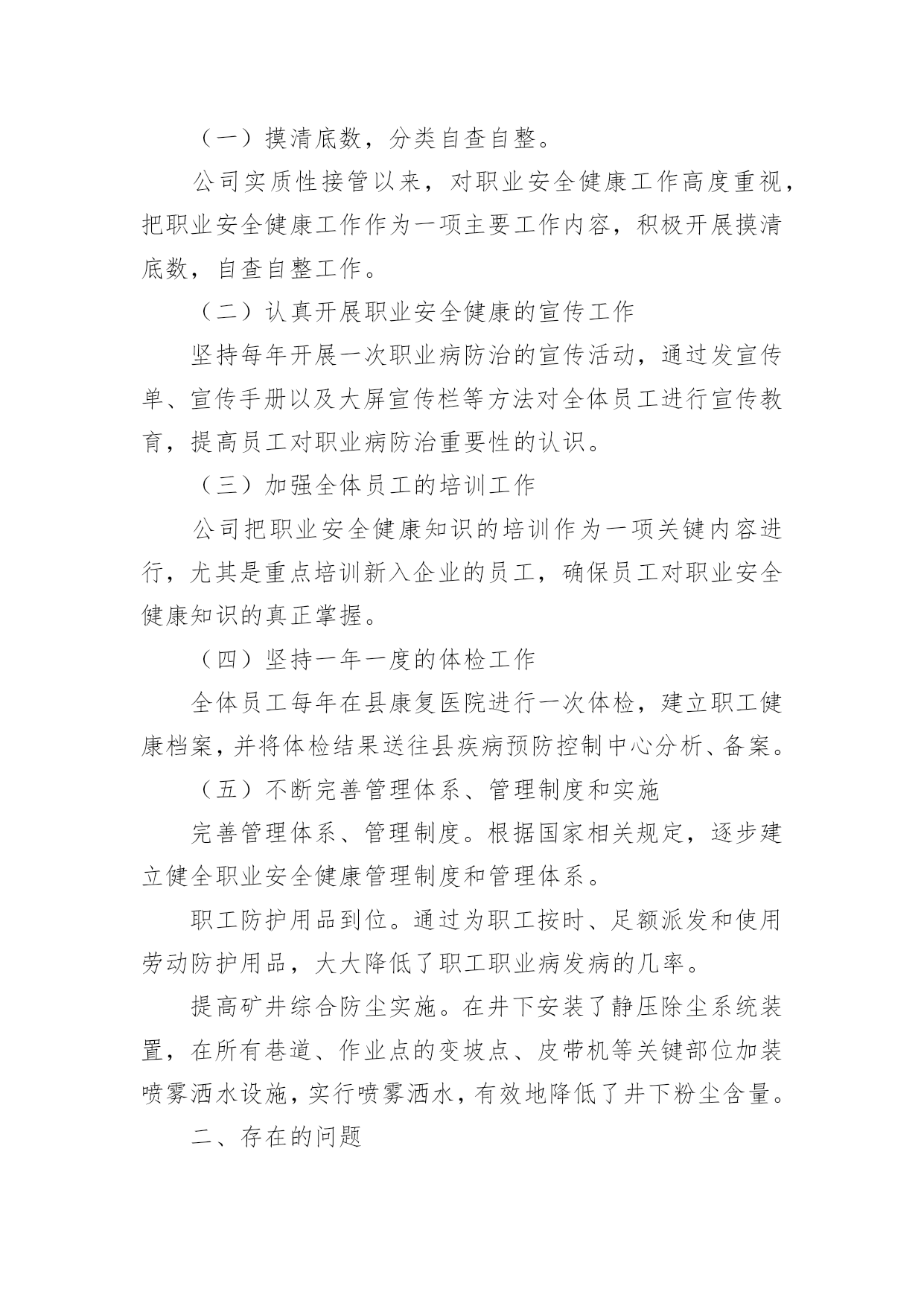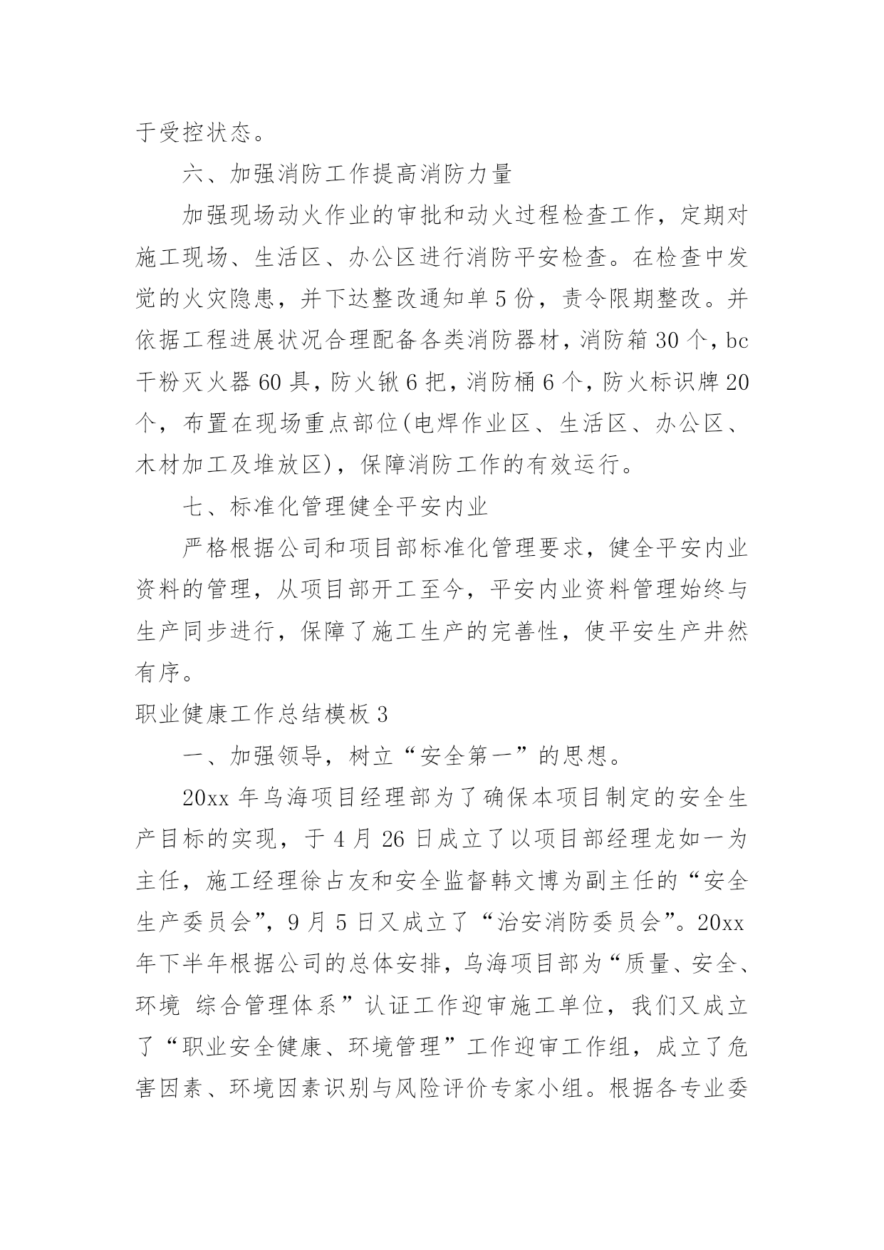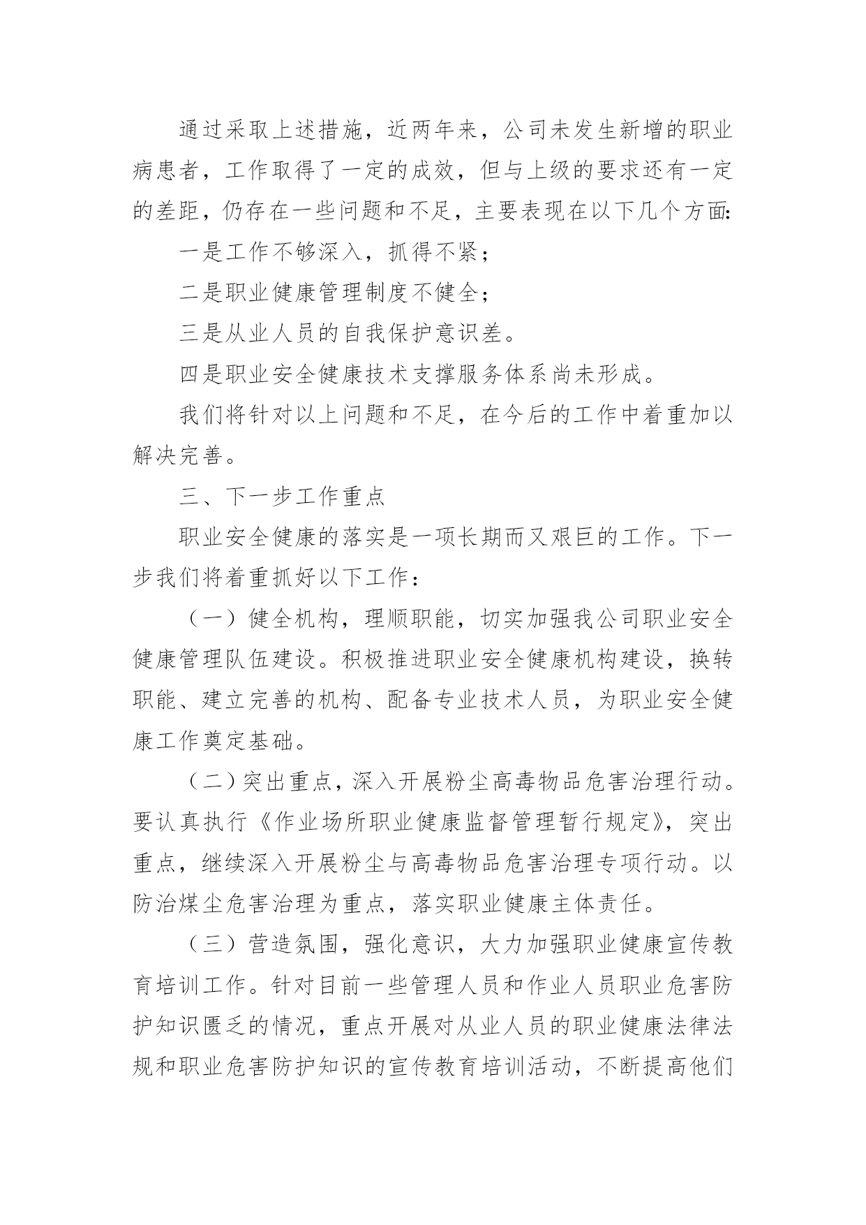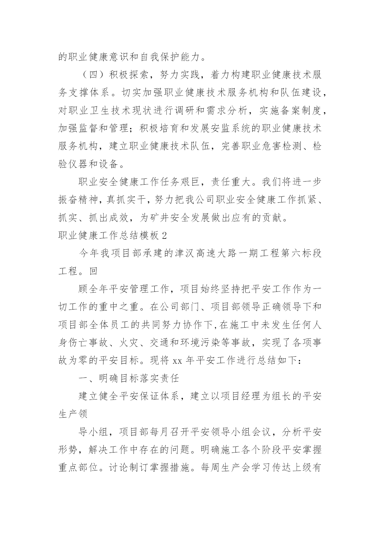 职业健康工作总结职业健康工作总结模板总结是指社会团体、企业单位和个人在自身的某一时期、某一项目或某些工作告一段落或者全部完成后进行回顾检查、分析评价,从而肯定成绩,得到经验,找出差距,得出教训和一些规律性认识的一种书面材料,它可以帮助我们有寻找学习和工作中的规律,让我们一起来学习写总结吧。总结你想好怎么写了吗?以下是小编收集整理的职业健康工作总结模板,供大家参考借鉴,希望可以帮助到有需要的朋友。职业健康工作总结模板1公司认真贯彻落实科学发展观,坚持安全发展的科学理念和构建社会主义和谐社会的要求。以保护煤矿职工职业健康为目的,全面贯彻落实“安全第一、预防为主、综合治理”的安全生产方针,以防治煤矿尘肺为重点,全面提高煤矿企业职业健康水平,打造本质安全型矿井。整合重组以来,公司把改善作业环境、强化员工职业的健康作为重点工作,对职业病防治的宣传、培训管理体系的建立、个体防护设施的配备、以及防尘措施等方面认真进行落实,职业病防治取得了明显的效果,为矿井人员营造一个安全、健康的工作环境,下面将工作推进情况汇报如下:一、主要工作情况(一)摸清底数,分类自查自整。公司实质性接管以来,对职业安全健康工作高度重视,把职业安全健康工作作为一项主要工作内容,积极开展摸清底数,自查自整工作。(二)认真开展职业安全健康的宣传工作坚持每年开展一次职业病防治的宣传活动,通过发宣传单、宣传手册以及大屏宣传栏等方法对全体员工进行宣传教育,提高员工对职业病防治重要性的认识。(三)加强全体员工的培训工作公司把职业安全健康知识的培训作为一项关键内容进行,尤其是重点培训新入企业的员工,确保员工对职业安全健康知识的真正掌握。(四)坚持一年一度的体检工作全体员工每年在县康复医院进行一次体检,建立职工健康档案,并将体检结果送往县疾病预防控制中心分析、备案。(五)不断完善管理体系、管理制度和实施完善管理体系、管理制度。根据国家相关规定,逐步建立健全职业安全健康管理制度和管理体系。职工防护用品到位。通过为职工按时、足额派发和使用劳动防护用品,大大降低了职工职业病发病的几率。提高矿井综合防尘实施。在井下安装了静压除尘系统装置,在所有巷道、作业点的变坡点、皮带机等关键部位加装喷雾洒水设施,实行喷雾洒水,有效地降低了井下粉尘含量。二、存在的问题通过采取上述措施,近两年来,公司未发生新增的职业病患者,工作取得了一定的成效,但与上级的要求还有一定的差距,仍存在一些问题和不足,主要表现在以下几个方面:一是工作不够深入,抓得不紧;二是职业健康管理制度不健全;三是从业人员的自我保护意识差。四是职业安全健康技术支撑服务体系尚未形成。我们将针对以上问题和不足,在今后的工作中着重加以解决完善。三、下一步工作重点职业安全健康的落实是一项长期而又艰巨的工作。下一步我们将着重抓好以下工作:(一)健全机构,理顺职能,切实加强我公司职业安全健康管理队伍建设。积极推进职业安全健康机构建设,换转职能、建立完善的机构、配备专业技术人员,为职业安全健康工作奠定基础。(二)突出重点,深入开展粉尘高毒物品危害治理行动。要认真执行《作业场所职业健康监督管理暂行规定》,突出重点,继续深入开展粉尘与高毒物品危害治理专项行动。以防治煤尘危害治理为重点,落实职业健康主体责任。(三)营造氛围,强化意识,大力加强职业健康宣传教育培训工作。针对目前一些管理人员和作业人员职业危害防护知识匮乏的情况,重点开展对从业人员的职业健康法律法规和职业危害防护知识的宣传教育培训活动,不断提高他们的职业健康意识和自我保护能力。(四)积极探索,努力实践,着力构建职业健康技术服务支撑体系。切实加强职业健康技术服务机构和队伍建设,对职业卫生技术现状进行调研和需求分析,实施备案制度,加强监督和管理;积极培育和发展安监系统的职业健康技术服务机构,建立职业健康技术队伍,完善职业危害检测、检验仪器和设备。职业安全健康工作任务艰巨,责任重大。我们将进一步振奋精神,真抓实干,努力把我公司职业安全健康工作抓紧、抓实、抓出成效,为矿井安全发展做出应有的贡献。职业健康工作总结模板2今年我项目部承建的津汉高速大路一期工程第六标段工程。回顾全年平安管理工作,项目始终坚持把平安工作作为一切工作的重中之重。在公司部门、项目部领导正确领导下和项目部全体员工的共同努力协作下,在施工中未发生任何人身伤亡事故、火灾、交通和环境污染等事故,实现了各项事故为零的平安目标。现将xx年平安工作进行总结如下:一、明确目标落实责任建立健全平安保证体系,建立以项目经理为组长的平安生产领导小组,项目部每月召开平安领导小组会议,分析平安形势,解决工作中存在的问题。明确施工各个阶段平安掌握重点部位。讨论制订掌握措施。每周生产会学习传达上级有关平安文件,讲评平安生产状况。平安部门根据公司项目部管理规定,逐级制定