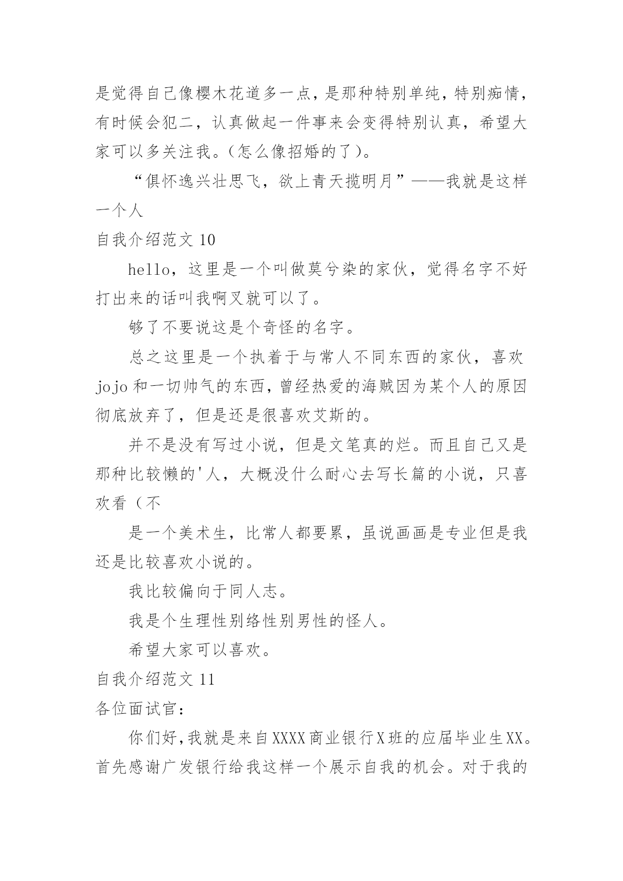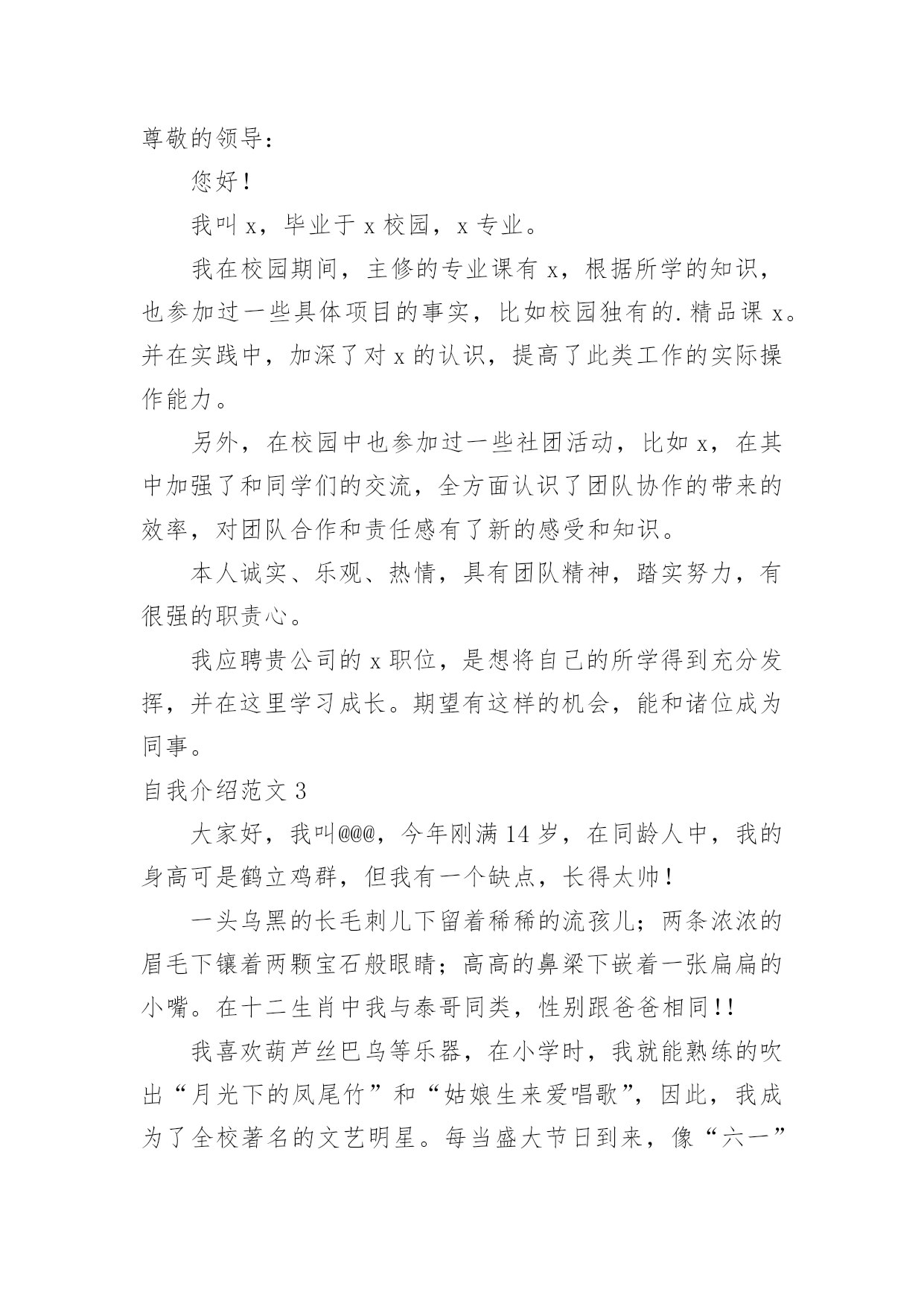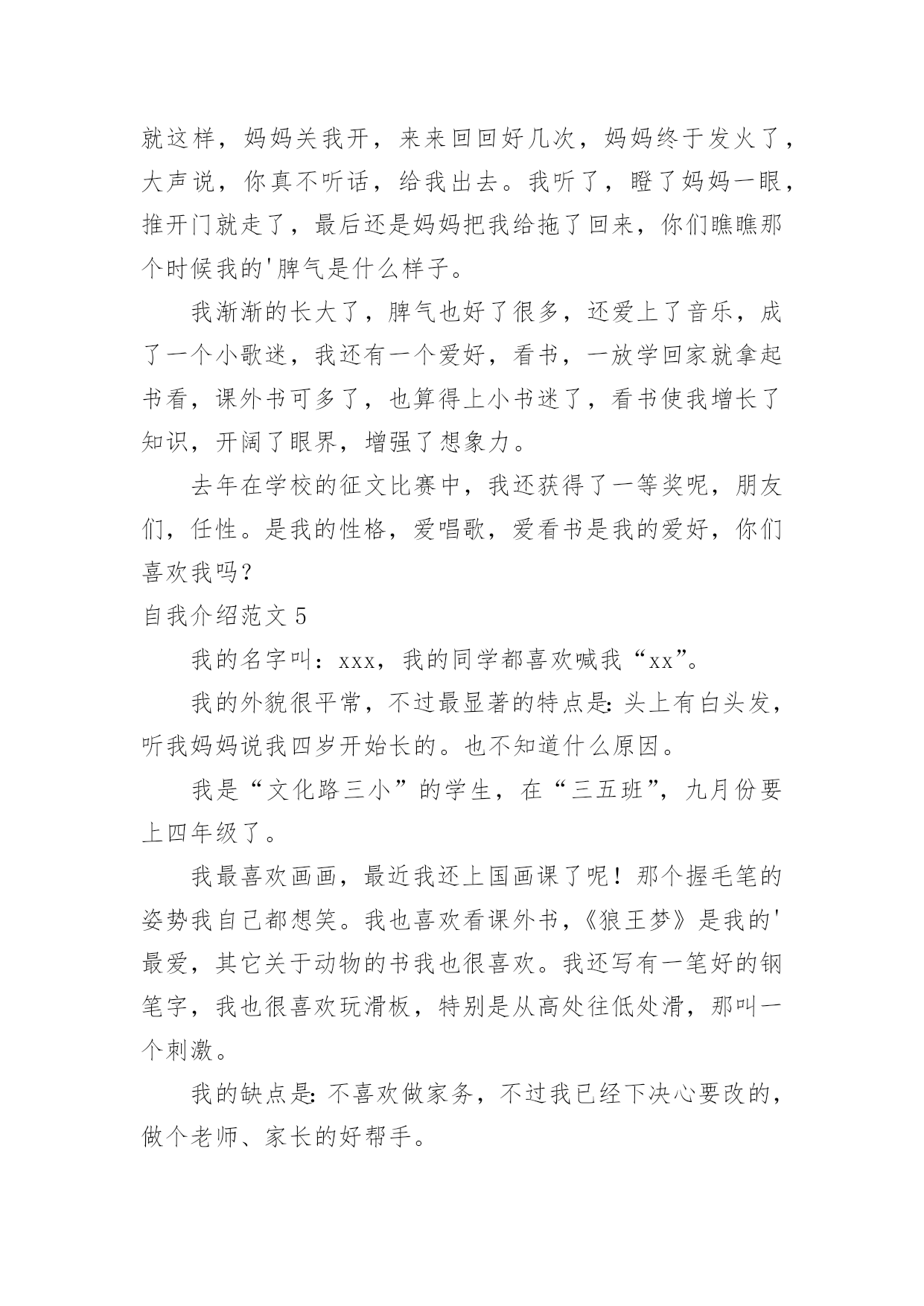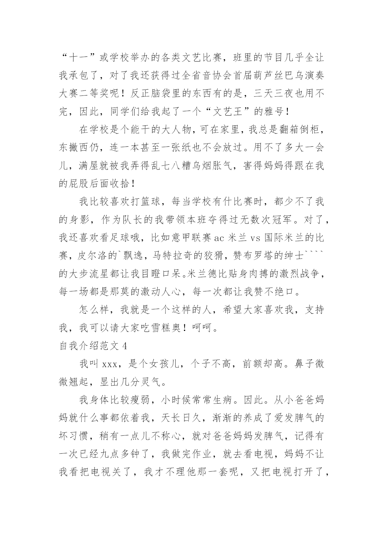 自我介绍自我介绍范文当来到的一个陌生的地方时,通常需要用到自我介绍,自我介绍可以给陌生人留下一个好的印象。那要怎么写好自我介绍呢?以下是小编帮大家整理的自我介绍范文,欢迎大家借鉴与参考,希望对大家有所帮助。自我介绍范文1我站在镜子面前,瞧,镜子里出现了一个普通小学生的形象,一条乌黑的小辫子,垂直在脑袋后面,一双不大的眼睛闪烁着光芒,脸上长着许多小痘痘,我微微一笑,露出不太整齐的小白牙,充满了对生活的热爱,这就是我。我很爱读书,像侦探故事,安徒生童话,校园小说等等都是我的宝贝,我常常被这些宝贝中的情节人物所着迷有一天妈妈给我买了,一本安徒生童话选,我高兴极了,拿起书坐在沙发上津津有味地看了起来,当我看到两个坏商人被一位聪明的老人捉弄时,我开心的.笑了;当我看到坏巫婆被青年巧治时,我为青年感到高兴。同时,我也嫉妒青年的聪明,欣赏青年勤于动脑的好习惯。当我看到小红帽,被大灰狼欺骗时,我为小红帽感到伤心。看这就是我欢迎大家和我交朋友。自我介绍范文2尊敬的领导:您好!我叫x,毕业于x校园,x专业。我在校园期间,主修的专业课有x,根据所学的知识,也参加过一些具体项目的事实,比如校园独有的.精品课x。并在实践中,加深了对x的认识,提高了此类工作的实际操作能力。另外,在校园中也参加过一些社团活动,比如x,在其中加强了和同学们的交流,全方面认识了团队协作的带来的效率,对团队合作和责任感有了新的感受和知识。本人诚实、乐观、热情,具有团队精神,踏实努力,有很强的职责心。我应聘贵公司的x职位,是想将自己的所学得到充分发挥,并在这里学习成长。期望有这样的机会,能和诸位成为同事。自我介绍范文3大家好,我叫@@@,今年刚满14岁,在同龄人中,我的身高可是鹤立鸡群,但我有一个缺点,长得太帅!一头乌黑的长毛刺儿下留着稀稀的流孩儿;两条浓浓的眉毛下镶着两颗宝石般眼睛;高高的鼻梁下嵌着一张扁扁的小嘴。在十二生肖中我与泰哥同类,性别跟爸爸相同!!我喜欢葫芦丝巴乌等乐器,在小学时,我就能熟练的吹出“月光下的凤尾竹”和“姑娘生来爱唱歌”,因此,我成为了全校著名的文艺明星。每当盛大节日到来,像“六一”“十一”或学校举办的各类文艺比赛,班里的节目几乎全让我承包了,对了我还获得过全省音协会首届葫芦丝巴乌演奏大赛二等奖呢!反正脑袋里的东西有的是,三天三夜也用不完,因此,同学们给我起了一个“文艺王”的雅号!在学校是个能干的大人物,可在家里,我总是翻箱倒柜,东撇西仍,连一本甚至一张纸也不会放过。用不了多大一会儿,满屋就被我弄得乱七八糟乌烟胀气,害得妈妈得跟在我的屁股后面收拾!我比较喜欢打篮球,每当学校有什比赛时,都少不了我的身影,作为队长的我带领本班夺得过无数次冠军。对了,我还喜欢看足球哦,比如意甲联赛ac米兰vs国际米兰的比赛,皮尔洛的`飘逸,马特拉奇的狡猾,赞布罗塔的绅士````的大步流星都让我目瞪口呆。米兰德比贴身肉搏的激烈战争,每一场都是那莫的激动人心,每一次都让我赞不绝口。怎么样,我就是一个这样的人,希望大家喜欢我,支持我,我可以请大家吃雪糕奥!呵呵。自我介绍范文4我叫xxx,是个女孩儿,个子不高,前额却高。鼻子微微翘起,显出几分灵气。我身体比较瘦弱,小时候常常生病。因此。从小爸爸妈妈就什么事都依着我,天长日久,渐渐的养成了爱发脾气的坏习惯,稍有一点儿不称心,就对爸爸妈妈发脾气,记得有一次已经九点多钟了,我做完作业,就去看电视,妈妈不让我看把电视关了,我才不理他那一套呢,又把电视打开了,就这样,妈妈关我开,来来回回好几次,妈妈终于发火了,大声说,你真不听话,给我出去。我听了,瞪了妈妈一眼,推开门就走了,最后还是妈妈把我给拖了回来,你们瞧瞧那个时候我的'脾气是什么样子。我渐渐的长大了,脾气也好了很多,还爱上了音乐,成了一个小歌迷,我还有一个爱好,看书,一放学回家就拿起书看,课外书可多了,也算得上小书迷了,看书使我增长了知识,开阔了眼界,增强了想象力。去年在学校的征文比赛中,我还获得了一等奖呢,朋友们,任性。是我的性格,爱唱歌,爱看书是我的爱好,你们喜欢我吗?自我介绍范文5我的名字叫:xxx,我的同学都喜欢喊我“xx”。我的外貌很平常,不过最显著的特点是:头上有白头发,听我妈妈说我四岁开始长的。也不知道什么原因。我是“文化路三小”的学生,在“三五班”,九月份要上四年级了。我最喜欢画画,最近我还上国画课了呢!那个握毛笔的姿势我自己都想笑。我也喜欢看课外书,《狼王梦》是我的'最爱,其它关于动物的书我也很喜欢。我还写有一笔好的钢笔字,我也很喜欢玩滑板,特别是从高处往低处滑,那叫一个刺激。我的缺点是:不喜欢做家务,不过我已经下决心要改的,做个老师、家长的好帮手。我的愿望是:当一位画家,把我的画遍布世界。我最喜欢的颜色:蓝色,我的衣服大部分也是蓝色的。我还有一个妹妹,她很调皮哟!即
