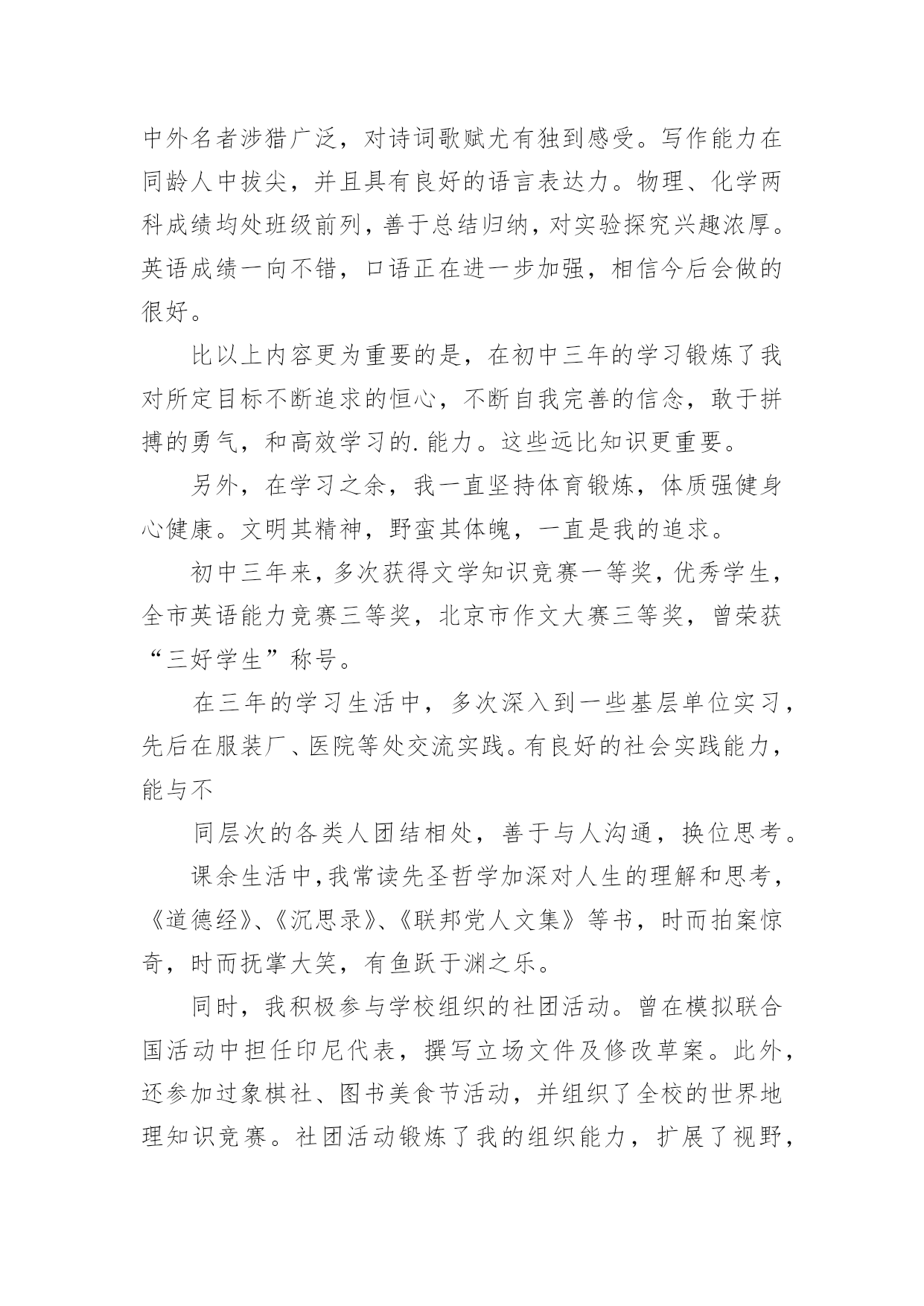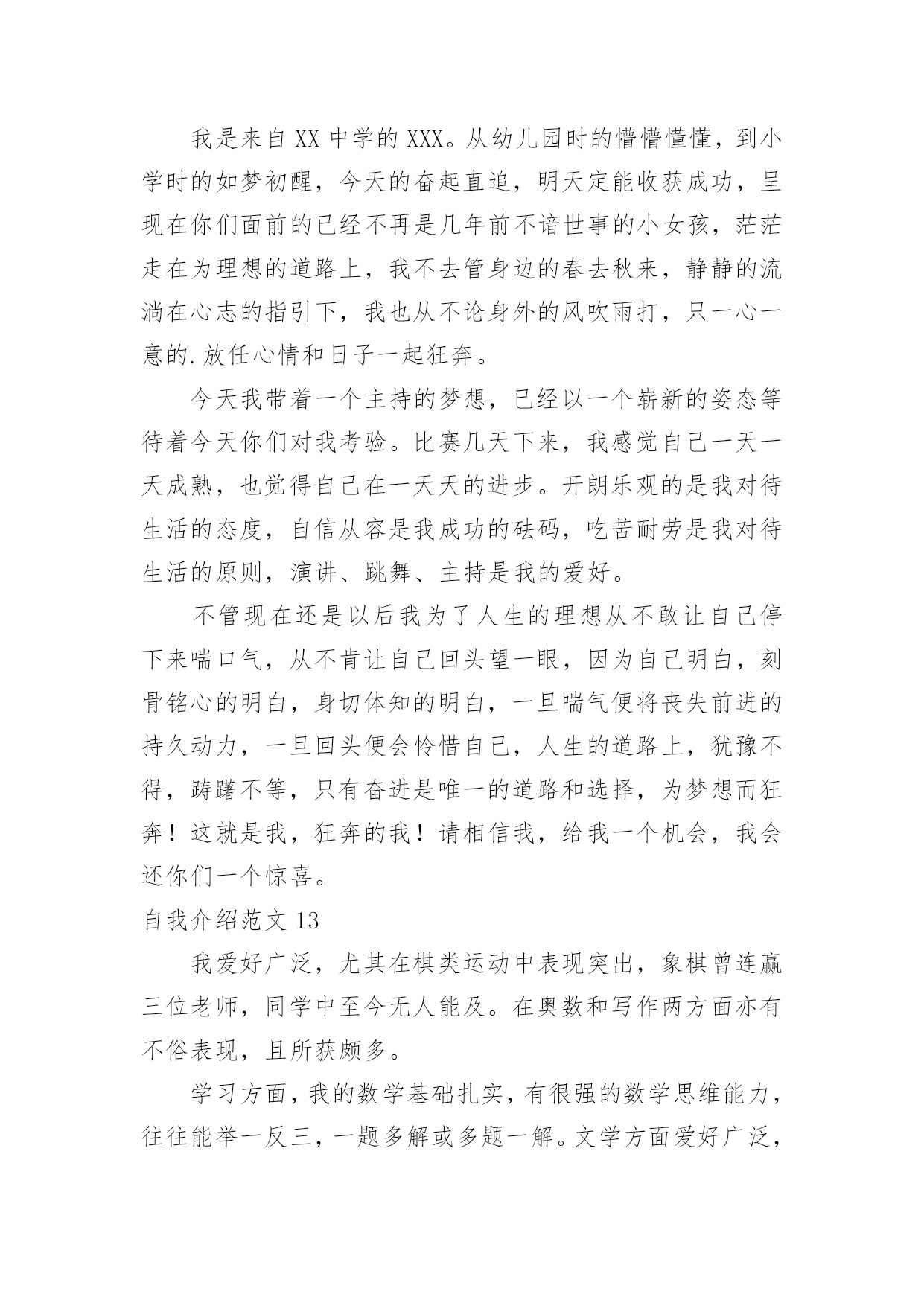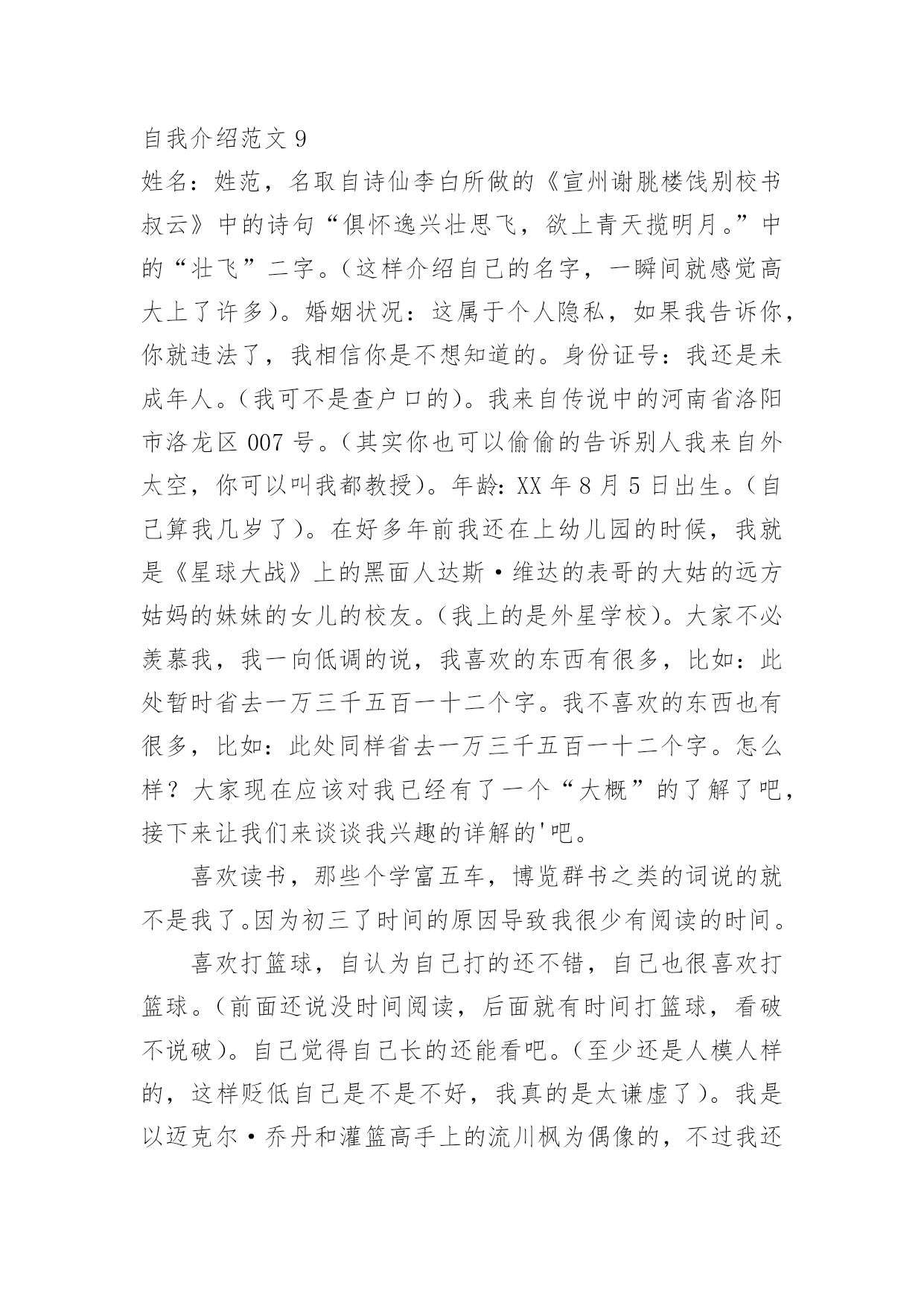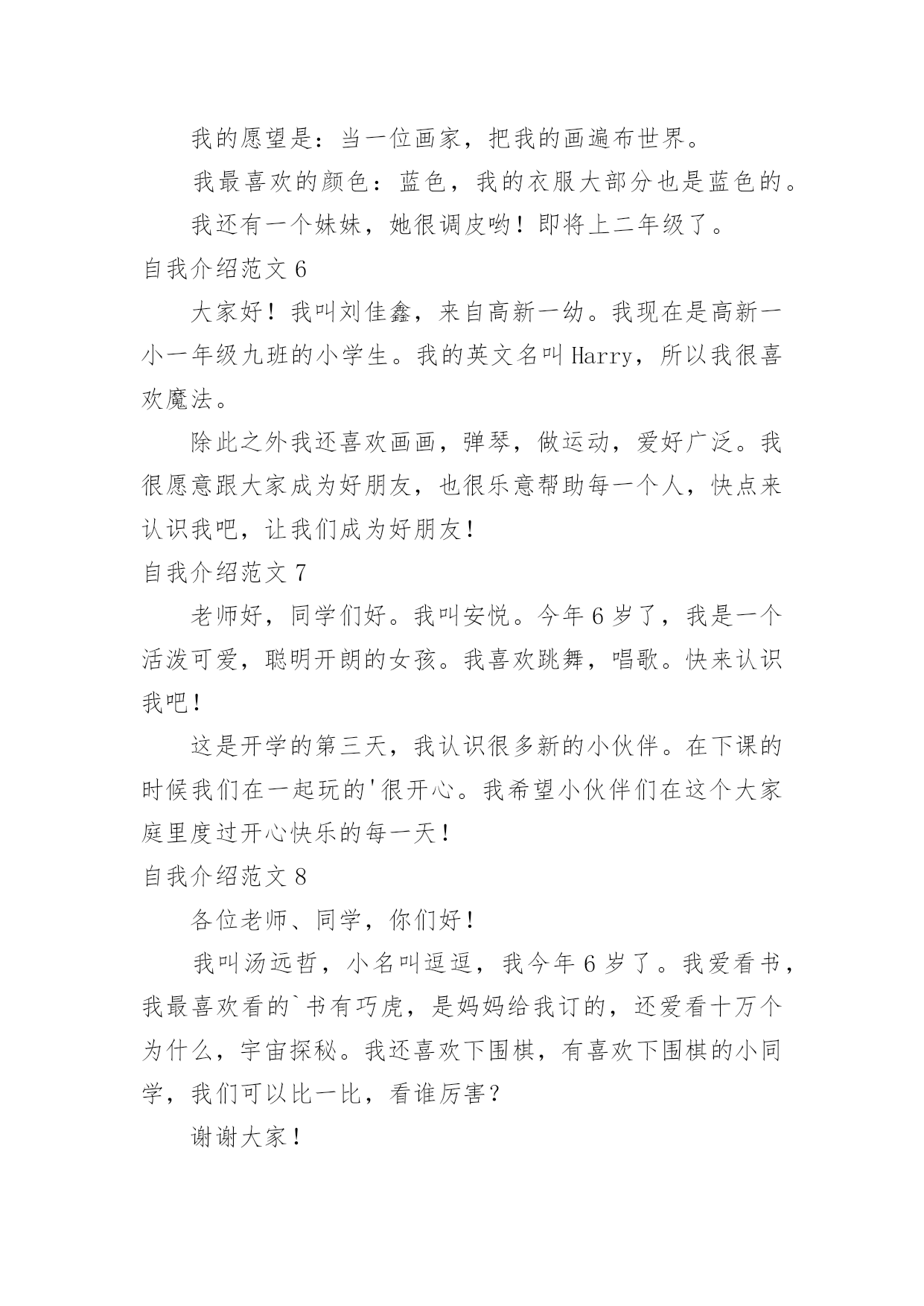 自我介绍自我介绍范文当来到的一个陌生的地方时,通常需要用到自我介绍,自我介绍可以给陌生人留下一个好的印象。那要怎么写好自我介绍呢?以下是小编帮大家整理的自我介绍范文,欢迎大家借鉴与参考,希望对大家有所帮助。自我介绍范文1我站在镜子面前,瞧,镜子里出现了一个普通小学生的形象,一条乌黑的小辫子,垂直在脑袋后面,一双不大的眼睛闪烁着光芒,脸上长着许多小痘痘,我微微一笑,露出不太整齐的小白牙,充满了对生活的热爱,这就是我。我很爱读书,像侦探故事,安徒生童话,校园小说等等都是我的宝贝,我常常被这些宝贝中的情节人物所着迷有一天妈妈给我买了,一本安徒生童话选,我高兴极了,拿起书坐在沙发上津津有味地看了起来,当我看到两个坏商人被一位聪明的老人捉弄时,我开心的.笑了;当我看到坏巫婆被青年巧治时,我为青年感到高兴。同时,我也嫉妒青年的聪明,欣赏青年勤于动脑的好习惯。当我看到小红帽,被大灰狼欺骗时,我为小红帽感到伤心。看这就是我欢迎大家和我交朋友。自我介绍范文2尊敬的领导:您好!我叫x,毕业于x校园,x专业。我在校园期间,主修的专业课有x,根据所学的知识,也参加过一些具体项目的事实,比如校园独有的.精品课x。并在实践中,加深了对x的认识,提高了此类工作的实际操作能力。另外,在校园中也参加过一些社团活动,比如x,在其中加强了和同学们的交流,全方面认识了团队协作的带来的效率,对团队合作和责任感有了新的感受和知识。本人诚实、乐观、热情,具有团队精神,踏实努力,有很强的职责心。我应聘贵公司的x职位,是想将自己的所学得到充分发挥,并在这里学习成长。期望有这样的机会,能和诸位成为同事。自我介绍范文3大家好,我叫@@@,今年刚满14岁,在同龄人中,我的身高可是鹤立鸡群,但我有一个缺点,长得太帅!一头乌黑的长毛刺儿下留着稀稀的流孩儿;两条浓浓的眉毛下镶着两颗宝石般眼睛;高高的鼻梁下嵌着一张扁扁的小嘴。在十二生肖中我与泰哥同类,性别跟爸爸相同!!我喜欢葫芦丝巴乌等乐器,在小学时,我就能熟练的吹出“月光下的凤尾竹”和“姑娘生来爱唱歌”,因此,我成为了全校著名的文艺明星。每当盛大节日到来,像“六一”“十一”或学校举办的各类文艺比赛,班里的节目几乎全让我承包了,对了我还获得过全省音协会首届葫芦丝巴乌演奏大赛二等奖呢!反正脑袋里的东西有的是,三天三夜也用不完,因此,同学们给我起了一个“文艺王”的雅号!在学校是个能干的大人物,可在家里,我总是翻箱倒柜,东撇西仍,连一本甚至一张纸也不会放过。用不了多大一会儿,满屋就被我弄得乱七八糟乌烟胀气,害得妈妈得跟在我的屁股后面收拾!我比较喜欢打篮球,每当学校有什比赛时,都少不了我的身影,作为队长的我带领本班夺得过无数次冠军。对了,我还喜欢看足球哦,比如意甲联赛ac米兰vs国际米兰的比赛,皮尔洛的`飘逸,马特拉奇的狡猾,赞布罗塔的绅士````的大步流星都让我目瞪口呆。米兰德比贴身肉搏的激烈战争,每一场都是那莫的激动人心,每一次都让我赞不绝口。怎么样,我就是一个这样的人,希望大家喜欢我,支持我,我可以请大家吃雪糕奥!呵呵。自我介绍范文4我叫xxx,是个女孩儿,个子不高,前额却高。鼻子微微翘起,显出几分灵气。我身体比较瘦弱,小时候常常生病。因此。从小爸爸妈妈就什么事都依着我,天长日久,渐渐的养成了爱发脾气的坏习惯,稍有一点儿不称心,就对爸爸妈妈发脾气,记得有一次已经九点多钟了,我做完作业,就去看电视,妈妈不让我看把电视关了,我才不理他那一套呢,又把电视打开了,就这样,妈妈关我开,来来回回好几次,妈妈终于发火了,大声说,你真不听话,给我出去。我听了,瞪了妈妈一眼,推开门就走了,最后还是妈妈把我给拖了回来,你们瞧瞧那个时候我的'脾气是什么样子。我渐渐的长大了,脾气也好了很多,还爱上了音乐,成了一个小歌迷,我还有一个爱好,看书,一放学回家就拿起书看,课外书可多了,也算得上小书迷了,看书使我增长了知识,开阔了眼界,增强了想象力。去年在学校的征文比赛中,我还获得了一等奖呢,朋友们,任性。是我的性格,爱唱歌,爱看书是我的爱好,你们喜欢我吗?自我介绍范文5我的名字叫:xxx,我的同学都喜欢喊我“xx”。我的外貌很平常,不过最显著的特点是:头上有白头发,听我妈妈说我四岁开始长的。也不知道什么原因。我是“文化路三小”的学生,在“三五班”,九月份要上四年级了。我最喜欢画画,最近我还上国画课了呢!那个握毛笔的姿势我自己都想笑。我也喜欢看课外书,《狼王梦》是我的'最爱,其它关于动物的书我也很喜欢。我还写有一笔好的钢笔字,我也很喜欢玩滑板,特别是从高处往低处滑,那叫一个刺激。我的缺点是:不喜欢做家务,不过我已经下决心要改的,做个老师、家长的好帮手。我的愿望是:当一位画家,把我的画遍布世界。我最喜欢的颜色:蓝色,我的衣服大部分也是蓝色的。我还有一个妹妹,她很调皮哟!即