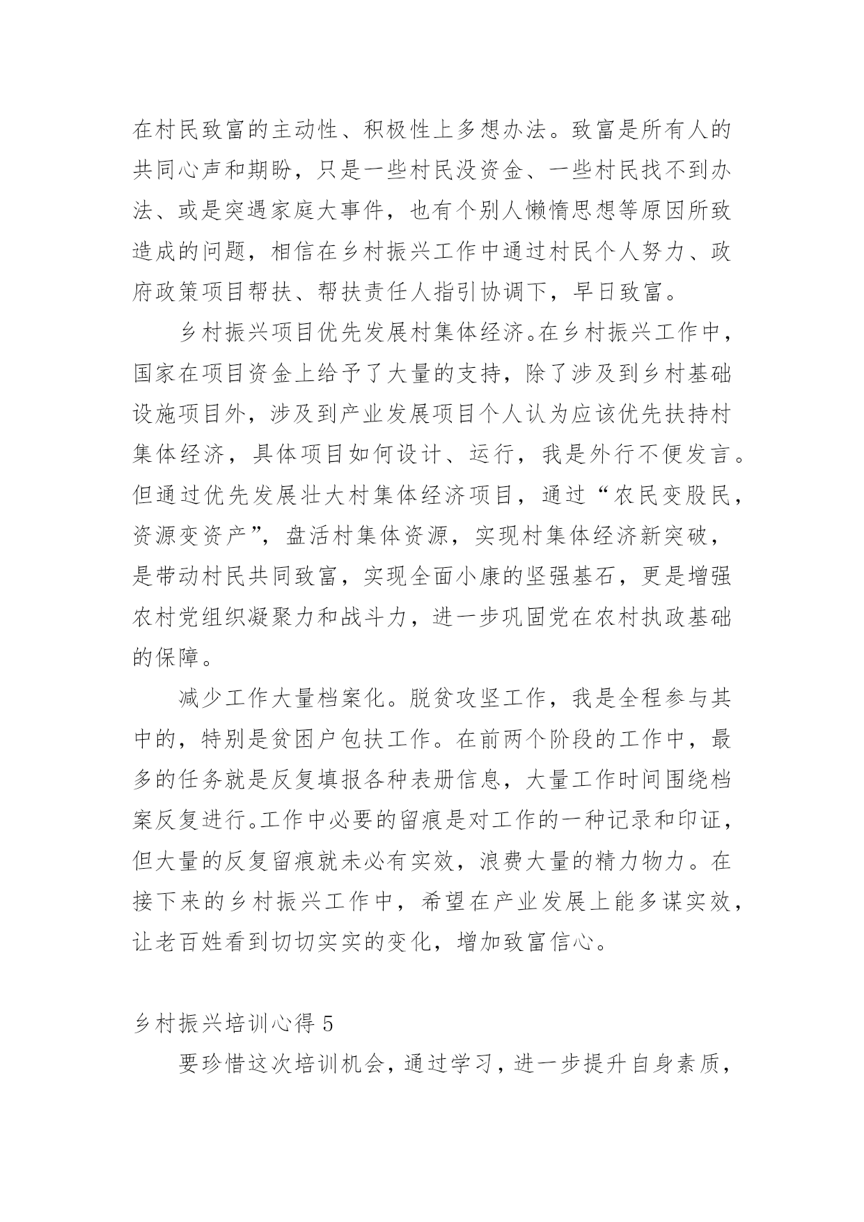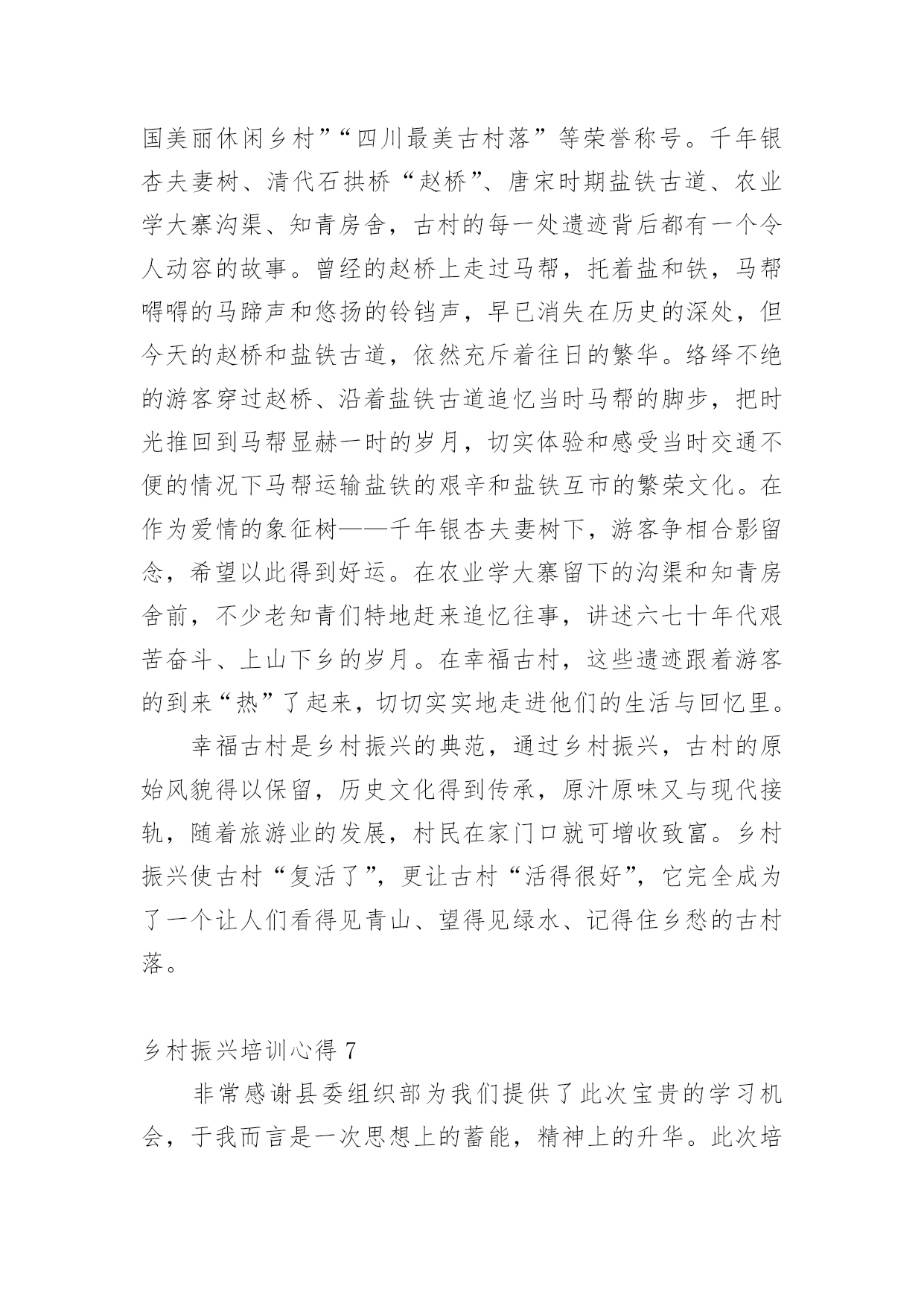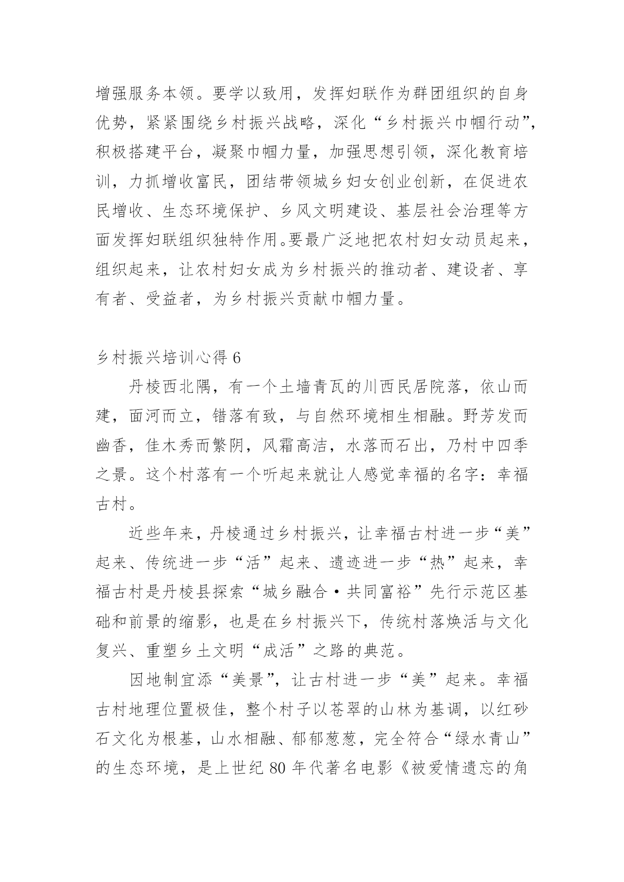乡村振兴培训心得心中有不少心得体会时,写心得体会是一个不错的选择,这样就可以通过不断总结,丰富我们的思想。那么要如何写呢?下面是小编收集整理的乡村振兴培训心得,欢迎阅读,希望大家能够喜欢。乡村振兴培训心得1听完北京大学彭峰教授的关于乡村振兴的讲座——艺术乡建,感触还挺深的,他所讲述的方向与视角与我们风景园林有些相关,都是从一些艺术的'角度来讲述乡村振兴。往往我们所理解的乡村振兴只是一些政府的政策,帮扶贫困人民摆脱贫困,但是没有给他们留下一点精神层面的东西。而艺术乡建给予了人们精神上的振兴,虽然做法与成效不是瞬间让大家所接受的,但是于民来说却是足以影响世世代代,子子孙孙的。它所赋予的不仅仅是精神层面,更像是时代的产物,也是时间、政策的印记。它的存在告诉后代,曾经贫穷困苦过,不代表一直都是这样,总有一天能够振兴起来。回首过去,展望未来,更是在激励后代把自己的家乡建设得更美好,记住过去才能更好地成就未来!乡村振兴培训心得2党建引领扶贫新模式通过抓好党建促脱贫攻坚,切实把握了党建工作与脱贫攻坚的内在联系,坚持问题导向,抓住关键,聚焦重点,真正把党建资源转化为扶贫资源、把党建优势转化为脱贫优势、把党建活力转化为脱贫攻坚动力。突出党建示范引领作用,推动党建与精准扶贫工作深度融合,相互促进,积极探索脱贫攻坚模式,能较好地解决贫困地区发展产业的资金诉求问题。在新时代加强基层党组织建设、全力实施乡村振兴的战略背景下,党建引领扶贫的新模式有进一步完善和复制推广的空间。调优干部结构按照“选优配强”的原则,强化基层党组织建设,选派文化素质高、年轻优秀的致富带头人、返乡党员、退伍军人等担任村党支部书记。创新党组织设置方式,通过在产业链、合作社、集体经济组织、生产小组上建立党组织等方式,不断延伸党组织和党的工作有效覆盖,促进“抱团发展、联动脱贫”,解决村支“两委”作风软、效率低、不作为的问题。提升干部能力采取集中轮训、示范培训、外出考察等形式,对村干部实行全覆盖式培训,拓宽村干部视野,逐步提高村干部队伍的服务意识、大局意识、协作意识和发展意识,提升村干部带领致富、带头脱贫的能力和本领。同时,建立健全基层干部脱贫任务考核机制,把“软任务”变成“硬指标”,确保学有实效、学以致用。压实干部责任严格制度落实,层层压实责任,坚持标准不降、程序不减、要求不变,从严从实落实“三会一课”、民主评议党员等党内政治生活制度,不断提高基层党员干部的政治觉悟、理论水平和业务能力,不断增强党员千部的全局观念和抓落实的'意识,提升党组织的凝聚力、战斗力、创造力。培育特色产业基层党组织应加强与地方金融法人协作,积极扶持本地特色龙头企业做大做强,通过“公司十合作社十农户(贫困户)十基地”的经营管理模式,建立利益联结机制,让贫困户搭上企业的“快车”脱贫致富。农商银行要向贫困户发放扶贫小额信用贷款,让其投资入股专业合作社,这样既化解了企业融资难、融资贵问题,又通过利益联接机制让贫困户凭借股份获取稳定收入。要结合贫困户流转土地、企业雇用贫困户劳力等,推出配套帮扶措施,实现产业发展带动农户增收的“造血式”脱贫。凝聚攻坚合力积极探索各级党组织结对共建,通过贫困村同城镇居委会、贫困村同企业、贫困村同社会组织结对等多种共建模式,为脱贫攻坚带来新资源、输入新血液、汇聚新力量。特别是要在推进扶贫劳务协作中充分发挥党组织作用,建立完善外出务工人员返乡创业和本地贫困户职业技能培训机制,切实提高农村劳务本地消化能力和就业脱贫覆盖面及成效。要大力培育先进典型,精准提炼工作模式,做好重大典型、先进经验的宣传和推广,充分发挥党建示范引领作用。同时,加大党组织激励关怀力度,开展脱贫攻坚党内表彰,对脱贫攻坚中表现突出、符合条件的优秀党员干部加大培养使用力度;对扶贫一线干部的思想动态加强跟踪了解,帮助其解决实际困难,激励党员干部在脱贫攻坚一线苦干实干、担当作为,决战脱贫攻坚。乡村振兴培训心得3实施乡村振兴战略,必须始终把解决好“三农”问题作为全党工作重中之重,坚持农业农村优先发展。应历史地、辩证地认识“三农”问题,任何时候都不能忘记农业、农村、农民为国家独立、民族解放、改革开放和国家工业化、城镇化、现代化所作出的重大贡献和牺牲。实施乡村振兴战略,必须坚持“四个优先”:在干部配备上优先考虑,即选拔一批懂农业、爱农村、爱农民的好干部去推动乡村振兴工作。在要素配置上优先满足,即重点破除体制机制障碍,完善农业农村发展用地保障机制,解决土地增值收益长期“取之于农、用之于城”的问题,解决“农村的`地自己用不上、用不好”的困局,让农业农村能够公平公正地享有更多发展资源。在资金投入上优先保障,即创新投融资机制,加快形成财政优先保障、金融重点倾斜、社会积极参与的多元投入格局。完善财政支农投入稳定增长机制,坚持把农业农村作为财政支出的优