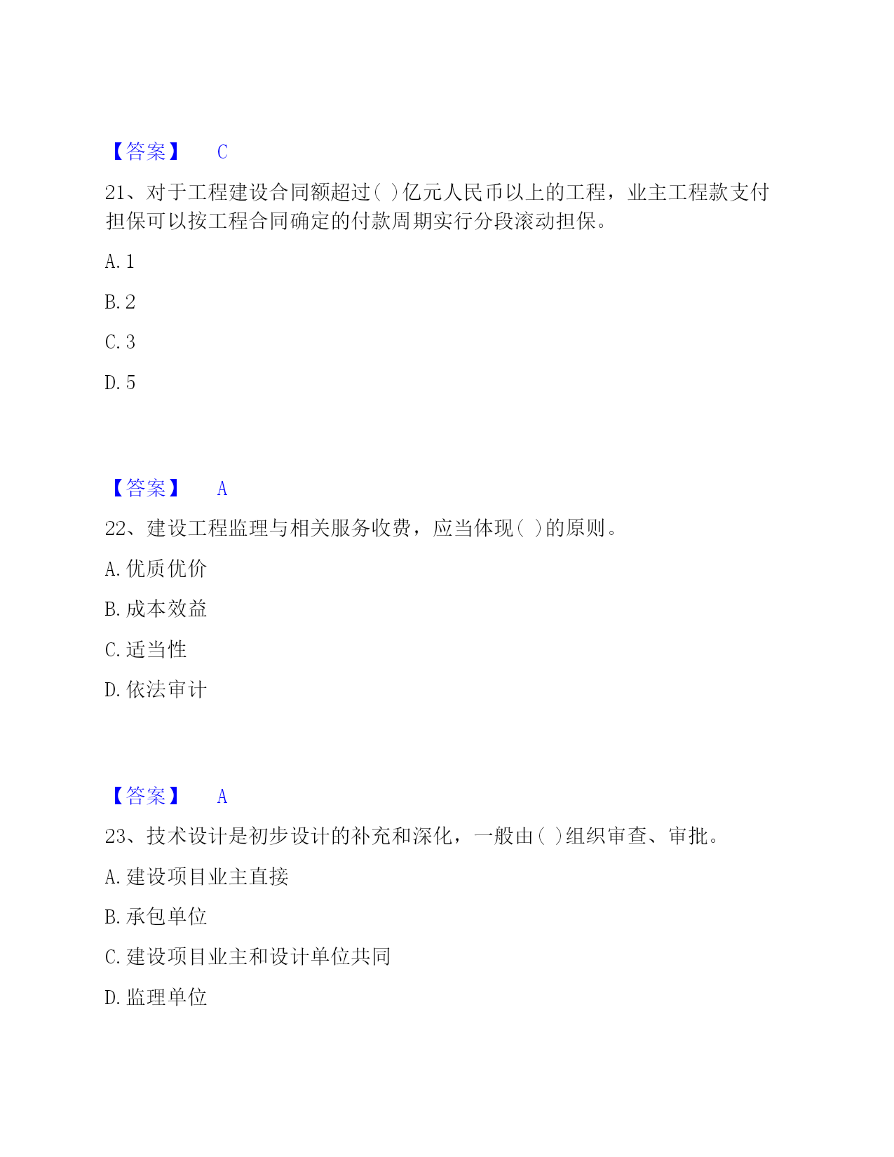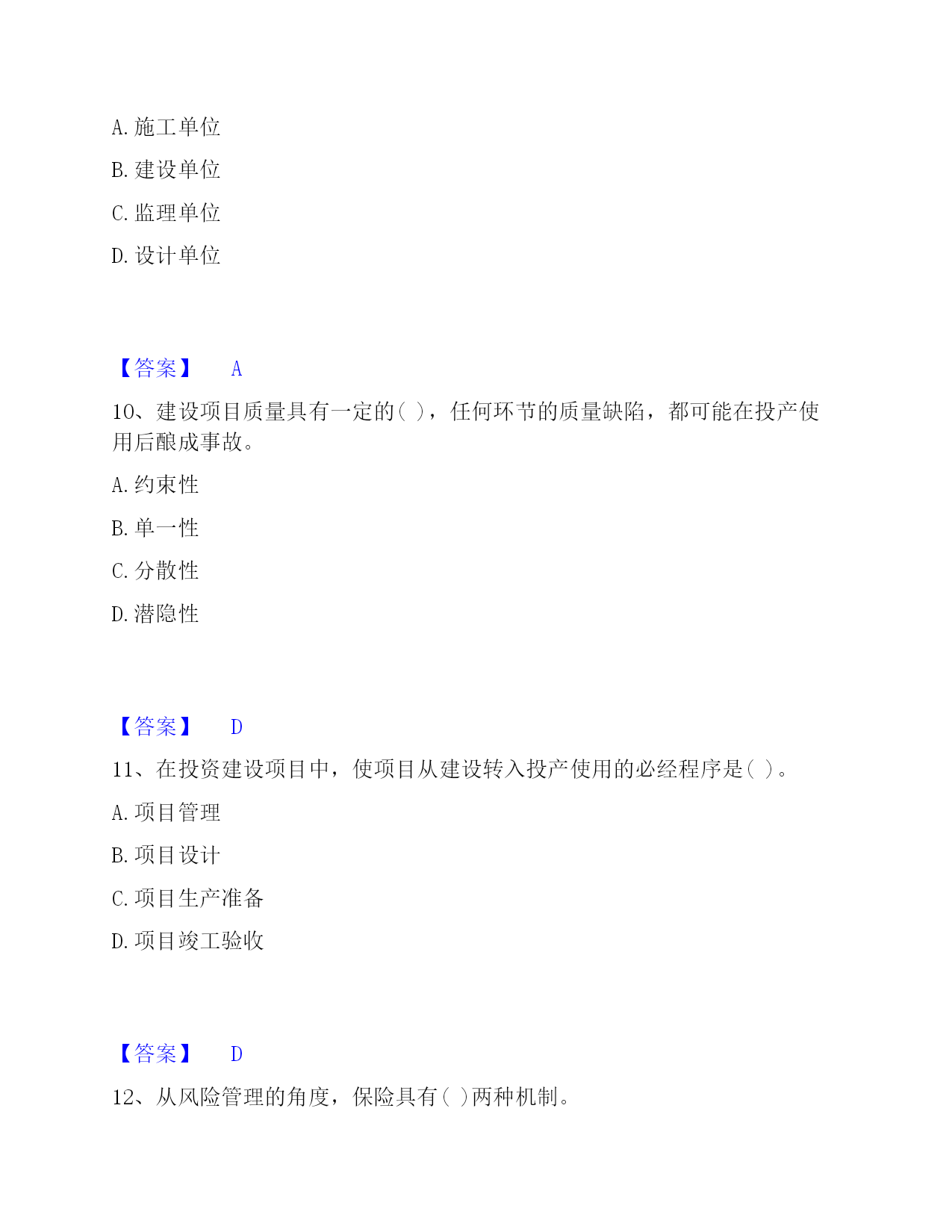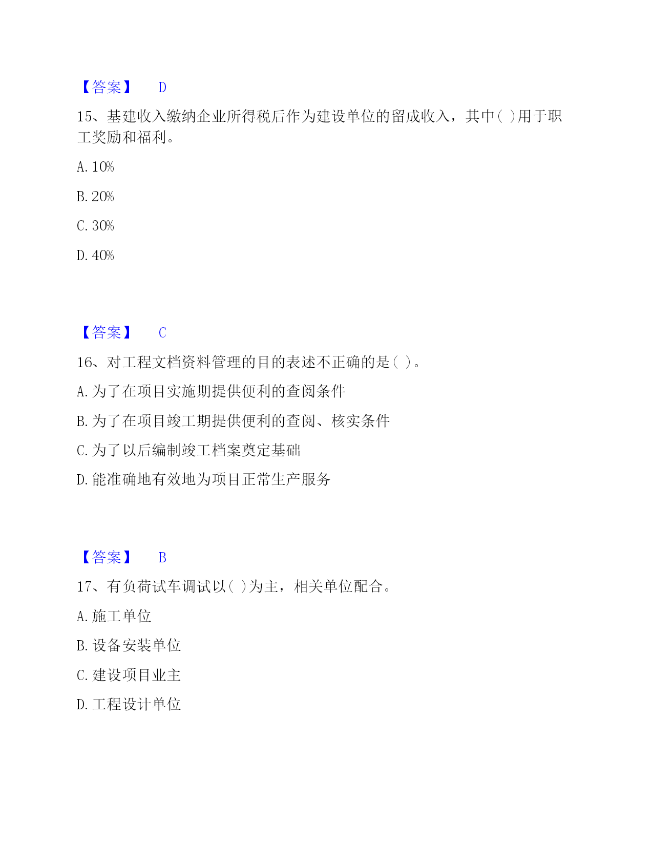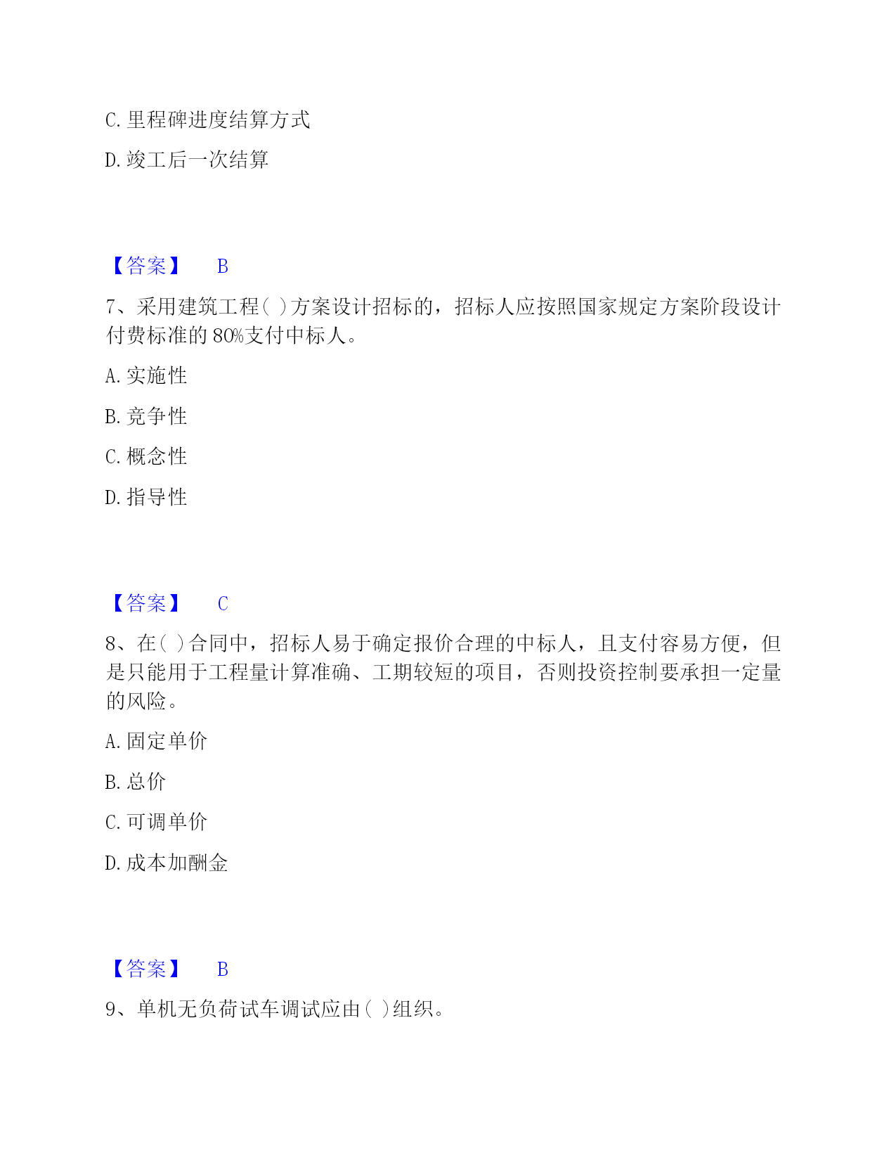 2022-2023年投资项目管理师之投资建设项目实施过关检测试卷B卷附答案单选题(共50题)1、目前,只在()建设项目采用"代建制"。A.企业投资的B.政府注入资本金的C.政府直接投资的非经营性D.外商投资的【答案】C2、()是企业管理的重要内容。A.资金管理B.质量管理C.安全管理D.收益管理【答案】B3、工程风险存在与否和大小的关键,取决于()。A.人们对事件实际结果的认识B.人们对事件预期的认识C.人们通过主观努力而得到的实际结果D.人们对于事件结果的预期认识【答案】D4、社会影响评价的方法一般是(),在诸要素分析评价的基础上做综合评价。A.定性和定量相结合,以定性为主B.定性和定量相结合,以定量为主C.定量和定期相结合,以定量为主D.定量和定期相结合,以定期为主【答案】A5、下列不属于建设项目内部控制基本要素的是()。A.外部环境B.风险评估C.信息与沟通D.内部监督【答案】A6、当年开工,当年不能竣工的新开工工程或单位工程,通常采用()方式结算工程价款。A.按月结算B.分段结算C.里程碑进度结算方式D.竣工后一次结算【答案】B7、采用建筑工程()方案设计招标的,招标人应按照国家规定方案阶段设计付费标准的80%支付中标人。A.实施性B.竞争性C.概念性D.指导性【答案】C8、在()合同中,招标人易于确定报价合理的中标人,且支付容易方便,但是只能用于工程量计算准确、工期较短的项目,否则投资控制要承担一定量的风险。A.固定单价B.总价C.可调单价D.成本加酬金【答案】B9、单机无负荷试车调试应由()组织。A.施工单位B.建设单位C.监理单位D.设计单位【答案】A10、建设项目质量具有一定的(),任何环节的质量缺陷,都可能在投产使用后酿成事故。A.约束性B.单一性C.分散性D.潜隐性【答案】D11、在投资建设项目中,使项目从建设转入投产使用的必经程序是()。A.项目管理B.项目设计C.项目生产准备D.项目竣工验收【答案】D12、从风险管理的角度,保险具有()两种机制。A.风险回避与风险组合B.风险转移与风险组合C.风险转移与风险控制D.风险转移与风险分散【答案】B13、()是指财务预定目标,拟定出多种可行性方案,并从中选择最合理有效的行动方案的过程。A.财务决策B.财务预测C.财务预算D.财务控制【答案】B14、在工程网络计划中,工作w的最早开始时间为第28d,其持续时间为9d。该工作有三项紧后工作,它们的最迟开始时间分别为第40d、第43d和第48d,则工作w的总时差为()d。A.15B.12C.5D.3【答案】D15、基建收入缴纳企业所得税后作为建设单位的留成收入,其中()用于职工奖励和福利。A.10%B.20%C.30%D.40%【答案】C16、对工程文档资料管理的目的表述不正确的是()。A.为了在项目实施期提供便利的查阅条件B.为了在项目竣工期提供便利的查阅、核实条件C.为了以后编制竣工档案奠定基础D.能准确地有效地为项目正常生产服务【答案】B17、有负荷试车调试以()为主,相关单位配合。A.施工单位B.设备安装单位C.建设项目业主D.工程设计单位【答案】C18、下列工程设计评审中,()评审是依据建设项目业主提出的工程设计委托条件和设计原则,审核设计项目完整性,设计勘察成果可靠性,以及设计标准、装备标准是否符合预定要求。A.设计方案B.初步设计成果C.设计总说明D.总体【答案】B19、职能健康安全与环境管理的持续性是由()决定的。A.多样性B.产品生产的阶段性C.单件性D.产品社会性【答案】B20、关于合同变更与转让管理的表述,错误的是()。A.当事人协商一致,可以变更合同B.当事人对合同变更的内容约定不明确的,推定为未变更C.债权人转让权利的,无需通知债务人D.债务人将合同的义务部分转移给第三人的,应当经债权人同意【答案】C21、对于工程建设合同额超过()亿元人民币以上的工程,业主工程款支付担保可以按工程合同确定的付款周期实行分段滚动担保。A.1B.2C.3D.5【答案】A22、建设工程监理与相关服务收费,应当体现()的原则。A.优质优价B.成本效益C.适当性D.依法审计【答案】A23、技术设计是初步设计的补充和深化,一般由()组织审查、审批。A.建设项目业主直接B.承包单位C.建设项目业主和设计单位共同D.监理单位【答案】A24、规划区的建设项目,
