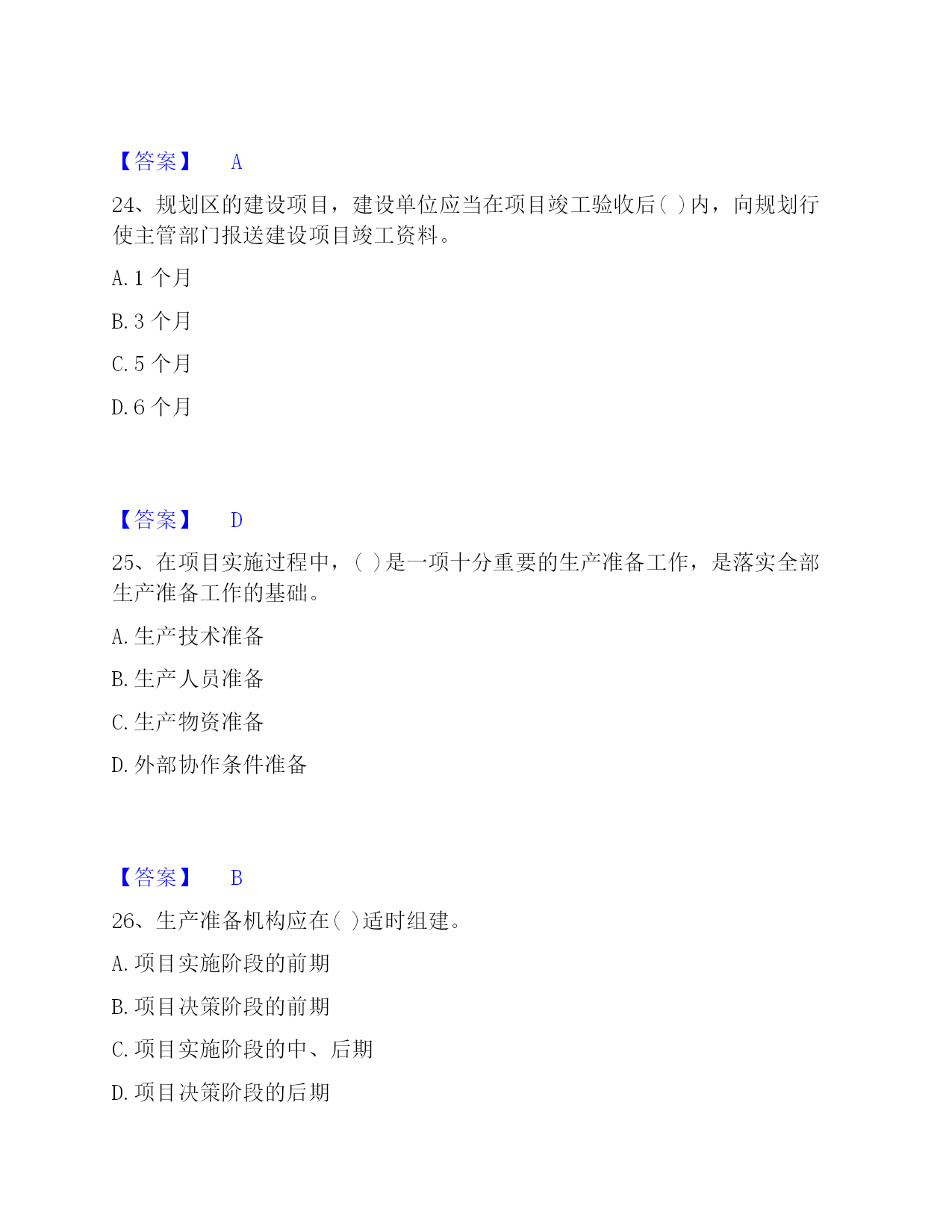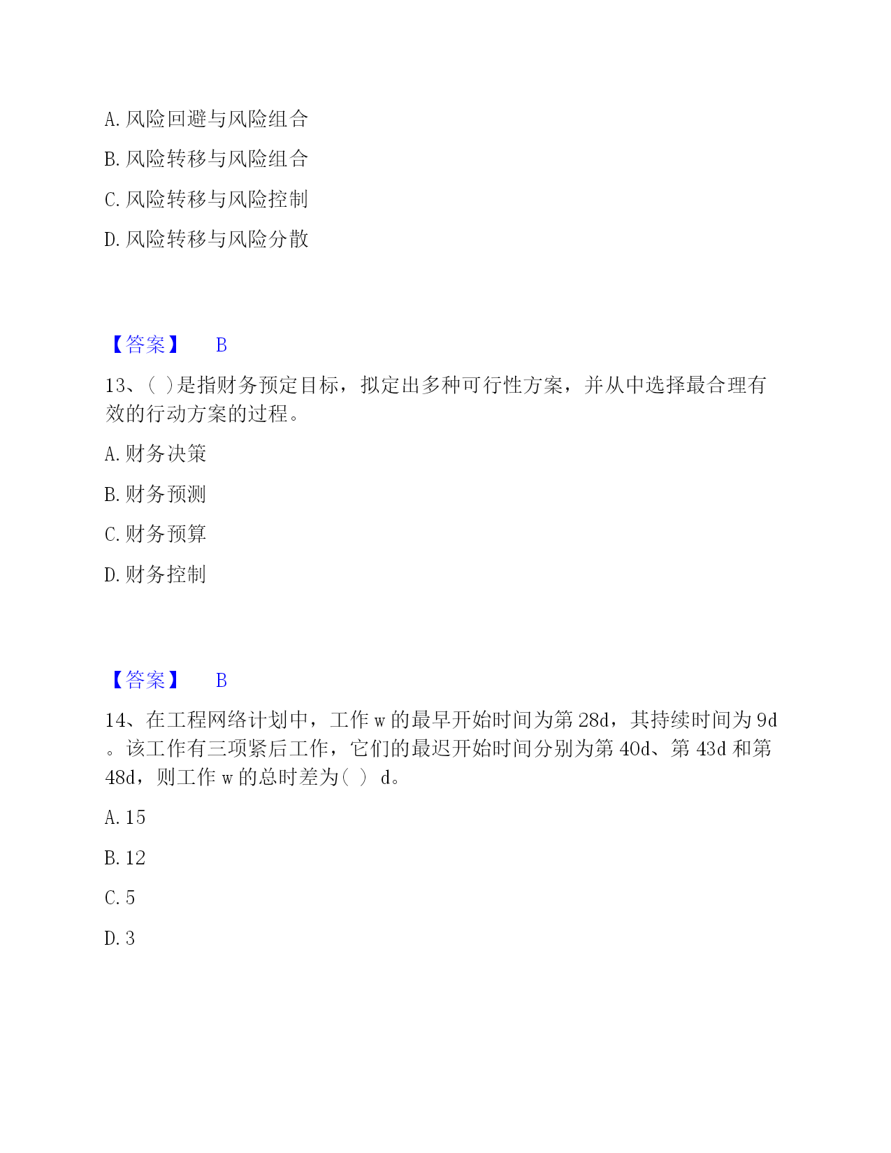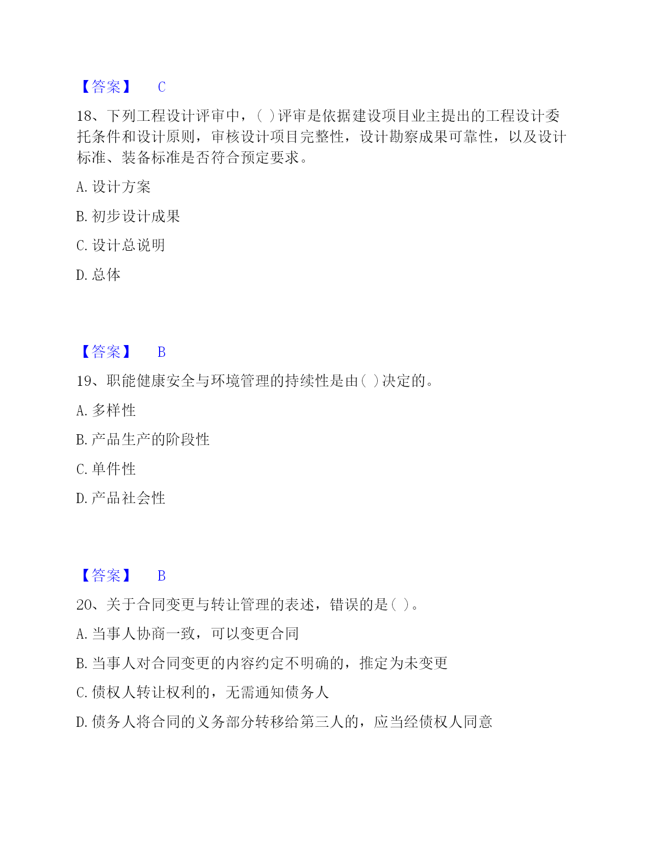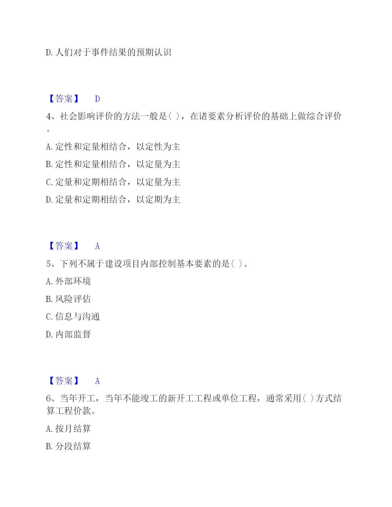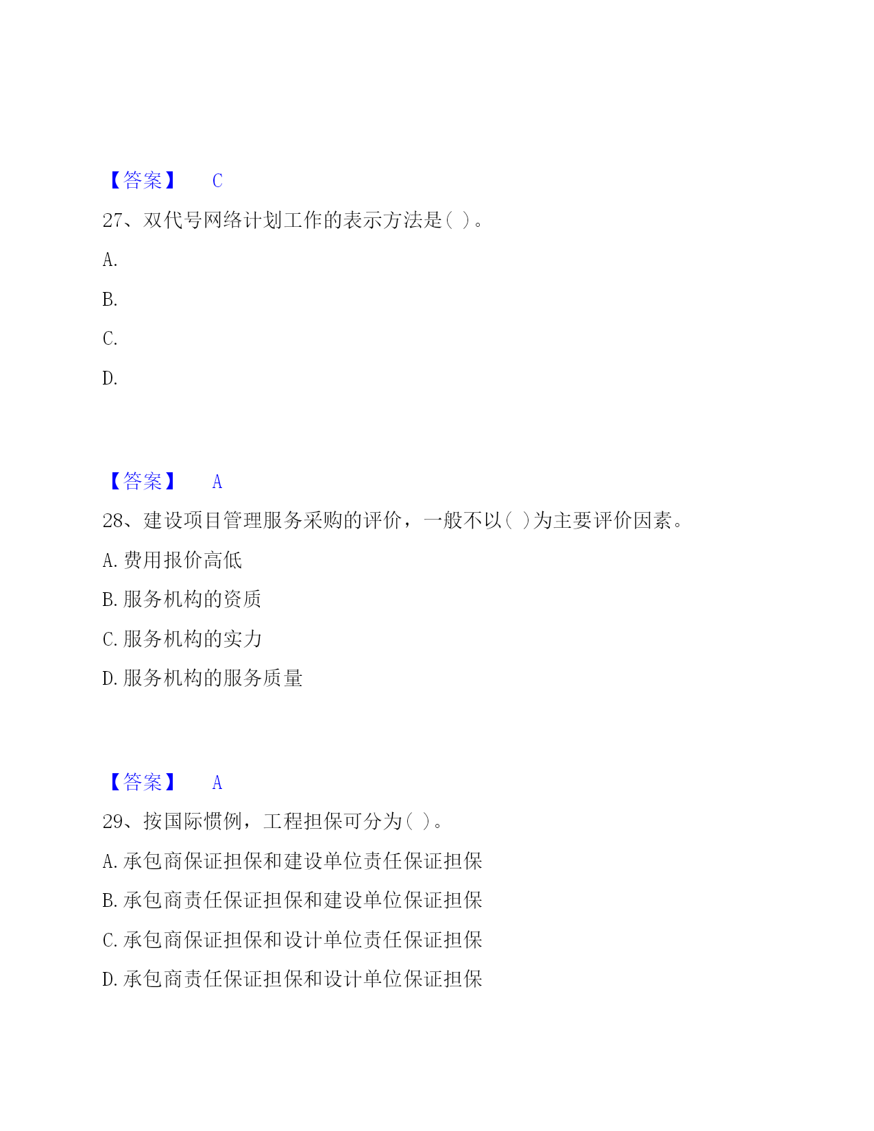 2022-2023年投资项目管理师之投资建设项目实施过关检测试卷B卷附答案单选题(共50题)1、目前,只在()建设项目采用"代建制"。A.企业投资的B.政府注入资本金的C.政府直接投资的非经营性D.外商投资的【答案】C2、()是企业管理的重要内容。A.资金管理B.质量管理C.安全管理D.收益管理【答案】B3、工程风险存在与否和大小的关键,取决于()。A.人们对事件实际结果的认识B.人们对事件预期的认识C.人们通过主观努力而得到的实际结果D.人们对于事件结果的预期认识【答案】D4、社会影响评价的方法一般是(),在诸要素分析评价的基础上做综合评价。A.定性和定量相结合,以定性为主B.定性和定量相结合,以定量为主C.定量和定期相结合,以定量为主D.定量和定期相结合,以定期为主【答案】A5、下列不属于建设项目内部控制基本要素的是()。A.外部环境B.风险评估C.信息与沟通D.内部监督【答案】A6、当年开工,当年不能竣工的新开工工程或单位工程,通常采用()方式结算工程价款。A.按月结算B.分段结算C.里程碑进度结算方式D.竣工后一次结算【答案】B7、采用建筑工程()方案设计招标的,招标人应按照国家规定方案阶段设计付费标准的80%支付中标人。A.实施性B.竞争性C.概念性D.指导性【答案】C8、在()合同中,招标人易于确定报价合理的中标人,且支付容易方便,但是只能用于工程量计算准确、工期较短的项目,否则投资控制要承担一定量的风险。A.固定单价B.总价C.可调单价D.成本加酬金【答案】B9、单机无负荷试车调试应由()组织。A.施工单位B.建设单位C.监理单位D.设计单位【答案】A10、建设项目质量具有一定的(),任何环节的质量缺陷,都可能在投产使用后酿成事故。A.约束性B.单一性C.分散性D.潜隐性【答案】D11、在投资建设项目中,使项目从建设转入投产使用的必经程序是()。A.项目管理B.项目设计C.项目生产准备D.项目竣工验收【答案】D12、从风险管理的角度,保险具有()两种机制。A.风险回避与风险组合B.风险转移与风险组合C.风险转移与风险控制D.风险转移与风险分散【答案】B13、()是指财务预定目标,拟定出多种可行性方案,并从中选择最合理有效的行动方案的过程。A.财务决策B.财务预测C.财务预算D.财务控制【答案】B14、在工程网络计划中,工作w的最早开始时间为第28d,其持续时间为9d。该工作有三项紧后工作,它们的最迟开始时间分别为第40d、第43d和第48d,则工作w的总时差为()d。A.15B.12C.5D.3【答案】D15、基建收入缴纳企业所得税后作为建设单位的留成收入,其中()用于职工奖励和福利。A.10%B.20%C.30%D.40%【答案】C16、对工程文档资料管理的目的表述不正确的是()。A.为了在项目实施期提供便利的查阅条件B.为了在项目竣工期提供便利的查阅、核实条件C.为了以后编制竣工档案奠定基础D.能准确地有效地为项目正常生产服务【答案】B17、有负荷试车调试以()为主,相关单位配合。A.施工单位B.设备安装单位C.建设项目业主D.工程设计单位【答案】C18、下列工程设计评审中,()评审是依据建设项目业主提出的工程设计委托条件和设计原则,审核设计项目完整性,设计勘察成果可靠性,以及设计标准、装备标准是否符合预定要求。A.设计方案B.初步设计成果C.设计总说明D.总体【答案】B19、职能健康安全与环境管理的持续性是由()决定的。A.多样性B.产品生产的阶段性C.单件性D.产品社会性【答案】B20、关于合同变更与转让管理的表述,错误的是()。A.当事人协商一致,可以变更合同B.当事人对合同变更的内容约定不明确的,推定为未变更C.债权人转让权利的,无需通知债务人D.债务人将合同的义务部分转移给第三人的,应当经债权人同意【答案】C21、对于工程建设合同额超过()亿元人民币以上的工程,业主工程款支付担保可以按工程合同确定的付款周期实行分段滚动担保。A.1B.2C.3D.5【答案】A22、建设工程监理与相关服务收费,应当体现()的原则。A.优质优价B.成本效益C.适当性D.依法审计【答案】A23、技术设计是初步设计的补充和深化,一般由()组织审查、审批。A.建设项目业主直接B.承包单位C.建设项目业主和设计单位共同D.监理单位【答案】A24、规划区的建设项目,