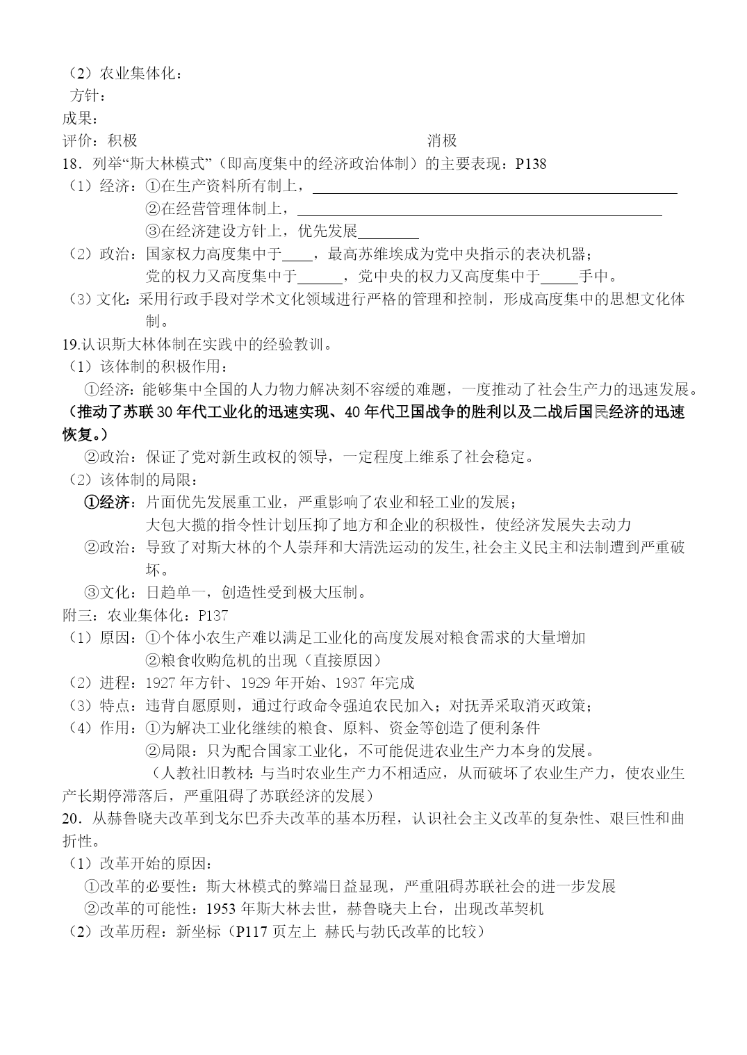 布雷顿森林体系的建立的背景(课本P1503点)时间布雷顿森林协议的内容(2个方面)布雷顿森林体系和布雷顿森林会议是两个概念(体系包括世界银行和国际货币基金组织)参看新坐标P124表格和思维导图误区警示(世界银行与国际货币基金组织的区别和联系)新坐标P123关贸总协定成立的时间宗旨意义(课本P152)战后世界资本主义的经济特征新坐标P120(4点)美国在战后资本主义世界经济体系的建立过程中主导性的表现(4个方面新坐标)经济区域集团化的概念(课本P153绿色部分)从欧共体到欧洲联盟1967、1991199319992007影响北美自由贸易区和亚太经合组织参看新坐标P127主要经济区域集团的比较新坐标128世贸组织的建立背景建立宗旨意义新坐标127中国加入世贸组织时间利和弊新坐标127对经济全球化的认识新坐标128经济全球化秘区域集团化的关系131页新坐标P130体系表专题七苏联社会主义建设的经验与教训16.了解俄国国内战争后苏维埃政权面临的形势,认识战时共产主义政策向新经济政策转变的必要性。P130名称背景目的内容特点效果战时共产主义1、2、①集中有限的人力物力打退国内外敌人的进攻;②后来以此向过渡①农业制②工业:企业化③流通:取消④分配:⑤其他:劳动义务制实行国家对国民经济的高度集中计划管理,排斥商品市场和资本主义①为战胜敌人提供了保障,使苏维埃政权在经济上站稳了脚跟;②战后继续实施却加重了国内的经济政治危机新经济政策时期;苏维埃政权面临严重的和————危机①医治战争创伤,恢复发展生产,②在此基础上逐步过渡到社会主义①农业:②工业(租让,租赁)③商业:④分配:国家掌握经济命脉的前提下,恢复商品市场和资本主义①②③17、斯大林模式的社会主义道路(1)工业化之路方针:年月第大正式提出了成果:弊端:(2)农业集体化:方针:成果:评价:积极消极18.列举“斯大林模式”(即高度集中的经济政治体制)的主要表现:P138(1)经济:①在生产资料所有制上,②在经营管理体制上,③在经济建设方针上,优先发展(2)政治:国家权力高度集中于,最高苏维埃成为党中央指示的表决机器;党的权力又高度集中于,党中央的权力又高度集中于手中。(3)文化:采用行政手段对学术文化领域进行严格的管理和控制,形成高度集中的思想文化体制。19.认识斯大林体制在实践中的经验教训。(1)该体制的积极作用:①经济:能够集中全国的人力物力解决刻不容缓的难题,一度推动了社会生产力的迅速发展。(推动了苏联30年代工业化的迅速实现、40年代卫国战争的胜利以及二战后国民经济的迅速恢复。)②政治:保证了党对新生政权的领导,一定程度上维系了社会稳定。(2)该体制的局限:①经济:片面优先发展重工业,严重影响了农业和轻工业的发展;大包大揽的指令性计划压抑了地方和企业的积极性,使经济发展失去动力②政治:导致了对斯大林的个人崇拜和大清洗运动的发生,社会主义民主和法制遭到严重破坏。③文化:日趋单一,创造性受到极大压制。附三:农业集体化:P137(1)原因:①个体小农生产难以满足工业化的高度发展对粮食需求的大量增加②粮食收购危机的出现(直接原因)(2)进程:1927年方针、1929年开始、1937年完成(3)特点:违背自愿原则,通过行政命令强迫农民加入;对抚弄采取消灭政策;(4)作用:①为解决工业化继续的粮食、原料、资金等创造了便利条件②局限:只为配合国家工业化,不可能促进农业生产力本身的发展。(人教社旧教材:与当时农业生产力不相适应,从而破坏了农业生产力,使农业生产长期停滞落后,严重阻碍了苏联经济的发展)20.从赫鲁晓夫改革到戈尔巴乔夫改革的基本历程,认识社会主义改革的复杂性、艰巨性和曲折性。(1)改革开始的原因:①改革的必要性:斯大林模式的弊端日益显现,严重阻碍苏联社会的进一步发展②改革的可能性:1953年斯大林去世,赫鲁晓夫上台,出现改革契机(2)改革历程:新坐标(P117页左上赫氏与勃氏改革的比较)