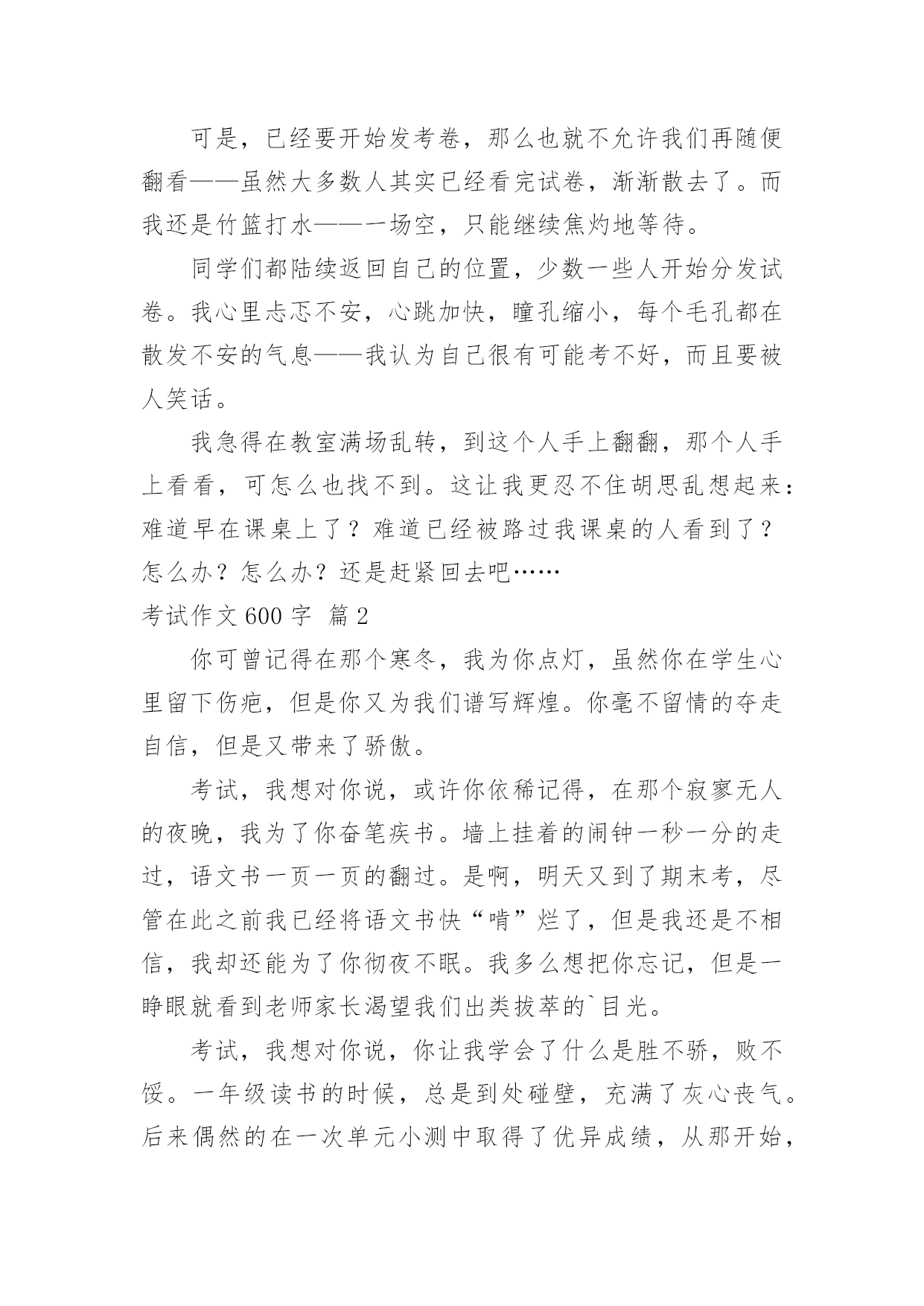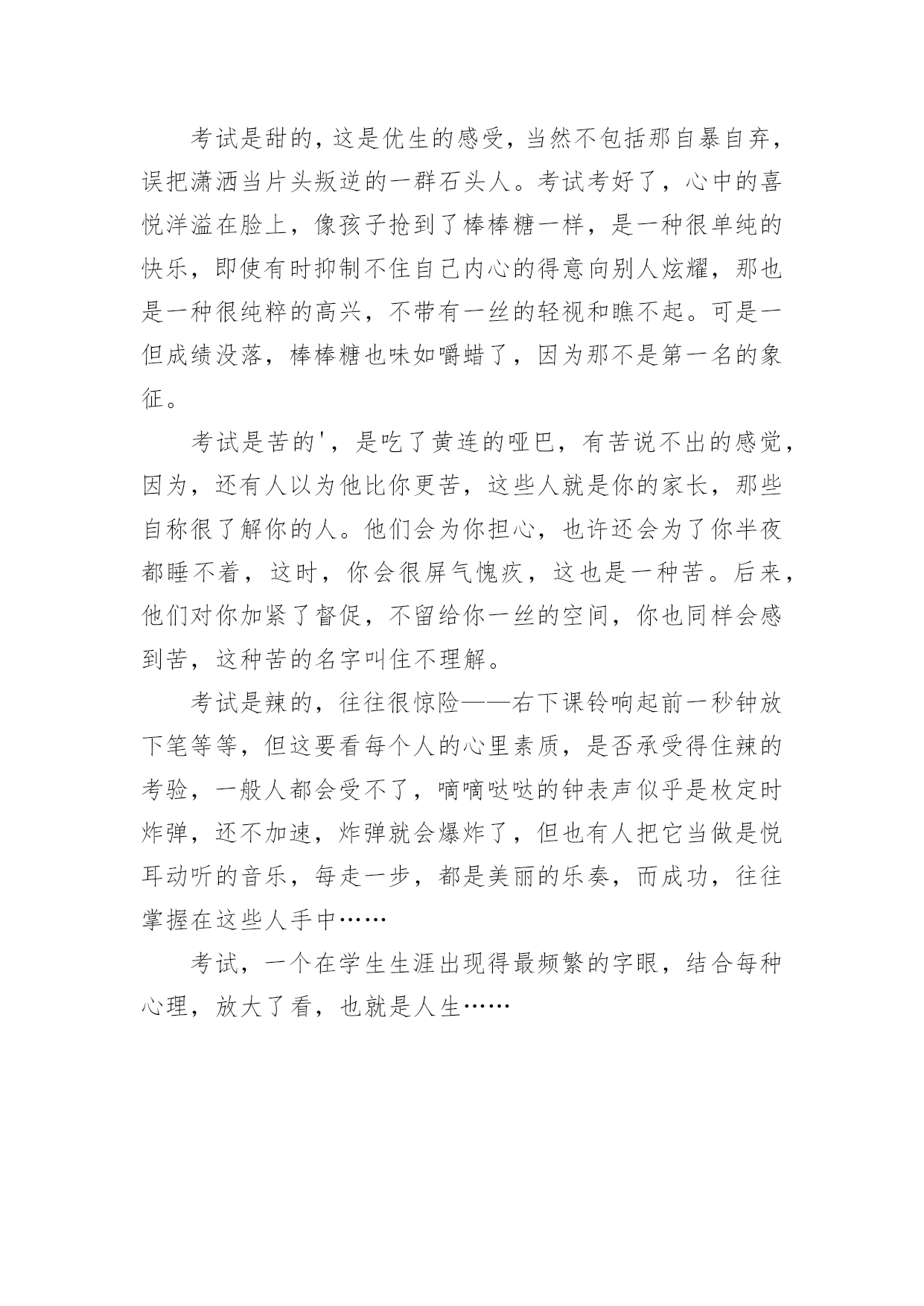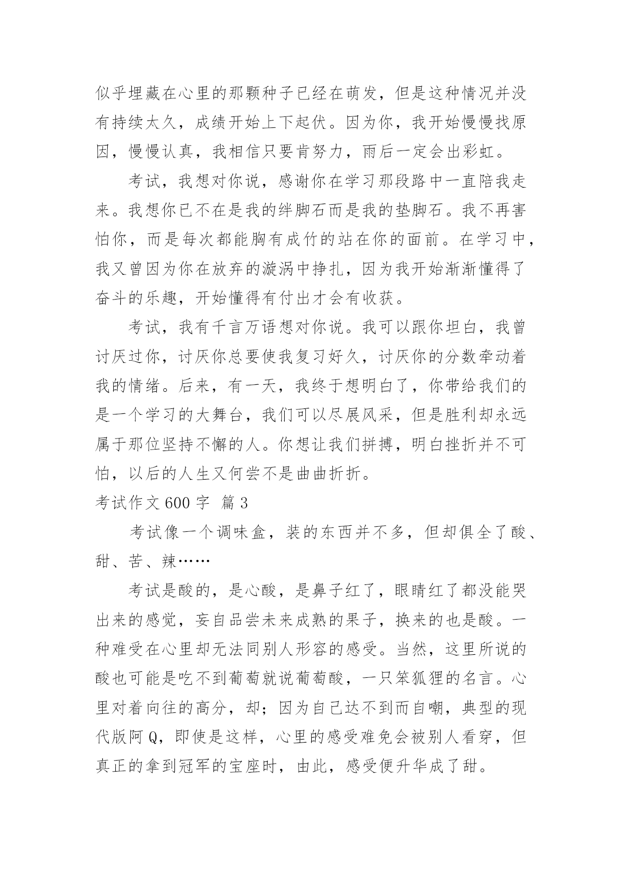 考试作文600字【精选】考试作文600字3篇在平平淡淡的学习、工作、生活中,大家都不可避免地会接触到作文吧,作文是人们以书面形式表情达意的言语活动。怎么写作文才能避免踩雷呢?下面是小编精心整理的考试作文600字3篇,欢迎阅读,希望大家能够喜欢。考试作文600字篇1"发试卷了!发试卷了!"一个石破天惊的声音从教室外由远及近地传来,随后,很快就看到王同学拿着如同圣旨般的试卷向我们跑来。今天是发试卷的日子——社会考试卷。有的同学胆大包天,无所畏惧,他们抢先跑了上去,瞄了一瞄。在他们的带动下,好奇的人不断增加,争前恐后涌向了王同学。这样一来,他就被围得团团转了。此时的我竟有些害怕,又有一些小兴奋——因为分数来了呀。迈着沉重的脚步,我最终还是决定走向讲台。看着人群一层一层地向外扩散,我暗自心想:"情况不妙啊!"同时也不再多作犹豫,赶紧跑上去争夺位置。谁知左边挤走一波,右边又来一波。而且班级里不少同学的体型有些"庞大",他们的`加入,几乎把我挤得窒息。他们像是挤着海绵里的水分子一样,又把我挤出来了,这下,我更加心烦意乱。深吸一口气,再次仔细观察了眼前的情况——看来不能软攻,只能硬拼了!于是,我奋不顾身向里冲,果然拼出了个位置。可是,已经要开始发考卷,那么也就不允许我们再随便翻看——虽然大多数人其实已经看完试卷,渐渐散去了。而我还是竹篮打水——一场空,只能继续焦灼地等待。同学们都陆续返回自己的位置,少数一些人开始分发试卷。我心里忐忑不安,心跳加快,瞳孔缩小,每个毛孔都在散发不安的气息——我认为自己很有可能考不好,而且要被人笑话。我急得在教室满场乱转,到这个人手上翻翻,那个人手上看看,可怎么也找不到。这让我更忍不住胡思乱想起来:难道早在课桌上了?难道已经被路过我课桌的人看到了?怎么办?怎么办?还是赶紧回去吧……考试作文600字篇2你可曾记得在那个寒冬,我为你点灯,虽然你在学生心里留下伤疤,但是你又为我们谱写辉煌。你毫不留情的夺走自信,但是又带来了骄傲。考试,我想对你说,或许你依稀记得,在那个寂寥无人的夜晚,我为了你奋笔疾书。墙上挂着的闹钟一秒一分的走过,语文书一页一页的翻过。是啊,明天又到了期末考,尽管在此之前我已经将语文书快“啃”烂了,但是我还是不相信,我却还能为了你彻夜不眠。我多么想把你忘记,但是一睁眼就看到老师家长渴望我们出类拔萃的`目光。考试,我想对你说,你让我学会了什么是胜不骄,败不馁。一年级读书的时候,总是到处碰壁,充满了灰心丧气。后来偶然的在一次单元小测中取得了优异成绩,从那开始,似乎埋藏在心里的那颗种子已经在萌发,但是这种情况并没有持续太久,成绩开始上下起伏。因为你,我开始慢慢找原因,慢慢认真,我相信只要肯努力,雨后一定会出彩虹。考试,我想对你说,感谢你在学习那段路中一直陪我走来。我想你已不在是我的绊脚石而是我的垫脚石。我不再害怕你,而是每次都能胸有成竹的站在你的面前。在学习中,我又曾因为你在放弃的漩涡中挣扎,因为我开始渐渐懂得了奋斗的乐趣,开始懂得有付出才会有收获。考试,我有千言万语想对你说。我可以跟你坦白,我曾讨厌过你,讨厌你总要使我复习好久,讨厌你的分数牵动着我的情绪。后来,有一天,我终于想明白了,你带给我们的是一个学习的大舞台,我们可以尽展风采,但是胜利却永远属于那位坚持不懈的人。你想让我们拼搏,明白挫折并不可怕,以后的人生又何尝不是曲曲折折。考试作文600字篇3考试像一个调味盒,装的东西并不多,但却俱全了酸、甜、苦、辣……考试是酸的,是心酸,是鼻子红了,眼睛红了都没能哭出来的感觉,妄自品尝未来成熟的果子,换来的也是酸。一种难受在心里却无法同别人形容的感受。当然,这里所说的酸也可能是吃不到葡萄就说葡萄酸,一只笨狐狸的名言。心里对着向往的高分,却;因为自己达不到而自嘲,典型的现代版阿Q,即使是这样,心里的感受难免会被别人看穿,但真正的拿到冠军的宝座时,由此,感受便升华成了甜。考试是甜的,这是优生的感受,当然不包括那自暴自弃,误把潇洒当片头叛逆的一群石头人。考试考好了,心中的喜悦洋溢在脸上,像孩子抢到了棒棒糖一样,是一种很单纯的快乐,即使有时抑制不住自己内心的得意向别人炫耀,那也是一种很纯粹的高兴,不带有一丝的轻视和瞧不起。可是一但成绩没落,棒棒糖也味如嚼蜡了,因为那不是第一名的象征。考试是苦的',是吃了黄连的哑巴,有苦说不出的感觉,因为,还有人以为他比你更苦,这些人就是你的家长,那些自称很了解你的人。他们会为你担心,也许还会为了你半夜都睡不着,这时,你会很屏气愧疚,这也是一种苦。后来,他们对你加紧了督促,不留给你一丝的空间,你也同样会感到苦,这种苦的名字叫住不理解。考试是辣的,往往很惊险——右下课铃响起前一秒钟放下笔等等,但这要看每个人的心里素质,是否承受得住辣的考验,一般人都会受不了,嘀嘀哒哒的钟表声似乎是枚定时炸
