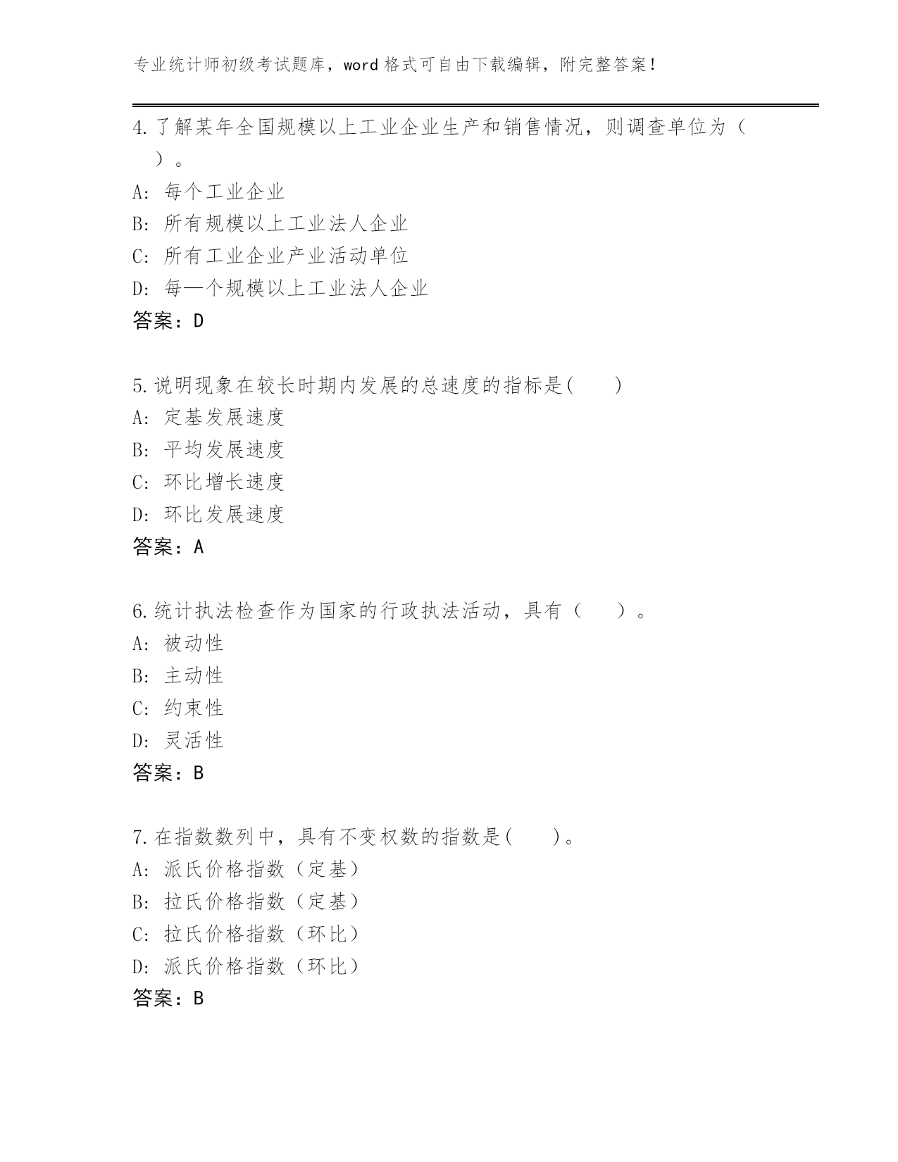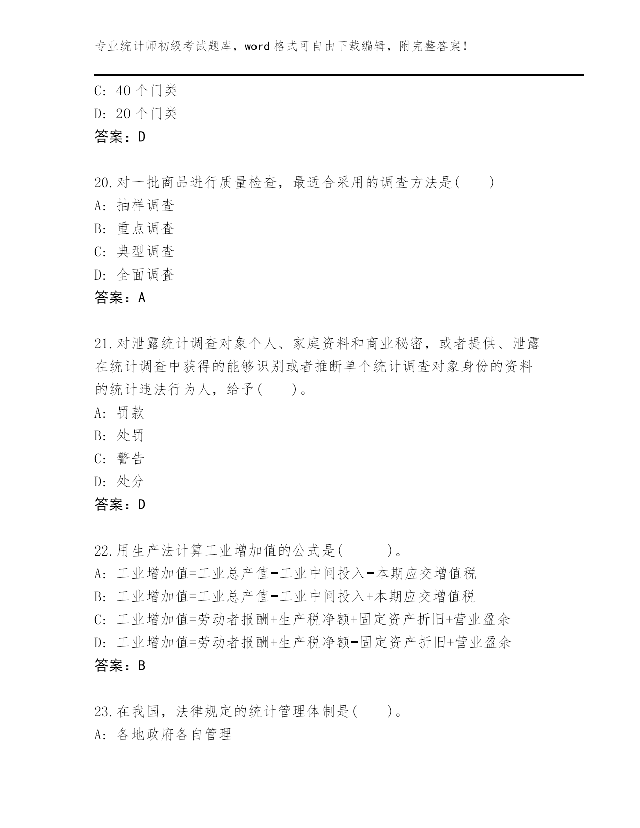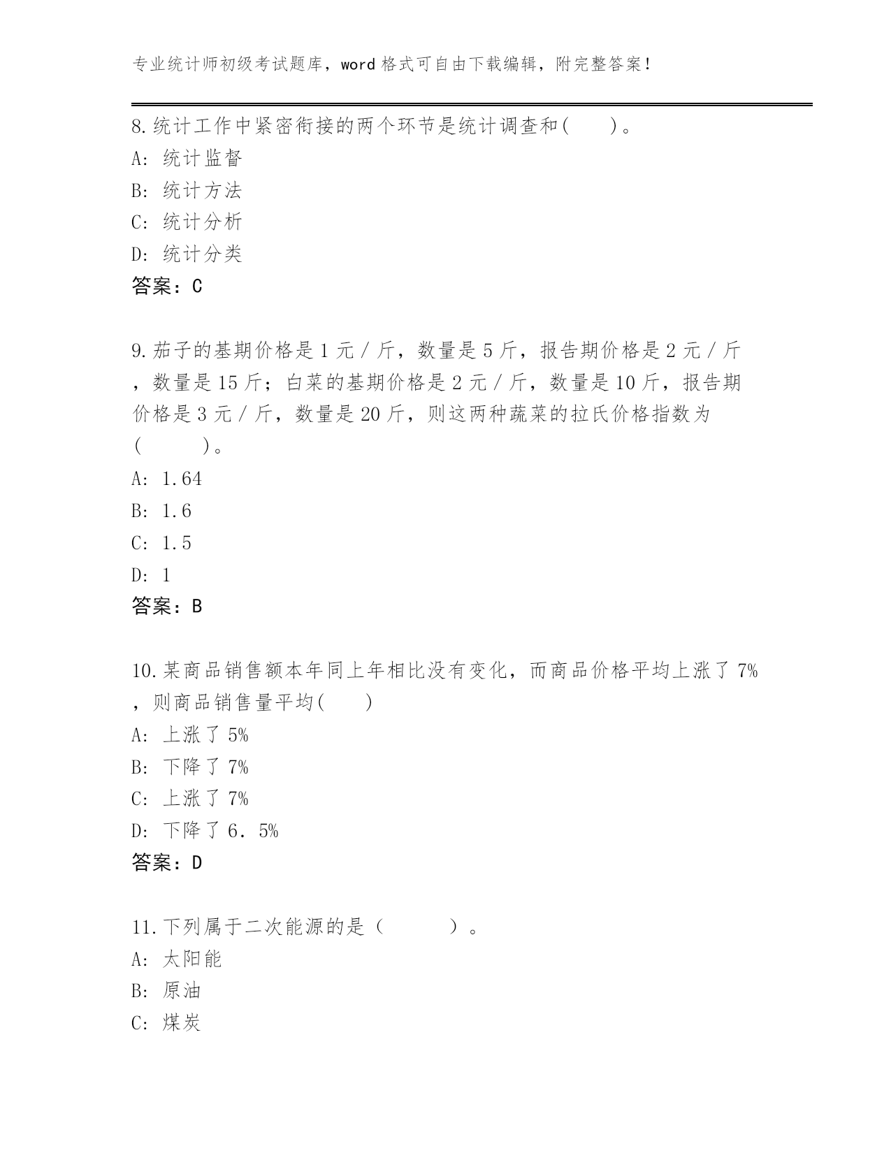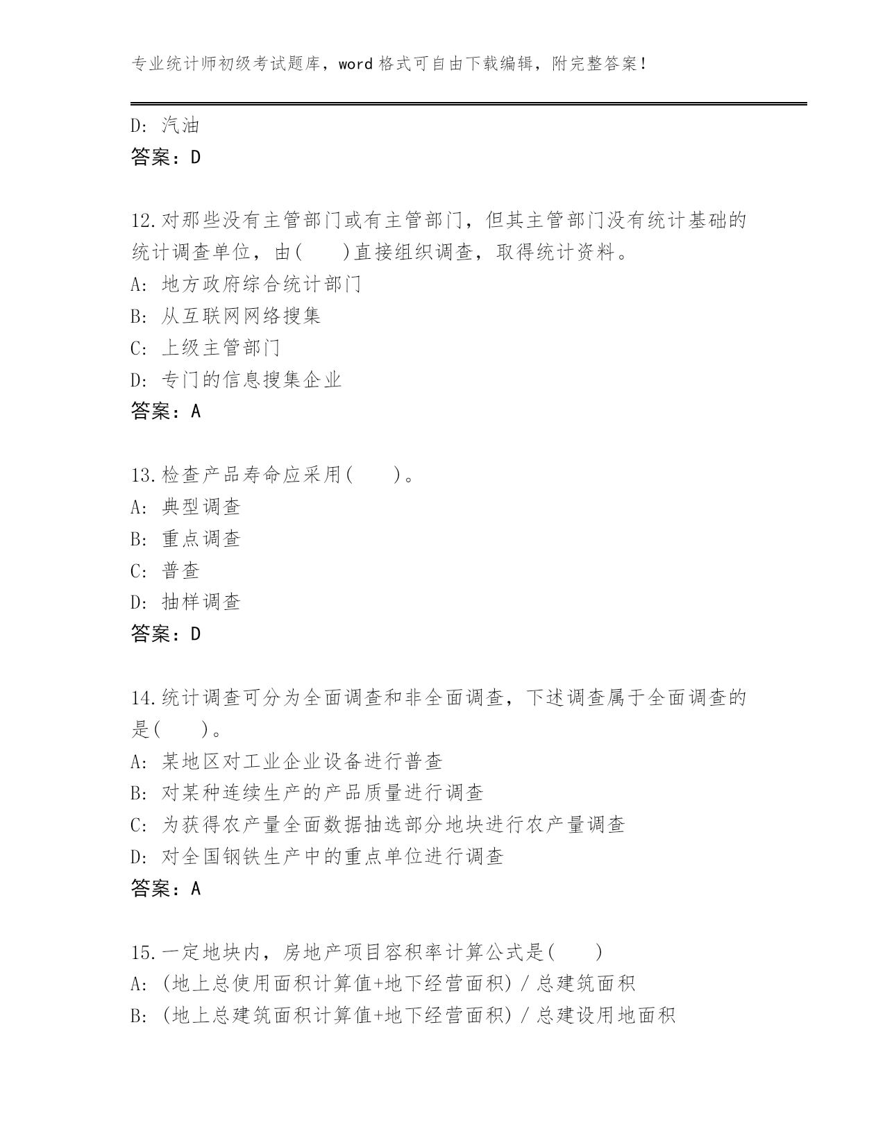 专业统计师初级考试题库,word格式可自由下载编辑,附完整答案!云南省泸水市2024年统计师初级考试真题题库及答案【各地真题】第I部分单选题(100题)1.资产负债统计属于()。A:地方统计调查项目B:国家统计调查项目C:部门统计调查项目D:企业统计调查项目答案:B2.在编制质量指数时,拉氏指数公式()。A:将数量指标作为权数,并将其固定在报告期B:将质量指标作为权数,并将其固定在报告期C:将质量指标作为权数,并将其固定在基期D:将数量指标作为权数,并将其固定在基期答案:D3.统计用区划代码分为3段,第1段表示(),第2段表示街道、镇和乡,第3段表示居民委员会和村民委员会。A:地及地以上的行政区划B:市及市以上的行政区划C:省的行政区划D:县及县以上的行政区划答案:D4.了解某年全国规模以上工业企业生产和销售情况,则调查单位为()。A:每个工业企业B:所有规模以上工业法人企业C:所有工业企业产业活动单位D:每—个规模以上工业法人企业答案:D5.说明现象在较长时期内发展的总速度的指标是()A:定基发展速度B:平均发展速度C:环比增长速度D:环比发展速度答案:A6.统计执法检查作为国家的行政执法活动,具有()。A:被动性B:主动性C:约束性D:灵活性答案:B7.在指数数列中,具有不变权数的指数是()。A:派氏价格指数(定基)B:拉氏价格指数(定基)C:拉氏价格指数(环比)D:派氏价格指数(环比)答案:B8.统计工作中紧密衔接的两个环节是统计调查和()。A:统计监督B:统计方法C:统计分析D:统计分类答案:C9.茄子的基期价格是1元/斤,数量是5斤,报告期价格是2元/斤,数量是15斤;白菜的基期价格是2元/斤,数量是10斤,报告期价格是3元/斤,数量是20斤,则这两种蔬菜的拉氏价格指数为()。A:1.64B:1.6C:1.5D:1答案:B10.某商品销售额本年同上年相比没有变化,而商品价格平均上涨了7%,则商品销售量平均()A:上涨了5%B:下降了7%C:上涨了7%D:下降了6.5%答案:D11.下列属于二次能源的是()。A:太阳能B:原油C:煤炭D:汽油答案:D12.对那些没有主管部门或有主管部门,但其主管部门没有统计基础的统计调查单位,由()直接组织调查,取得统计资料。A:地方政府综合统计部门B:从互联网网络搜集C:上级主管部门D:专门的信息搜集企业答案:A13.检查产品寿命应采用()。A:典型调查B:重点调查C:普查D:抽样调查答案:D14.统计调查可分为全面调查和非全面调查,下述调查属于全面调查的是()。A:某地区对工业企业设备进行普查B:对某种连续生产的产品质量进行调查C:为获得农产量全面数据抽选部分地块进行农产量调查D:对全国钢铁生产中的重点单位进行调查答案:A15.一定地块内,房地产项目容积率计算公式是()A:(地上总使用面积计算值+地下经营面积)/总建筑面积B:(地上总建筑面积计算值+地下经营面积)/总建设用地面积C:地上总建筑面积计算值/总建设用地面积D:地上总使用面积计算值/总建设用地面积答案:C16.文盲率是()文盲人口占同年龄组人口数的比率。A:18岁以上B:16岁以上C:15岁以上D:14岁以上答案:C17.工业企业能源消费量不包括()。A:回收利用的剩余能源B:工业性作业活动的能源C:用于劳动保护的能源D:其他非工业生产消费的能源答案:A18.能源消费量年平均增长速度除以国民经济年平均增长速度得到的指标是()。A:能源弹性系数B:能源消费弹性系数C:能源增长系数D:能源生产弹性系数答案:B19.《国民经济行业分类》共分()。A:30个门类B:25个门类C:40个门类D:20个门类答案:D20.对一批商品进行质量检查,最适合采用的调查方法是()A:抽样调查B:重点调査C:典型调查D:全面调査答案:A21.对泄露统计调查对象个人、家庭资料和商业秘密,或者提供、泄露在统计调查中获得的能够识别或者推断单个统计调查对象身份的资料的统计违法行为人,给予()。A:罚款B:处罚C:警告D:处分答案:D22.用生产法计算工业增加值的公式是()。A:工业增加值=工业总产值−工业中间投入−本期应交增值税B:工业增加值=工业总产值−工业中间投入+本期应交增值税C:工业增加值=劳动者报酬+生产税净额+固定资产折旧+营业盈余D:工业增加值=劳动者报酬+生产税净额−固定资产折旧+营业盈余答案:B23.在我国,法律规