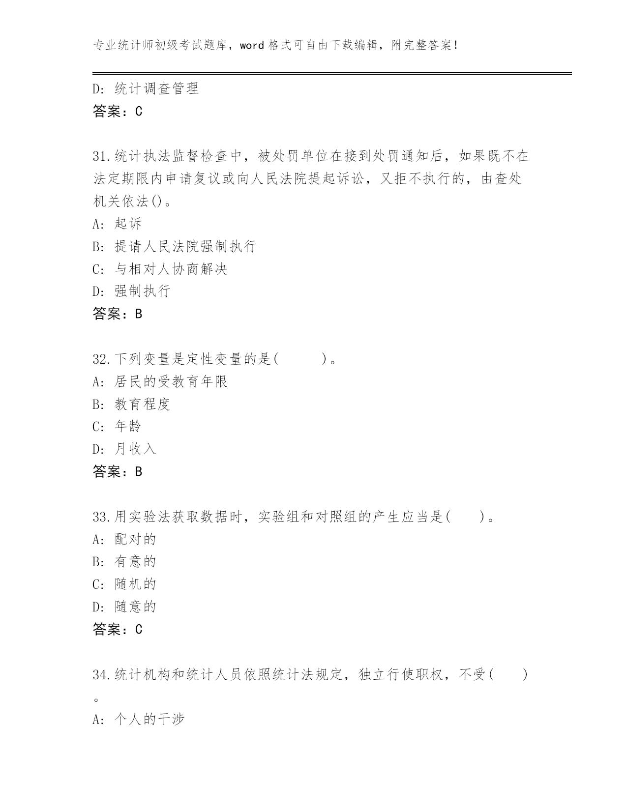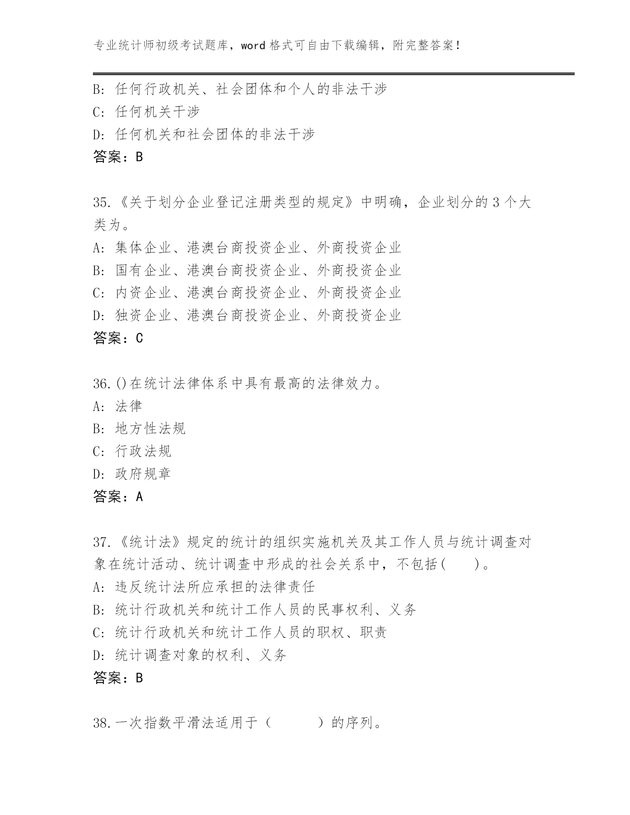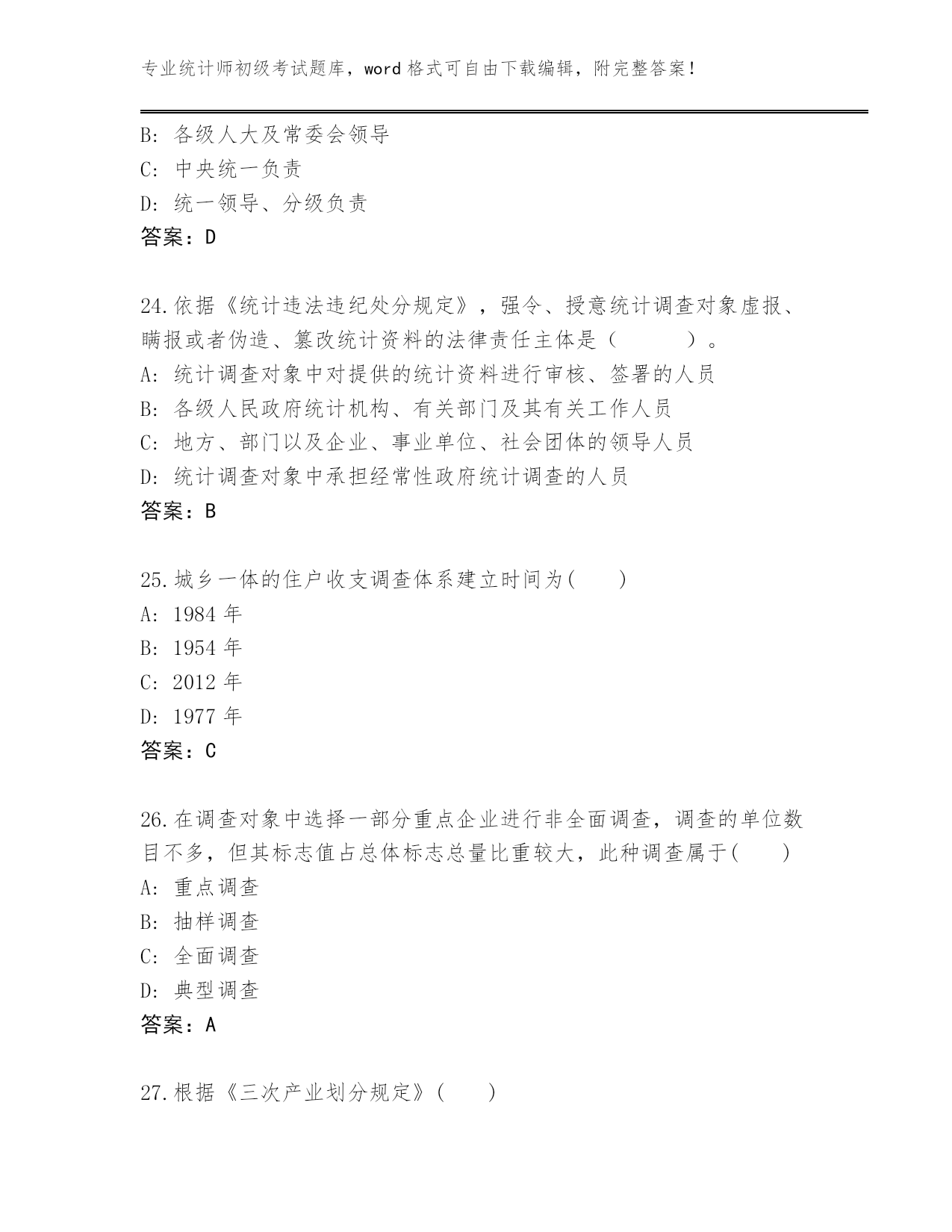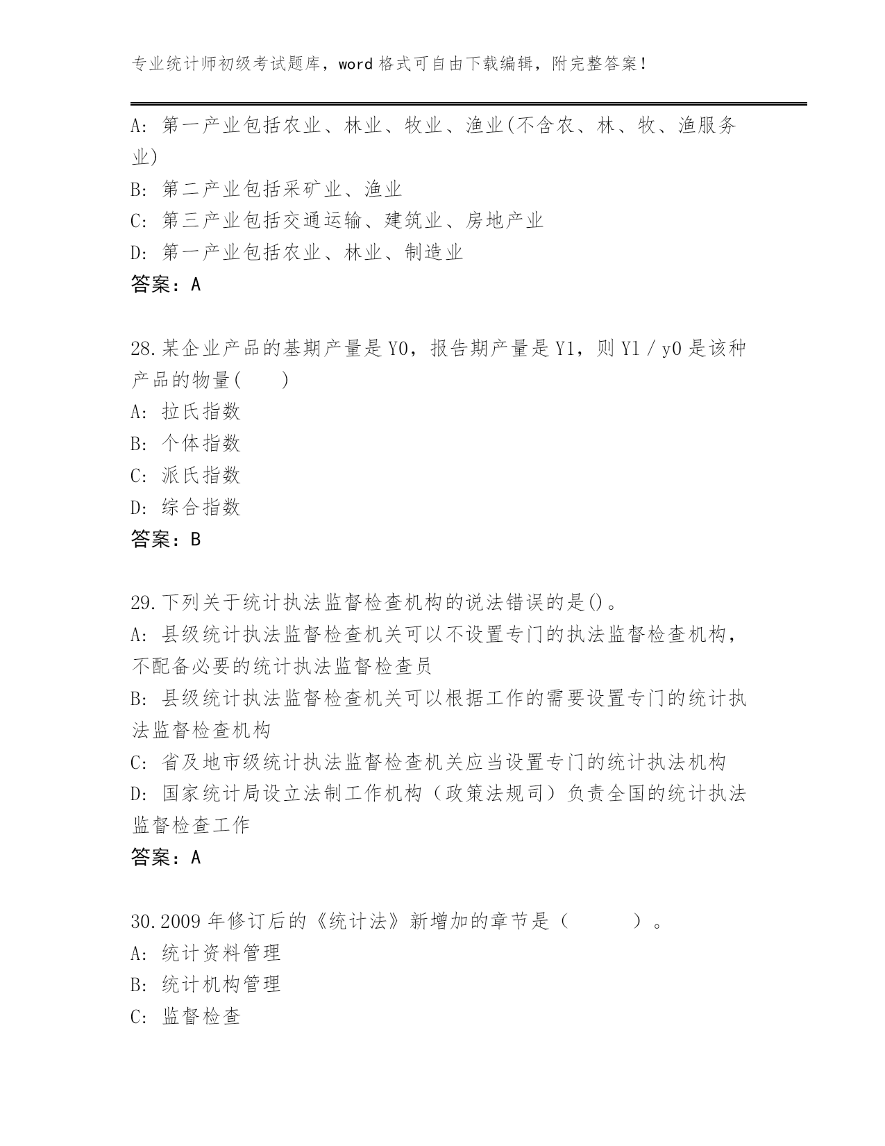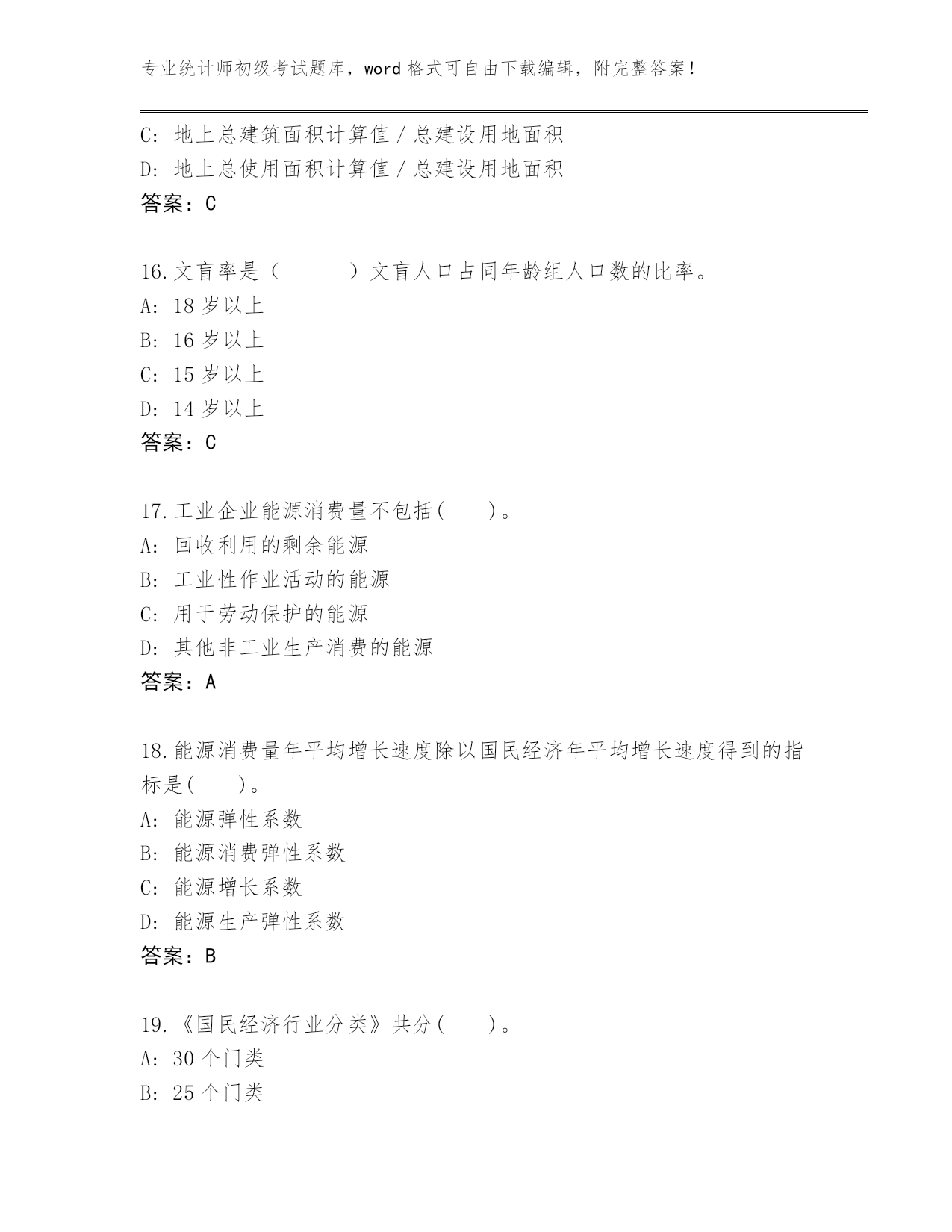 专业统计师初级考试题库,word格式可自由下载编辑,附完整答案!云南省泸水市2024年统计师初级考试真题题库及答案【各地真题】第I部分单选题(100题)1.资产负债统计属于()。A:地方统计调查项目B:国家统计调查项目C:部门统计调查项目D:企业统计调查项目答案:B2.在编制质量指数时,拉氏指数公式()。A:将数量指标作为权数,并将其固定在报告期B:将质量指标作为权数,并将其固定在报告期C:将质量指标作为权数,并将其固定在基期D:将数量指标作为权数,并将其固定在基期答案:D3.统计用区划代码分为3段,第1段表示(),第2段表示街道、镇和乡,第3段表示居民委员会和村民委员会。A:地及地以上的行政区划B:市及市以上的行政区划C:省的行政区划D:县及县以上的行政区划答案:D4.了解某年全国规模以上工业企业生产和销售情况,则调查单位为()。A:每个工业企业B:所有规模以上工业法人企业C:所有工业企业产业活动单位D:每—个规模以上工业法人企业答案:D5.说明现象在较长时期内发展的总速度的指标是()A:定基发展速度B:平均发展速度C:环比增长速度D:环比发展速度答案:A6.统计执法检查作为国家的行政执法活动,具有()。A:被动性B:主动性C:约束性D:灵活性答案:B7.在指数数列中,具有不变权数的指数是()。A:派氏价格指数(定基)B:拉氏价格指数(定基)C:拉氏价格指数(环比)D:派氏价格指数(环比)答案:B8.统计工作中紧密衔接的两个环节是统计调查和()。A:统计监督B:统计方法C:统计分析D:统计分类答案:C9.茄子的基期价格是1元/斤,数量是5斤,报告期价格是2元/斤,数量是15斤;白菜的基期价格是2元/斤,数量是10斤,报告期价格是3元/斤,数量是20斤,则这两种蔬菜的拉氏价格指数为()。A:1.64B:1.6C:1.5D:1答案:B10.某商品销售额本年同上年相比没有变化,而商品价格平均上涨了7%,则商品销售量平均()A:上涨了5%B:下降了7%C:上涨了7%D:下降了6.5%答案:D11.下列属于二次能源的是()。A:太阳能B:原油C:煤炭D:汽油答案:D12.对那些没有主管部门或有主管部门,但其主管部门没有统计基础的统计调查单位,由()直接组织调查,取得统计资料。A:地方政府综合统计部门B:从互联网网络搜集C:上级主管部门D:专门的信息搜集企业答案:A13.检查产品寿命应采用()。A:典型调查B:重点调查C:普查D:抽样调查答案:D14.统计调查可分为全面调查和非全面调查,下述调查属于全面调查的是()。A:某地区对工业企业设备进行普查B:对某种连续生产的产品质量进行调查C:为获得农产量全面数据抽选部分地块进行农产量调查D:对全国钢铁生产中的重点单位进行调查答案:A15.一定地块内,房地产项目容积率计算公式是()A:(地上总使用面积计算值+地下经营面积)/总建筑面积B:(地上总建筑面积计算值+地下经营面积)/总建设用地面积C:地上总建筑面积计算值/总建设用地面积D:地上总使用面积计算值/总建设用地面积答案:C16.文盲率是()文盲人口占同年龄组人口数的比率。A:18岁以上B:16岁以上C:15岁以上D:14岁以上答案:C17.工业企业能源消费量不包括()。A:回收利用的剩余能源B:工业性作业活动的能源C:用于劳动保护的能源D:其他非工业生产消费的能源答案:A18.能源消费量年平均增长速度除以国民经济年平均增长速度得到的指标是()。A:能源弹性系数B:能源消费弹性系数C:能源增长系数D:能源生产弹性系数答案:B19.《国民经济行业分类》共分()。A:30个门类B:25个门类C:40个门类D:20个门类答案:D20.对一批商品进行质量检查,最适合采用的调查方法是()A:抽样调查B:重点调査C:典型调查D:全面调査答案:A21.对泄露统计调查对象个人、家庭资料和商业秘密,或者提供、泄露在统计调查中获得的能够识别或者推断单个统计调查对象身份的资料的统计违法行为人,给予()。A:罚款B:处罚C:警告D:处分答案:D22.用生产法计算工业增加值的公式是()。A:工业增加值=工业总产值−工业中间投入−本期应交增值税B:工业增加值=工业总产值−工业中间投入+本期应交增值税C:工业增加值=劳动者报酬+生产税净额+固定资产折旧+营业盈余D:工业增加值=劳动者报酬+生产税净额−固定资产折旧+营业盈余答案:B23.在我国,法律规