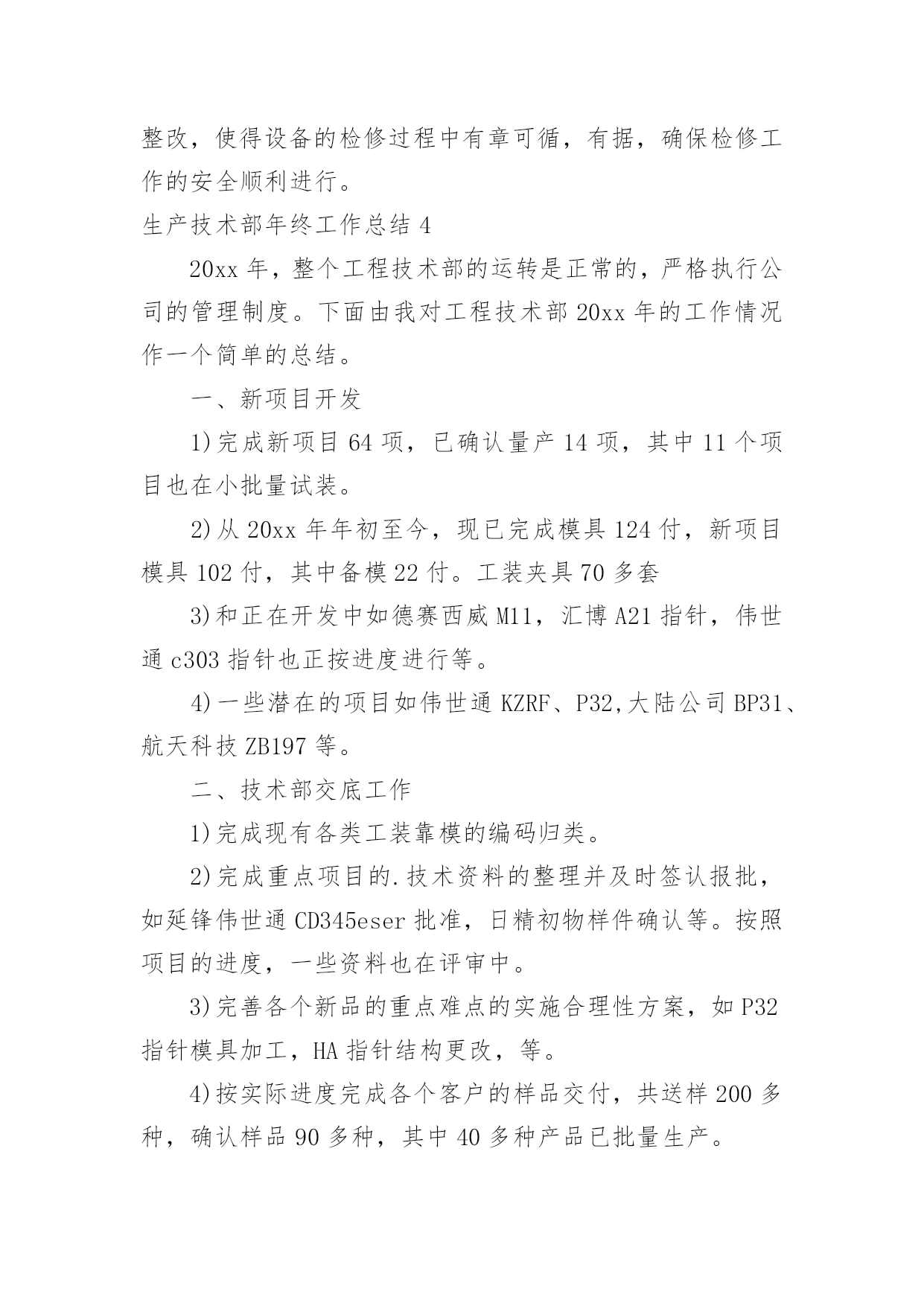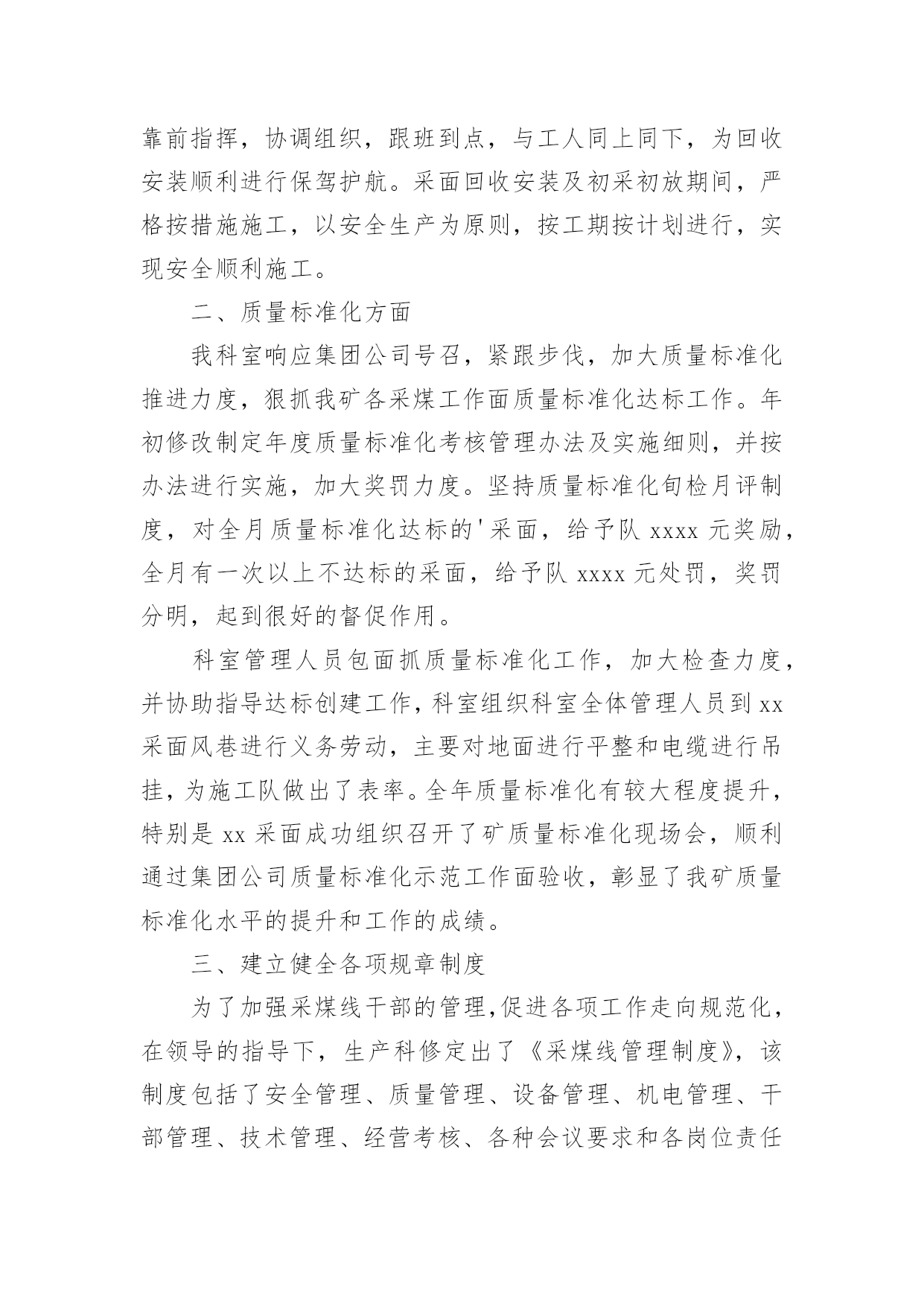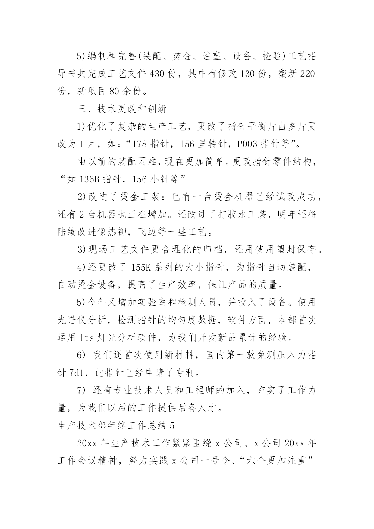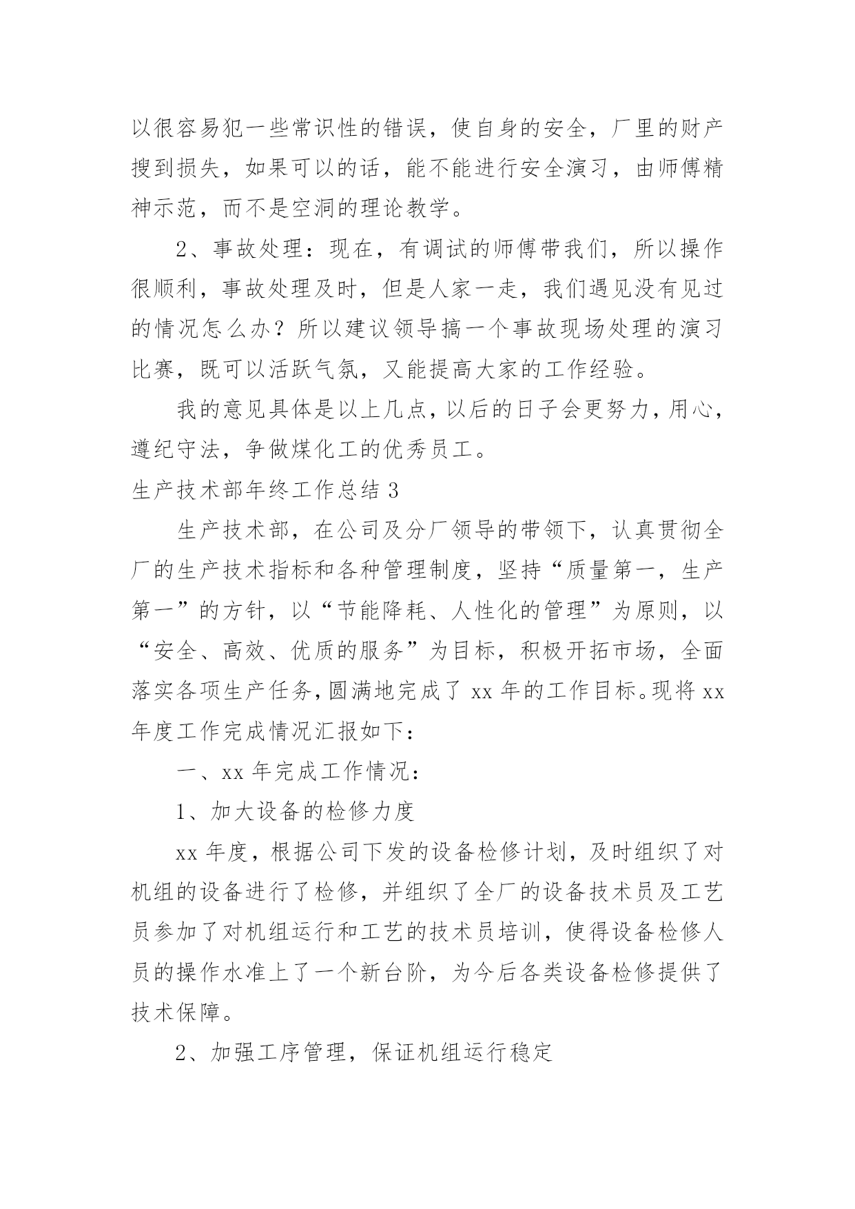 生产技术部年终工作总结生产技术部年终工作总结8篇总结是指对某一阶段的工作、学习或思想中的经验或情况加以总结和概括的书面材料,它可以促使我们思考,是时候写一份总结了。总结一般是怎么写的呢?以下是小编整理的生产技术部年终工作总结,欢迎阅读,希望大家能够喜欢。生产技术部年终工作总结120xx年,生产技术科在相关业务科室的大力配合和协助下,本着“安全第一,预防为主、综合治理”的方针,克服了地质条件复杂,接替失调等重重困难,合理组织生产,最终实现了安全生产。为了更好的完成下一年度工作,现对本年度工作总结如下:一、安全生产情况xx采面地质条件复杂,采面坡度大,断层构造多,对安全生产造成较大影响。生产过程中,始终坚持安全第一的生产方针,加强顶板管理,严格落实过断层措施和滚矸措施,xx采面为煤与瓦斯突出工作面,实施局部瓦斯治理措施,打超前释放孔超前释放瓦斯,取得了良好效果。xx采面在条件异常差的情况下,顺利完成回采任务,并实现安全回采。在采面回收、安装和初采初放期间,矿成立回收安装指挥部,成员由矿领导和业务主管科室管理人员参加,我科主要承担井下现场跟班的任务,在跟班期间,切实负起责任,靠前指挥,协调组织,跟班到点,与工人同上同下,为回收安装顺利进行保驾护航。采面回收安装及初采初放期间,严格按措施施工,以安全生产为原则,按工期按计划进行,实现安全顺利施工。二、质量标准化方面我科室响应集团公司号召,紧跟步伐,加大质量标准化推进力度,狠抓我矿各采煤工作面质量标准化达标工作。年初修改制定年度质量标准化考核管理办法及实施细则,并按办法进行实施,加大奖罚力度。坚持质量标准化旬检月评制度,对全月质量标准化达标的'采面,给予队xxxx元奖励,全月有一次以上不达标的采面,给予队xxxx元处罚,奖罚分明,起到很好的督促作用。科室管理人员包面抓质量标准化工作,加大检查力度,并协助指导达标创建工作,科室组织科室全体管理人员到xx采面风巷进行义务劳动,主要对地面进行平整和电缆进行吊挂,为施工队做出了表率。全年质量标准化有较大程度提升,特别是xx采面成功组织召开了矿质量标准化现场会,顺利通过集团公司质量标准化示范工作面验收,彰显了我矿质量标准化水平的提升和工作的成绩。三、建立健全各项规章制度为了加强采煤线干部的管理,促进各项工作走向规范化,在领导的指导下,生产科修定出了《采煤线管理制度》,该制度包括了安全管理、质量管理、设备管理、机电管理、干部管理、技术管理、经营考核、各种会议要求和各岗位责任制等方面,更加完善了奖励约束机制,并确保在实际工作中的可执行、可操作性。制度下发以后,采煤线各单位都进行了认真的学习,并认真遵守制度,生产科负责落实制度,通过近段时间的执行,战线内部管理更加规范化,促进了工作的有序开展。生产技术部年终工作总结2我叫xx,是热电厂动力车间的一名汽轮机主操,20xx年x月份毕业于xx电力高等专科学校,于x电厂实习一年,现于煤化工汽轮机岗位工作。我的技术总结分两大步,一方面对动力热电厂的一些有建设性的技术该找进行分析,评论,其目的是借鉴思路,改革创性;另一方面是对煤化工现有的工作环境进行讨论,提出自己的意见,使煤化工的发展更有力,更谐和,更加强大。一、xx的建设性意见大家都知道,泵类设备是电厂的动力源泉,在启动之前要使其中充满水,这样才能使溪水高度达到绷得允许真空吸入高度,使泵体不振动,不汽化,从而使其安全运行,当离心泵由于建设安装问题,进水口水面低于其中心轴线时离心泵内就会充满空气,而不会自动满水,因此泵内不能形成足够高的真空也在外界大气压力的作用下吸入理性泵中西,水泵就无法工作,所以必须先干将空气后才能启动,基于这种情况,一般的做法是在离心式水泵启动前坚硬水,但是,这种做法既麻烦又费时,有没有一种简便可行的方法呢?x电厂的无技术员着提出了一种整改方法:在水奔的进口门前家一个真空光。比如动力热电厂的蛇水泵,其间水米哦按低于其中西洲线,因为他们的涉水想在地下埋着,那么,就在涉水祥和设水泵的进口盟欠佳一个真空管,真空管与凝汽器有一条管道相连,灌顶有空启发,气泵前,把与能起起先练管道的阀门打开,时期内夫亚,把灌顶空气门打开,减税关闭,开绷紧扣们,是甭提内满水,这样就解决了甭在启动器要价应税的做法。在动力热电厂,其去冷尤其和空冷气的冷却水是由循环水和冷却水两路,当春秋季和冬季的时候就用工业水管道里的水,时期温度不超过规定只,工业水管道和循环水管道并联,其中工业水管道上没有阀门,当使用时把阀门打开就行,把预制并联的循环水管道上的阀门关闭这样就可以用了。在冬季的时候,因为是热力管道的关系,现场的老鼠比较多,他们要坏电线,造成比较重大的损失,可以使汽轮机跳闸,dcs反映不灵,所以灭鼠工作也是不可忽视的一部分。它山之石,可以攻玉,动力热电厂的这些技术改进,或许我们