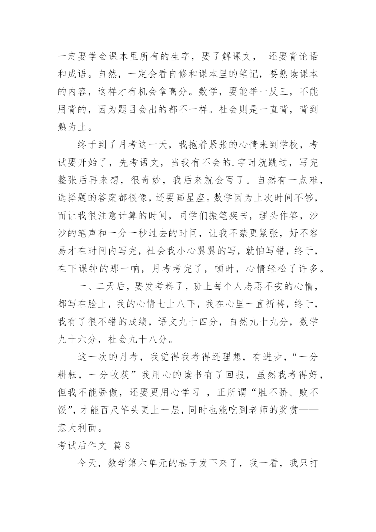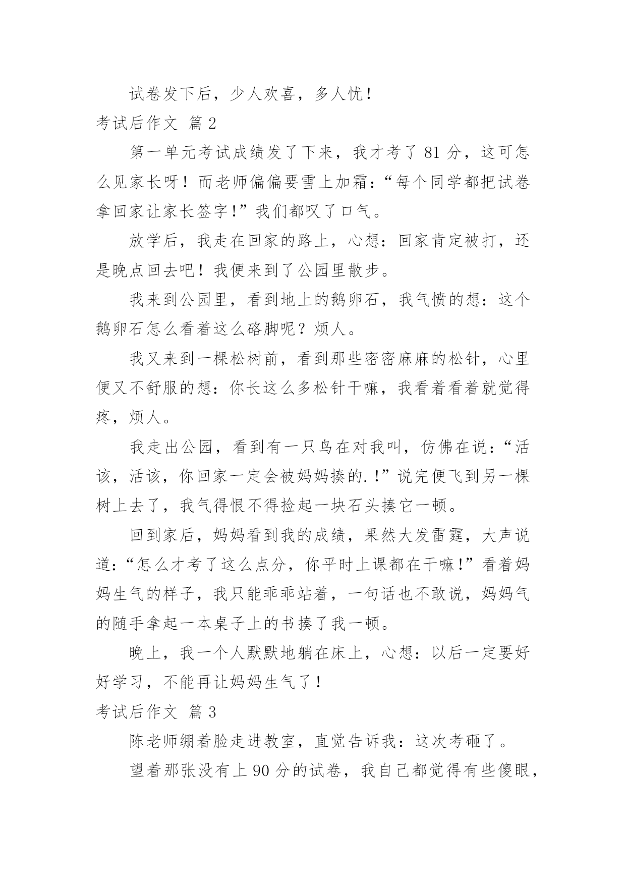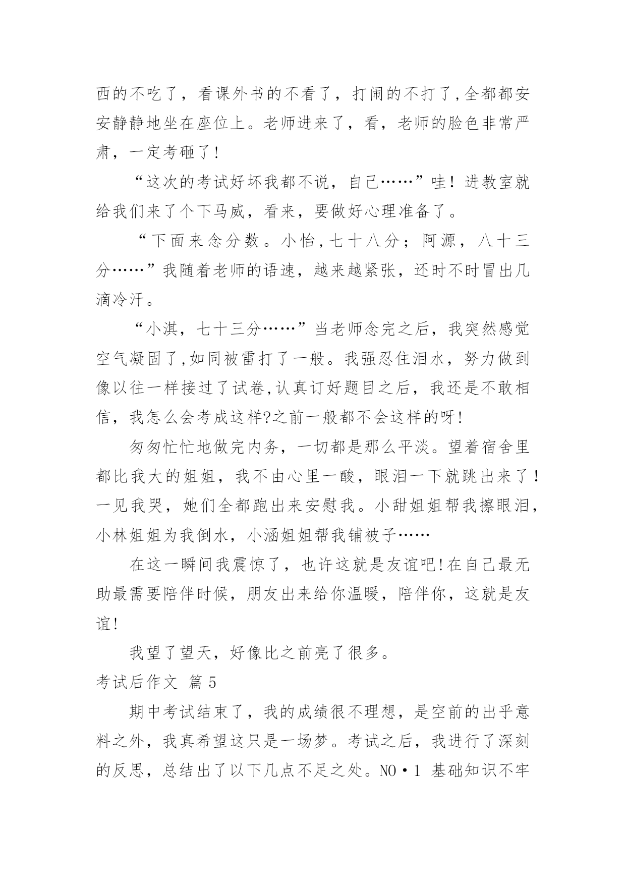 考试后作文考试后作文(8篇)在我们平凡的日常里,许多人都有过写作文的经历,对作文都不陌生吧,作文是人们把记忆中所存储的有关知识、经验和思想用书面形式表达出来的记叙方式。那么你知道一篇好的作文该怎么写吗?下面是小编帮大家整理的考试后作文8篇,希望对大家有所帮助。考试后作文篇1期中考卷发完了,我很伤心,这倒不是因为自己没考好,全都因为同学,大家都不好了,我还高兴得起来吗?如果就我一个人高兴,对心都在滴血的他们无疑是在往伤口是撒盐。看到因分数而闷闷不乐的王吉钦,我小心翼翼地问道:“王吉钦,你考了多少分啊?”谁知,王吉钦摆出一副要跟人吵架的架势,对我吼道:“差!”我一惊,知道刺激了他的怒神经,急忙闪人。“咝啦,咝啦”右边传来一阵撕纸声,我侧头过去一瞧,天哪,冯雨辰像是受到一个坏人的指使似的,疯狂地撕扯自己的作文草稿,也许这就是她的发泄方式吧。又一种不和谐的抽泣声窜进我的`耳朵,再一看王沛楠正伏在桌上哭,哭得面红耳赤。正想关心一下呢,唐徐告诉我:“王沛楠的分数不好,被蔡老师骂了,心情正坏着呢。”我一看试卷,呦,才65分!一想到自己的94,我便嘴角上翘,但将心比心,又连忙收敛笑容。试卷发下后,少人欢喜,多人忧!考试后作文篇2第一单元考试成绩发了下来,我才考了81分,这可怎么见家长呀!而老师偏偏要雪上加霜:“每个同学都把试卷拿回家让家长签字!”我们都叹了口气。放学后,我走在回家的路上,心想:回家肯定被打,还是晚点回去吧!我便来到了公园里散步。我来到公园里,看到地上的鹅卵石,我气愤的想:这个鹅卵石怎么看着这么硌脚呢?烦人。我又来到一棵松树前,看到那些密密麻麻的松针,心里便又不舒服的想:你长这么多松针干嘛,我看着看着就觉得疼,烦人。我走出公园,看到有一只鸟在对我叫,仿佛在说:“活该,活该,你回家一定会被妈妈揍的.!”说完便飞到另一棵树上去了,我气得恨不得捡起一块石头揍它一顿。回到家后,妈妈看到我的成绩,果然大发雷霆,大声说道:“怎么才考了这么点分,你平时上课都在干嘛!”看着妈妈生气的样子,我只能乖乖站着,一句话也不敢说,妈妈气的随手拿起一本桌子上的书揍了我一顿。晚上,我一个人默默地躺在床上,心想:以后一定要好好学习,不能再让妈妈生气了!考试后作文篇3陈老师绷着脸走进教室,直觉告诉我:这次考砸了。望着那张没有上90分的试卷,我自己都觉得有些傻眼,就跟看天书一样,根本不知道那些题目是我答出来的,交卷时还沾沾自喜呢!我的眉头紧绞在一起,心中好似刀割,大脑近乎空白。正思考着回家该怎么开口的'时候,她走过来了,用一种安慰的口吻说道:“一次期中竞赛而已,不必太当真。别再想那个狼狈的分数了!去外面呼吸呼吸新鲜空气吧!老闷在教室里,对身体不好!”说完,还送给我一个招牌微笑。我也象征性地苦笑一下:“可是,你有没有想过,当自己的成绩不理想时,看到别人得意的样子,心中是种什么滋味呢?”四周静悄悄的,时间好像戛然而止,只能听见彼此沉重的呼吸声。场面僵持了数十秒,没有人再说话。“扑哧!”她突然笑了,“我说你怎么这么想不开?你这样难道分数就会上升吗?”她嘟起小嘴,“如果你这样固执,那我就陪你一起发呆吧!”说完,她一屁股坐在我身边。我却把脸转向窗外,盯着那些微微摇曳的树枝——不是真看,而是不愿让她看见我眼中打转的泪珠……考试后作文篇4“在一瞬间有一百万个可能……”踏在小石子路上,我哼着这首歌,回想起一场考试过后,我和朋友之间发生的事。一个风和日丽的早晨,我却要迎接着我们考出来的分数。唉!完了,别说前十了,前三十都不知道有没有呢!我踏着沉重的脚步来到了班级。唉!我知道小宜的成绩,考得好好!偶尔听到几句同学们的闲言杂语,呼——好紧张啊!“咚、咚、咚……”听到老师的'脚步声,教室里吃东西的不吃了,看课外书的不看了,打闹的不打了,全都都安安静静地坐在座位上。老师进来了,看,老师的脸色非常严肃,一定考砸了!“这次的考试好坏我都不说,自己……”哇!进教室就给我们来了个下马威,看来,要做好心理准备了。“下面来念分数。小怡,七十八分;阿源,八十三分……”我随着老师的语速,越来越紧张,还时不时冒出几滴冷汗。“小淇,七十三分……”当老师念完之后,我突然感觉空气凝固了,如同被雷打了一般。我强忍住泪水,努力做到像以往一样接过了试卷,认真订好题目之后,我还是不敢相信,我怎么会考成这样?之前一般都不会这样的呀!匆匆忙忙地做完内务,一切都是那么平淡。望着宿舍里都比我大的姐姐,我不由心里一酸,眼泪一下就跳出来了!一见我哭,她们全都跑出来安慰我。小甜姐姐帮我擦眼泪,小林姐姐为我倒水,小涵姐姐帮我铺被子……在这一瞬间我震惊了,也许这就是友谊吧!在自己最无助最需要陪伴时候,朋友出来给你温暖,陪伴你,这就是友谊!我望了望天,好像比之前亮了很多。考试后作文篇5期中考试结束了,我的成绩很不理想,是空前的出乎意料之