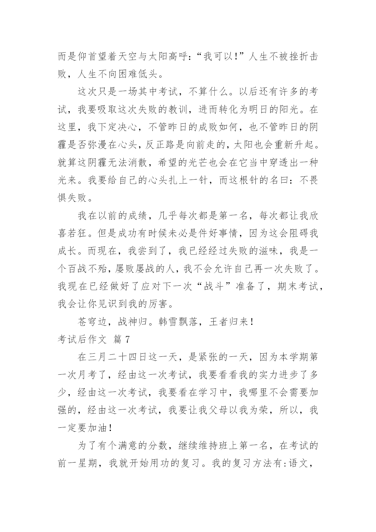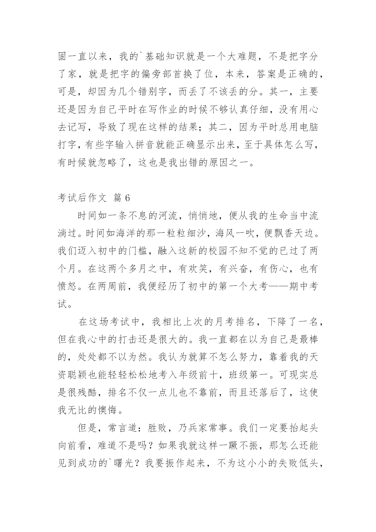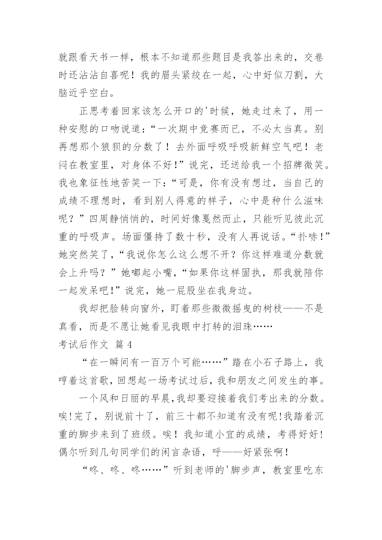 考试后作文考试后作文(8篇)在我们平凡的日常里,许多人都有过写作文的经历,对作文都不陌生吧,作文是人们把记忆中所存储的有关知识、经验和思想用书面形式表达出来的记叙方式。那么你知道一篇好的作文该怎么写吗?下面是小编帮大家整理的考试后作文8篇,希望对大家有所帮助。考试后作文篇1期中考卷发完了,我很伤心,这倒不是因为自己没考好,全都因为同学,大家都不好了,我还高兴得起来吗?如果就我一个人高兴,对心都在滴血的他们无疑是在往伤口是撒盐。看到因分数而闷闷不乐的王吉钦,我小心翼翼地问道:“王吉钦,你考了多少分啊?”谁知,王吉钦摆出一副要跟人吵架的架势,对我吼道:“差!”我一惊,知道刺激了他的怒神经,急忙闪人。“咝啦,咝啦”右边传来一阵撕纸声,我侧头过去一瞧,天哪,冯雨辰像是受到一个坏人的指使似的,疯狂地撕扯自己的作文草稿,也许这就是她的发泄方式吧。又一种不和谐的抽泣声窜进我的`耳朵,再一看王沛楠正伏在桌上哭,哭得面红耳赤。正想关心一下呢,唐徐告诉我:“王沛楠的分数不好,被蔡老师骂了,心情正坏着呢。”我一看试卷,呦,才65分!一想到自己的94,我便嘴角上翘,但将心比心,又连忙收敛笑容。试卷发下后,少人欢喜,多人忧!考试后作文篇2第一单元考试成绩发了下来,我才考了81分,这可怎么见家长呀!而老师偏偏要雪上加霜:“每个同学都把试卷拿回家让家长签字!”我们都叹了口气。放学后,我走在回家的路上,心想:回家肯定被打,还是晚点回去吧!我便来到了公园里散步。我来到公园里,看到地上的鹅卵石,我气愤的想:这个鹅卵石怎么看着这么硌脚呢?烦人。我又来到一棵松树前,看到那些密密麻麻的松针,心里便又不舒服的想:你长这么多松针干嘛,我看着看着就觉得疼,烦人。我走出公园,看到有一只鸟在对我叫,仿佛在说:“活该,活该,你回家一定会被妈妈揍的.!”说完便飞到另一棵树上去了,我气得恨不得捡起一块石头揍它一顿。回到家后,妈妈看到我的成绩,果然大发雷霆,大声说道:“怎么才考了这么点分,你平时上课都在干嘛!”看着妈妈生气的样子,我只能乖乖站着,一句话也不敢说,妈妈气的随手拿起一本桌子上的书揍了我一顿。晚上,我一个人默默地躺在床上,心想:以后一定要好好学习,不能再让妈妈生气了!考试后作文篇3陈老师绷着脸走进教室,直觉告诉我:这次考砸了。望着那张没有上90分的试卷,我自己都觉得有些傻眼,就跟看天书一样,根本不知道那些题目是我答出来的,交卷时还沾沾自喜呢!我的眉头紧绞在一起,心中好似刀割,大脑近乎空白。正思考着回家该怎么开口的'时候,她走过来了,用一种安慰的口吻说道:“一次期中竞赛而已,不必太当真。别再想那个狼狈的分数了!去外面呼吸呼吸新鲜空气吧!老闷在教室里,对身体不好!”说完,还送给我一个招牌微笑。我也象征性地苦笑一下:“可是,你有没有想过,当自己的成绩不理想时,看到别人得意的样子,心中是种什么滋味呢?”四周静悄悄的,时间好像戛然而止,只能听见彼此沉重的呼吸声。场面僵持了数十秒,没有人再说话。“扑哧!”她突然笑了,“我说你怎么这么想不开?你这样难道分数就会上升吗?”她嘟起小嘴,“如果你这样固执,那我就陪你一起发呆吧!”说完,她一屁股坐在我身边。我却把脸转向窗外,盯着那些微微摇曳的树枝——不是真看,而是不愿让她看见我眼中打转的泪珠……考试后作文篇4“在一瞬间有一百万个可能……”踏在小石子路上,我哼着这首歌,回想起一场考试过后,我和朋友之间发生的事。一个风和日丽的早晨,我却要迎接着我们考出来的分数。唉!完了,别说前十了,前三十都不知道有没有呢!我踏着沉重的脚步来到了班级。唉!我知道小宜的成绩,考得好好!偶尔听到几句同学们的闲言杂语,呼——好紧张啊!“咚、咚、咚……”听到老师的'脚步声,教室里吃东西的不吃了,看课外书的不看了,打闹的不打了,全都都安安静静地坐在座位上。老师进来了,看,老师的脸色非常严肃,一定考砸了!“这次的考试好坏我都不说,自己……”哇!进教室就给我们来了个下马威,看来,要做好心理准备了。“下面来念分数。小怡,七十八分;阿源,八十三分……”我随着老师的语速,越来越紧张,还时不时冒出几滴冷汗。“小淇,七十三分……”当老师念完之后,我突然感觉空气凝固了,如同被雷打了一般。我强忍住泪水,努力做到像以往一样接过了试卷,认真订好题目之后,我还是不敢相信,我怎么会考成这样?之前一般都不会这样的呀!匆匆忙忙地做完内务,一切都是那么平淡。望着宿舍里都比我大的姐姐,我不由心里一酸,眼泪一下就跳出来了!一见我哭,她们全都跑出来安慰我。小甜姐姐帮我擦眼泪,小林姐姐为我倒水,小涵姐姐帮我铺被子……在这一瞬间我震惊了,也许这就是友谊吧!在自己最无助最需要陪伴时候,朋友出来给你温暖,陪伴你,这就是友谊!我望了望天,好像比之前亮了很多。考试后作文篇5期中考试结束了,我的成绩很不理想,是空前的出乎意料之
