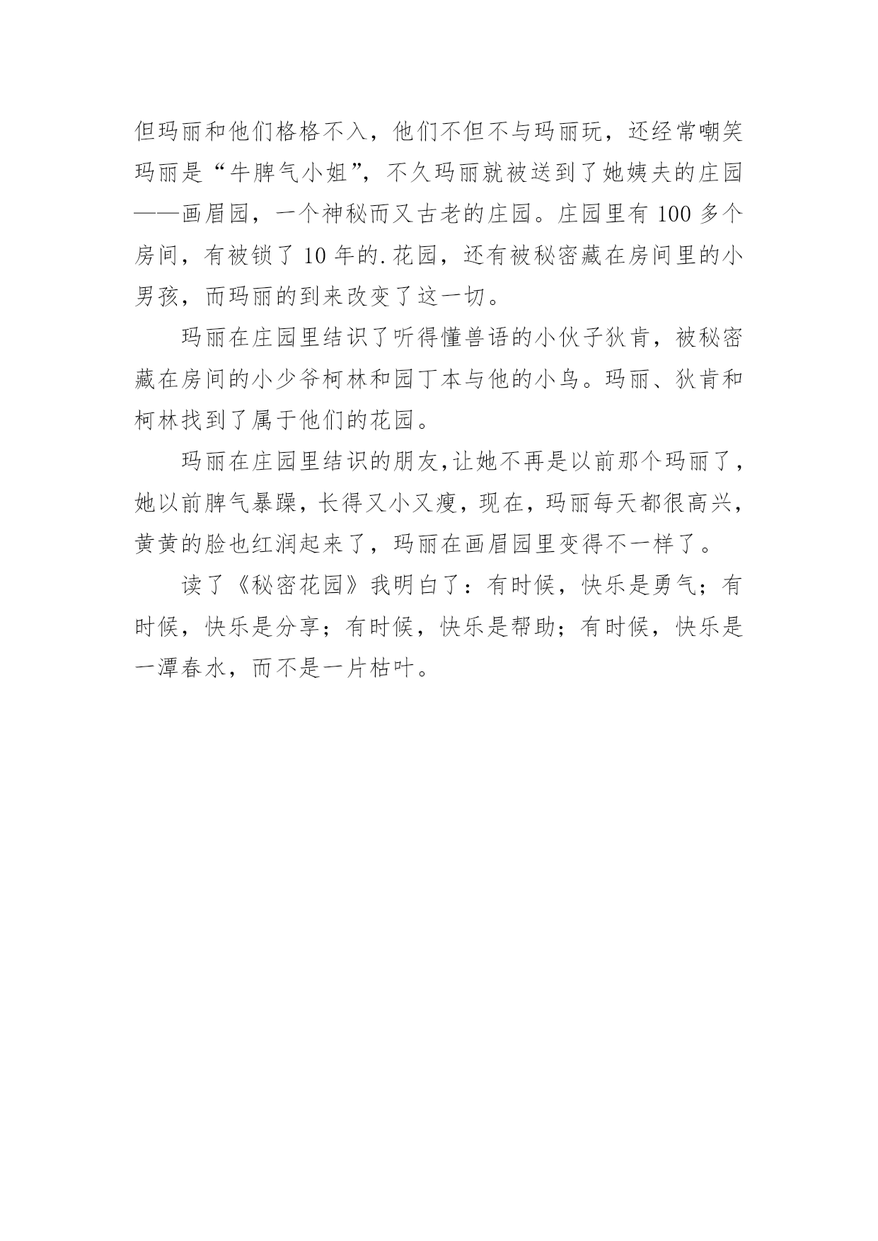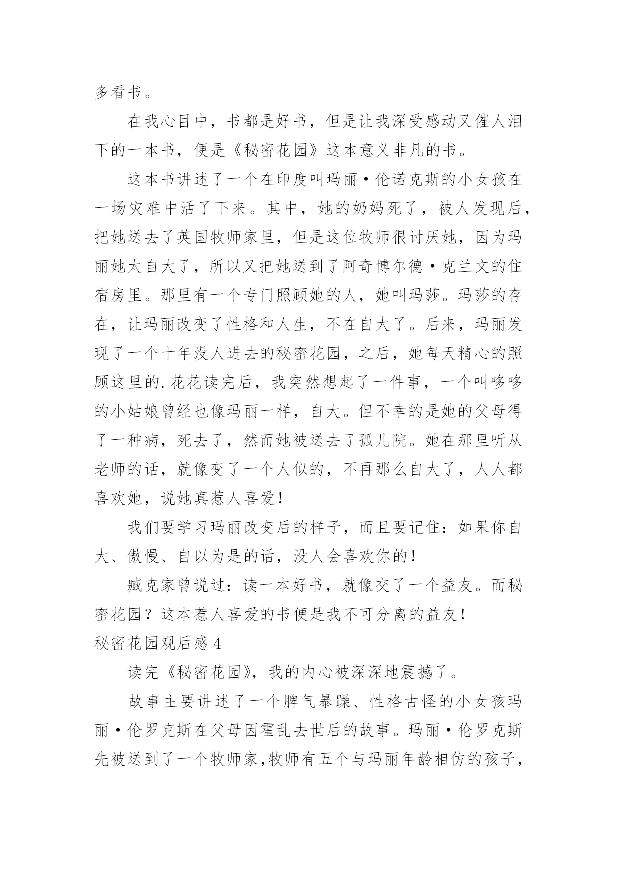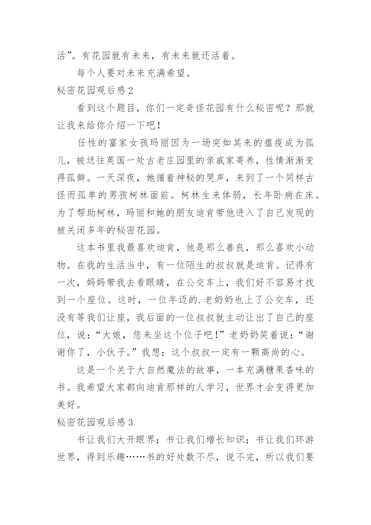 秘密花园观后感秘密花园观后感细细品味一部作品以后,从中我们收获新的思想,需要回过头来写一写观后感了。到底应如何写观后感呢?以下是小编精心整理的秘密花园观后感,欢迎大家借鉴与参考,希望对大家有所帮助。秘密花园观后感1今天我看了>,它主要写:玛丽的父亲在一场霍乱中丧生,她被从印度送回英国约克郡的密素斯庄园,和性情古怪的姨夫一起生活。于是,从小被父母疏远,一直放任自流、任性而自私的小玛丽,在神秘、古怪、阴沉的大房子里被无助包围了。多亏知更鸟引路,玛丽闯入了一个禁闭已久的花园。当被痛苦、绝望折磨的姨夫听从早已经去世的.妻子的神秘召唤,重回花园时,他也找到了开启从前的钥匙。我印象最深的句子是:一个炎热的下午,她醒来时心烦,当看见没人站在她床边。我有过这样的遭遇,一天早上,我一醒来,一到客厅,一个人的踪影没有,我心里很害怕,后来才知道父母出去开会了。孩子们一起坚守着花园的秘密,其实就是呵护着对快乐的希望。快乐与痛苦不一样,需要坚韧的坚持。美好的童年一样,是一把开启快乐的钥匙,可以帮助人从沮丧中“复活”。有花园就有未来,有未来就还活着。每个人要对未来充满希望。秘密花园观后感2看到这个题目,你们一定奇怪花园有什么秘密呢?那就让我来给你介绍一下吧!任性的富家女孩玛丽因为一场突如其来的瘟疫成为孤儿,被送往英国一处古老庄园里的亲戚家寄养,性情渐渐变得孤僻。一天深夜,她循着神秘的哭声,来到了一个同样古怪而孤单的男孩柯林面前。柯林生来体弱,长年卧病在床。为了帮助柯林,玛丽和她的朋友迪肯带他进入了自己发现的被关闭多年的秘密花园。这本书里我最喜欢迪肯,他是那么善良,那么喜欢小动物。在我的生活当中,有一位陌生的叔叔就是迪肯。记得有一次,妈妈带我去看眼睛,在公交车上,我们好不容易才找到一个座位。这时,一位年迈的.老奶奶也上了公交车,还没有等我们让座,我后面的一位叔叔就主动让出了自己的座位,说:“大娘,您来坐这个位子吧!”老奶奶笑着说:“谢谢你了,小伙子。”我想:这个叔叔一定有一颗高尚的心。这是一个关于大自然魔法的故事,一本充满糖果香味的书。我希望大家都向迪肯那样的人学习,世界才会变得更加美好。秘密花园观后感3书让我们大开眼界;书让我们增长知识;书让我们环游世界,得到乐趣……书的好处数不尽,说不完,所以我们要多看书。在我心目中,书都是好书,但是让我深受感动又催人泪下的一本书,便是《秘密花园》这本意义非凡的书。这本书讲述了一个在印度叫玛丽·伦诺克斯的小女孩在一场灾难中活了下来。其中,她的奶妈死了,被人发现后,把她送去了英国牧师家里,但是这位牧师很讨厌她,因为玛丽她太自大了,所以又把她送到了阿奇博尔德·克兰文的住宿房里。那里有一个专门照顾她的人,她叫玛莎。玛莎的存在,让玛丽改变了性格和人生,不在自大了。后来,玛丽发现了一个十年没人进去的秘密花园,之后,她每天精心的照顾这里的.花花读完后,我突然想起了一件事,一个叫哆哆的小姑娘曾经也像玛丽一样,自大。但不幸的是她的父母得了一种病,死去了,然而她被送去了孤儿院。她在那里听从老师的话,就像变了一个人似的,不再那么自大了,人人都喜欢她,说她真惹人喜爱!我们要学习玛丽改变后的样子,而且要记住:如果你自大、傲慢、自以为是的话,没人会喜欢你的!臧克家曾说过:读一本好书,就像交了一个益友。而秘密花园?这本惹人喜爱的书便是我不可分离的益友!秘密花园观后感4读完《秘密花园》,我的内心被深深地震撼了。故事主要讲述了一个脾气暴躁、性格古怪的小女孩玛丽·伦罗克斯在父母因霍乱去世后的故事。玛丽·伦罗克斯先被送到了一个牧师家,牧师有五个与玛丽年龄相仿的孩子,但玛丽和他们格格不入,他们不但不与玛丽玩,还经常嘲笑玛丽是“牛脾气小姐”,不久玛丽就被送到了她姨夫的庄园——画眉园,一个神秘而又古老的庄园。庄园里有100多个房间,有被锁了10年的.花园,还有被秘密藏在房间里的小男孩,而玛丽的到来改变了这一切。玛丽在庄园里结识了听得懂兽语的小伙子狄肯,被秘密藏在房间的小少爷柯林和园丁本与他的小鸟。玛丽、狄肯和柯林找到了属于他们的花园。玛丽在庄园里结识的朋友,让她不再是以前那个玛丽了,她以前脾气暴躁,长得又小又瘦,现在,玛丽每天都很高兴,黄黄的脸也红润起来了,玛丽在画眉园里变得不一样了。读了《秘密花园》我明白了:有时候,快乐是勇气;有时候,快乐是分享;有时候,快乐是帮助;有时候,快乐是一潭春水,而不是一片枯叶。