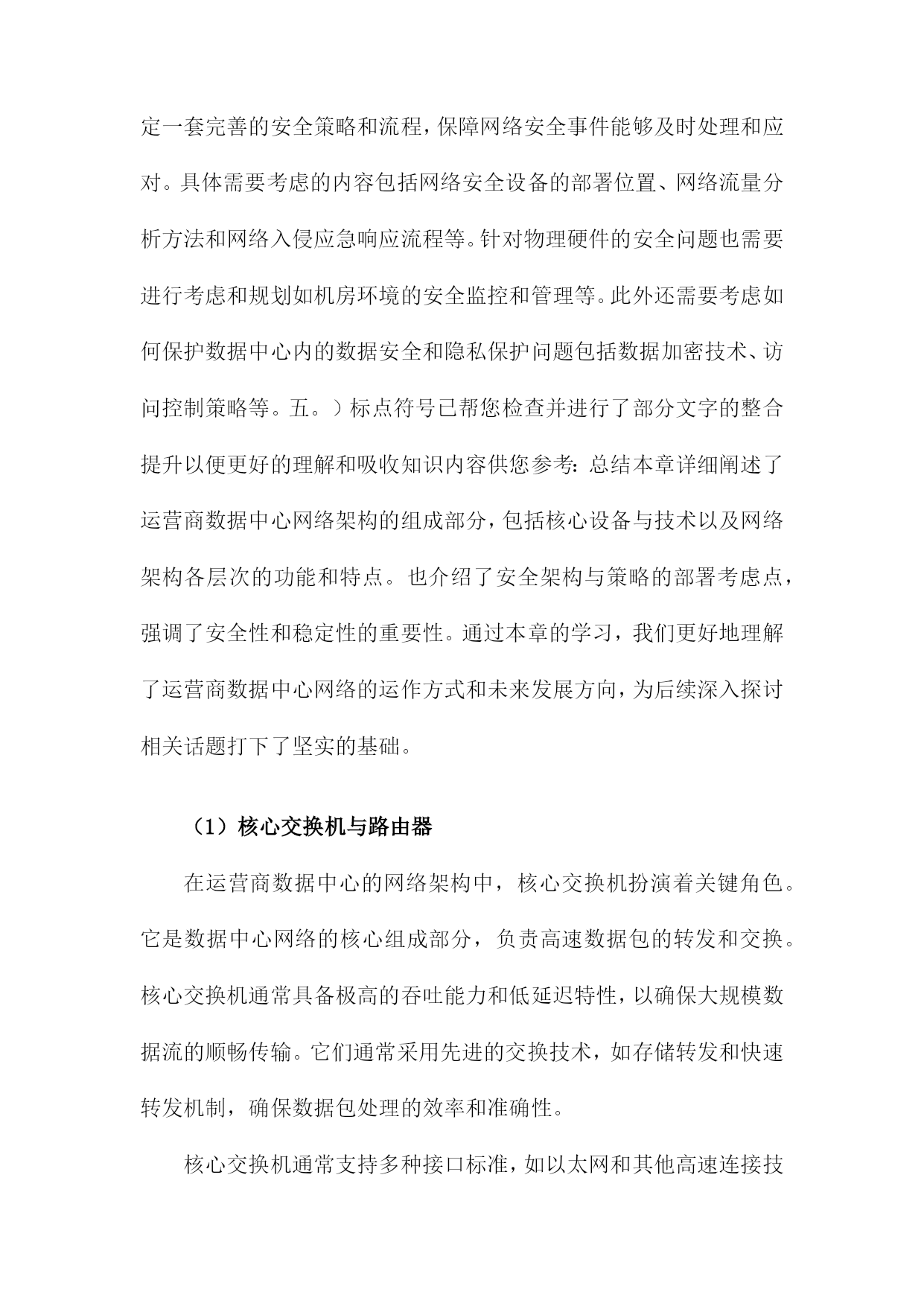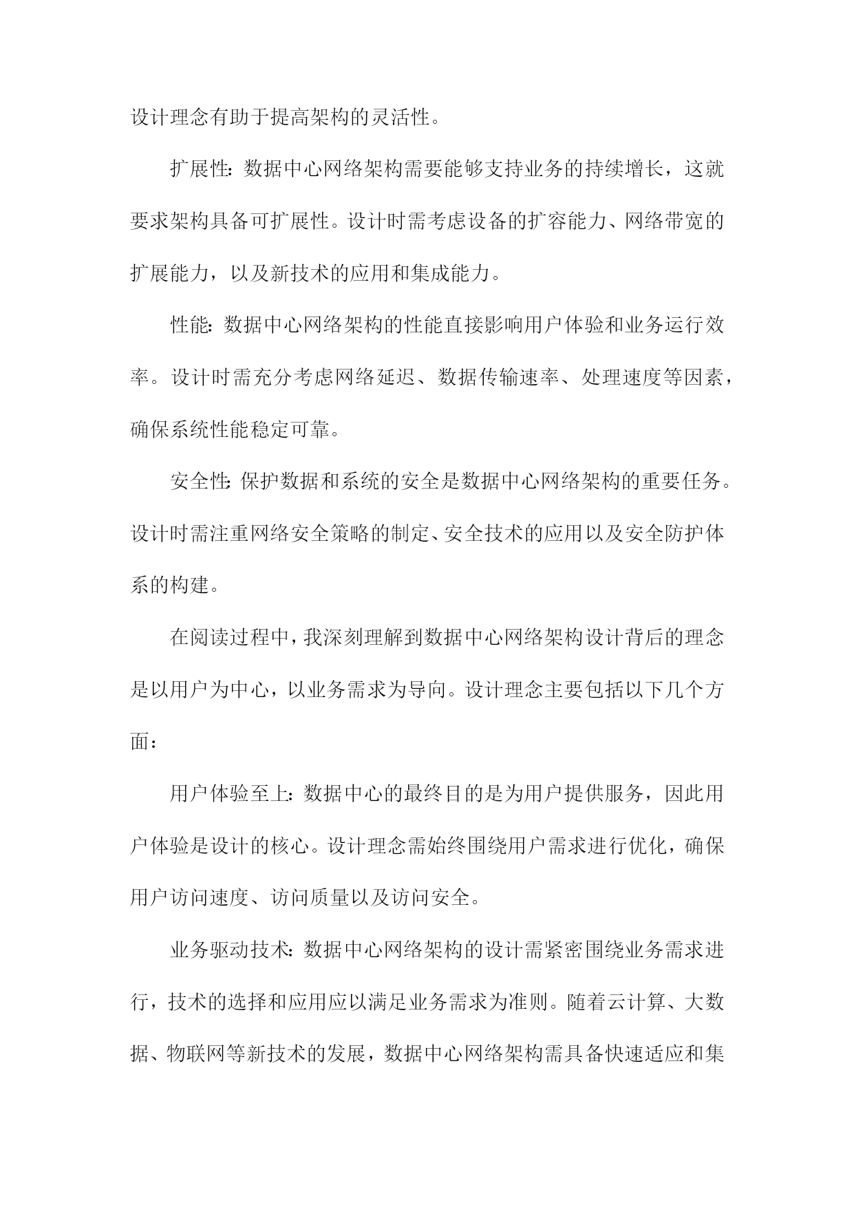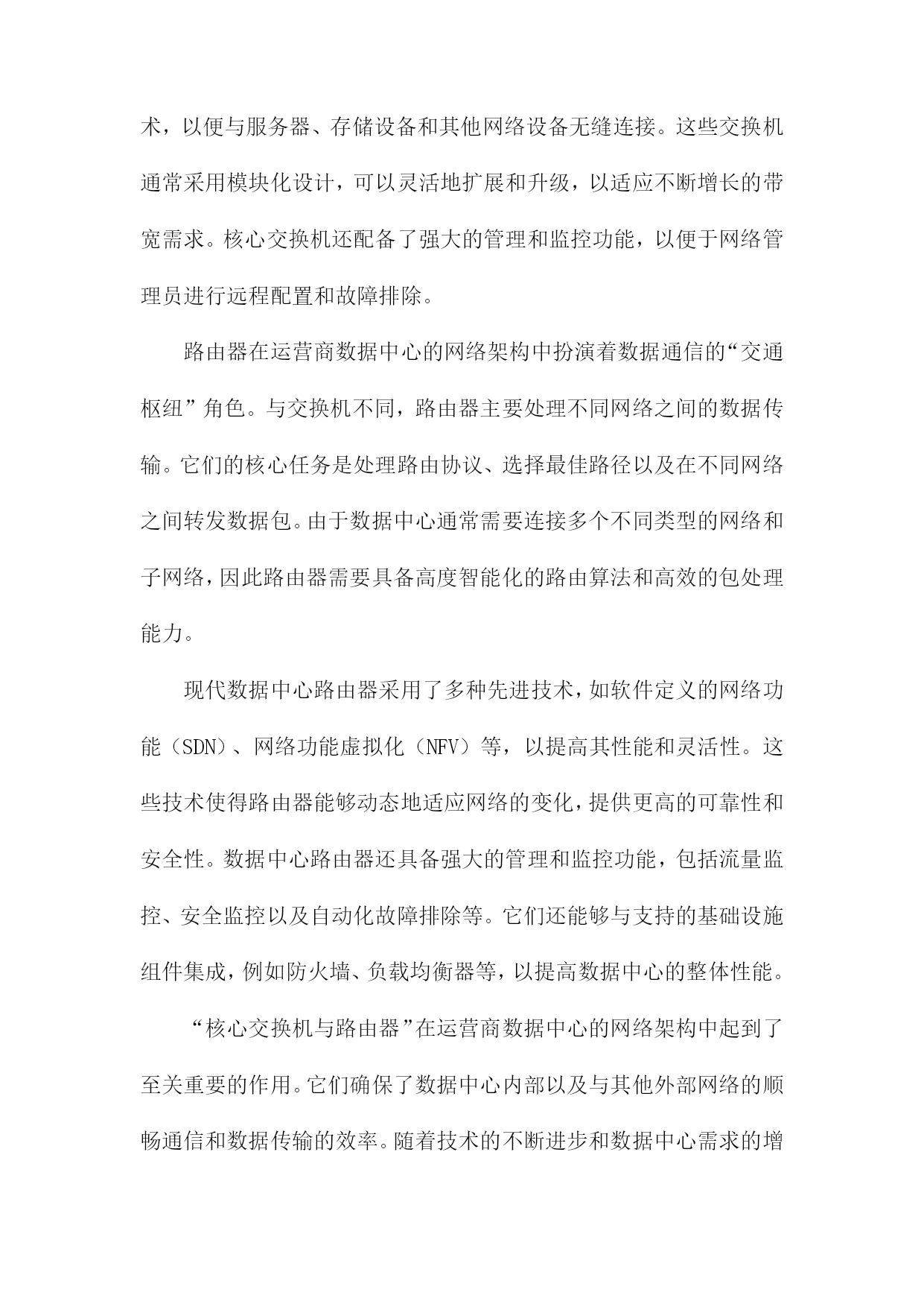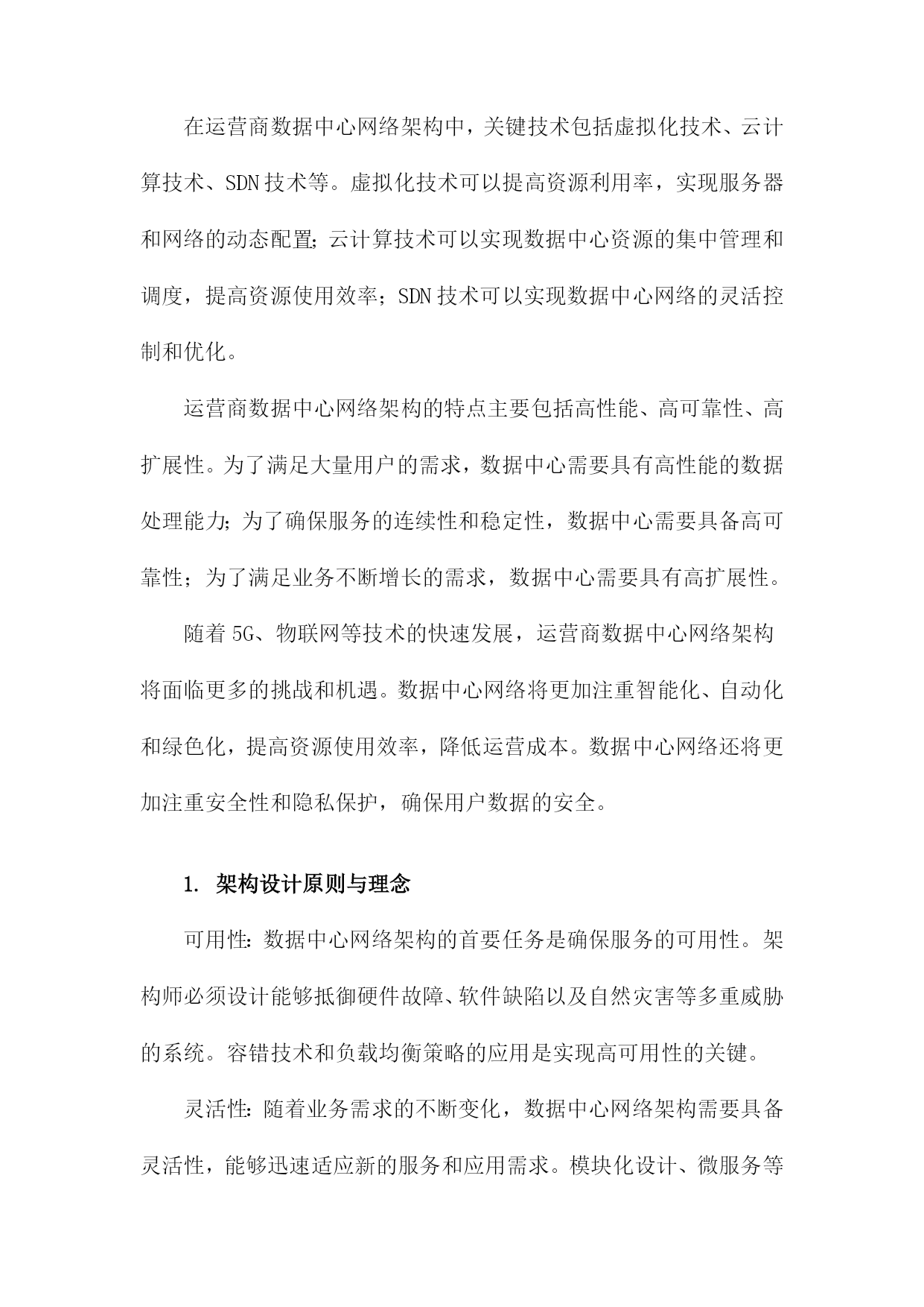 《运营商数据中心网络架构与技术》阅读笔记一、内容概览《运营商数据中心网络架构与技术》一书全面深入地探讨了运营商数据中心网络架构的设计、构建及技术应用。在阅读过程中,我整理了一份阅读笔记,该笔记概述了书中各个关键部分的主要内容。数据中心网络架构的演变和发展趋势。书中详细分析了传统数据中心网络架构的局限性以及当前和未来的发展方向,阐述了网络架构在云计算、大数据、物联网等新一代信息技术中的应用和挑战。数据中心网络设备与技术。这部分介绍了交换机、路由器等网络设备在数据中心网络中的作用,同时深入探讨了软件定义网络技术(SDN)、网络功能虚拟化(NFV)等新技术在数据中心的应用及其优势。数据中心的网络安全和可靠性保障技术。书中强调了网络安全和可靠性在现代数据中心的重要性,并详细讲解了防火墙、入侵检测系统等网络安全技术的实施,以及数据中心的高可用性设计原则和策略。数据中心的绿色节能技术和智能化管理。随着数据中心的规模不断扩大,能耗问题日益突出,书中对绿色节能数据中心的构建理念进行了深入探讨,同时介绍了智能化管理在提高数据中心运营效率方面的应用和实践。书中还涵盖了数据中心网络的运维管理、服务质量控制等方面的内容,并对未来运营商数据中心的发展趋势进行了展望。《运营商数据中心网络架构与技术》一书涵盖了数据中心的各个方面,为读者提供了一个全面、深入的了解运营商数据中心网络架构与技术的平台。二、数据中心概述数据中心是一种集中放置大量计算机设备和服务器,通过高速网络互联,用于处理、存储和分发大规模数据的场所。数据中心的主要作用是为企业、组织或运营商提供可靠、高效的数据处理、存储及访问服务。随着信息技术的飞速发展,数据中心已经成为支撑各种业务运营的重要基础设施。在运营商的数据中心中,其网络架构扮演着至关重要的角色。运营商数据中心网络架构需要满足大规模数据处理、高可用性、高扩展性、高性能以及网络安全等需求。为了实现这些目标,运营商通常会采用先进的网络技术、设备和解决方案来构建和优化其数据中心网络。汇聚层:对接入层的数据进行汇聚,执行一些基本的流量管理和安全控制。核心层:作为数据中心网络的高速交通枢纽,负责高速数据传输和路由。服务层:提供各类服务,如存储、计算、分析等,满足用户和业务的需求。数据中心还需要考虑容灾备份、网络安全、设备管理等问题。为了实现这些功能,运营商通常会采用虚拟化、云计算、SDN(软件定义网络)等先进技术来优化数据中心的网络架构,提高数据中心的可靠性和性能。数据中心是运营商业务运营的重要支撑设施,其网络架构的合理性、先进性直接影响到运营商的业务发展和用户体验。对运营商而言,研究和优化数据中心的网络架构与技术是至关重要的。三、运营商数据中心网络架构随着信息技术的快速发展,运营商数据中心作为互联网基础设施的重要组成部分,其网络架构的设计与技术实现显得尤为重要。运营商数据中心网络架构的优劣直接影响到数据中心的性能、可靠性和扩展性。运营商数据中心网络架构主要包括核心层、汇聚层、接入层等层次。核心层负责高速数据交换和路由,汇聚层实现数据的集中处理和存储,接入层则负责用户接入和访问控制。这些层次相互协作,共同构成了一个高效、可靠的数据中心网络系统。在运营商数据中心网络架构中,关键技术包括虚拟化技术、云计算技术、SDN技术等。虚拟化技术可以提高资源利用率,实现服务器和网络的动态配置;云计算技术可以实现数据中心资源的集中管理和调度,提高资源使用效率;SDN技术可以实现数据中心网络的灵活控制和优化。运营商数据中心网络架构的特点主要包括高性能、高可靠性、高扩展性。为了满足大量用户的需求,数据中心需要具有高性能的数据处理能力;为了确保服务的连续性和稳定性,数据中心需要具备高可靠性;为了满足业务不断增长的需求,数据中心需要具有高扩展性。随着5G、物联网等技术的快速发展,运营商数据中心网络架构将面临更多的挑战和机遇。数据中心网络将更加注重智能化、自动化和绿色化,提高资源使用效率,降低运营成本。数据中心网络还将更加注重安全性和隐私保护,确保用户数据的安全。1.架构设计原则与理念可用性:数据中心网络架构的首要任务是确保服务的可用性。架构师必须设计能够抵御硬件故障、软件缺陷以及自然灾害等多重威胁的系统。容错技术和负载均衡策略的应用是实现高可用性的关键。灵活性:随着业务需求的不断变化,数据中心网络架构需要具备灵活性,能够迅速适应新的服务和应用需求。模块化设计、微服务等设计理念有助于提高架构的灵活性。扩展性:数据中心网络架构需要能够支持业务的持续增长,这就要求架构具备可扩展性。设计时需考虑设备的扩容能力、网络带宽的扩展能力,以及新技术的应用和集成能力。性能:数据中心网络架构的性能直接影响用户体验和业务运行效率。设计时需充分