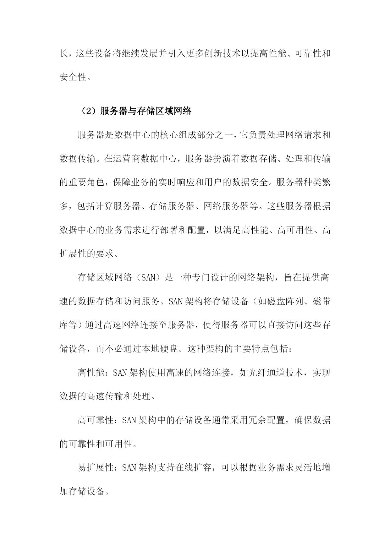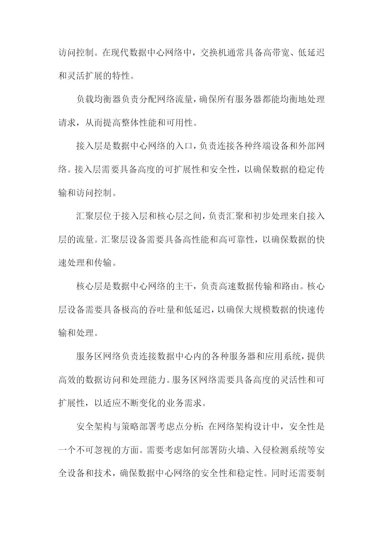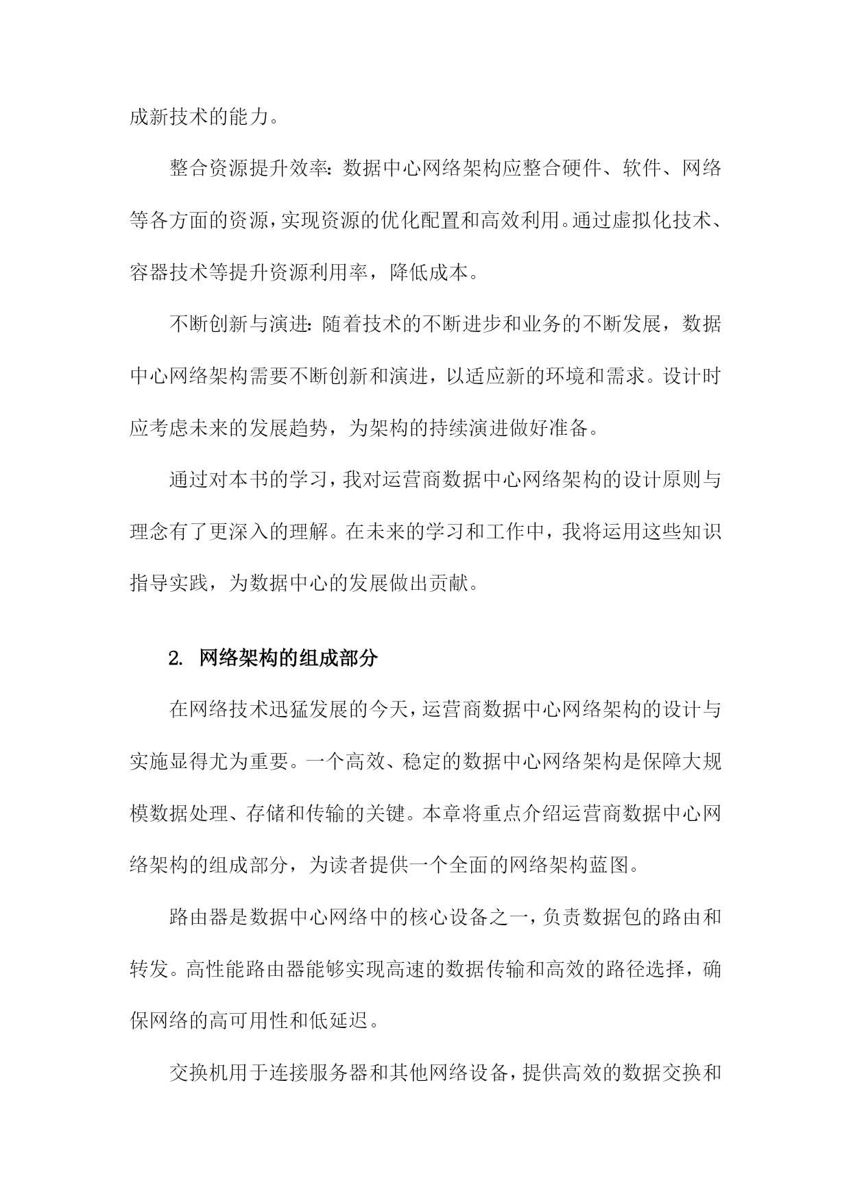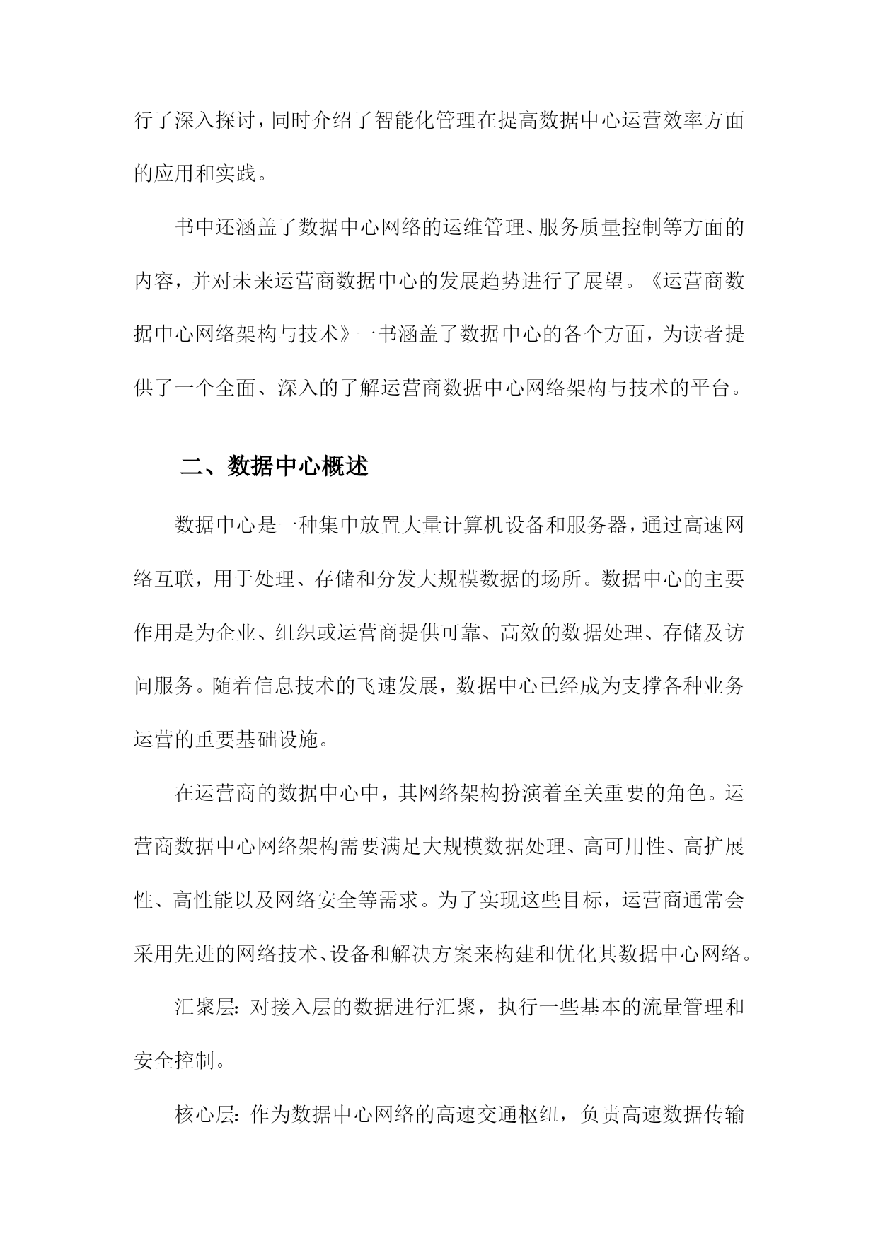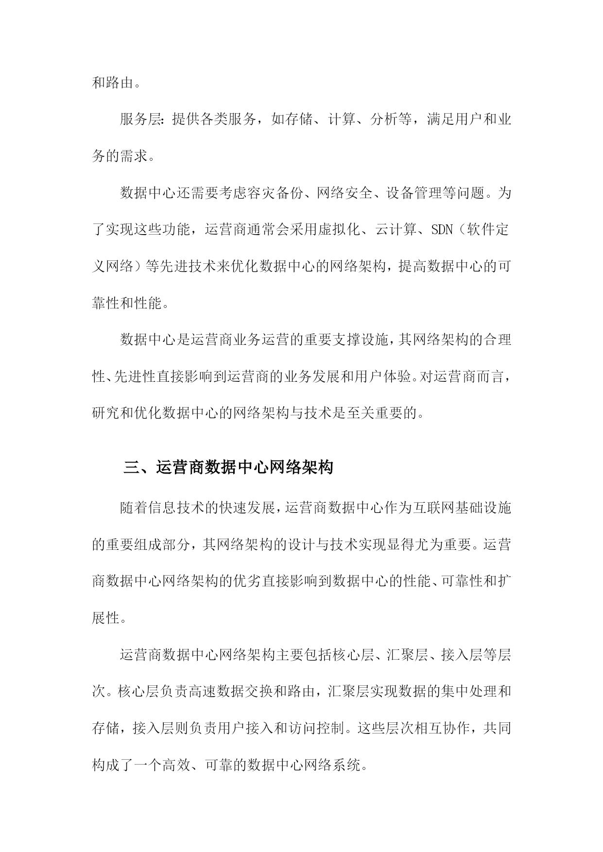 《运营商数据中心网络架构与技术》阅读笔记一、内容概览《运营商数据中心网络架构与技术》一书全面深入地探讨了运营商数据中心网络架构的设计、构建及技术应用。在阅读过程中,我整理了一份阅读笔记,该笔记概述了书中各个关键部分的主要内容。数据中心网络架构的演变和发展趋势。书中详细分析了传统数据中心网络架构的局限性以及当前和未来的发展方向,阐述了网络架构在云计算、大数据、物联网等新一代信息技术中的应用和挑战。数据中心网络设备与技术。这部分介绍了交换机、路由器等网络设备在数据中心网络中的作用,同时深入探讨了软件定义网络技术(SDN)、网络功能虚拟化(NFV)等新技术在数据中心的应用及其优势。数据中心的网络安全和可靠性保障技术。书中强调了网络安全和可靠性在现代数据中心的重要性,并详细讲解了防火墙、入侵检测系统等网络安全技术的实施,以及数据中心的高可用性设计原则和策略。数据中心的绿色节能技术和智能化管理。随着数据中心的规模不断扩大,能耗问题日益突出,书中对绿色节能数据中心的构建理念进行了深入探讨,同时介绍了智能化管理在提高数据中心运营效率方面的应用和实践。书中还涵盖了数据中心网络的运维管理、服务质量控制等方面的内容,并对未来运营商数据中心的发展趋势进行了展望。《运营商数据中心网络架构与技术》一书涵盖了数据中心的各个方面,为读者提供了一个全面、深入的了解运营商数据中心网络架构与技术的平台。二、数据中心概述数据中心是一种集中放置大量计算机设备和服务器,通过高速网络互联,用于处理、存储和分发大规模数据的场所。数据中心的主要作用是为企业、组织或运营商提供可靠、高效的数据处理、存储及访问服务。随着信息技术的飞速发展,数据中心已经成为支撑各种业务运营的重要基础设施。在运营商的数据中心中,其网络架构扮演着至关重要的角色。运营商数据中心网络架构需要满足大规模数据处理、高可用性、高扩展性、高性能以及网络安全等需求。为了实现这些目标,运营商通常会采用先进的网络技术、设备和解决方案来构建和优化其数据中心网络。汇聚层:对接入层的数据进行汇聚,执行一些基本的流量管理和安全控制。核心层:作为数据中心网络的高速交通枢纽,负责高速数据传输和路由。服务层:提供各类服务,如存储、计算、分析等,满足用户和业务的需求。数据中心还需要考虑容灾备份、网络安全、设备管理等问题。为了实现这些功能,运营商通常会采用虚拟化、云计算、SDN(软件定义网络)等先进技术来优化数据中心的网络架构,提高数据中心的可靠性和性能。数据中心是运营商业务运营的重要支撑设施,其网络架构的合理性、先进性直接影响到运营商的业务发展和用户体验。对运营商而言,研究和优化数据中心的网络架构与技术是至关重要的。三、运营商数据中心网络架构随着信息技术的快速发展,运营商数据中心作为互联网基础设施的重要组成部分,其网络架构的设计与技术实现显得尤为重要。运营商数据中心网络架构的优劣直接影响到数据中心的性能、可靠性和扩展性。运营商数据中心网络架构主要包括核心层、汇聚层、接入层等层次。核心层负责高速数据交换和路由,汇聚层实现数据的集中处理和存储,接入层则负责用户接入和访问控制。这些层次相互协作,共同构成了一个高效、可靠的数据中心网络系统。在运营商数据中心网络架构中,关键技术包括虚拟化技术、云计算技术、SDN技术等。虚拟化技术可以提高资源利用率,实现服务器和网络的动态配置;云计算技术可以实现数据中心资源的集中管理和调度,提高资源使用效率;SDN技术可以实现数据中心网络的灵活控制和优化。运营商数据中心网络架构的特点主要包括高性能、高可靠性、高扩展性。为了满足大量用户的需求,数据中心需要具有高性能的数据处理能力;为了确保服务的连续性和稳定性,数据中心需要具备高可靠性;为了满足业务不断增长的需求,数据中心需要具有高扩展性。随着5G、物联网等技术的快速发展,运营商数据中心网络架构将面临更多的挑战和机遇。数据中心网络将更加注重智能化、自动化和绿色化,提高资源使用效率,降低运营成本。数据中心网络还将更加注重安全性和隐私保护,确保用户数据的安全。1.架构设计原则与理念可用性:数据中心网络架构的首要任务是确保服务的可用性。架构师必须设计能够抵御硬件故障、软件缺陷以及自然灾害等多重威胁的系统。容错技术和负载均衡策略的应用是实现高可用性的关键。灵活性:随着业务需求的不断变化,数据中心网络架构需要具备灵活性,能够迅速适应新的服务和应用需求。模块化设计、微服务等设计理念有助于提高架构的灵活性。扩展性:数据中心网络架构需要能够支持业务的持续增长,这就要求架构具备可扩展性。设计时需考虑设备的扩容能力、网络带宽的扩展能力,以及新技术的应用和集成能力。性能:数据中心网络架构的性能直接影响用户体验和业务运行效率。设计时需充分