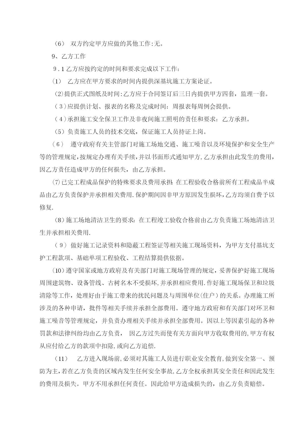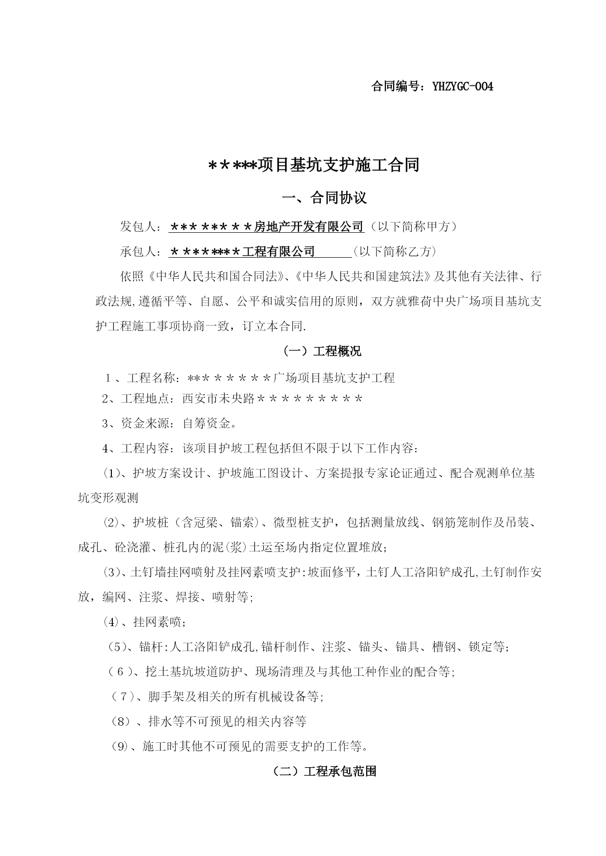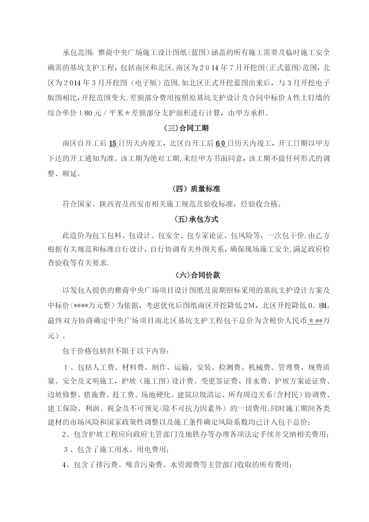 基坑支护合同3(完整资料)(可以直接使用,可编辑优秀版资料,欢迎下载)合同编号:YHZYGC-004*****项目基坑支护施工合同一、合同协议发包人:********房地产开发有限公司(以下简称甲方)承包人:********工程有限公司(以下简称乙方)依照《中华人民共和国合同法》、《中华人民共和国建筑法》及其他有关法律、行政法规,遵循平等、自愿、公平和诚实信用的原则,双方就雅荷中央广场项目基坑支护工程施工事项协商一致,订立本合同.(一)工程概况1、工程名称:********广场项目基坑支护工程2、工程地点:西安市未央路*********3、资金来源:自筹资金。4、工程内容:该项目护坡工程包括但不限于以下工作内容:(1)、护坡方案设计、护坡施工图设计、方案提报专家论证通过、配合观测单位基坑变形观测(2)、护坡桩(含冠梁、锚索)、微型桩支护,包括测量放线、钢筋笼制作及吊装、成孔、砼浇灌、桩孔内的泥(浆)土运至场内指定位置堆放;(3)、土钉墙挂网喷射及挂网素喷支护:坡面修平,土钉人工洛阳铲成孔,土钉制作安放,编网、注浆、焊接、喷射等;(4)、挂网素喷;(5)、锚杆:人工洛阳铲成孔,锚杆制作、注浆、锚头、锚具、槽钢、锁定等;(6)、挖土基坑坡道防护、现场清理及与其他工种作业的配合等;(7)、脚手架及相关的所有机械设备等;(8)、排水等不可预见的相关内容等(9)、施工时其他不可预见的需要支护的工作等。(二)工程承包范围承包范围:雅荷中央广场施工设计图纸(蓝图)涵盖的所有施工需要及临时施工安全确需的基坑支护工程,包括南区和北区,南区为2014年7月开挖图(正式蓝图)范围,北区为2014年3月开挖图(电子版)范围,如北区正式开挖蓝图出来后,与3月开挖电子版图相比,开挖范围变大,差额部分费用按照原基坑支护设计及合同中标价A性土钉墙的综合单价180元/平米*差额部分支护面积进行计算,由甲方承担。(三)合同工期南区自开工后15日历天内竣工,北区自开工后60日历天内竣工,开工日期以甲方下达的开工通知为准。该工期为绝对工期,未经甲方书面同意,该工期不做任何形式的调整、顺延。(四)质量标准符合国家、陕西省及西安市相关施工规范及验收标准,经验收合格。(五)承包方式此造价为包工包料、包设计、包安全、包专家论证、包风险等,一次包干价,由乙方根据有关规范和标准自行设计,自行协调有关外围关系,确保现场施工安全,满足政府检查验收等有关要求.(六)合同价款以发包人提供的雅荷中央广场项目设计图纸及前期招标采用的基坑支护设计方案及中标价(****万元整)为依据,考虑优化后图纸南区开挖降低2M,北区开挖降低0.8M。最终双方协商确定中央广场项目南北区基坑支护工程包干总价为含税价人民币***万元)。包干价格包括但不限于以下内容:1、包括人工费、材料费、制作、运输、安装、检测费、机械费、管理费、规费质量、安全及文明施工,护坡(施工图)设计费、变更签证费、排水费、护坡方案论证费、边坡修整、措施费、赶工费、场地硬化、建筑垃圾清运、所有周边关系(含村民)协调费、建工保险、利润、税金及不可预见(除不可抗力因素外)的一切费用.同时施工期间各类建材的市场风险和国家政策性调整以及施工条件确定风险系数均已计入包干总价;2、包含护坡工程应向政府主管部门及地铁办等办理各项法定手续并交纳相关费用;3、包含了施工用水、用电费用;4、包含了排污费、噪音污染费、水资源费等主管部门收取的所有费用;5、包含了图纸设计、测量放线、专家论证、检测配合等所有费用;6、包含了护坡工程与其他整体工程之间的一切配合、衔接、返工、修复、遗漏等工程费用;7、包含了乙方采用新材料,新技术,新工艺,专利,方案优化等费用;8、包含其他为保证施工安全不可预见的措施费用.9、不含降水费用,若发生,另行约定。(七)组成合同的文件1、组成本合同的文件包括:1。1本合同协议书;1。2本合同专用条款;1.3本合同通用条款;1.4标准、规范及有关技术文件;1.5图纸;1.6工程报价单;1.7由乙方编制,并经甲方签字确认的施工组织设计;1.8在合同履行过程中双方共同签署的补充与修正文件;1。9合同实施过程中,以甲方名义向乙方发出的所有文件;1.10甲乙双方有关工程的洽商等书面协议或文件视为本合同的组成部分.2、本协议书中有关词语含义与本合同《通用条款》中的定义相同。3、乙方向甲方承诺按照合同约定施工、竣工并在质量保修期内承担工程质量保修责任.4、甲方向乙方承诺按照合同约定的期限和方式支付合同价款。(八)合同生效1、合同订立时间:2014年10月22日2、本合同双方约定:本合同壹式捌份,双方各执肆份,自双方签字盖章后生效,每份
