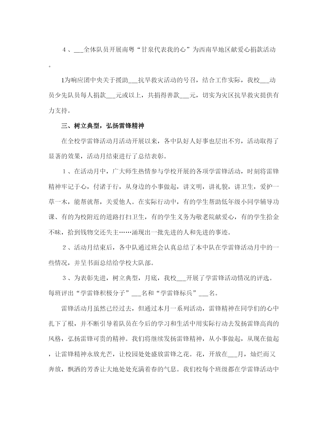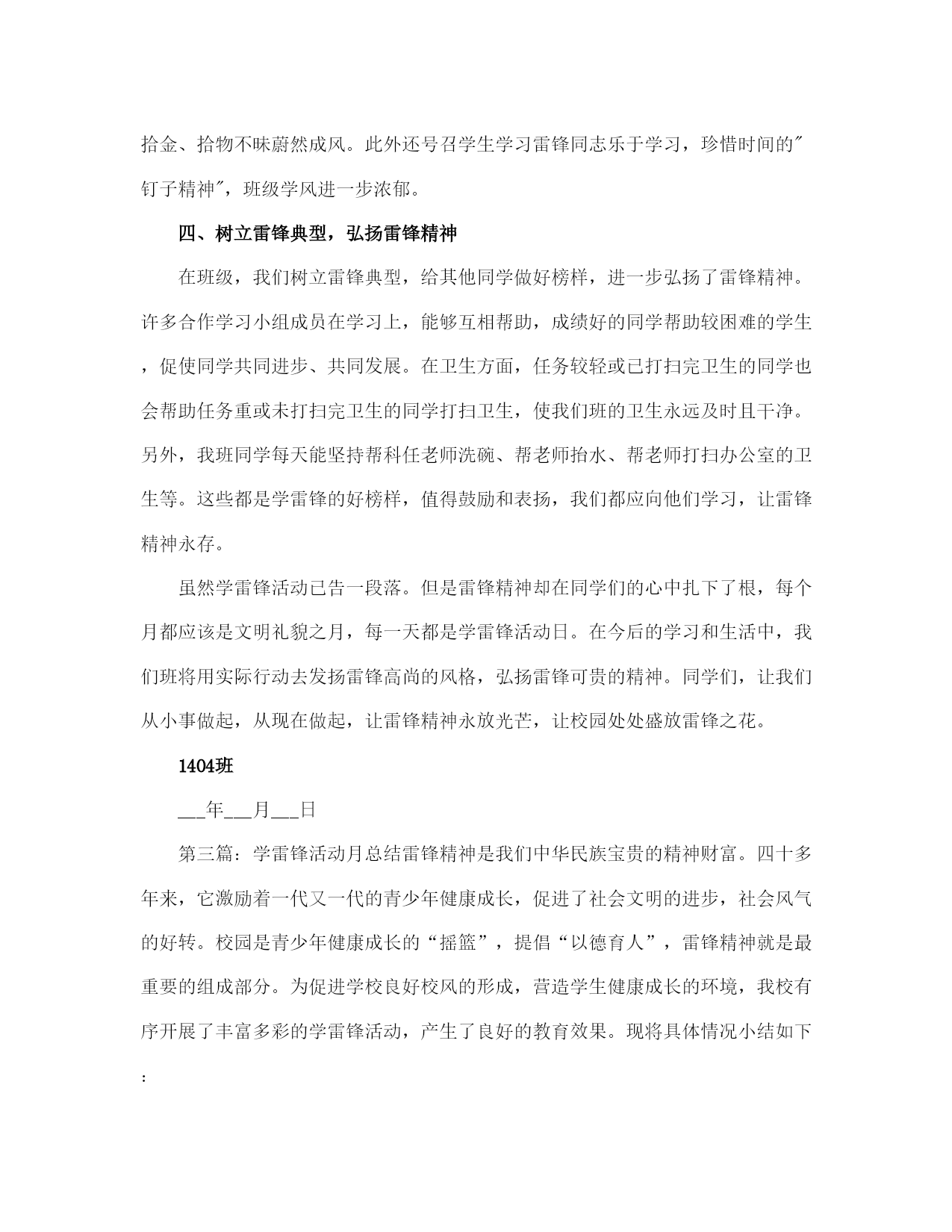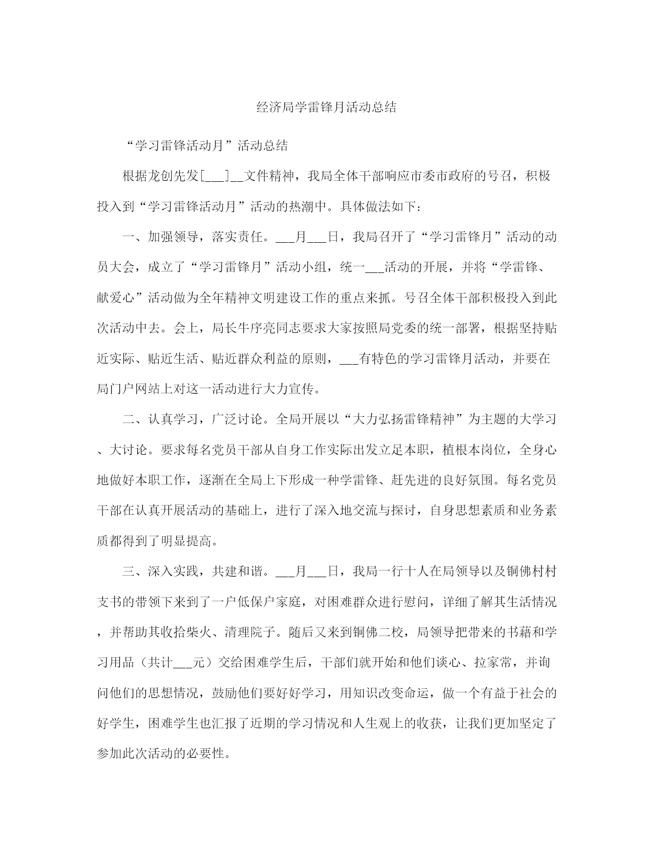 经济局学雷锋月活动总结(完整版)文档资料可直接使用,可编辑,欢迎下载经济局学雷锋月活动总结“学习雷锋活动月”活动总结根据龙创先发[___]__文件精神,我局全体干部响应市委市政府的号召,积极投入到“学习雷锋活动月”活动的热潮中。具体做法如下:一、加强领导,落实责任。___月___日,我局召开了“学习雷锋月”活动的动员大会,成立了“学习雷锋月”活动小组,统一___活动的开展,并将“学雷锋、献爱心”活动做为全年精神文明建设工作的重点来抓。号召全体干部积极投入到此次活动中去。会上,局长牛序亮同志要求大家按照局党委的统一部署,根据坚持贴近实际、贴近生活、贴近群众利益的原则,___有特色的学习雷锋月活动,并要在局门户网站上对这一活动进行大力宣传。二、认真学习,广泛讨论。全局开展以“大力弘扬雷锋精神”为主题的大学习、大讨论。要求每名党员干部从自身工作实际出发立足本职,植根本岗位,全身心地做好本职工作,逐渐在全局上下形成一种学雷锋、赶先进的良好氛围。每名党员干部在认真开展活动的基础上,进行了深入地交流与探讨,自身思想素质和业务素质都得到了明显提高。三、深入实践,共建和谐。___月___日,我局一行十人在局领导以及铜佛村村支书的带领下来到了一户低保户家庭,对困难群众进行慰问,详细了解其生活情况,并帮助其收拾柴火、清理院子。随后又来到铜佛二校,局领导把带来的书藉和学习用品(共计___元)交给困难学生后,干部们就开始和他们谈心、拉家常,并询问他们的思想情况,鼓励他们要好好学习,用知识改变命运,做一个有益于社会的好学生,困难学生也汇报了近期的学习情况和人生观上的收获,让我们更加坚定了参加此次活动的必要性。第二篇:学雷锋月活动总结___班学雷锋活动月总结___月是一个春光明媚、生机勃勃的季节,___月更是一个讲文明、树新风,让雷锋精神吹遍校园每一个角落的季节。我们初一___班紧紧围绕学雷锋活动月,学开展了"学雷锋"系列活动,活动开展得有声有色,形成了一股学雷锋热潮,这次活动开展收效甚好。同学们也在活动过程中得到了锻炼,在锻炼中得到了成长。雷锋精神像春风一样拂过了同学们稚嫩的心灵,播下了乐于奉献、乐于助人、认真负责、勤俭节约等优良品质的种子。现将具体开展的工作总结如下:一、指导思想为了真正执行此次行动,我试着把学生的思想面貌改头换面而不是流于形式,把学雷锋的活动结合本学期开展的文明礼仪教育活动,如召开“告别陋习,走向文明”的主题班会,提倡“三要”(要以纯洁的微笑、要以高尚的情操、要以___的人格)“三不要”(即向不文明语言说不、向不文明行为说不、向不文明习惯说不)活动,力求改变学生的精神面貌,提高他们的思想觉悟,从而为班级的稳定和长远发展打下一个坚实的基础,并为学生的可持续发展和终身发展埋下一粒希望的种子。同时,许多同学认为学雷锋只是做做好事而已,事实上他们一直也是这样做的。我认为雷锋精神不仅仅是做做好事这么简单,雷锋在学习上的钉子精神、在批评和自我批评方面的敢于直言的精神、在是与非的选择上的立场坚定的精神、在对待同志上的高度热情的精神、在对待工作上的高度负责的精神等方面都是值得我们认真学习的。二、营造学雷锋氛围,体验雷锋精神___月伊始,学校就下发了学雷锋月活动方案,作为班主任,我结合本班实际情况设计了一些学雷锋活动,以此来营造浓厚的学雷锋氛围,掀起学雷锋的热潮。我们班召开了“学雷锋,树新风”的主题班会,通过学生课前在网上收集雷锋的感人事迹和名人名言,学唱雷锋的歌,寻找雷锋的足迹,并在班会上进行讲述,使学生进一步了解雷锋、走近雷锋、体验雷锋精神,同时也让学生讨论交流“雷锋精神指的是什么”、“雷锋精神过时了吗”、“学雷锋月你准备怎么做”等问题,并进行发言,让学生明白雷锋精神所蕴含的含义,雷锋精神永不过时,所以我们必须在实际生活、学习和工作中弘扬雷锋精神,使其发扬光大。三、___学雷锋活动,学习雷锋精神雷锋的精神是中华民族一笔可贵的精神财富,我们不但要在“学雷锋”活动中发扬这样高尚的精神,也要在日常生活中,一点一滴,方方面面发扬这样的优良传统,让这种“雷锋精神”永远的流传下去,让中华民族的传统美德发扬光大。自雷锋活动月活动开展以来,我班就开展了一系列学雷锋活动,一直坚持在实际中去践行雷锋精神,并取得了良好的效果。如学校了垃圾桶长期无人打扫清洁,垃圾桶内脏、臭、乱。因此我们班___全班学生利用自习课时间参加义务劳动,清洁校园垃圾桶。在活动现场,不管是爱干净的男生,还是有洁癖的女生,这些看似娇生惯养的孩子们个个不怕脏、不怕臭,积极性和主动性非常的高,一直积极的参与其中,用洗洁精、拖把、抹布、刷子清洁垃圾桶,做到了不怕脏、不怕臭且不怕累,尽力把每一个垃圾桶的里面和外面都清洁的干干净净,鞋子弄湿了,衣服弄脏了,但大家并不在意,他们希
