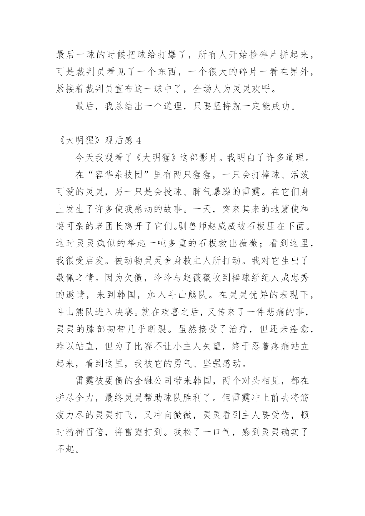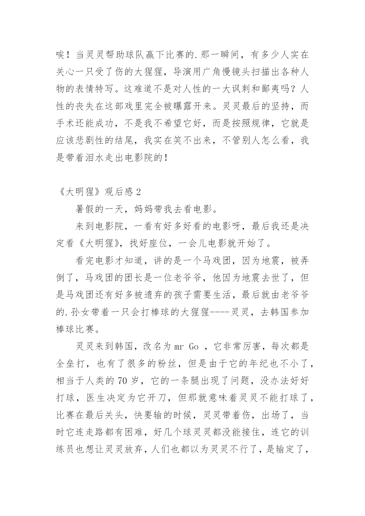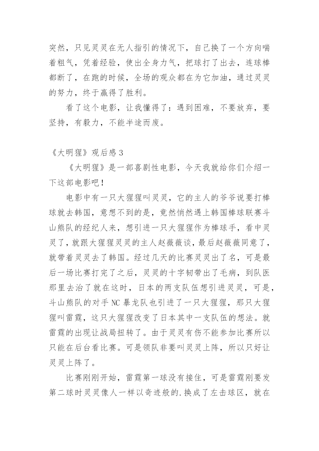 《大明猩》观后感在观看完一部作品以后,对人生或者事物一定产生了许多感想吧,这时候,最关键的观后感怎么能落下!快来参考观后感是怎么写的吧,以下是小编收集整理的《大明猩》观后感,希望能够帮助到大家。《大明猩》观后感1我看了大明猩这部电影这是一部有瑕疵,但是总体来说瑕不掩瑜的好电影。无论从完整的剧情,虽嫌泛滥但是足够走心的情感表达,以及几乎毫无瑕疵的3D和电脑特效表现来说,《大明猩》都是一部可说是优秀的商业电影。先从瑕疵说起吧。有不少观众都对影片中,大猩猩灵灵和小女孩薇薇之间的情感产生质疑,尤其是在最后时刻,球队面临生死之战,影片花去大量时间表现薇薇终于理解灵灵对她的情感,反省自身,却还要强迫灵灵拖着伤腿上场比赛。确实,这种看似什么都不通的情感逻辑很让人费解,但是假如把这一切都归结到,这是一部韩国电影,是不是就好理解很多呢?我看很生气!男主角,这个韩国经纪人,为了一己私利而不顾灵灵的死活,虽然最后的良心发现可以挽救他的一点形象,可我还是看不到人类内心光明的闪光点。其余的韩国人,他们关心的不是灵灵的健康,而是需要赢,因为赢,才有钱收嘛,所以,灵灵最后膝盖的伤势是这帮人有知无知共同迫害的!至于影片中出现的日本人,纯属是为了利益而来,唉!当灵灵帮助球队赢下比赛的.那一瞬间,有多少人实在关心一只受了伤的大猩猩,导演用广角慢镜头扫描出各种人物的表情特写。这难道不是对人性的一大讽刺和鄙夷吗?人性的丧失在这部戏里完全被曝露开来。灵灵最后的坚持,而手术还能成功,不是我不希望它好,而是按照规律,它就是应该悲剧性的结尾,我实在笑不出来,不管别人怎么看,我是带着泪水走出电影院的!《大明猩》观后感2暑假的一天,妈妈带我去看电影。来到电影院,一看有好多好看的电影呀,最后我还是决定看《大明猩》,找好座位,一会儿电影就开始了。看完电影才知道,讲的是一个马戏团,因为地震,被弄倒了,马戏团的团长是一位老爷爷,他因为地震去世了,但是马戏团还有好多被遗弃的孩子需要生活,最后就由老爷爷的.孙女带着一只会打棒球的大猩猩----灵灵,去韩国参加棒球比赛。灵灵来到韩国,改名为mrGo,它非常厉害,每次都是全垒打,也有了很多的粉丝,但是由于它的年纪也不小了,相当于人类的70岁,它的一条腿出现了问题,没办法好好打球,医生决定为它开刀,但那就意味着灵灵不能打球了,比赛在最后关头,快要输的时候,灵灵带着伤,出场了,当时它连走路都有困难,好几个球灵灵都没能接住,连它的训练员也想让灵灵放弃,人们也都以为灵灵不行了,是输定了,突然,只见灵灵在无人指引的情况下,自己换了一个方向喘着粗气,凭着经验,使出全身力气,把球打了出去,连球棒都断了,在跑的时候,全场的观众都在为它加油,通过灵灵的努力,终于赢得了胜利。看了这个电影,让我懂得了:遇到困难,不要放弃,要坚持,有毅力,不能半途而废。《大明猩》观后感3《大明猩》是一部喜剧性电影,今天我就给你们介绍一下这部电影吧!电影中有一只大猩猩叫灵灵,它的主人的爷爷说要打棒球就去韩国,意想不到的是,竟然悄然遇上韩国棒球联赛斗山熊队的经纪人来,想引进一只大猩猩作为棒球手,看中灵灵了,就跟大猩猩灵灵的主人赵薇薇谈,最后赵薇薇同意了,就带着灵灵去了韩国。经过几天的比赛灵灵出了名,可是最后一场比赛打完了之后,灵灵的十字韧带出了毛病,到队医那里去治了就在这时,日本的两支队伍想引进灵灵,可是,斗山熊队的对手NC暴龙队也引进了一只大猩猩,那只大猩猩叫雷霆,这只大猩猩改变了日本其中一支队伍的想法。就雷霆的出现让战局扭转了。由于灵灵有伤不能参加比赛所以只能在后台看比赛。可是领队非要叫灵灵上阵,所以只好让灵灵上阵了。比赛刚刚开始,雷霆第一球没有接住,可是雷霆刚要发第二球时灵灵像人一样以奇迹般的.换成了左击球区,就在最后一球的时候把球给打爆了,所有人开始捡碎片拼起来,可是裁判员看见了一个东西,一个很大的碎片一看在界外,紧接着裁判员宣布这一球中了,全场人为灵灵欢呼。最后,我总结出一个道理,只要坚持就一定能成功。《大明猩》观后感4今天我观看了《大明猩》这部影片。我明白了许多道理。在“容华杂技团”里有两只猩猩,一只会打棒球、活泼可爱的灵灵,另一只是会投球、脾气暴躁的雷霆。在它们身上发生了许多使我感动的故事。一天,突来其来的地震使和蔼可亲的老团长离开了它们。驯兽师赵威威被石板压在下面。这时灵灵疯似的举起一吨多重的石板救出薇薇;看到这里,我很受启发。被动物灵灵舍身救主人所打动。我对它生出了敬佩之情。因为欠债,玲玲与赵薇薇收到棒球经纪人成忠秀的邀请,来到韩国,加入斗山熊队。在灵灵优异的表现下,斗山熊队进入决赛。就在欢喜之后,又传来了一件悲痛的事,灵灵的膝部韧带几乎断裂。虽然接受了治疗,但还未痊愈,难以站直,但为了比赛不让小主人失望,终于忍着疼痛站立起来,看到这里,我被它的勇气、坚强感动。雷霆