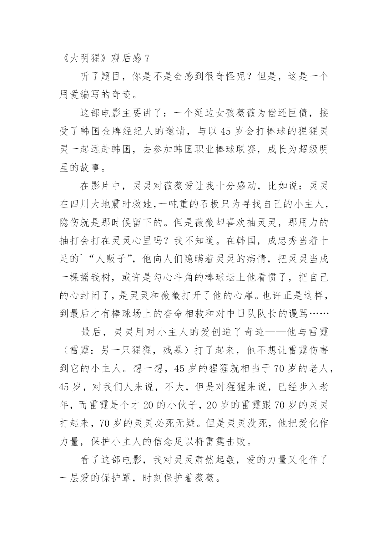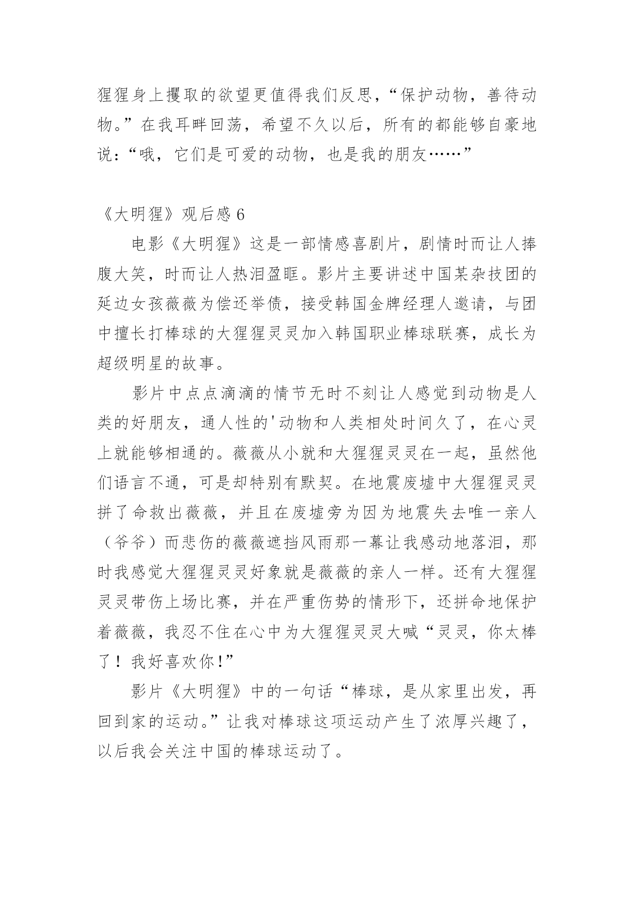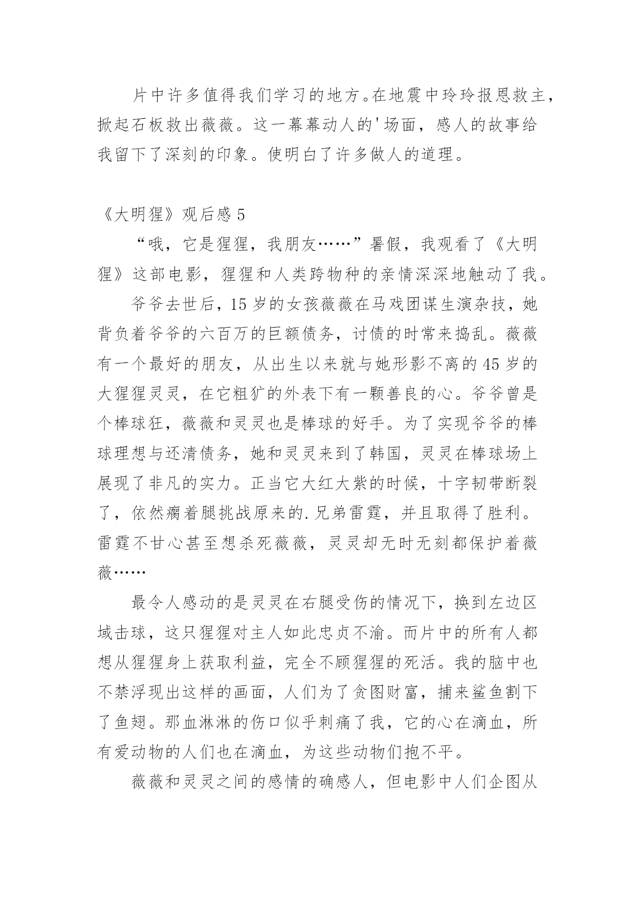 《大明猩》观后感在观看完一部作品以后,对人生或者事物一定产生了许多感想吧,这时候,最关键的观后感怎么能落下!快来参考观后感是怎么写的吧,以下是小编收集整理的《大明猩》观后感,希望能够帮助到大家。《大明猩》观后感1我看了大明猩这部电影这是一部有瑕疵,但是总体来说瑕不掩瑜的好电影。无论从完整的剧情,虽嫌泛滥但是足够走心的情感表达,以及几乎毫无瑕疵的3D和电脑特效表现来说,《大明猩》都是一部可说是优秀的商业电影。先从瑕疵说起吧。有不少观众都对影片中,大猩猩灵灵和小女孩薇薇之间的情感产生质疑,尤其是在最后时刻,球队面临生死之战,影片花去大量时间表现薇薇终于理解灵灵对她的情感,反省自身,却还要强迫灵灵拖着伤腿上场比赛。确实,这种看似什么都不通的情感逻辑很让人费解,但是假如把这一切都归结到,这是一部韩国电影,是不是就好理解很多呢?我看很生气!男主角,这个韩国经纪人,为了一己私利而不顾灵灵的死活,虽然最后的良心发现可以挽救他的一点形象,可我还是看不到人类内心光明的闪光点。其余的韩国人,他们关心的不是灵灵的健康,而是需要赢,因为赢,才有钱收嘛,所以,灵灵最后膝盖的伤势是这帮人有知无知共同迫害的!至于影片中出现的日本人,纯属是为了利益而来,唉!当灵灵帮助球队赢下比赛的.那一瞬间,有多少人实在关心一只受了伤的大猩猩,导演用广角慢镜头扫描出各种人物的表情特写。这难道不是对人性的一大讽刺和鄙夷吗?人性的丧失在这部戏里完全被曝露开来。灵灵最后的坚持,而手术还能成功,不是我不希望它好,而是按照规律,它就是应该悲剧性的结尾,我实在笑不出来,不管别人怎么看,我是带着泪水走出电影院的!《大明猩》观后感2暑假的一天,妈妈带我去看电影。来到电影院,一看有好多好看的电影呀,最后我还是决定看《大明猩》,找好座位,一会儿电影就开始了。看完电影才知道,讲的是一个马戏团,因为地震,被弄倒了,马戏团的团长是一位老爷爷,他因为地震去世了,但是马戏团还有好多被遗弃的孩子需要生活,最后就由老爷爷的.孙女带着一只会打棒球的大猩猩----灵灵,去韩国参加棒球比赛。灵灵来到韩国,改名为mrGo,它非常厉害,每次都是全垒打,也有了很多的粉丝,但是由于它的年纪也不小了,相当于人类的70岁,它的一条腿出现了问题,没办法好好打球,医生决定为它开刀,但那就意味着灵灵不能打球了,比赛在最后关头,快要输的时候,灵灵带着伤,出场了,当时它连走路都有困难,好几个球灵灵都没能接住,连它的训练员也想让灵灵放弃,人们也都以为灵灵不行了,是输定了,突然,只见灵灵在无人指引的情况下,自己换了一个方向喘着粗气,凭着经验,使出全身力气,把球打了出去,连球棒都断了,在跑的时候,全场的观众都在为它加油,通过灵灵的努力,终于赢得了胜利。看了这个电影,让我懂得了:遇到困难,不要放弃,要坚持,有毅力,不能半途而废。《大明猩》观后感3《大明猩》是一部喜剧性电影,今天我就给你们介绍一下这部电影吧!电影中有一只大猩猩叫灵灵,它的主人的爷爷说要打棒球就去韩国,意想不到的是,竟然悄然遇上韩国棒球联赛斗山熊队的经纪人来,想引进一只大猩猩作为棒球手,看中灵灵了,就跟大猩猩灵灵的主人赵薇薇谈,最后赵薇薇同意了,就带着灵灵去了韩国。经过几天的比赛灵灵出了名,可是最后一场比赛打完了之后,灵灵的十字韧带出了毛病,到队医那里去治了就在这时,日本的两支队伍想引进灵灵,可是,斗山熊队的对手NC暴龙队也引进了一只大猩猩,那只大猩猩叫雷霆,这只大猩猩改变了日本其中一支队伍的想法。就雷霆的出现让战局扭转了。由于灵灵有伤不能参加比赛所以只能在后台看比赛。可是领队非要叫灵灵上阵,所以只好让灵灵上阵了。比赛刚刚开始,雷霆第一球没有接住,可是雷霆刚要发第二球时灵灵像人一样以奇迹般的.换成了左击球区,就在最后一球的时候把球给打爆了,所有人开始捡碎片拼起来,可是裁判员看见了一个东西,一个很大的碎片一看在界外,紧接着裁判员宣布这一球中了,全场人为灵灵欢呼。最后,我总结出一个道理,只要坚持就一定能成功。《大明猩》观后感4今天我观看了《大明猩》这部影片。我明白了许多道理。在“容华杂技团”里有两只猩猩,一只会打棒球、活泼可爱的灵灵,另一只是会投球、脾气暴躁的雷霆。在它们身上发生了许多使我感动的故事。一天,突来其来的地震使和蔼可亲的老团长离开了它们。驯兽师赵威威被石板压在下面。这时灵灵疯似的举起一吨多重的石板救出薇薇;看到这里,我很受启发。被动物灵灵舍身救主人所打动。我对它生出了敬佩之情。因为欠债,玲玲与赵薇薇收到棒球经纪人成忠秀的邀请,来到韩国,加入斗山熊队。在灵灵优异的表现下,斗山熊队进入决赛。就在欢喜之后,又传来了一件悲痛的事,灵灵的膝部韧带几乎断裂。虽然接受了治疗,但还未痊愈,难以站直,但为了比赛不让小主人失望,终于忍着疼痛站立起来,看到这里,我被它的勇气、坚强感动。雷霆