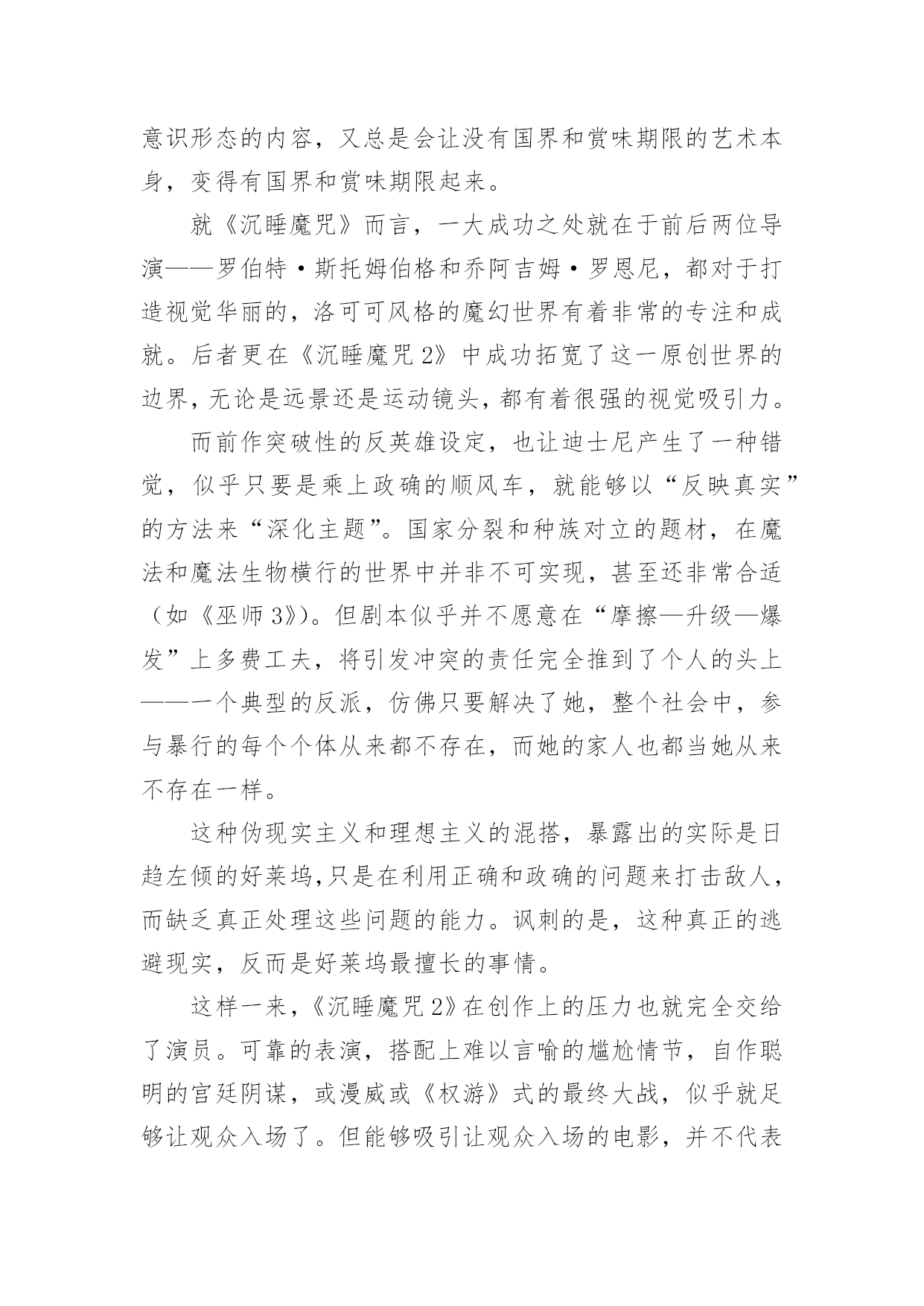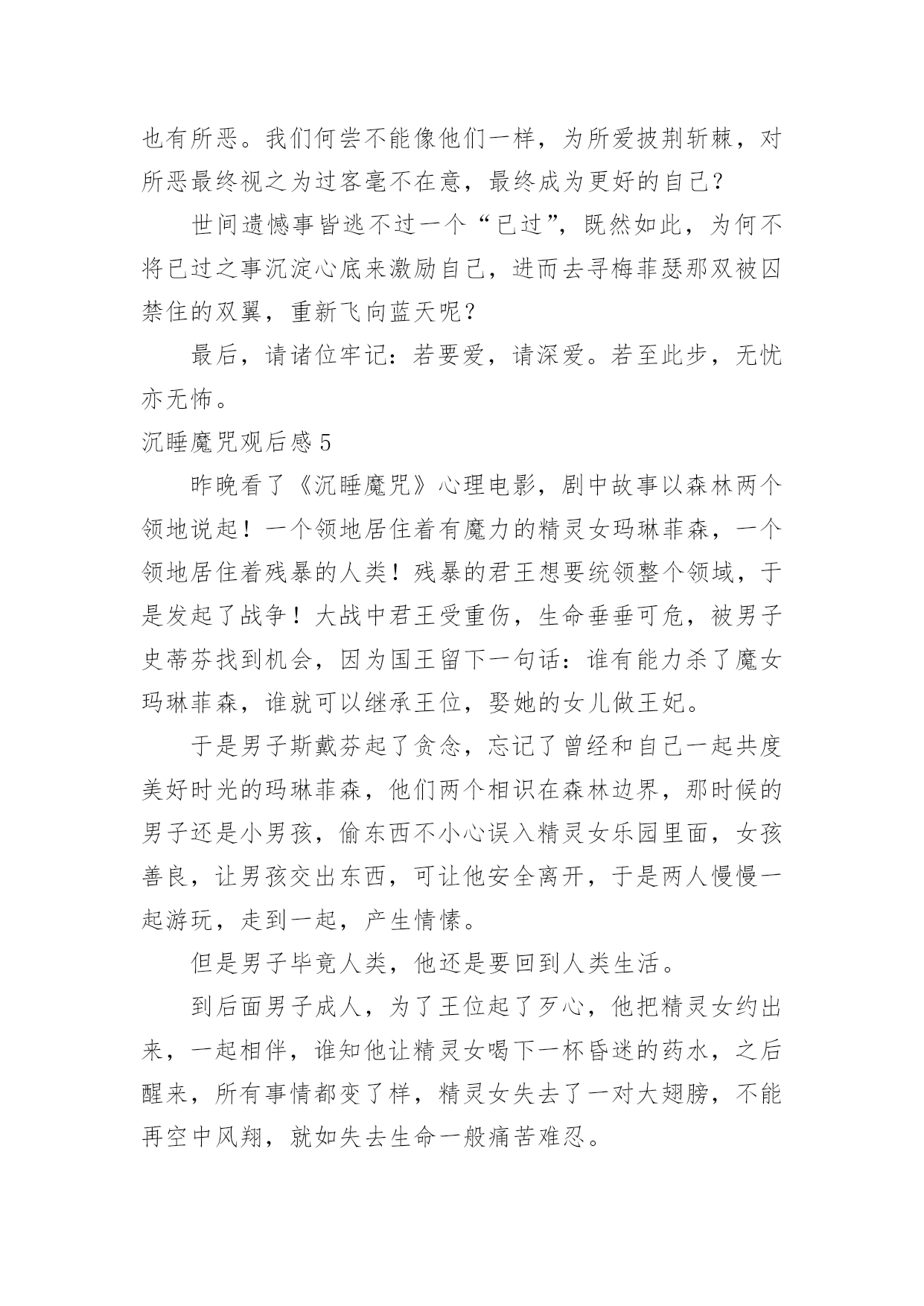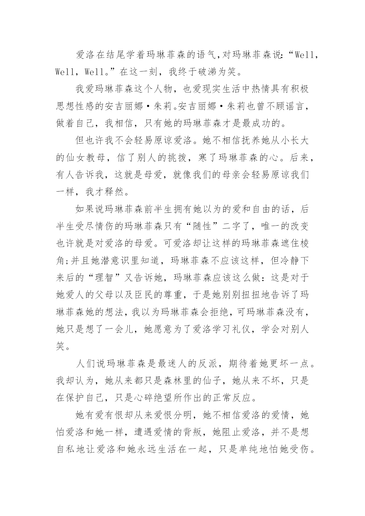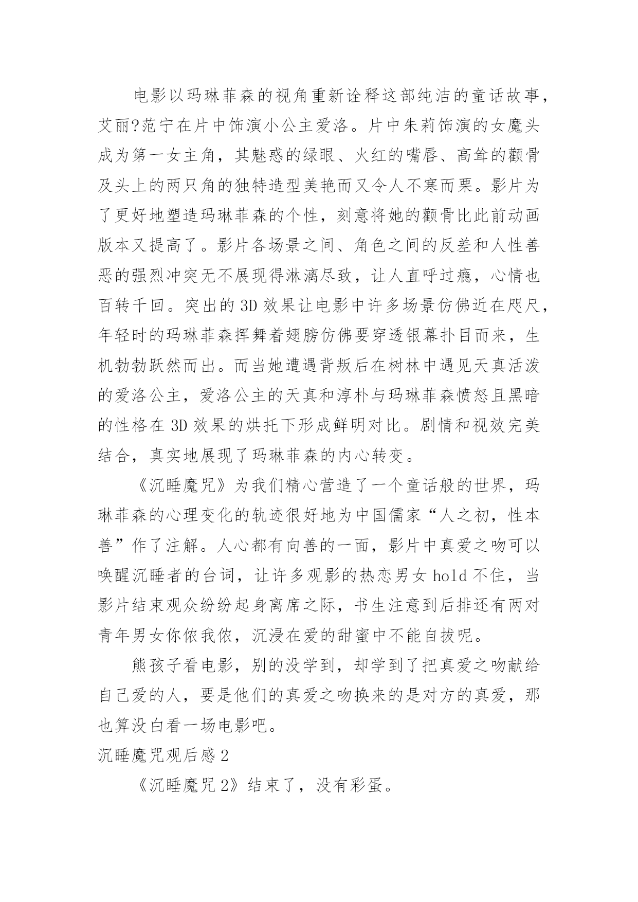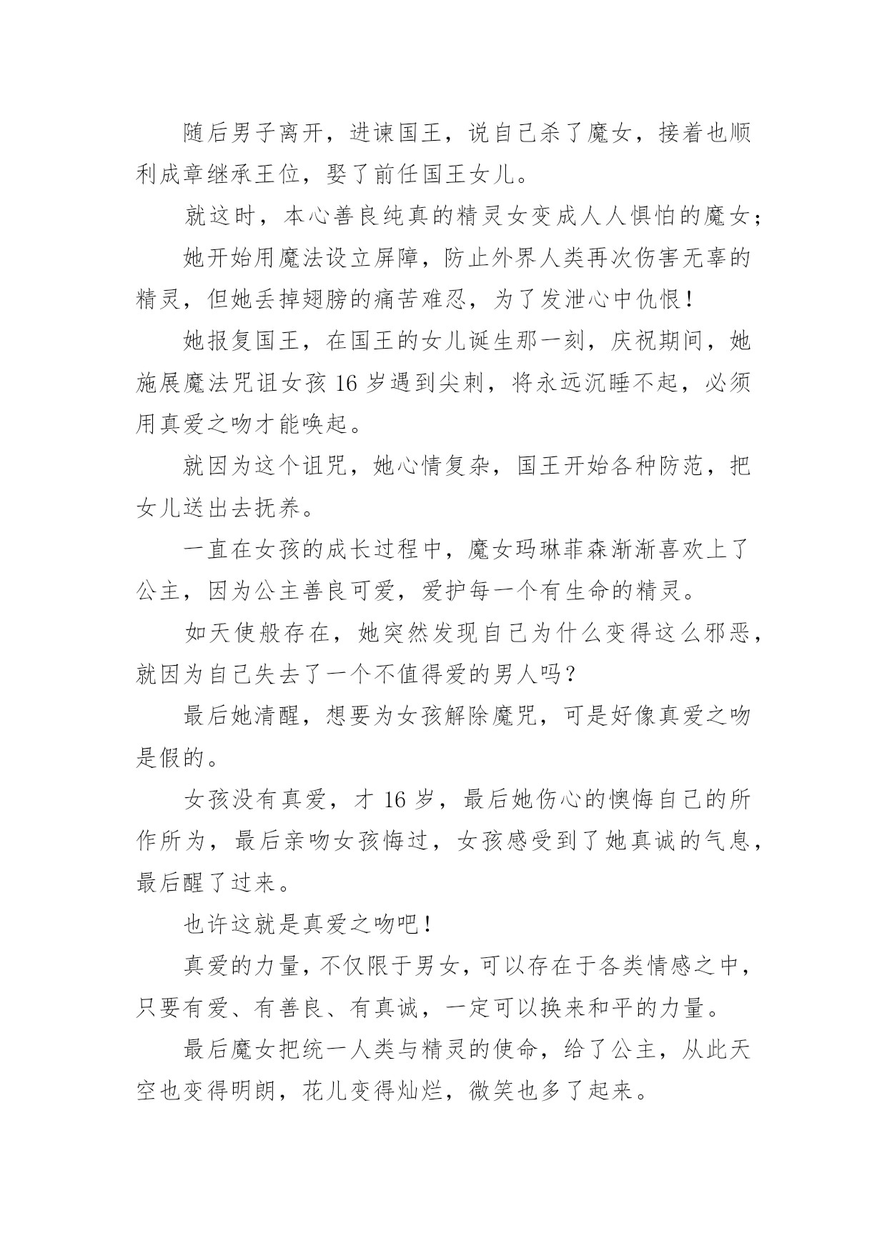沉睡魔咒观后感沉睡魔咒观后感认真品味一部作品后,这次观看让你有什么领悟呢?何不写一篇观后感记录下呢?现在你是否对观后感一筹莫展呢?下面是小编为大家整理的沉睡魔咒观后感,仅供参考,大家一起来看看吧。沉睡魔咒观后感1电影改编自1959年迪士尼老牌动画《睡美人》,今年《睡美人》恰好问世55周年。这个曾经在无数孩子的童年中占有重要地位的故事以纯美的公主收获王子的吻而醒来作为结局,而施加沉睡魔咒的玛琳菲森(安吉丽娜?朱莉饰)这一大反派一直以负面形象出现。这次导演引领我们一起领略了《睡美人》经典反派不为人知的往事。玛琳菲森曾是一个美丽纯洁拥有翅膀能够飞翔的年轻仙子,生活在宁静祥和的森林王国。然而大好的时光总是短暂,王国突遭人类军队侵袭,玛琳菲森在战斗中逐渐成长为这片森林的守护者,可是她遭受到了爱情的背叛,从此她的心灵开始变得冷酷,脑海只剩复仇的念头。为了报复,她给人类国王的女儿爱洛公主施下恶咒;然而随着爱洛的成长,玛琳菲森才逐渐意识到自己不仅对这位小公主产生了类似于母女的感情,而且也意识到小公主能给两个世界带来和平。电影以玛琳菲森的视角重新诠释这部纯洁的童话故事,艾丽?范宁在片中饰演小公主爱洛。片中朱莉饰演的女魔头成为第一女主角,其魅惑的绿眼、火红的嘴唇、高耸的颧骨及头上的两只角的独特造型美艳而又令人不寒而栗。影片为了更好地塑造玛琳菲森的个性,刻意将她的颧骨比此前动画版本又提高了。影片各场景之间、角色之间的反差和人性善恶的强烈冲突无不展现得淋漓尽致,让人直呼过瘾,心情也百转千回。突出的3D效果让电影中许多场景仿佛近在咫尺,年轻时的玛琳菲森挥舞着翅膀仿佛要穿透银幕扑目而来,生机勃勃跃然而出。而当她遭遇背叛后在树林中遇见天真活泼的爱洛公主,爱洛公主的天真和淳朴与玛琳菲森愤怒且黑暗的性格在3D效果的烘托下形成鲜明对比。剧情和视效完美结合,真实地展现了玛琳菲森的内心转变。《沉睡魔咒》为我们精心营造了一个童话般的世界,玛琳菲森的心理变化的轨迹很好地为中国儒家“人之初,性本善”作了注解。人心都有向善的一面,影片中真爱之吻可以唤醒沉睡者的台词,让许多观影的热恋男女hold不住,当影片结束观众纷纷起身离席之际,书生注意到后排还有两对青年男女你侬我侬,沉浸在爱的甜蜜中不能自拔呢。熊孩子看电影,别的没学到,却学到了把真爱之吻献给自己爱的人,要是他们的真爱之吻换来的是对方的真爱,那也算没白看一场电影吧。沉睡魔咒观后感2《沉睡魔咒2》结束了,没有彩蛋。爱洛在结尾学着玛琳菲森的语气,对玛琳菲森说:“Well,Well,Well。”在这一刻,我终于破涕为笑。我爱玛琳菲森这个人物,也爱现实生活中热情具有积极思想性感的安吉丽娜·朱莉。安吉丽娜·朱莉也曾不顾谣言,做着自己,我相信,只有她的玛琳菲森才是最成功的。但也许我不会轻易原谅爱洛。她不相信抚养她从小长大的仙女教母,信了别人的挑拨,寒了玛琳菲森的心。后来,有人告诉我,这就是母爱,就像我们的母亲会轻易原谅我们一样,我才释然。如果说玛琳菲森前半生拥有她以为的爱和自由的话,后半生受尽情伤的玛琳菲森只有“随性”二字了,唯一的改变也许就是对爱洛的母爱。可爱洛却让这样的玛琳菲森遮住棱角;并且她潜意识里知道,玛琳菲森不应该这样,但冷静下来后的“理智”又告诉她,玛琳菲森应该这么做:这是对于她爱人的父母以及臣民的尊重,于是她别别扭扭地告诉了玛琳菲森她的想法,我以为玛琳菲森会拒绝,可玛琳菲森没有,她只是想了一会儿,她愿意为了爱洛学习礼仪,学会对别人笑。人们说玛琳菲森是最迷人的反派,期待着她更坏一点。我却认为,她从来都只是森林里的仙子,她从来不坏,只是在保护自己,只是心碎绝望所作出的正常反应。她有爱有恨却从来爱恨分明,她不相信爱洛的爱情,她怕爱洛和她一样,遭遇爱情的背叛,她阻止爱洛,并不是想自私地让爱洛和她永远生活在一起,只是单纯地怕她受伤。在确认爱洛遇到真爱后,玛琳菲森放手,亲手把爱洛送到她的幸福里,并发自内心地笑了出来。黑化的玛琳菲森会因为爱洛的一句“我了解你”开始动摇。其实,玛琳菲森从来不介意别人的看法,她会因为人类对她的恐惧不屑地调侃一句“人类真愚蠢。”从始至终,她只在乎爱洛的,只有爱洛,才会让她伤心。爱真是一个很奇妙的东西,玛琳菲森愿意替爱洛挡箭,爱洛的眼泪让玛琳菲森浴火重生。爱洛从小没有母亲,却有爱她的仙女教母。而仙女教母也终于知道了自己的身世,知道自己神秘的力量来自哪里。这是我曾想象过的结局。再见了,一瞥一笑都让我异常欣赏的玛琳菲森。再见了,一步步成长的'玛琳菲森。再见了,永远完成自由和平愿望的玛琳菲森。玛琳菲森的小怪物终于长大。她用自己的爱情,告诉世人,万物可以共存,实现了和平。她还可以无忧无虑散着头发,在森林里玩耍,因为她爱的男孩,爱她在森林里的模样。沉睡魔咒观后感3迪士尼和以其为首的好莱坞,并不愿意停下压榨自己曾经创