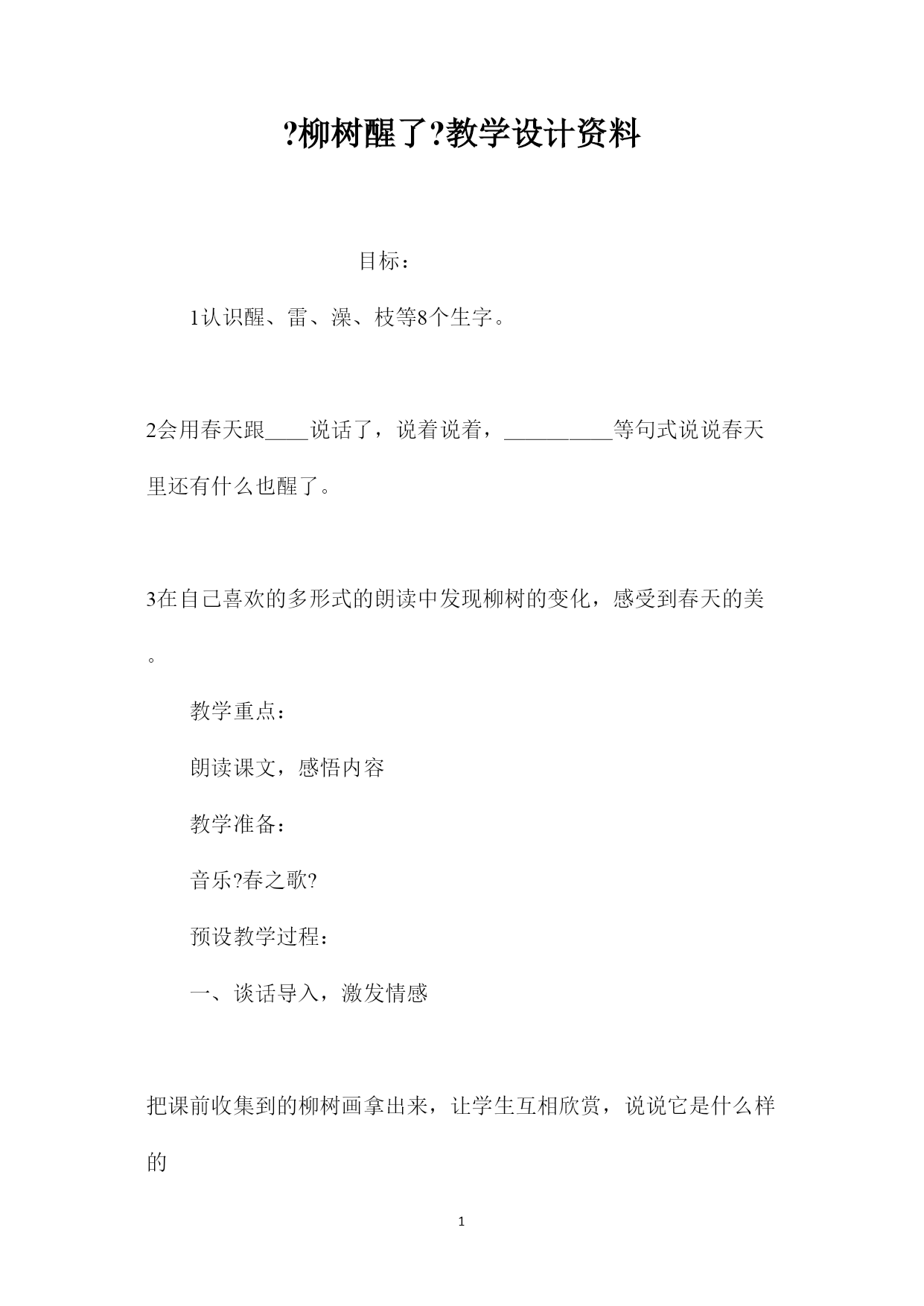 PAGEPAGE7《柳树醒了》教学设计资料目标:1认识醒、雷、澡、枝等8个生字。2会用春天跟__说话了,说着说着,_____等句式说说春天里还有什么也醒了。3在自己喜欢的多形式的朗读中发现柳树的变化,感受到春天的美。教学重点:朗读课文,感悟内容教学准备:音乐《春之歌》预设教学过程:一、谈话导入,激发情感把课前收集到的柳树画拿出来,让学生互相观赏,说说它是什么样的小朋友们,你们想不想和柳树成为好朋友呢老师送你们一首小诗,出示课题《柳树醒了》,在黑板上粘贴一棵柳树(不完整的,少柳条柳叶),只要大家能好好地学习课文,跟它成为好朋友,它就会变得更加美丽。二、初读课文,学习生字,感知内容(一)自由读课文,圈出本课生字,拼拼读读记记。再读课文,想一想,柳树在谁的帮助下醒了(二)学习生字1、用柳叶卡片出示生字,请同学教读。小组赛读等。指导学生读准翘舌音和后鼻音醒。2、一字开花游戏:给春和柳组词。请同学在柳树上指一指柳枝、柳梢、柳絮。课文中还有什么不懂的词语吗三、多种形式读,感悟课文(一)指名分节读课文,交流:柳树在谁的帮助下醒了(二)从春雷、春雨、春风、春燕中选一个自己喜欢的角色,有感情地读读自己选的那一段。(三)交流:从什么地方看出柳树醒了(根据学生回答,随机学习课文的每一小节)1、学习第一节(1)春雷组齐读,全班同学想像:春雷会跟柳树说些什么呢春雷跟柳树说:______________________________________交流:指名说,或说说你的同桌是怎样说的你觉得他说得怎么样(2)用自己喜欢的方式读读这一节。(指导读、跟同桌一起读、同桌互读等(3)小结板书:春雷说话柳树醒了2、学习第二节(1)春雨组读,指导读。(2)赛读,谁读得好,谁就可以上黑板给柳树画几根柳枝(3)同桌互读,各小组展示读。(4)小结板书:春雨洗澡柳枝软了3、学习第三节(1)春风组齐读,读着读着,你们发现柳树又有什么变化了呢(2)谁愿意跟老师来比赛读指名读,小组赛读。(3)小结板书:春风梳头柳梢绿了4、学习第四节(1)春燕组读,说说在你们的帮助下,柳树又发生了哪些变化(2)指名读,可以请你喜欢的小伙伴一起读,也可以自己读。其余同学听后说说,他们什么地方读得好什么地方还要努力(3)小结板书:春燕捉迷藏柳絮飞了5、学习第五节醒了的小柳树可高兴了,它在干什么呢师引读,指名读,评议。全班齐读。小结板书:柳树玩耍小朋友长高了6、读板书,引导学生发现柳树的变化。小结,齐读全文。四、巩固生字(一)师:小朋友们,我们刚才忙着跟小柳树交朋友,它的柳叶宝宝可等急了,比一比,谁能跟柳叶小宝宝交上朋友。(二)同桌互相认字,说说你用什么办法记住了哪些字,还有哪些字比较难记,可以请同学教师帮忙。(三)逐个出示生字,让学生带读,读得好的同学奖他一张柳叶(每张柳叶背后各写着一个词语:苏醒、打雷、洗澡、树枝、软和、梳洗、玩耍、柳梢)(四)请拿到柳叶的同学上台,出示词语,让别的同学挑战读,挑战读对了,就可给板画柳树贴上柳叶。(五)男女赛读生字、词语。五、再读课文,练习说话。(一)挑战读柳叶小宝宝藏到课文里去了,你还认识他们吗请大家再读读课文,喜欢的那段多读几遍。挑战读,读得好可以给黑板上的柳树画柳条或柳叶,帮它变得更加。(二)在春天里,还有什么醒了呢出示:春天跟__说话了,或春天跟____,说着说着,________,________。________。(说得好,可以把相关的内容画在黑板上)(三)小朋友们,我们跟柳树做朋友,柳树更美了,跟春天做朋友,春天更漂亮了,你想跟柳树说几句话吗,你想跟春天说什么呢六、总结作业1、小朋友们,柳树在大家的帮助下,更美了,让我们一起把这美丽的小诗送给春天吧。《春之歌》配乐朗读。2、你还想知道柳树的知识吗,去问问爸爸妈妈或查查资料,柳树一般都长在哪儿,它有什么作用然后做个剪贴报,把你的收获带给大家,好吗回顾课内外读过的古诗词,其中有很多诗歌表达了朋友间依依惜别之情,请默写两句。如:劝君更尽一杯酒,西出阳关无故人。(该句除外。)(2分)____________________________,____________________________。3、文学作品中数字三及三的倍数大多表示多的意思,如诗句白发三千丈。在记忆中,你还有哪些这样的诗句。(白发三千丈除外)(2分)1____________________________、2____________________________、4、《三国演义》是我国古代四大文学名着之一,在这部长篇小说中塑造了许多鲜明的人物形象,发生了许多动人的故事。比